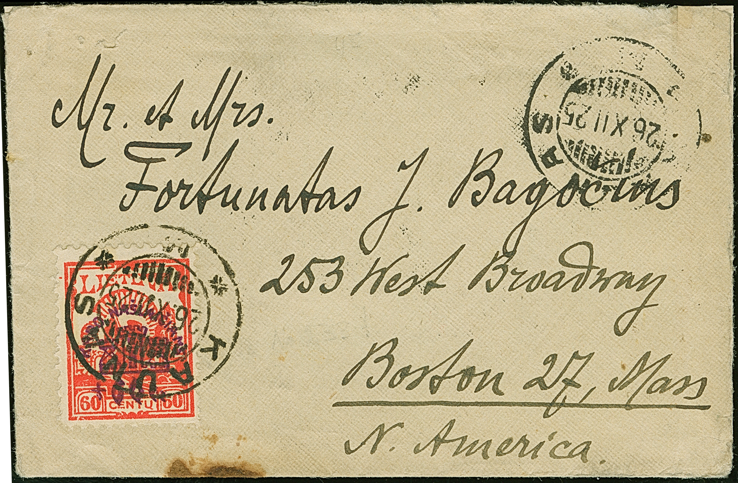 1924, War Orphans 60 centu, tied by cds. "KAUNAS  26.XII.25" to cover to Boston, little spot at bottom, otherwise fine, scarce single franking