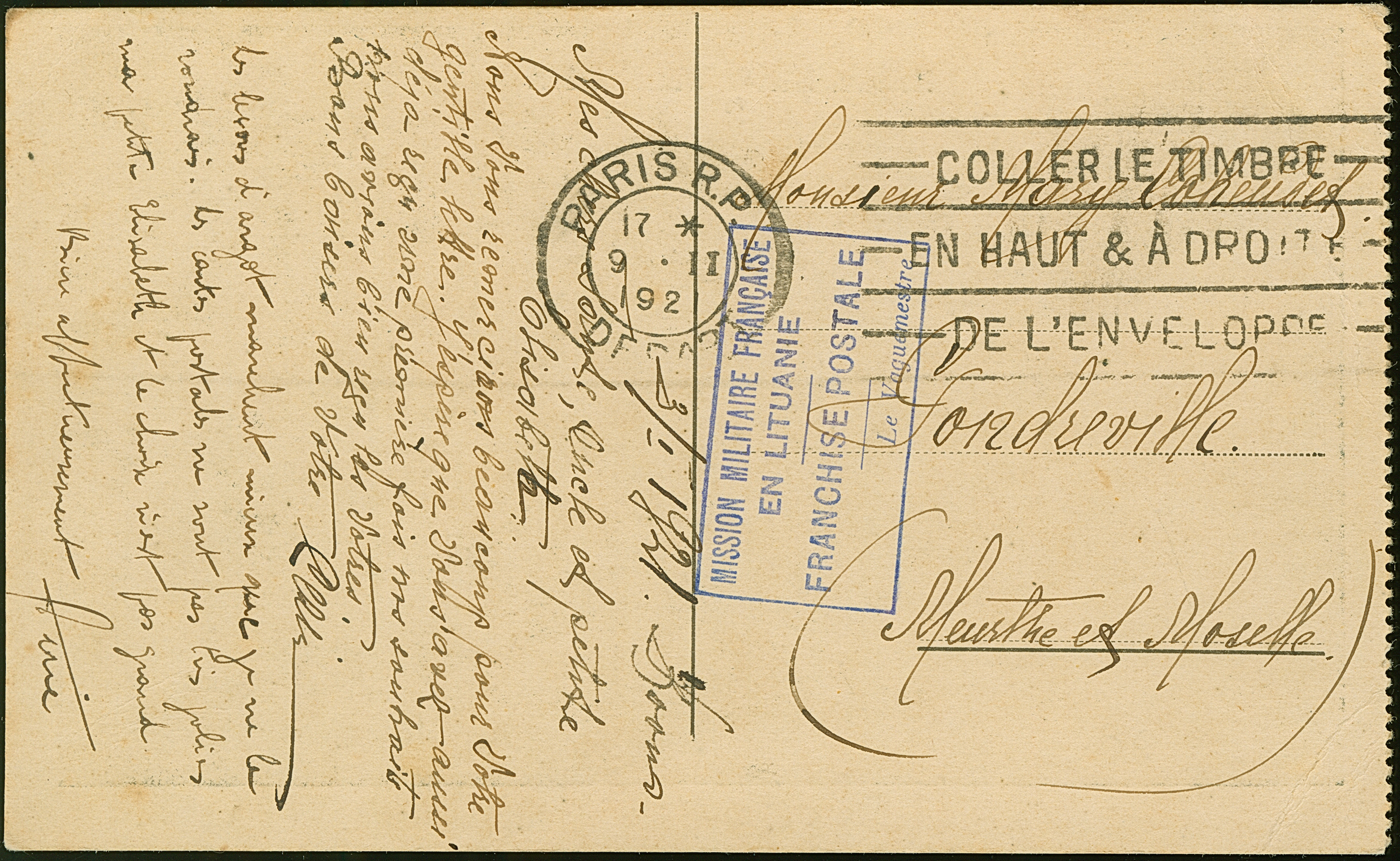 "MISSION MILITAIRE FRANCAISE EN LITUANIE FRANCHISE POSTALE Le Vaguemestre", violett boxed four-line cachet on picture postcard, dated “Kowno 3/I 1921” to Gaudonville with Paris transit cancellation, fine and scarce