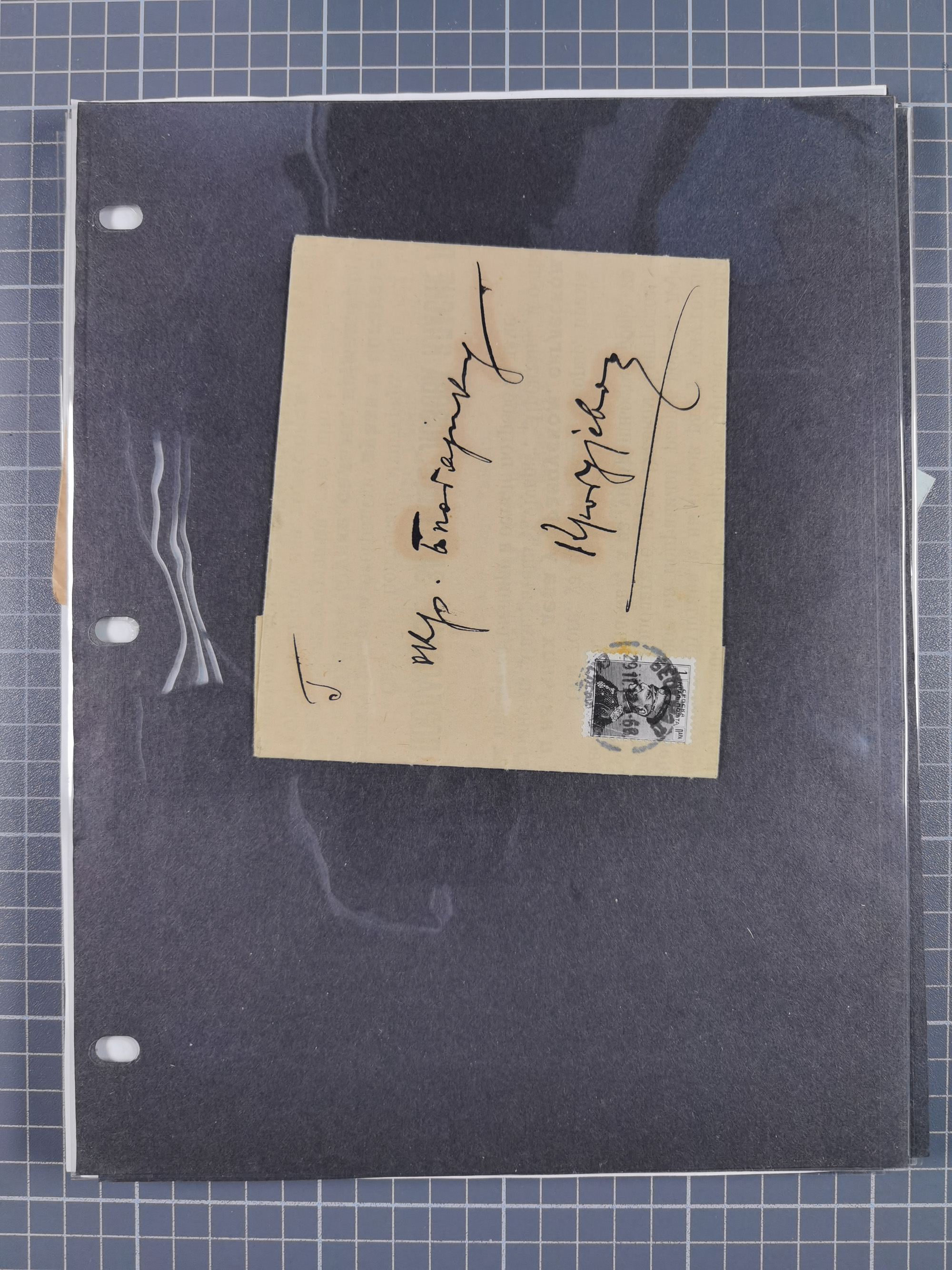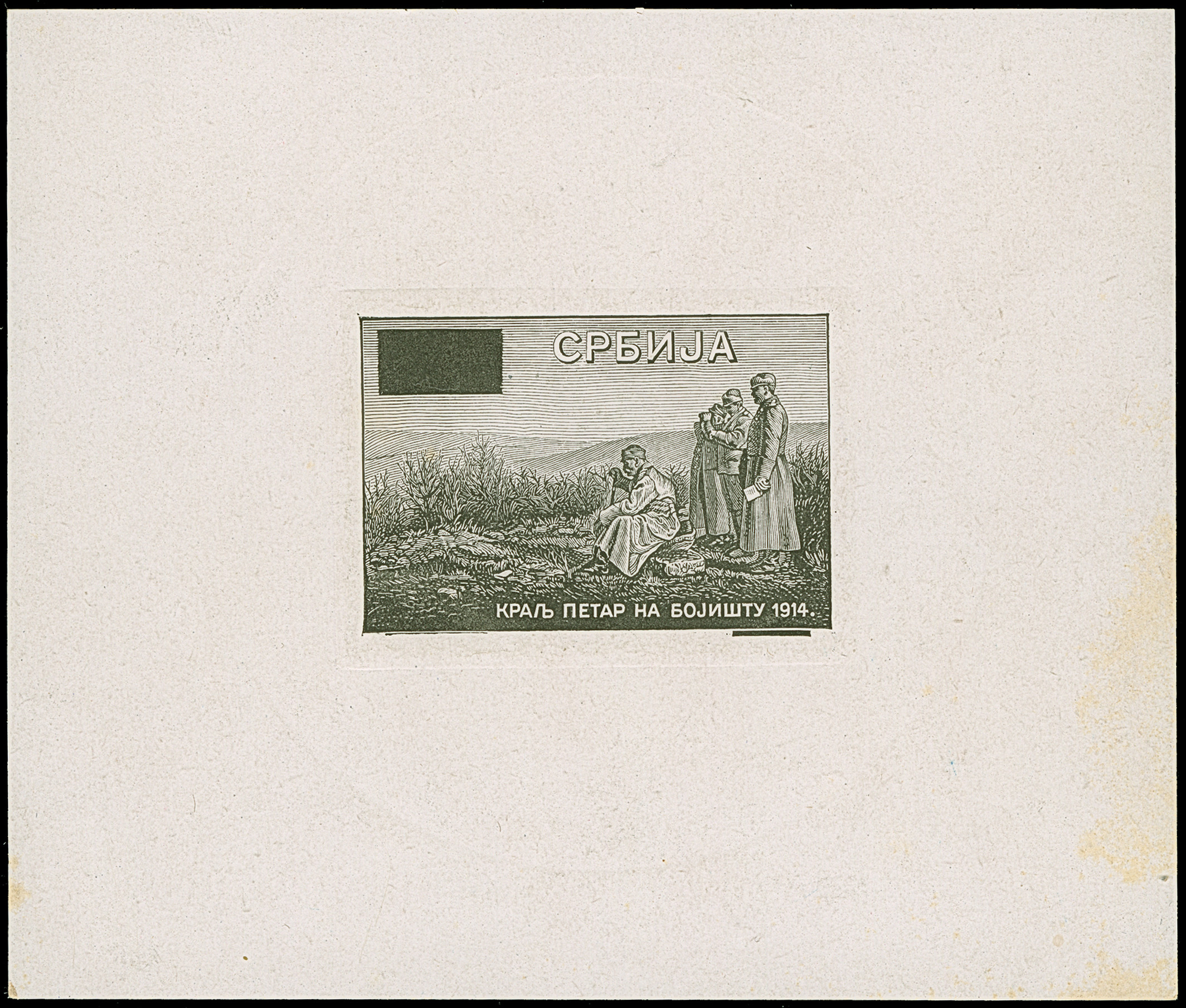 1915, King Peter & Military Staff without value, imperforated single die proof in black, on white, ungummed paper (90x75mm), fine, signed Calves