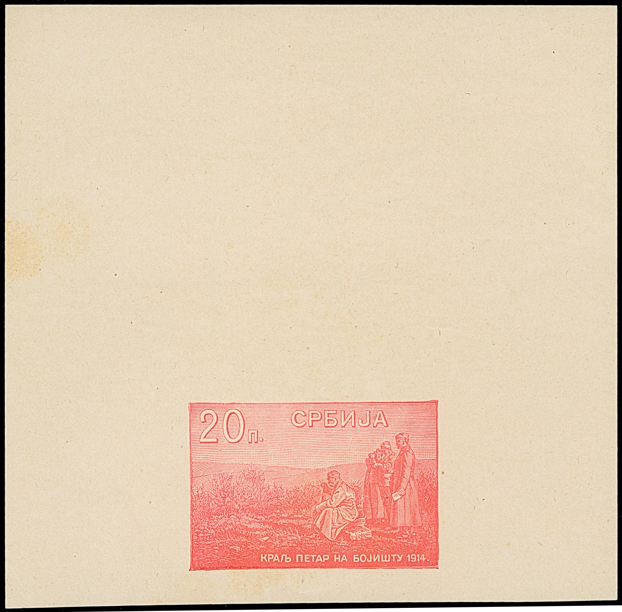 1915,King Peter & Military Staff 20 pa. rose, imperforated singel die proof on ungummed, white paper (88x85mm), fine, signed Calves