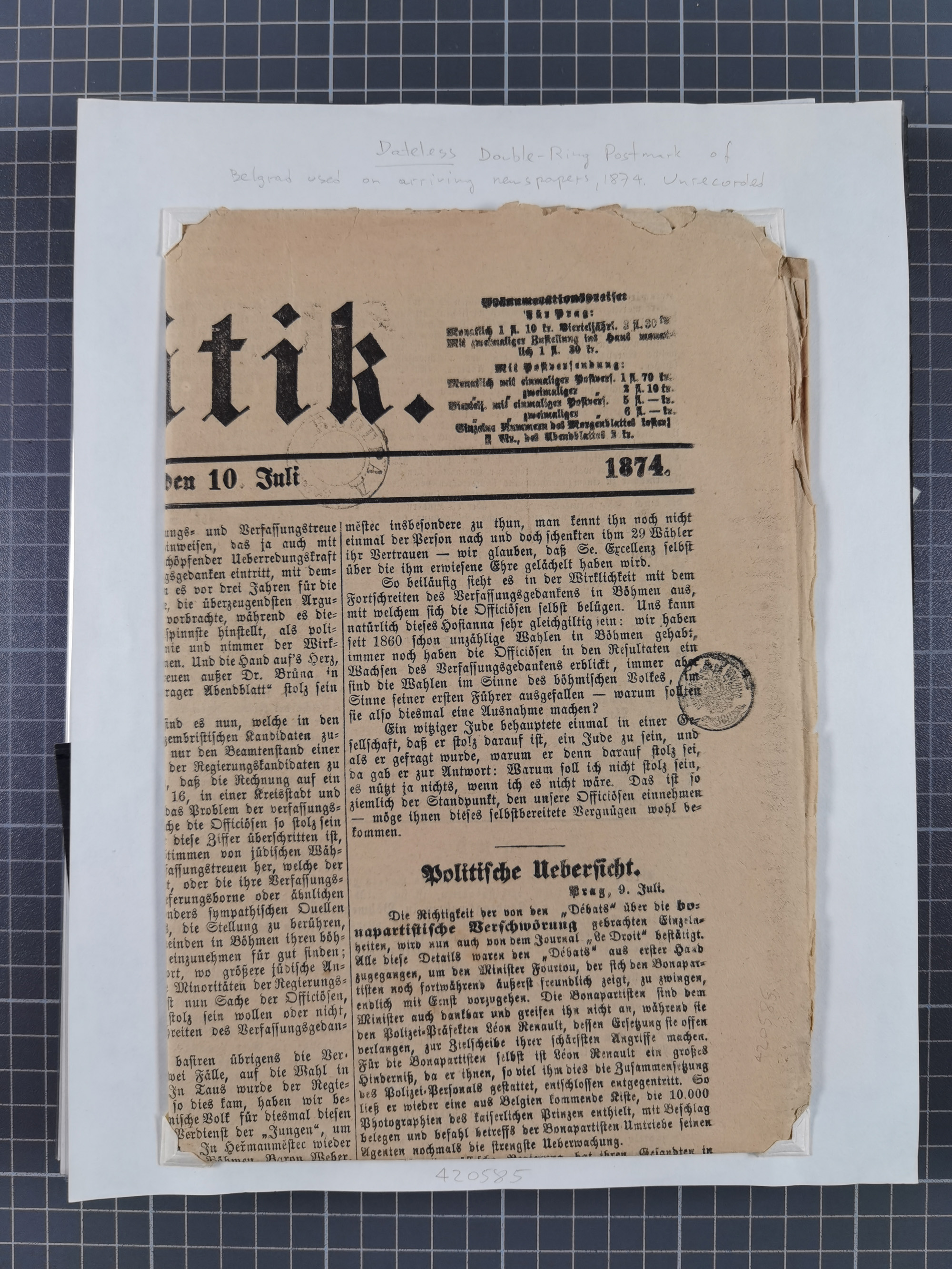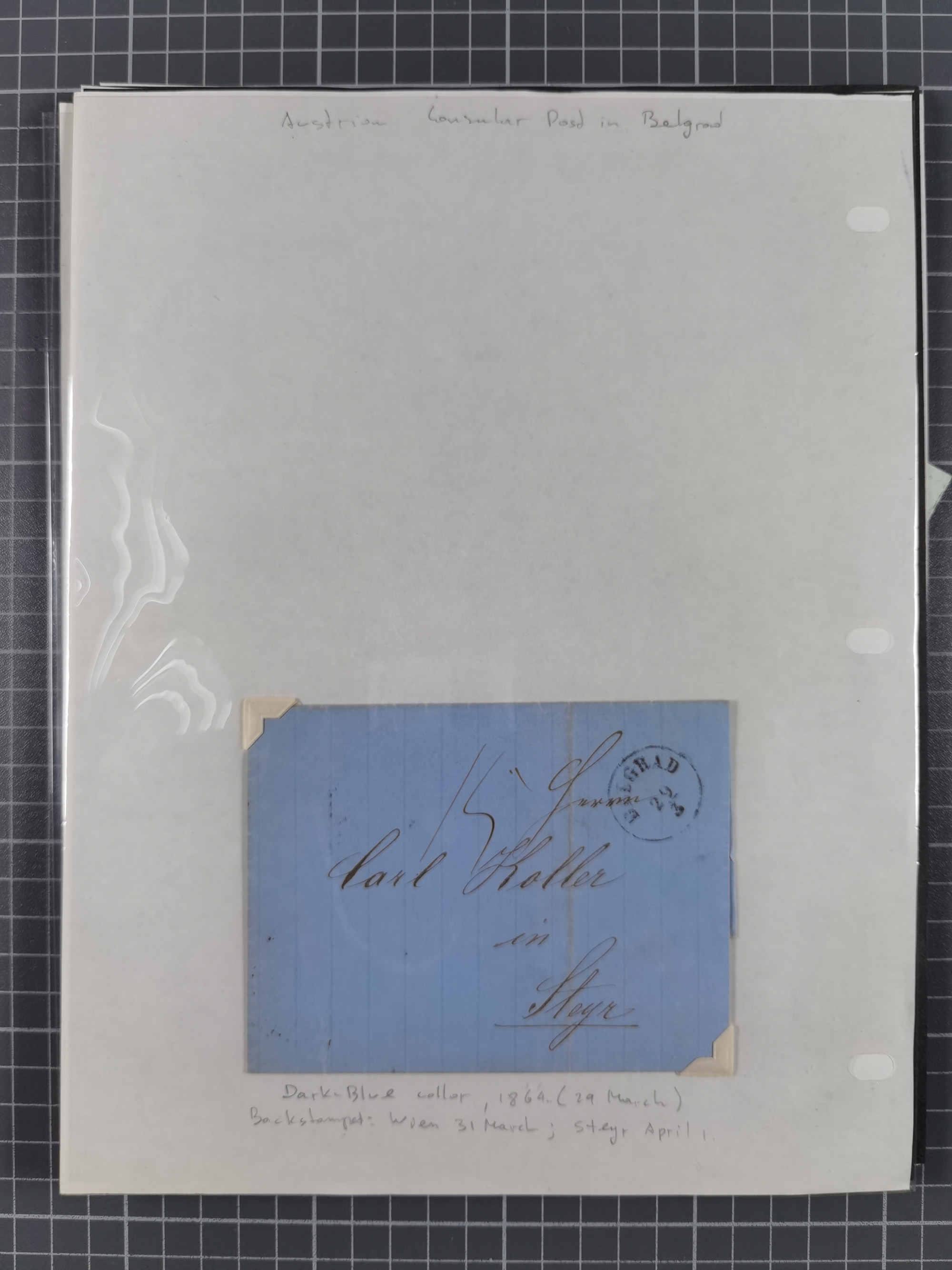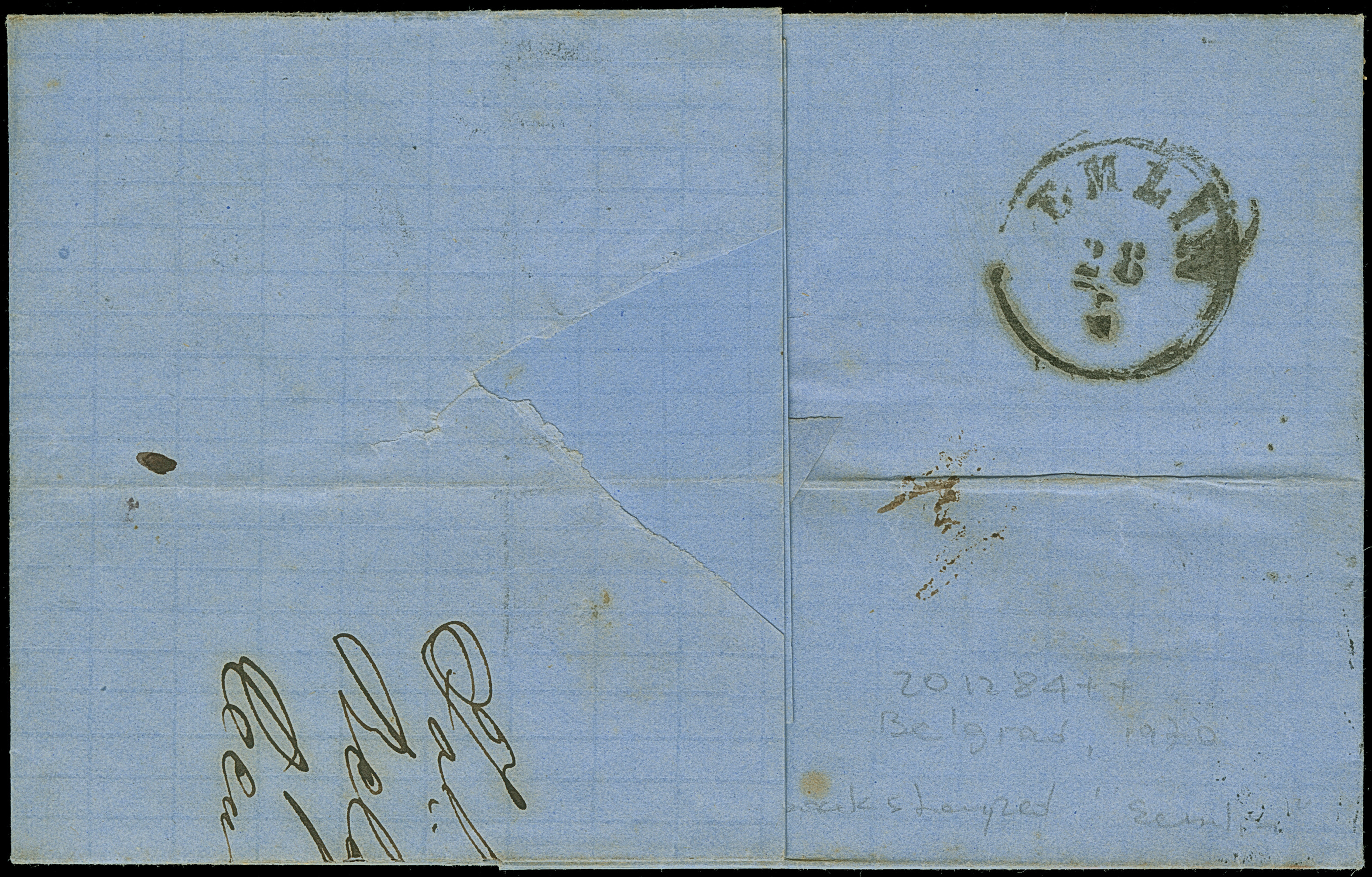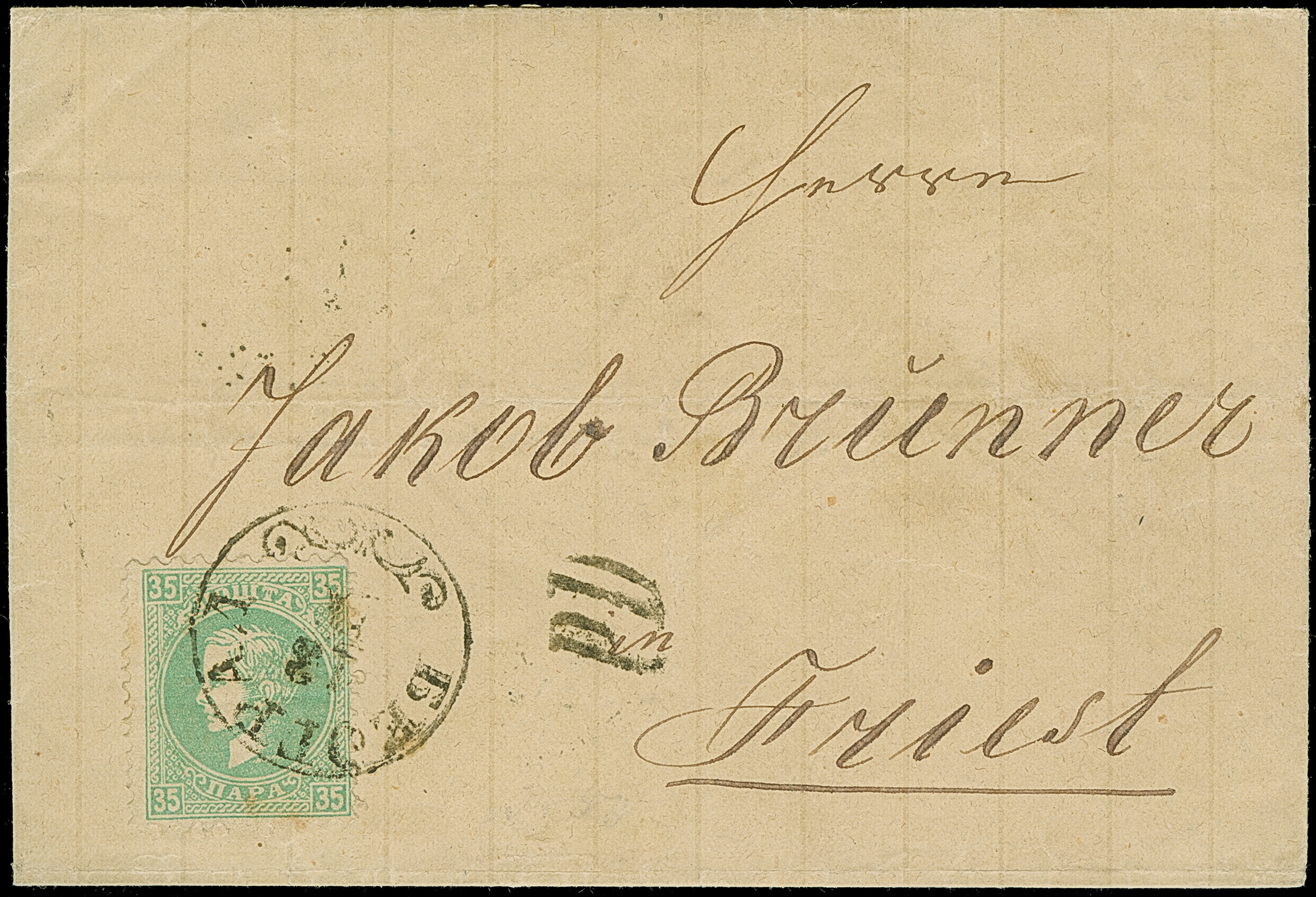 1867, 10 (Kr.) grün, Tpe I mit blauem Ovalstempel “K.K.PR.1TE D. DAMPFSCHIFFAHRT AGENTIE BELGRAD” auf Vordruckbrief nach Rahova. Der Umschlag mit Falt- und Beförderungsspuren, die Marke mit verkürzten Zähnen und Eckbug links oben sowie  links etwas fleckig. Trotz der Einschränkungen noch feiner Brief mit dieser äußerst seltenen Entwertung, ProFi hat nur einen weiteren Brief mit dieser Entwertung registriert