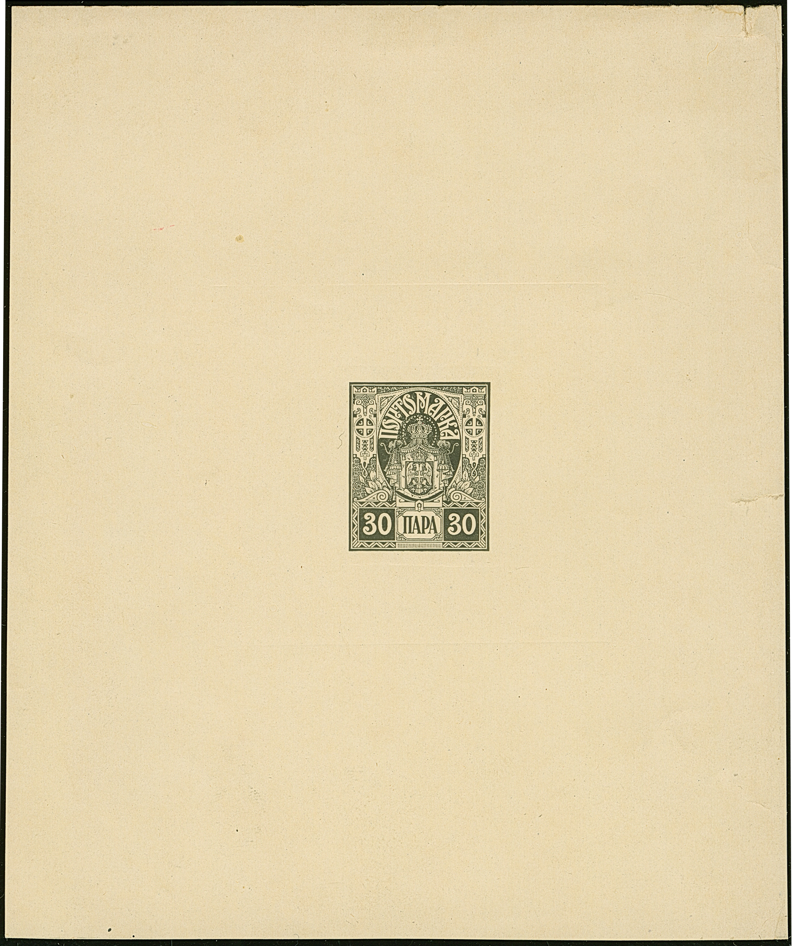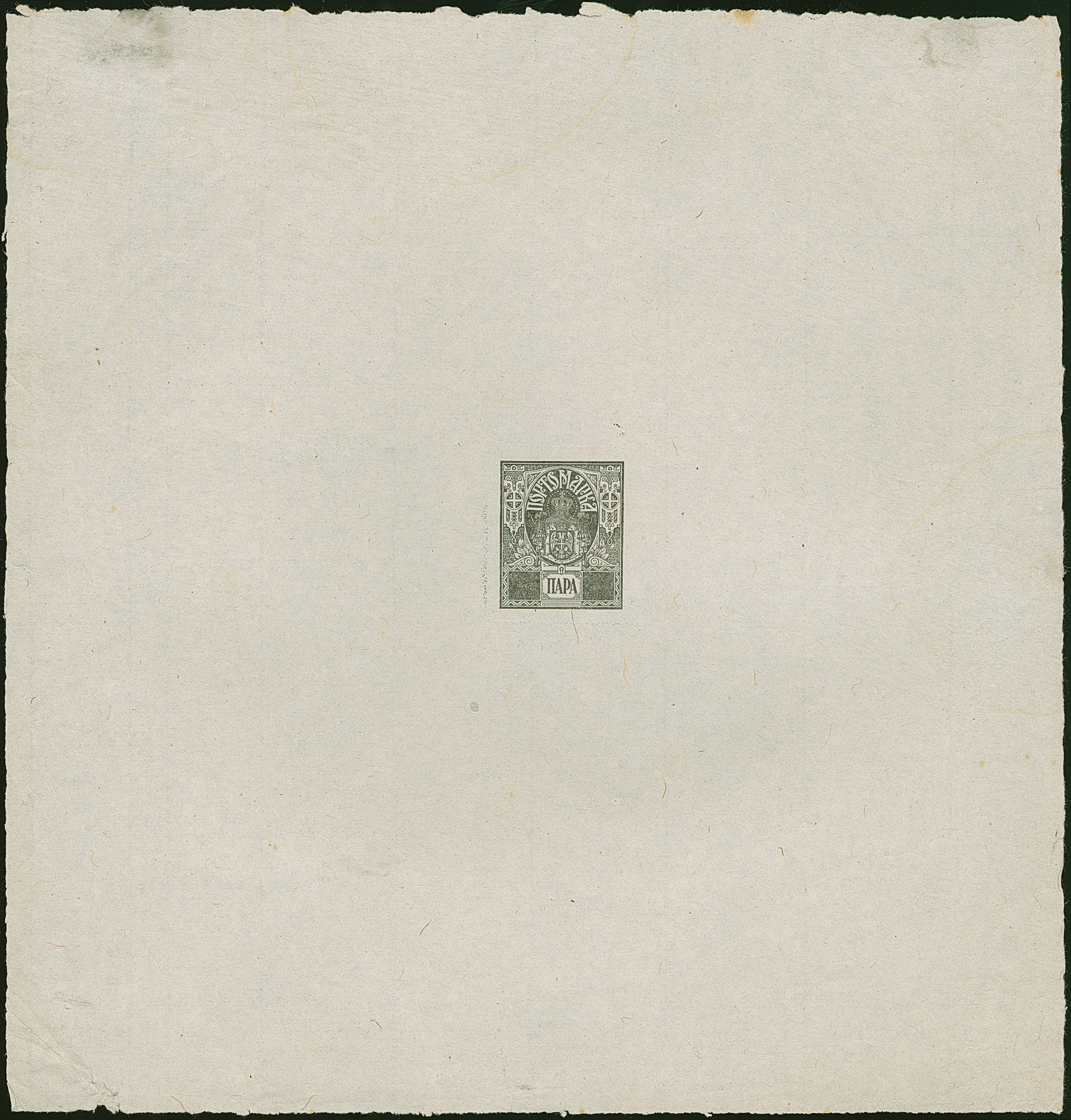 1918, Coat of Arms 30 pa. black, imperforate single die proof on glossy, ungummed paper (107x127mm), small tear at right and small corner fault at upper right, otherwise fine