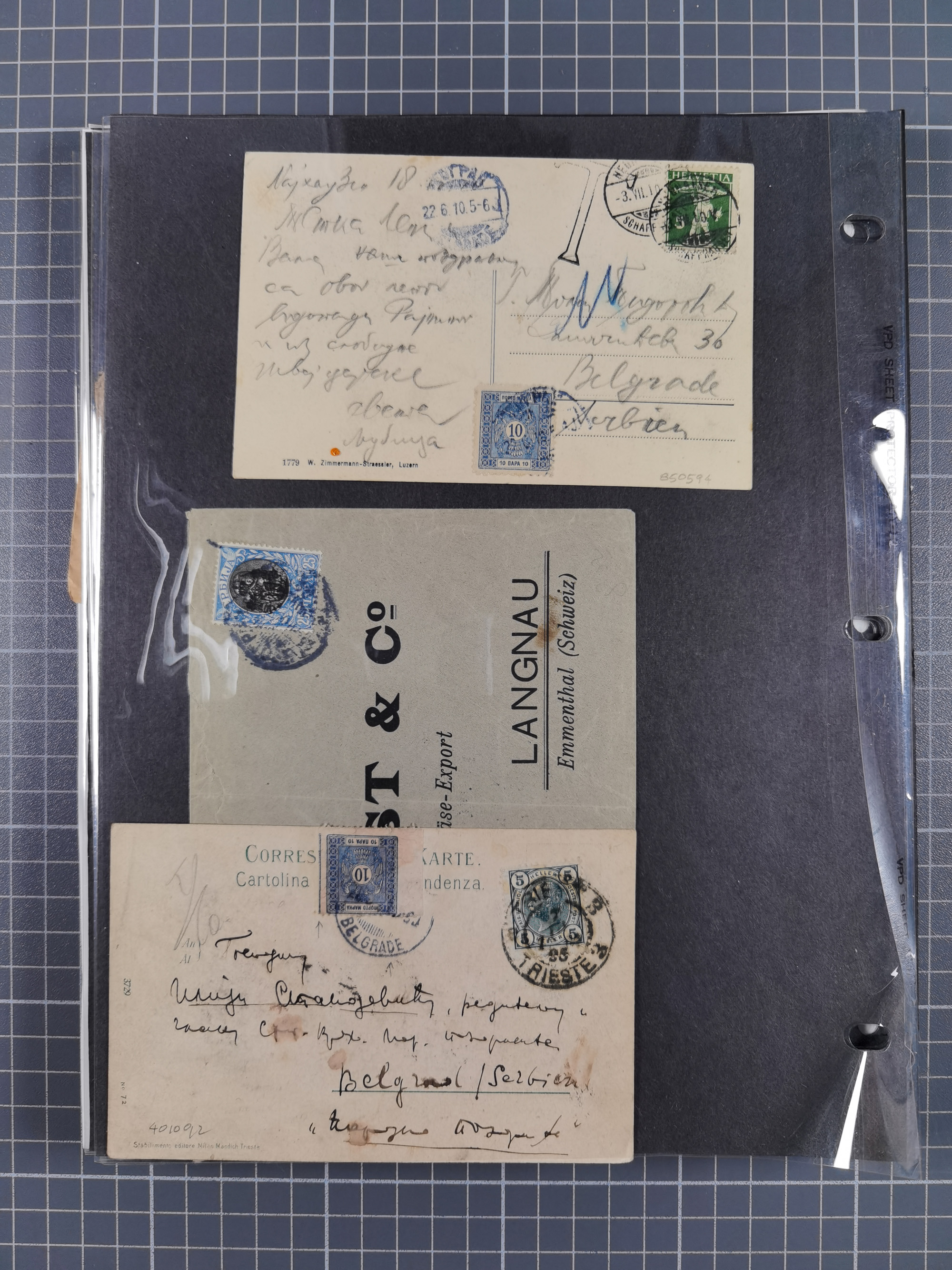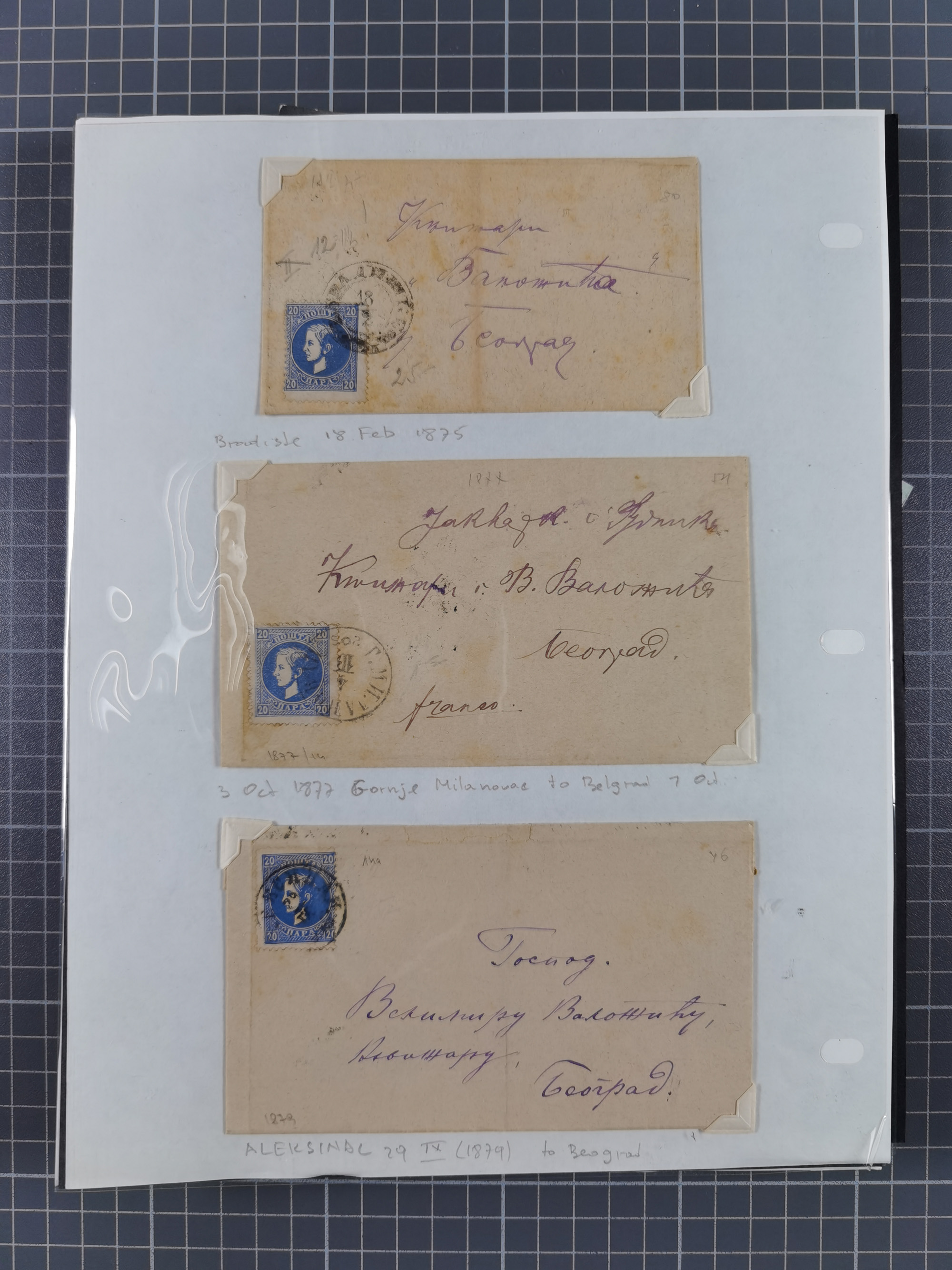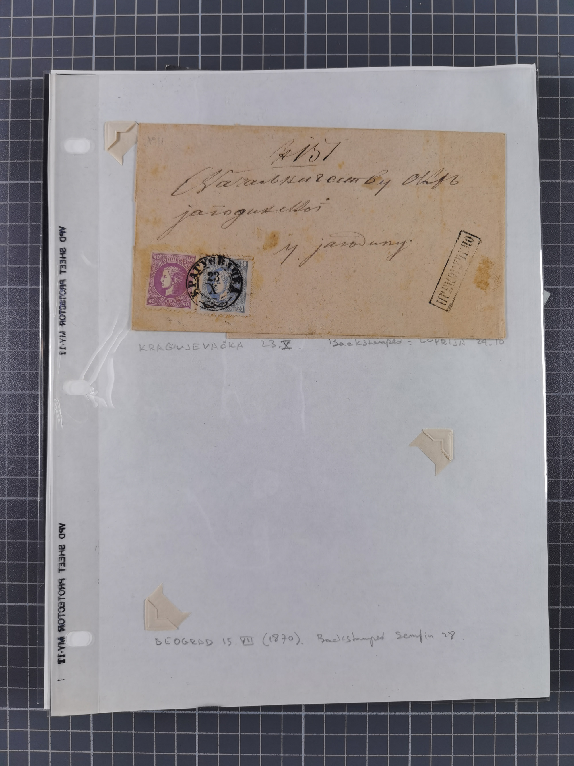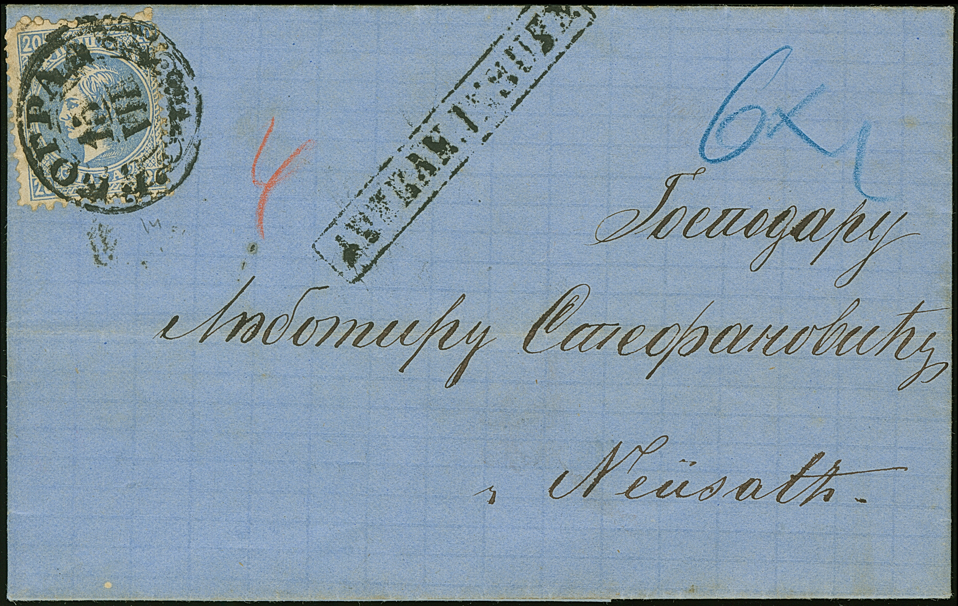 1869/70, Prince Milan IV. 20 pa. blue tied by cds. “BELGRADE 15.VII.(70) to underfranked entire letter with boxed ”AFFRAN.INSUFF." and red tax note “4” via Semlin to Neusath with change blue tax note “6x” (Kreuzer), fine