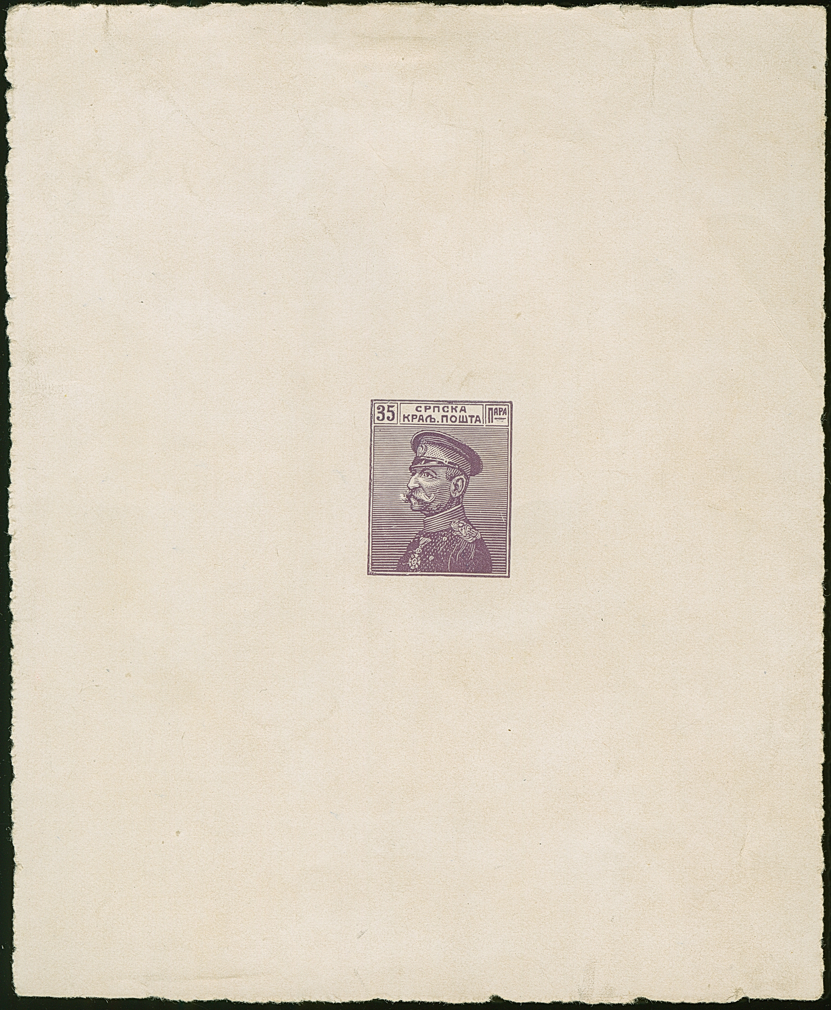 1914, King Peter I. 35 pa violet, imperforate proof on white, ungummed paper (114x140mm), tiny creases at the margins, otherwise fine