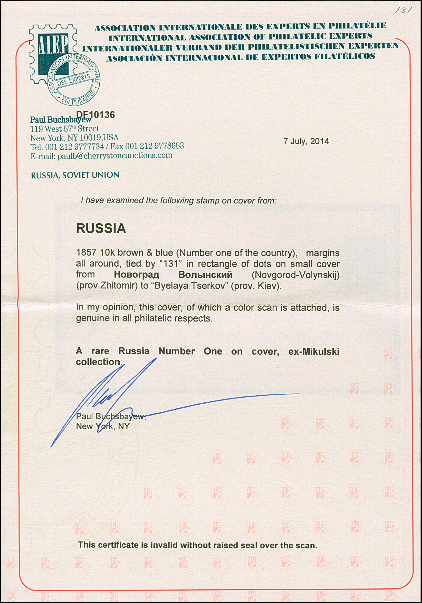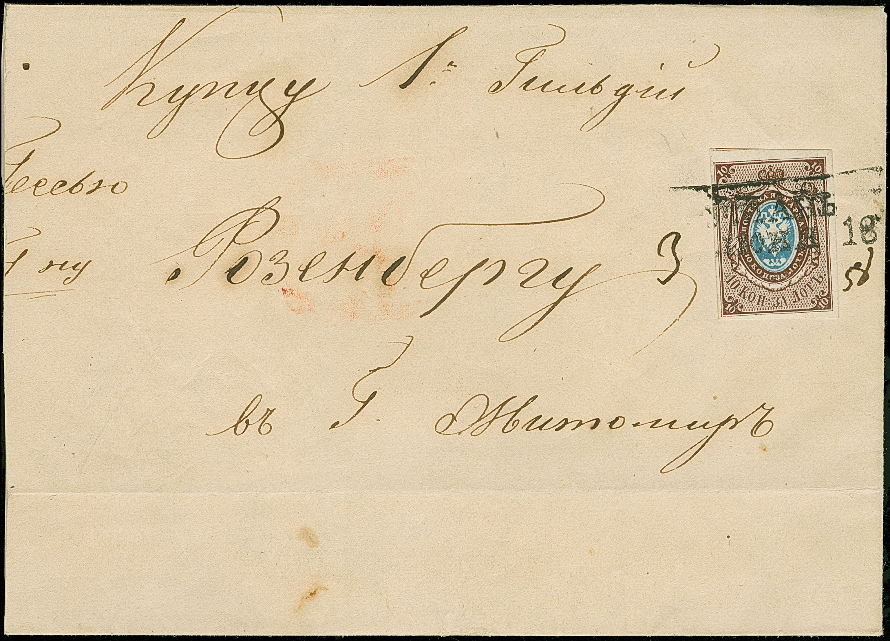 NOVGRAD-VOLYNSK (Ukraine): 10 kopeck brown & blue, good to large margins, tied by dotted rectangular "131" to small envelope to Byelaya Tserkov. Very fine and fresh. The only recorded No.1-entire from this small city. Certificate Buchsbayew (2014)