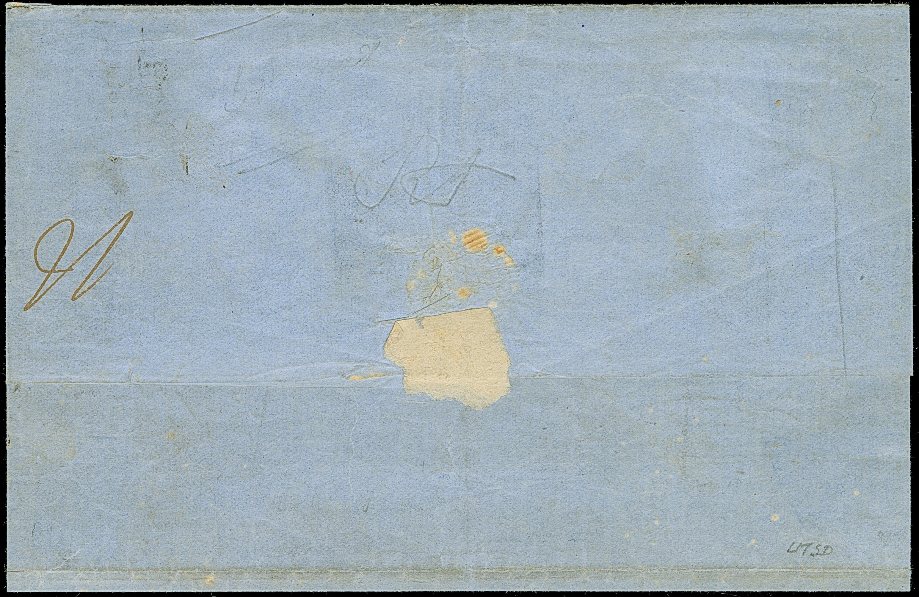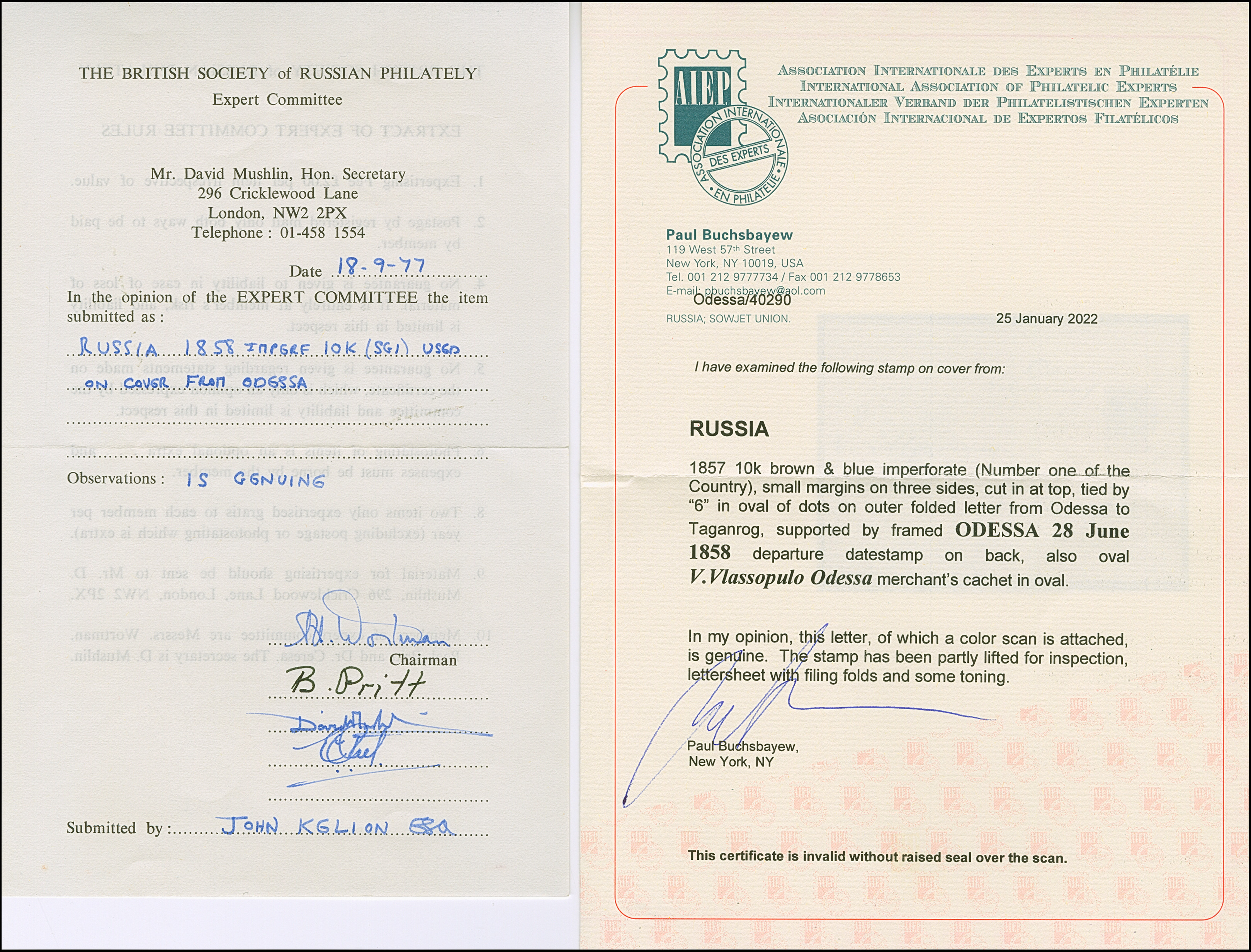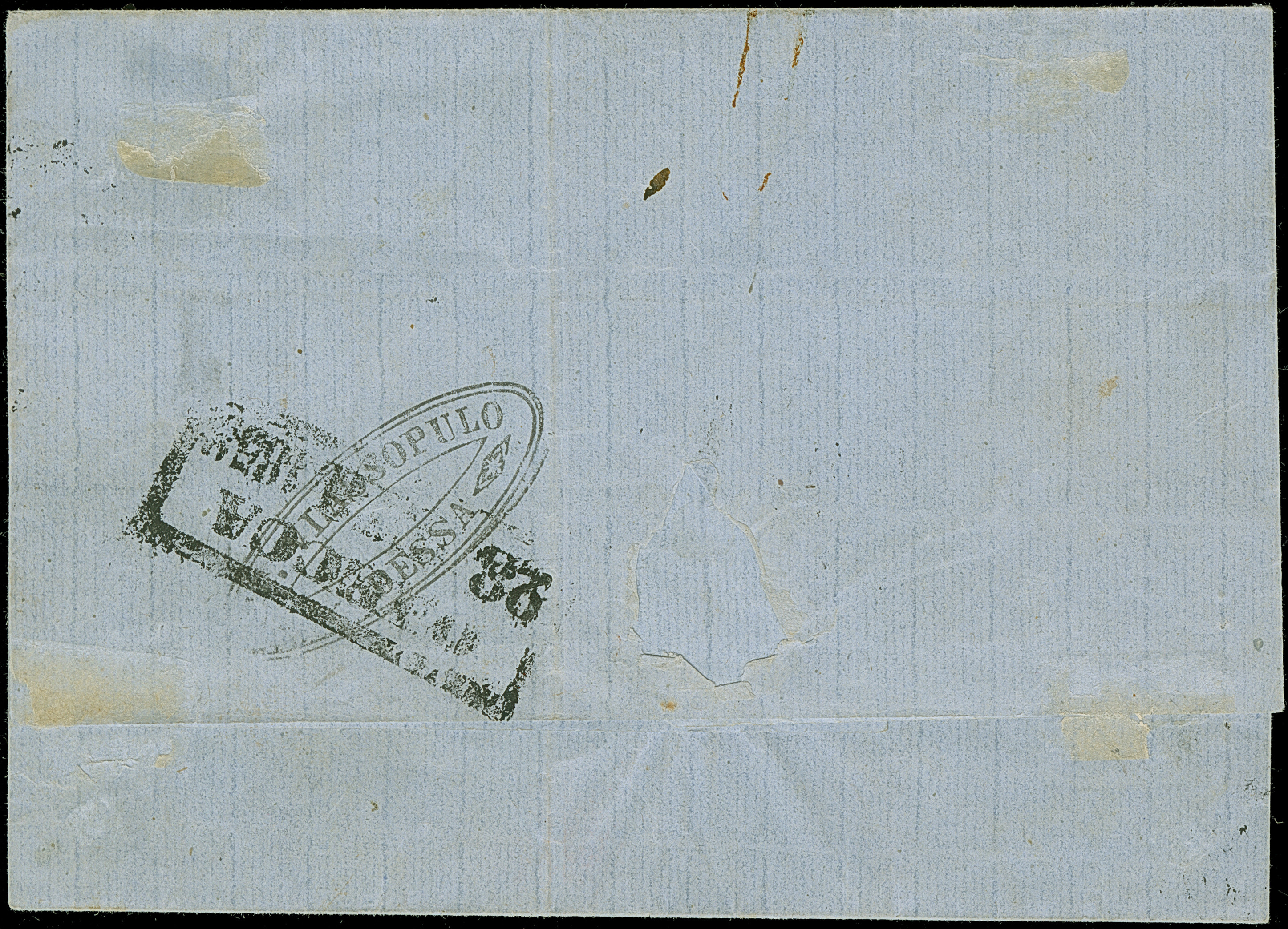 ODESSA (Ukraine): 10 kopeck brown & blue, touched at top and partly at right, otherwise ample margins (was lifted for inspection), tied by dotted oval "6" to letter sheet to Taganrog. On the rear framed “ODESSA 28 JUNE 1858” Just one further No.1 cover has been recorded with the dotted oval of Odessa. Certificate Buchsbayew (2022)