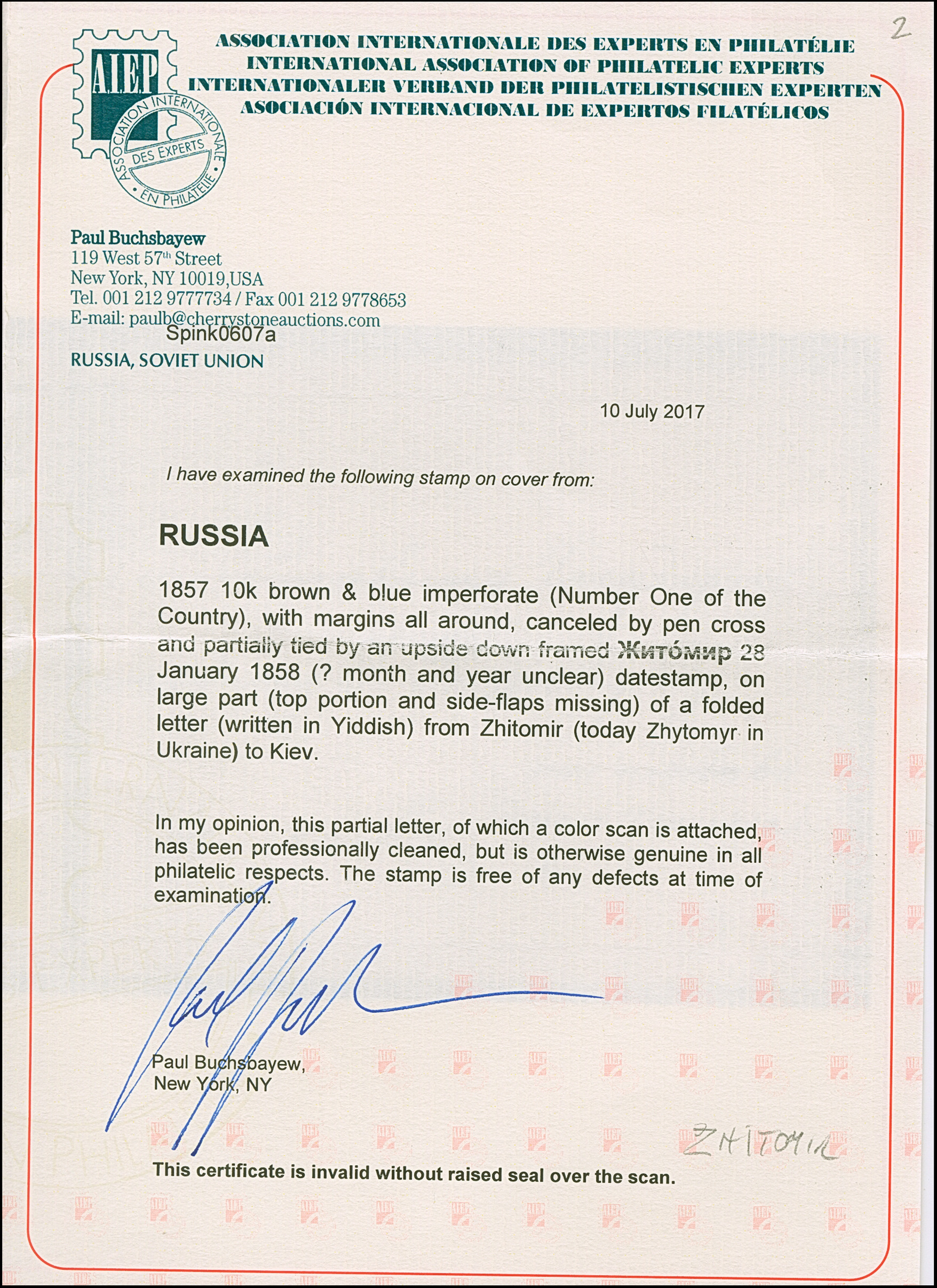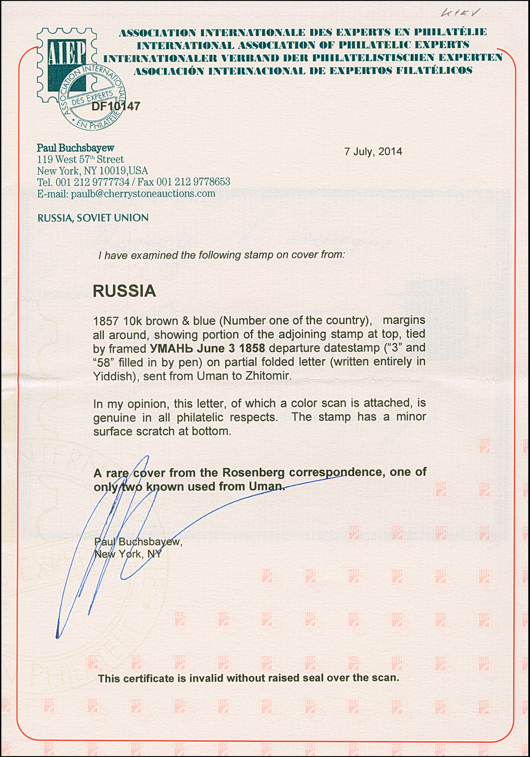 UMAN (UKRAINE): 10 kopeck brown & blue, good to large margins, tied by boxed "UMAN 3 JUNE 1858" (with "3" and "58" added in manuscript) to letter written entirely in yiddish (outer flaps partly missing), to Zhitomir. The stamp with tiny surface scratch in the lower frame line, otherwise very fine and fresh. A very rare No.1-usage; just one further entire has been recorded from this small place. Certificate Buchsbayew (2014)