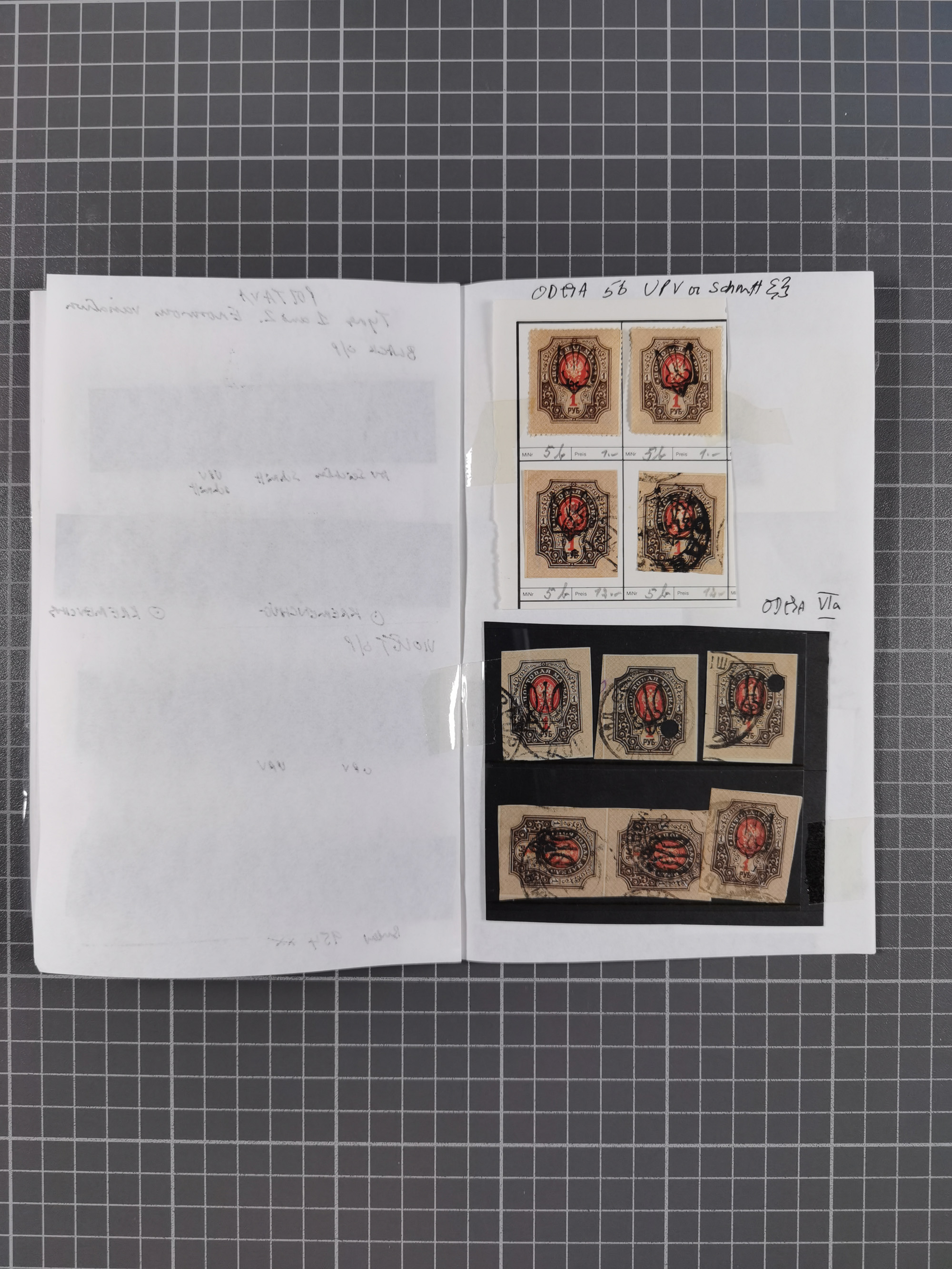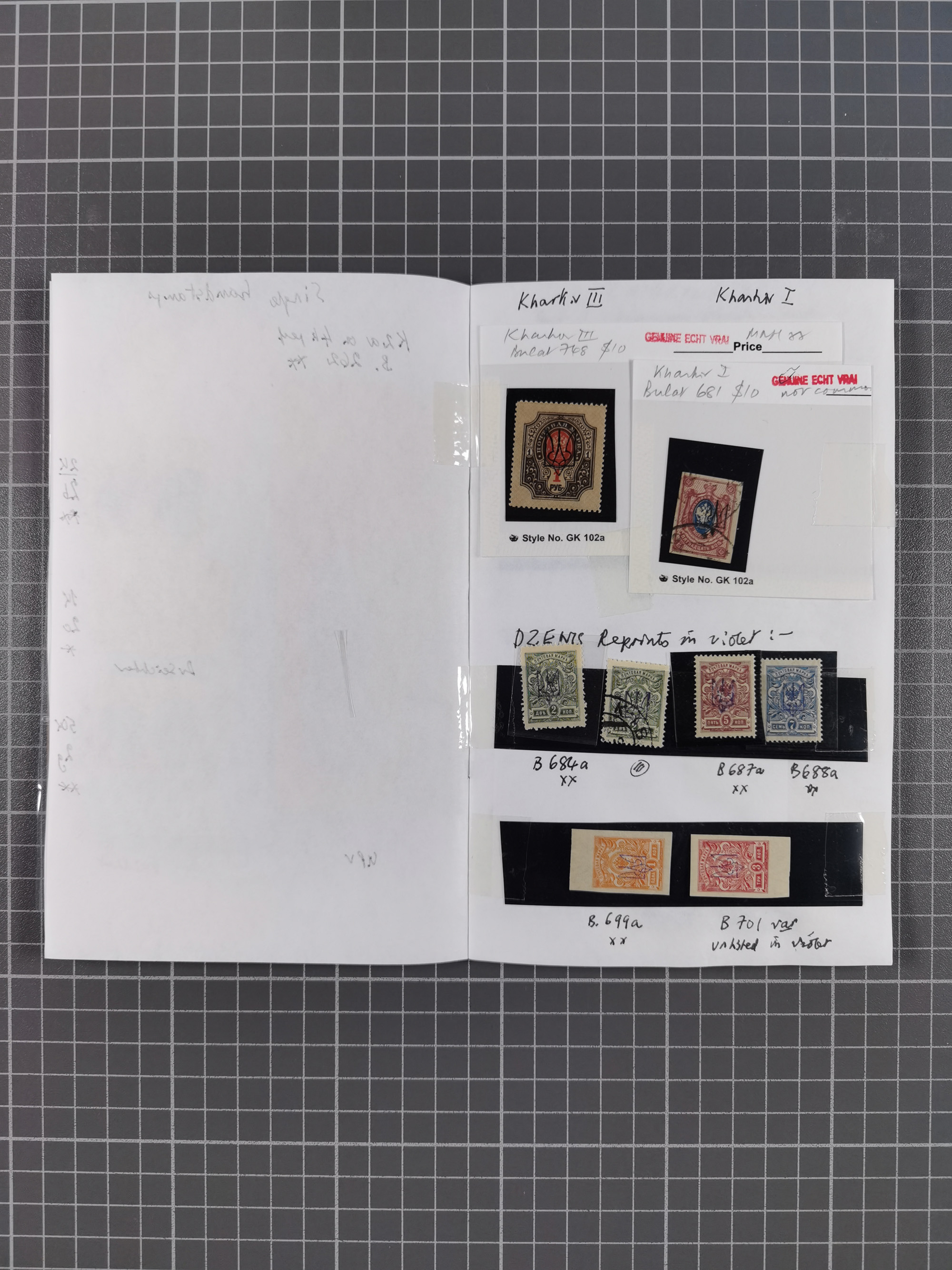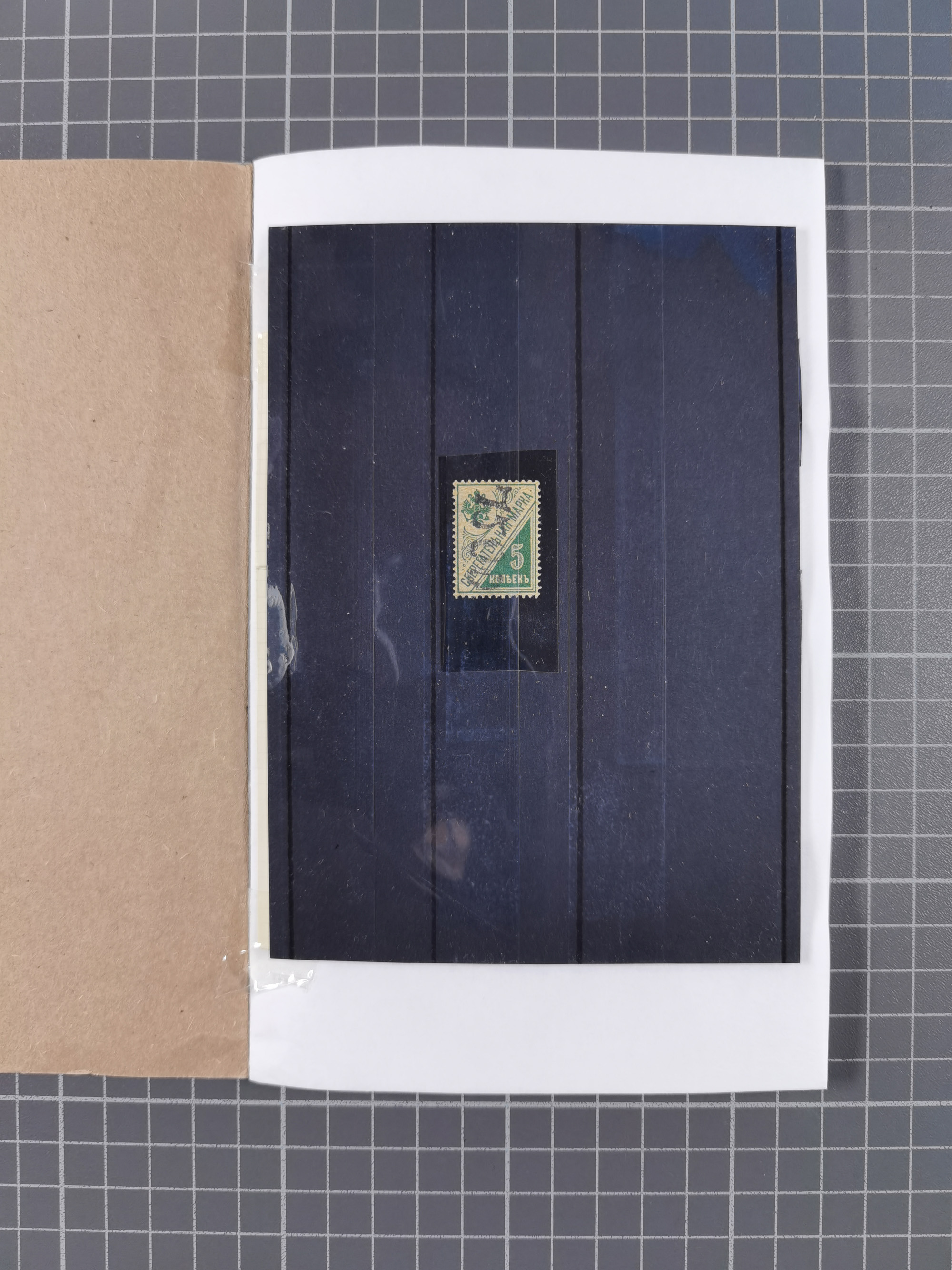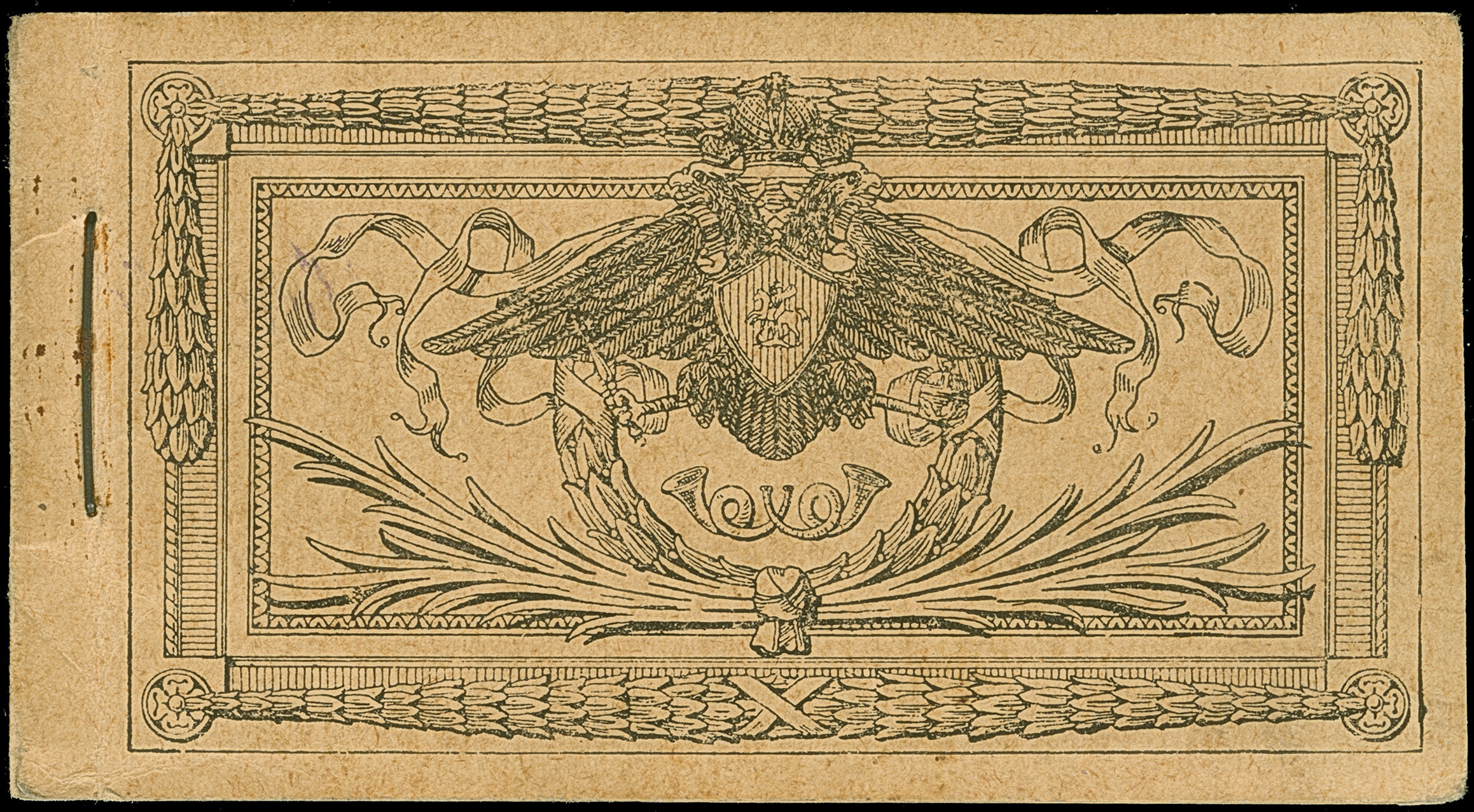 1918 BOOKLET: 1913, Imperial Russia booklet for 2 roubles on black on buff cover, specially issued for the “KIEV POST & TELEGRAPH OFFICE”, originally containing nine panes, each of six adhesives for three values of 7 k. (3), 3 k. (3) and 1 k. (3), overprinted in 1918 with violet trident single rubber handstamp (Bulat Kyiv Type 2), only one pane of 7 k. intact, the others either missing or incomplete, 31 adhesives remaining in total, of no importance for this extremely rare item, unrecorded by Bulat (who mentions only one example of the 80 kopek booklet), fine