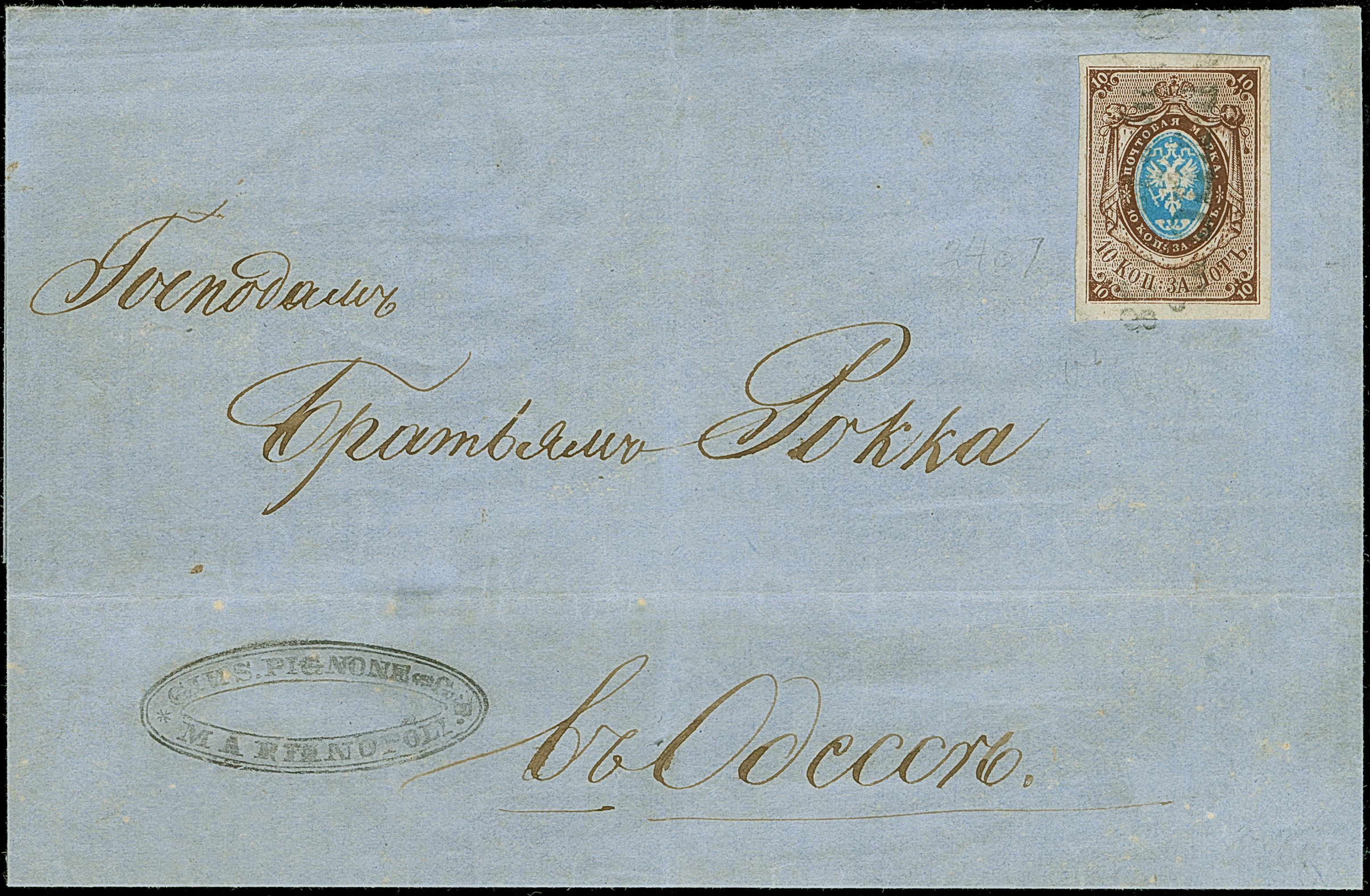 MARIUPOL (Ukraine): 10 kopeck brown & blue, large margins, tied by pre-philatelic double line "MARIUPOL 9 APRIL 1858" to letter sheet to Odessa. Very fine, attractive and rare; just 2 further No.1 entires have been recorded with this cancellation. Certificate Buchsbayew (2014)