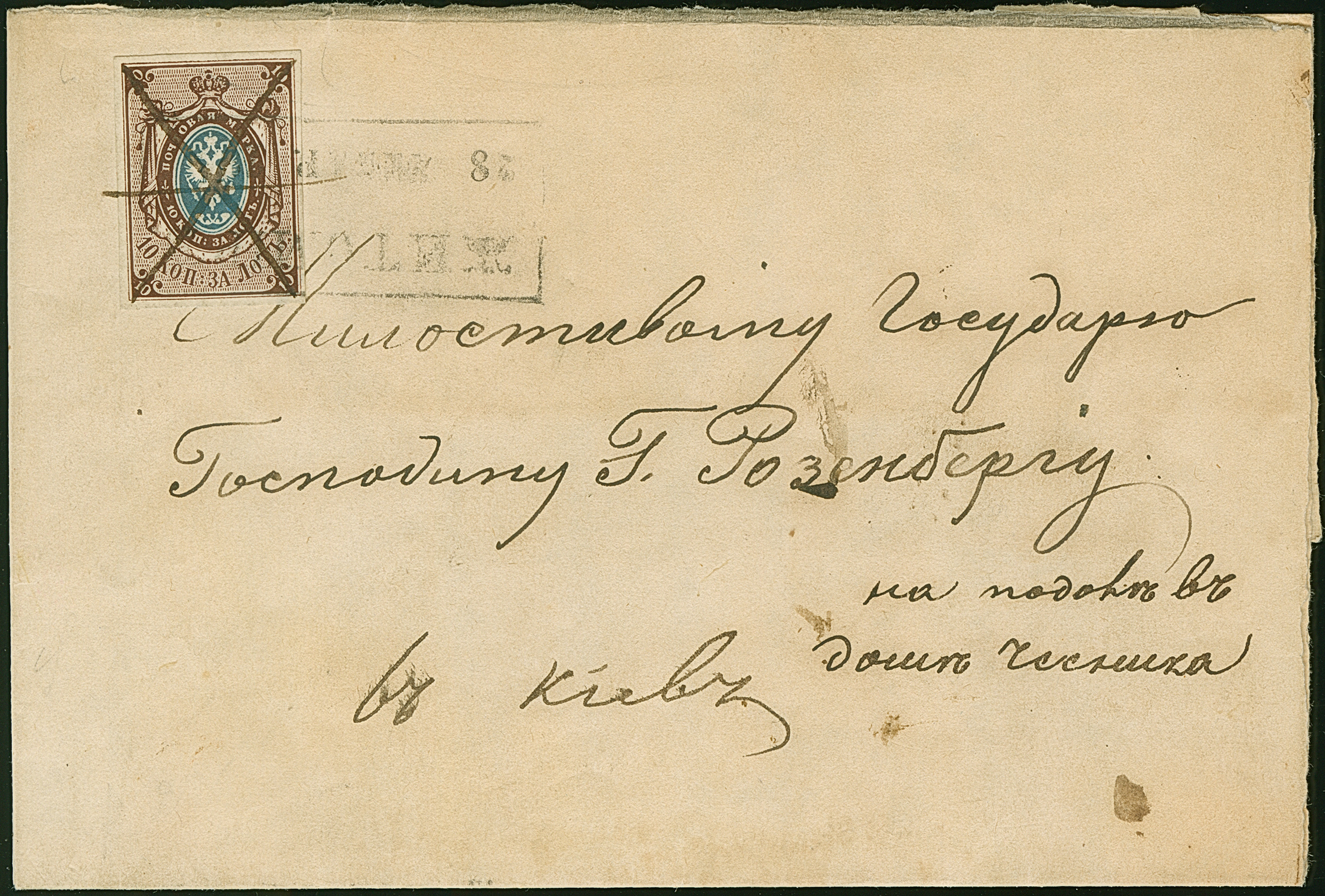 KAMENETS PODOLSK: 10 kopeck brown & blue, ample to large margins, showing part of neighbouring stamp at base, used with central and clear strike of boxed pre-philatelic handstamp to cover front (fold in the lower part broken and fixed). A rarity; the only recorded entire of this small city. Certificate Buchsbayew (2014)
