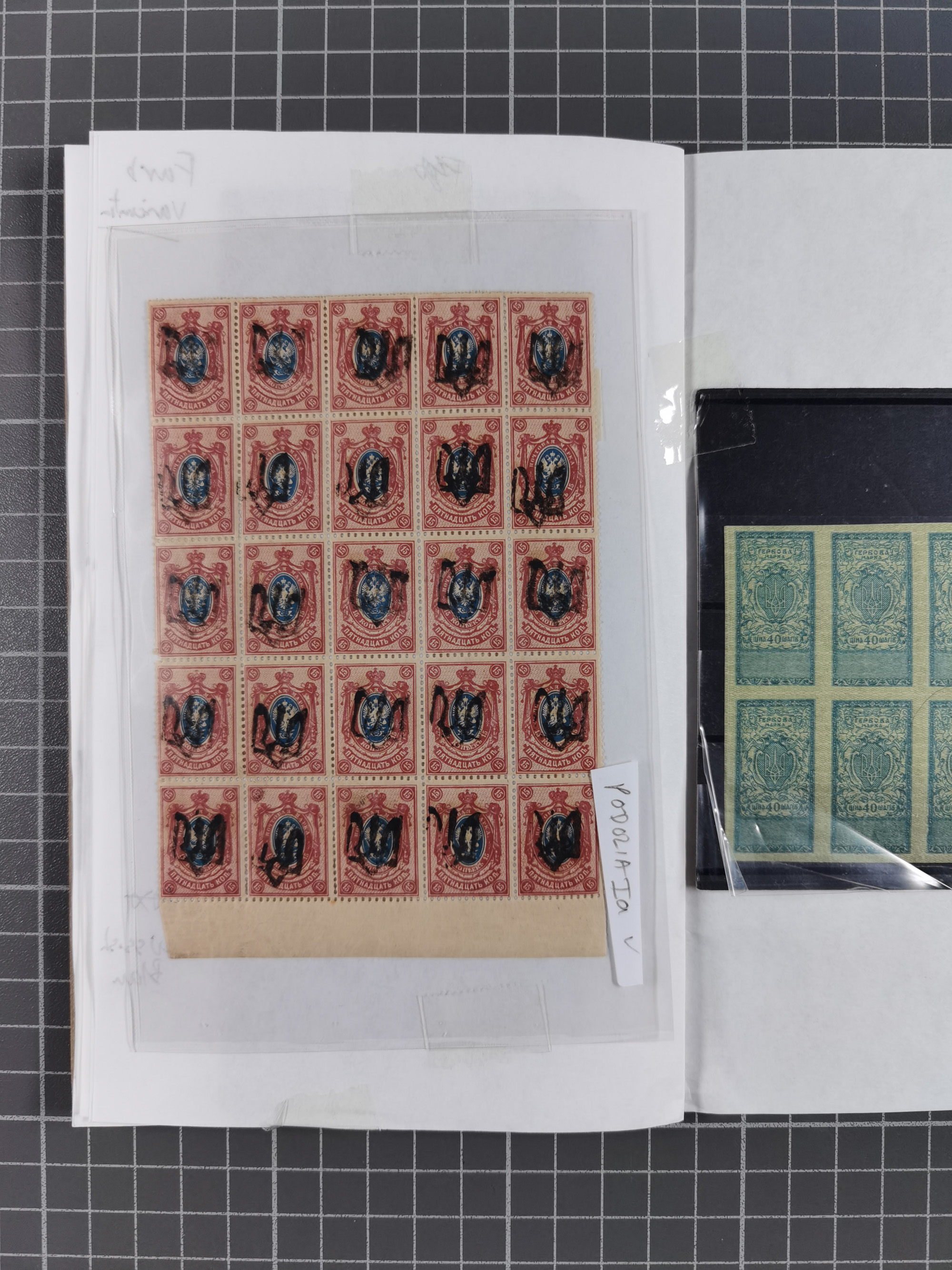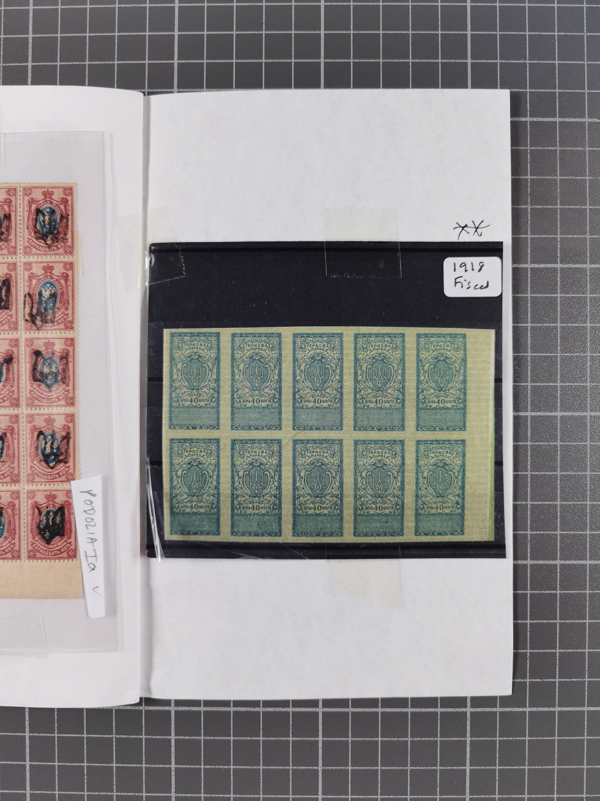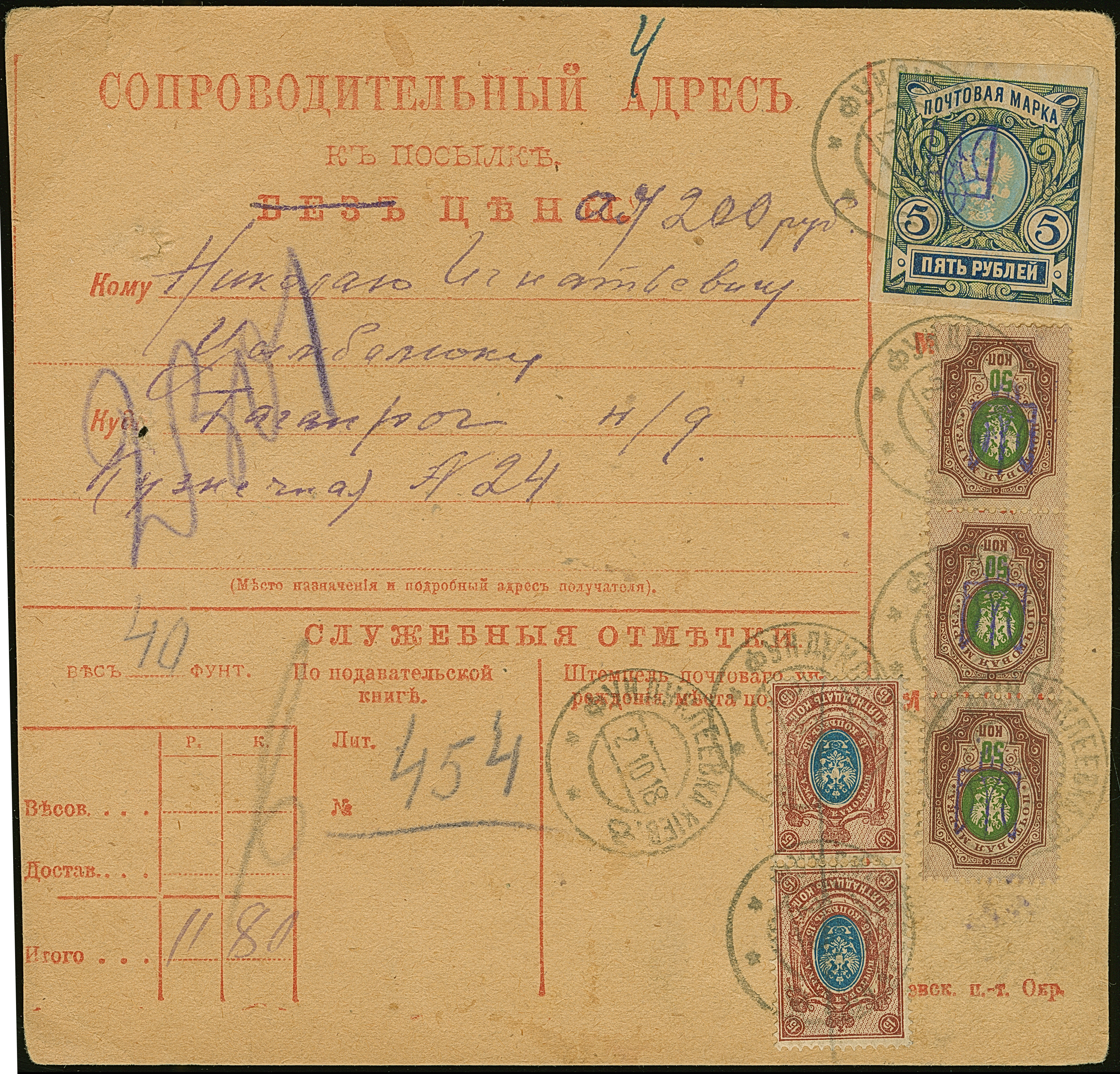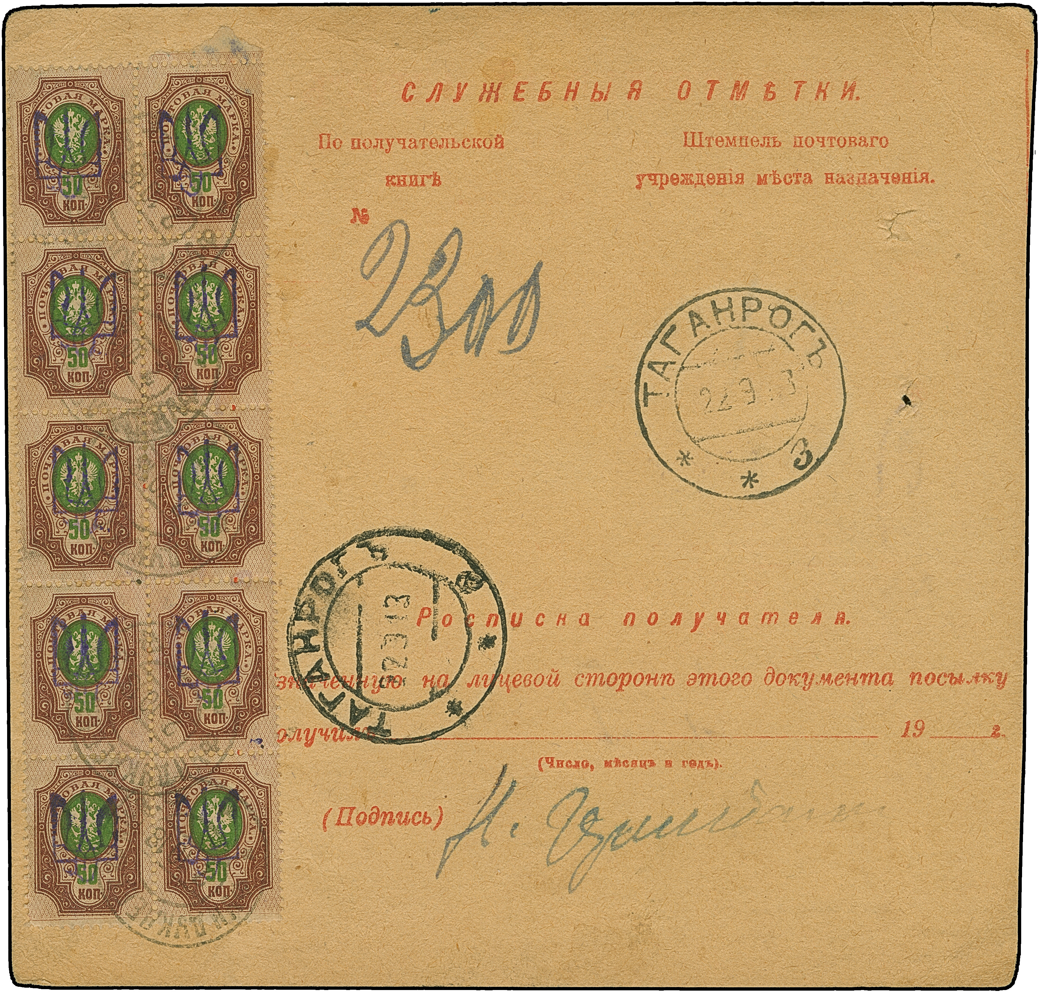 1918, Parcel card for a sending to Taganrog weighting 40 funts (about 16 kg), endorsed “11 (roubles) 80 (kopeks)" and accordingly franked with Kiev Tridents 5 r. and 50 k.  (block of ten and strip of three) in mixed franking with Russia 15 k. (vertical pair), all tied by cds “FUNDUKLEEV KIEV 2 10 18”, reverse ”TAGANROG 22 9 23"; fine and very scarce