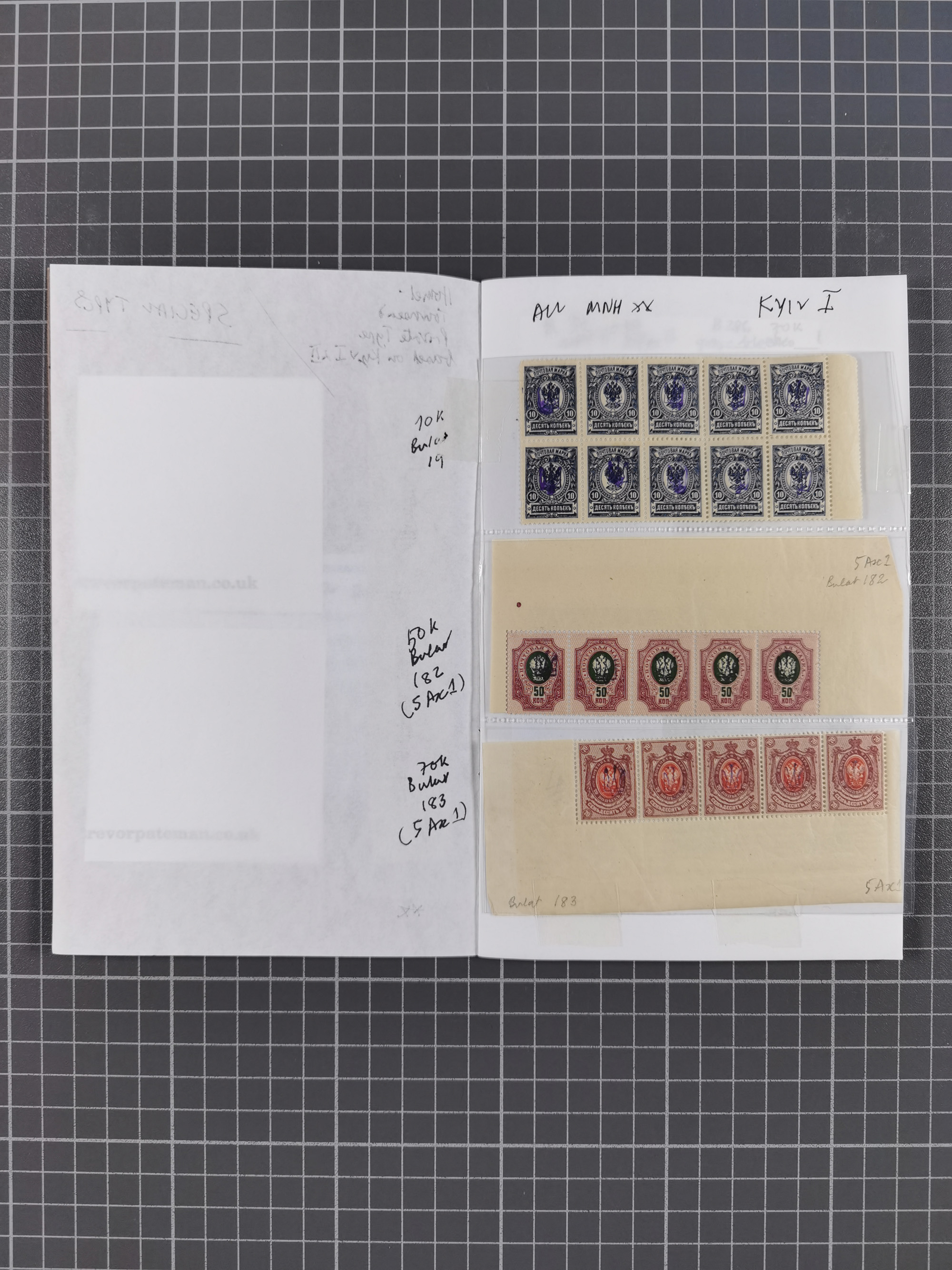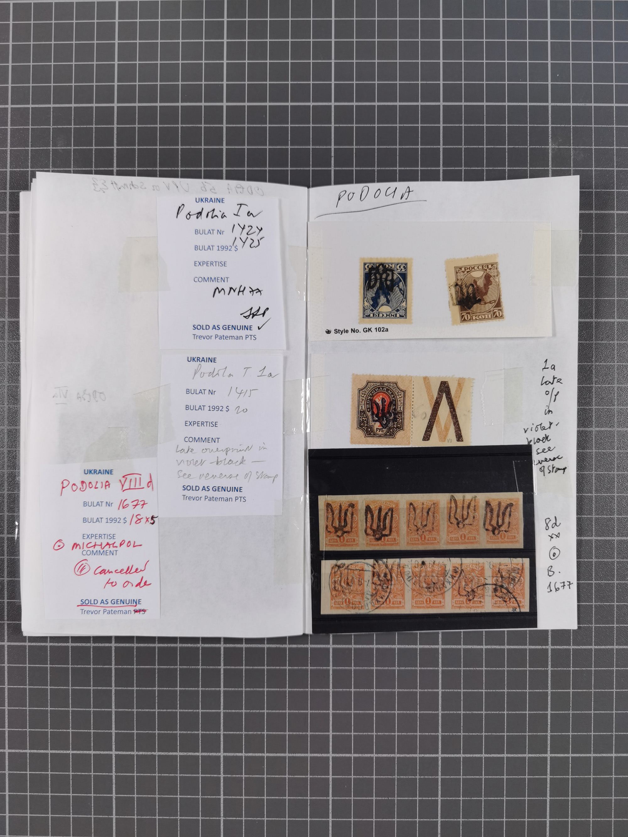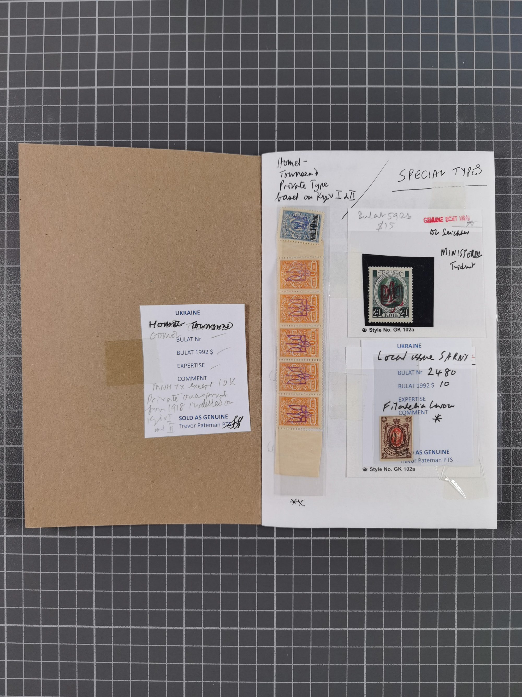 1918/20, Ukraine Tridents, over 100 unused and used stamps, including some multiples, with a fine choice of local overprints including the Romanov issue, noted Kiev, Kharkov, Poltava, etc., small part of postmarks with usages from Olgopol, Sarnovskoe and Murafa, a few values signed, neatly housed in one booklet and expertly attributed to Bulat numbers. Except for the occasional fault in overall fine condition
