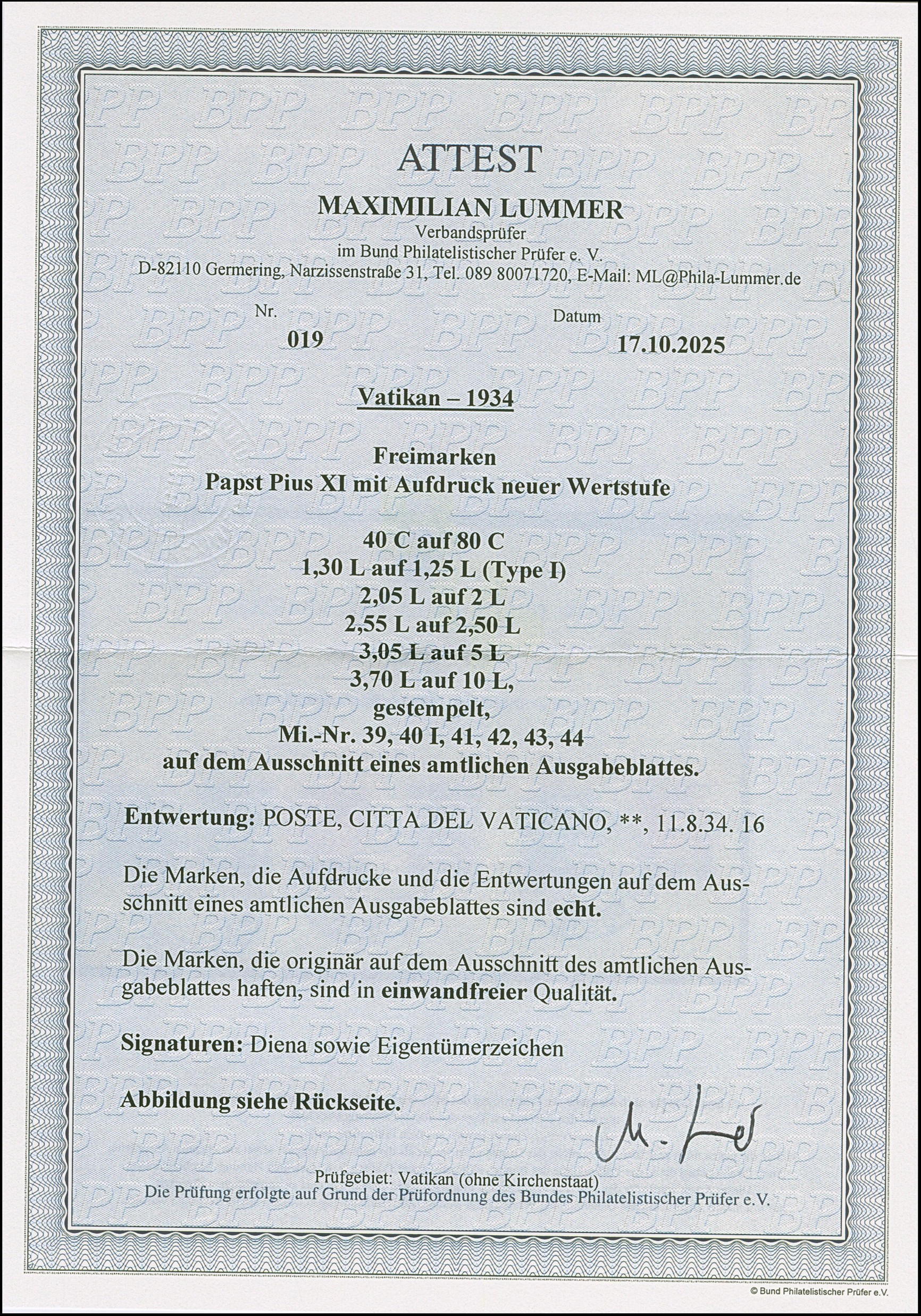 1934, Provisionals 40 c.-3,70 l., used on cut-out of official sheet, vf, certificate Lummer BPP (2025)