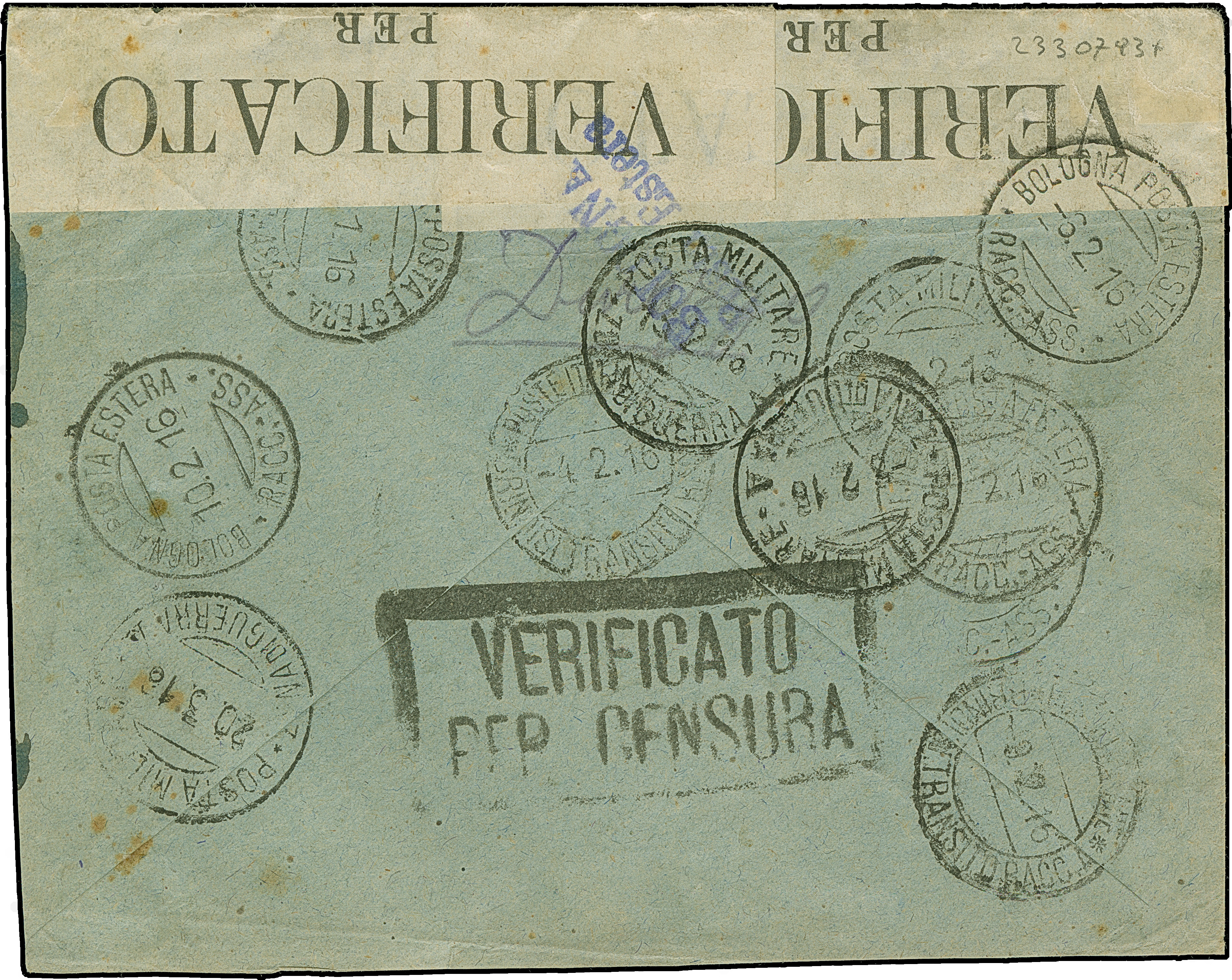 1909, Durazzo 4 pia. on 50 c. pale violet tied by cds. “DURAZZO 20.1.16” to registered cover with censor mark and labels to Podgorica, Montengro and retour with two labels in orange “..-N'A PU ÊTRE ATTEINT S.P. Bordeaux” and in green “RETOUR A L'ENVOYEUR S.P. Bordeaux”. The cover horizontal folded, otherwise fine