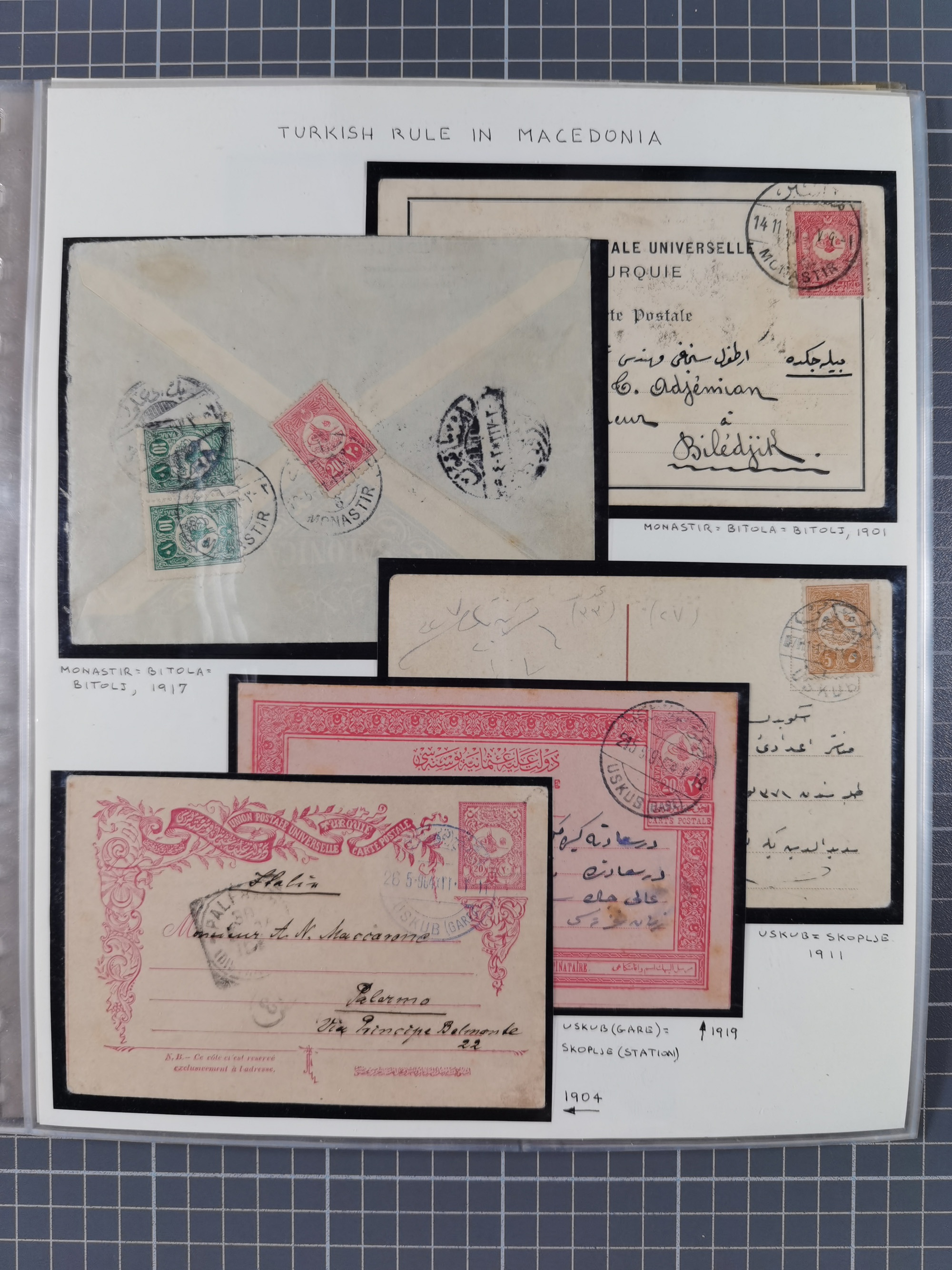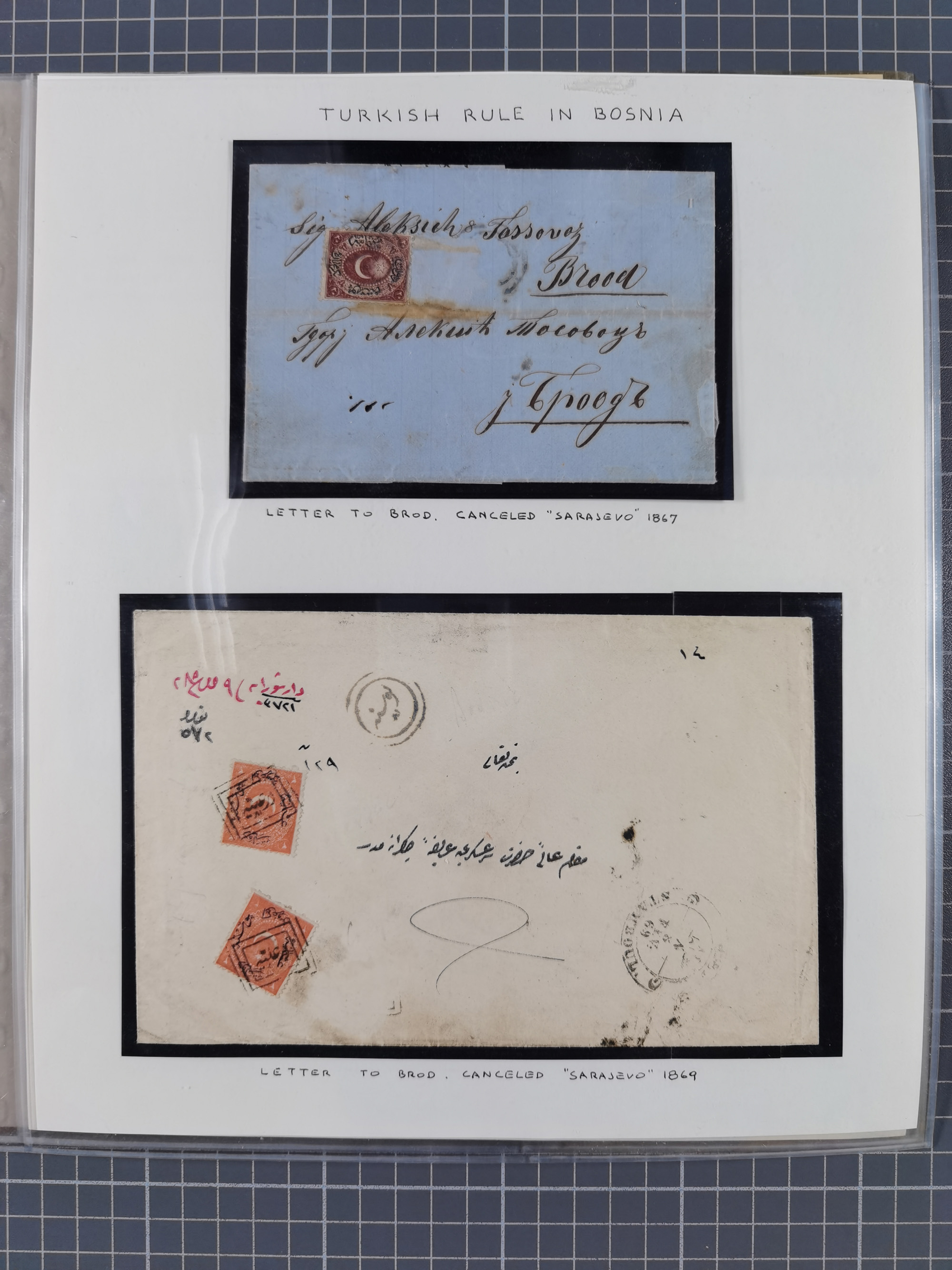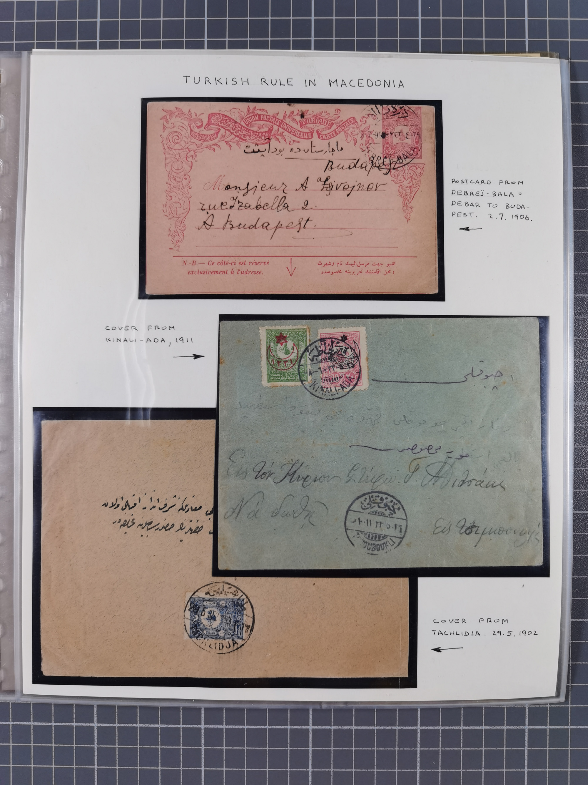 1822/1919, interesting collection Turkish, Austrian and Hungarian post offices in the Balkans from the pre-philatelic era with 25 covers and cards, with u.a. Turkish cancellation from Debre i. -Bala, Kinali-Ada, Monastir, Sarajevo, Tachlidja and Uskub, Austrian with registered cover from Lesina 1861 and Mi.-No. 5 with double line “SPALATO” on cover as well as Hungarian with registered cover 1882 from “KÖRÖS”. Two cover with missing stamps, otherwise mostly fine