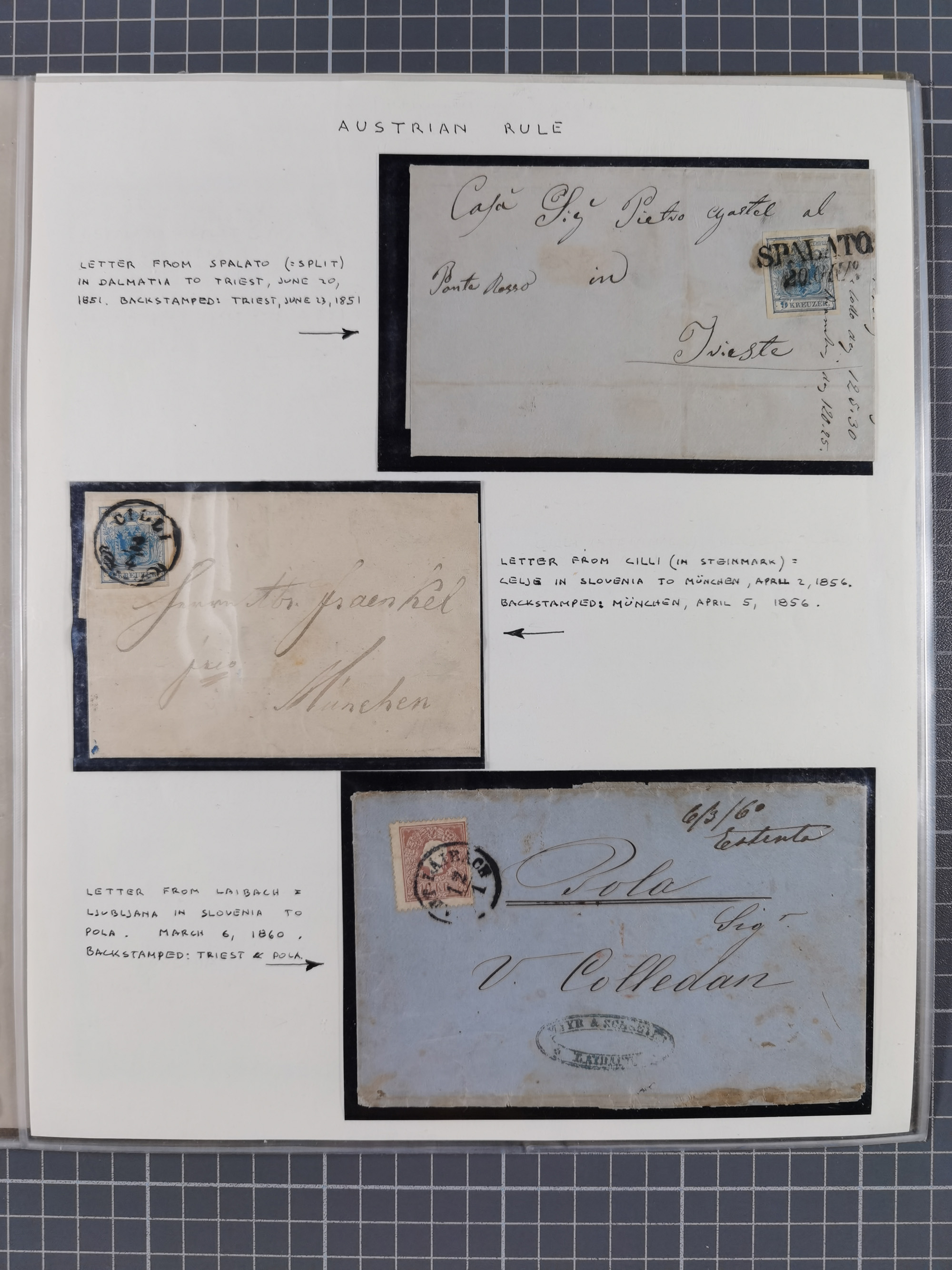 TRIEST: 1814/58, Sammlung mit 26 Briefen und Dokumenten, dabei Sanitätspass (1831) sowie doppelt versiegelter Desinfektionsbrief von Alexandria nach Triest (1858), sauber beschrieben im Album