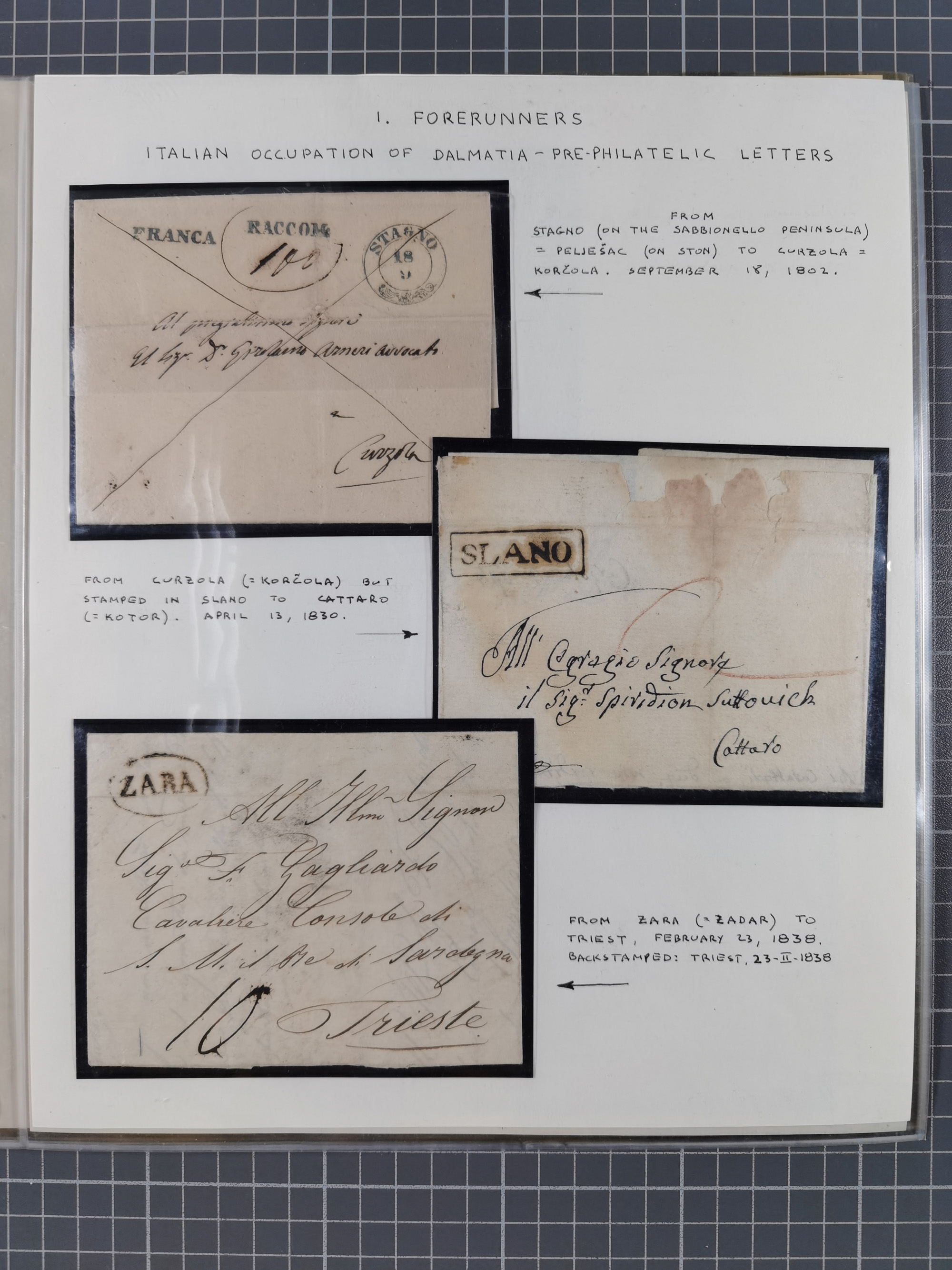 VENETIEN: 1549/1849, 40 Briefe und Dokumente, angefangen mit 4 frühen Briefen aus 1549 bis 1606, dabei u.a. ein Brief aus 1549 mit Anweisungen, die nach den Pestepidemien durchgeführt werden sollen, mit Trockensiegel Nr. 1 nach dem AISP-Katalog, (dieses nur von ca. 1549-1601 in Verwendung), sowie Brief aus 1606 von Alexandria nach Venedig, sauber beschrieben in drei Alben