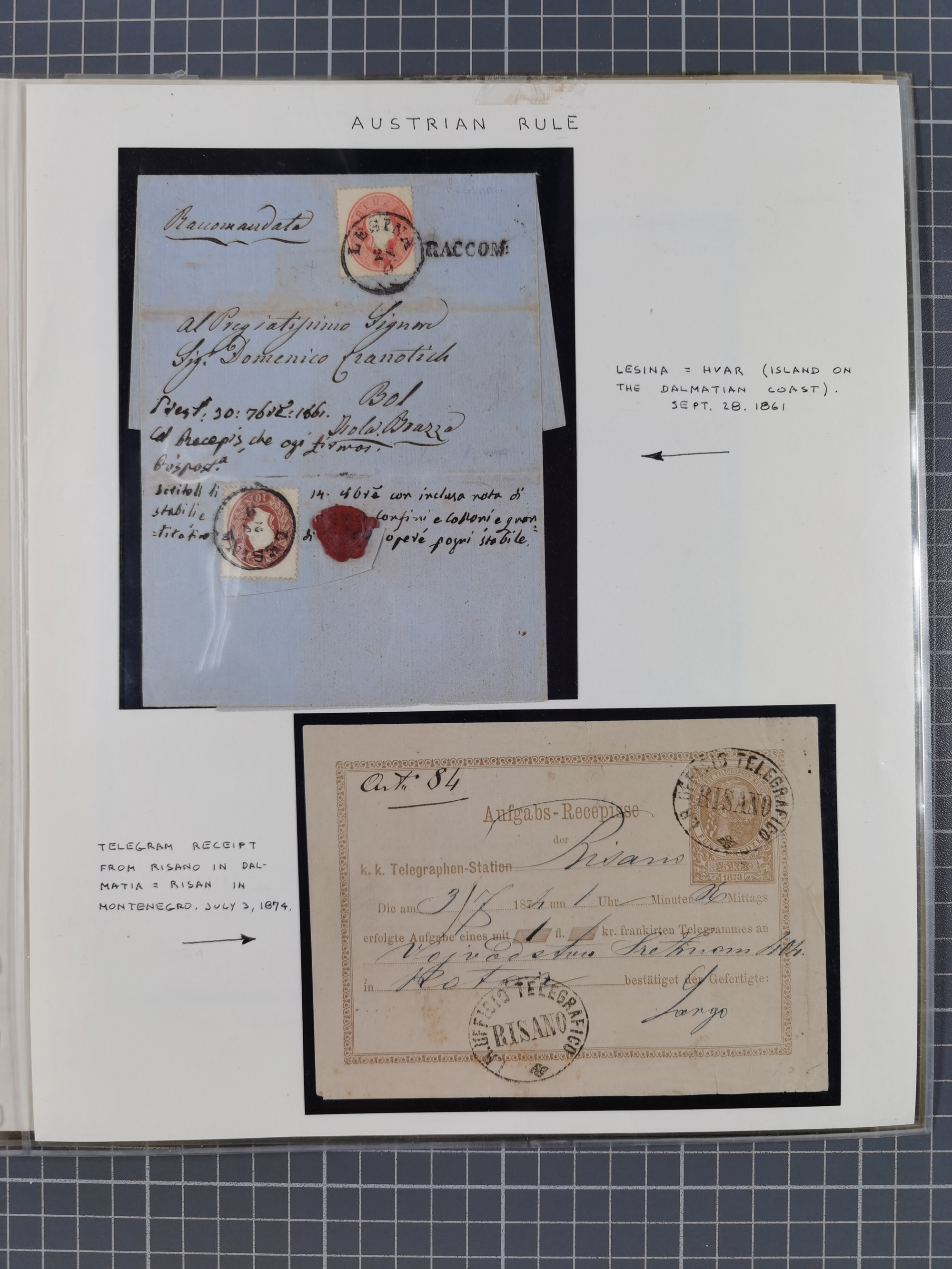 ÖSTERREICH-UNGARN: 1806/1918, über 70 Briefe und Dokumente, meist Desinfektions-Post mit Schwerpunkt von 1806 bis 1866, dabei Brief (ca. 1831) an die Prinzessin von Liechtenstein (zum Hof nach Prag). Später etwas I. Weltkrieg, sehr interessant, sauber beschrieben in zwei Alben