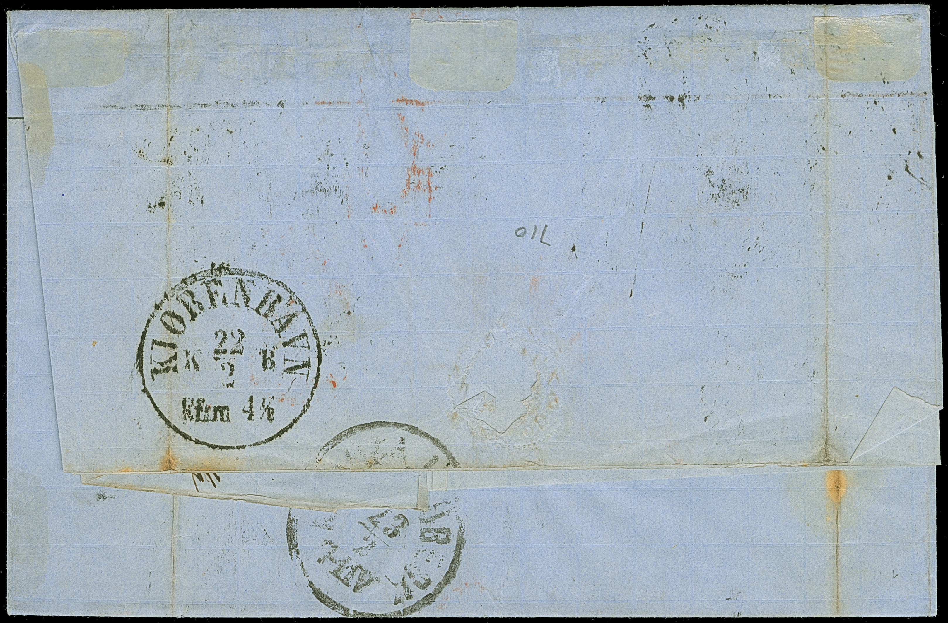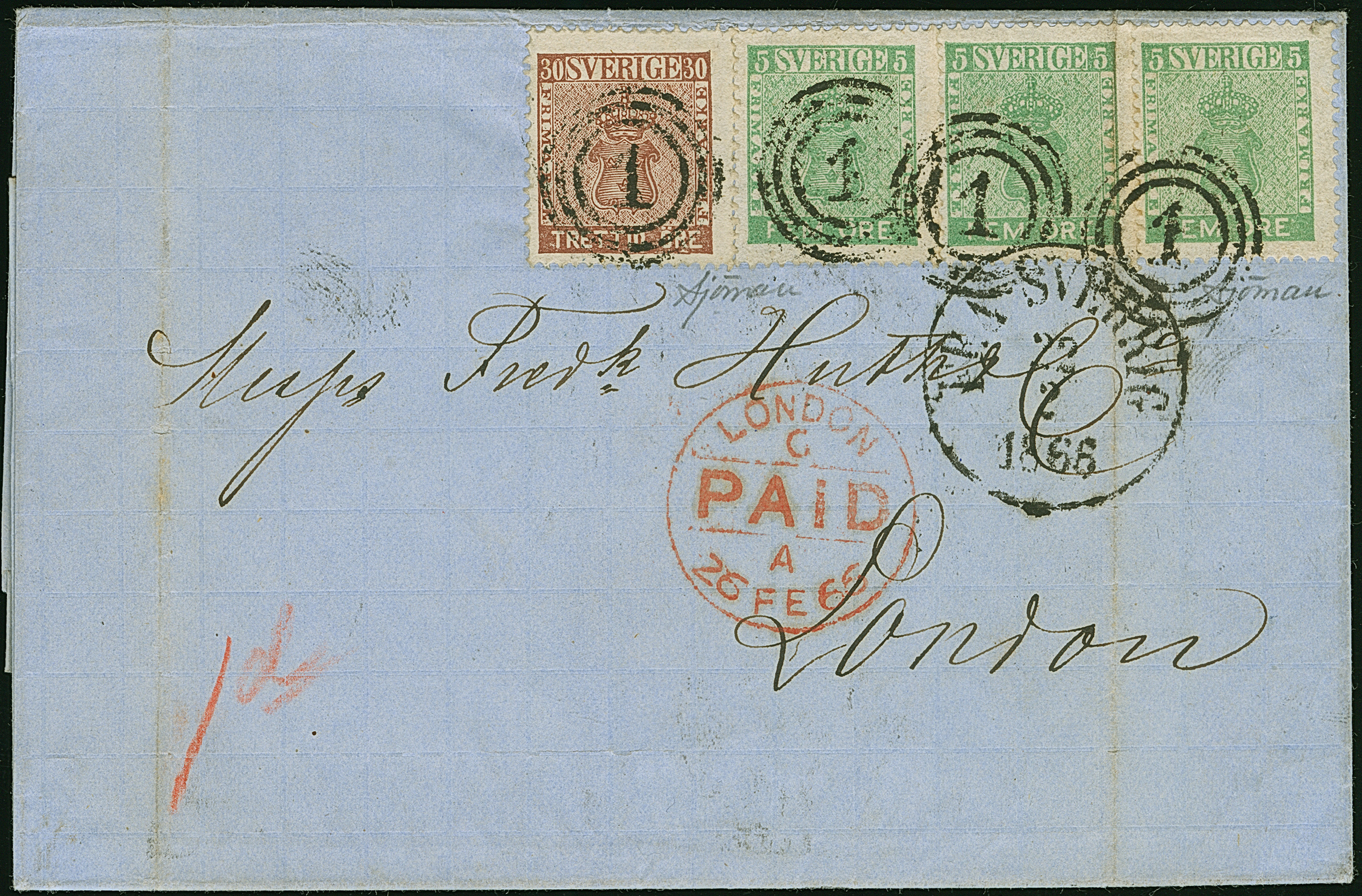 1858, coat of arms 5 ö. green , 3 copies, and 30 ö. brown, tied by Danish no. "1" with adjacent "FRA SVERRIG 22/2 1866", to ship letter to London, with transit marks of Copenhagen and Lübeck. One 5 ö. affected by vertical cover crease, resulting in a small tear, otherwise fine. And attractive and rare entire. Certificate Sjöman (1971)