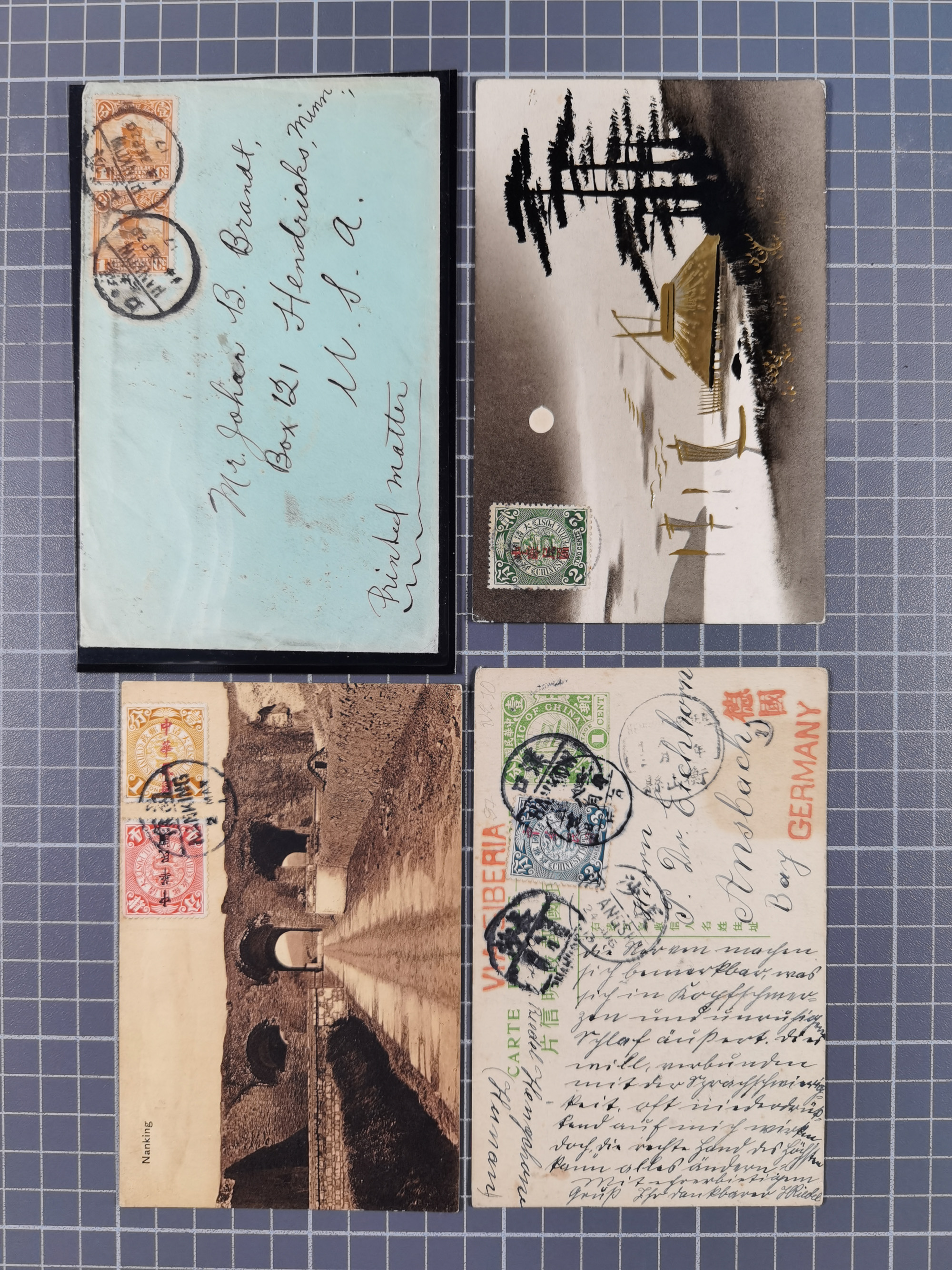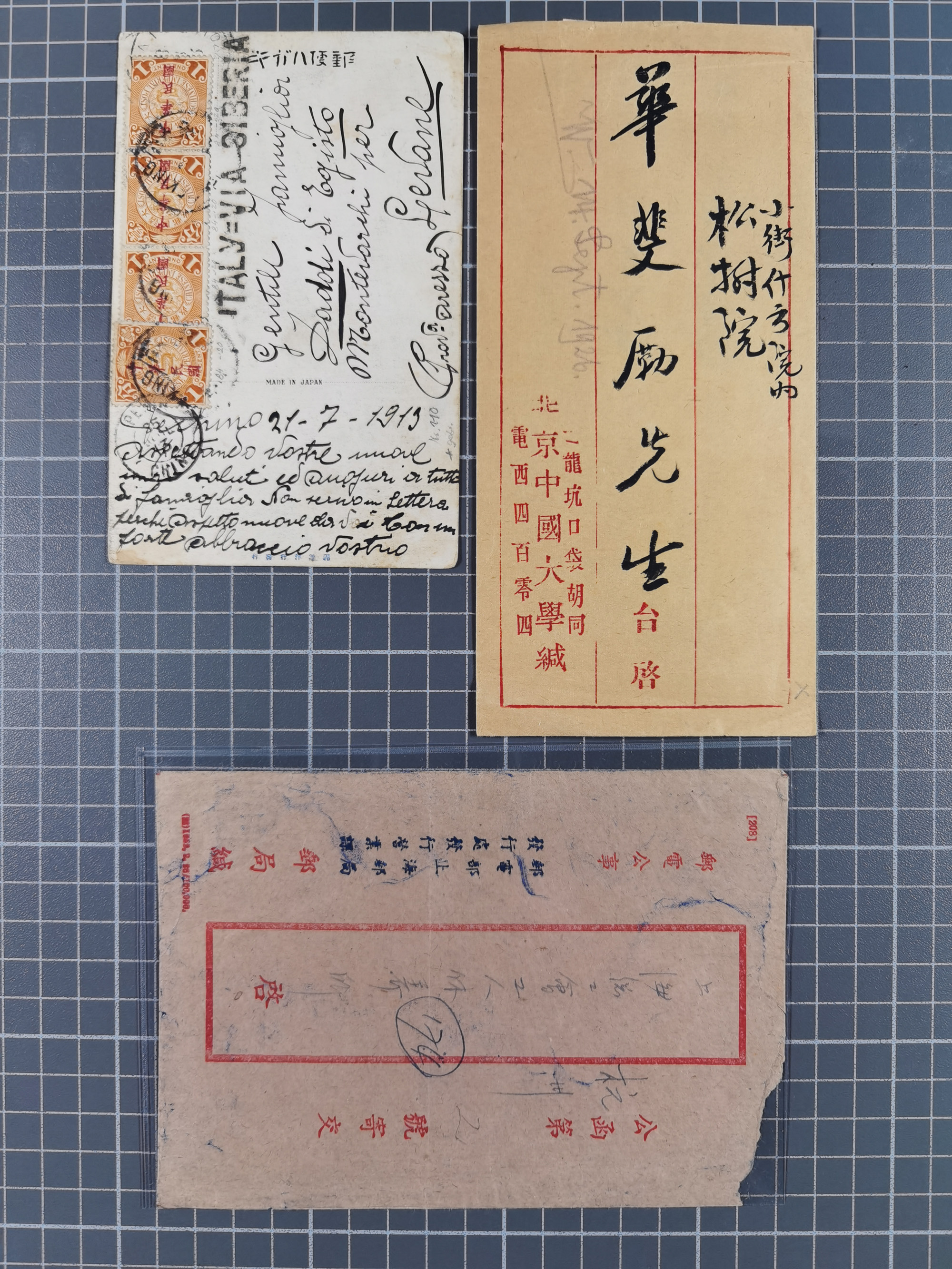 1912/20 (ca.), Chinese Republic early years, group of 13 covers and cards, noted 1 c. overprinted coiled dragon (x4) used with “PEKING” to 1913 postcard to Italy with unusual “ITALY = VIA SIBERIA” straight-line marking, also some stampless mail, printed matter, etc., together with 5 postcards franked with Japanese issues with cds. "TIENTSIN", “DAIREN”, etc., overall in good condition