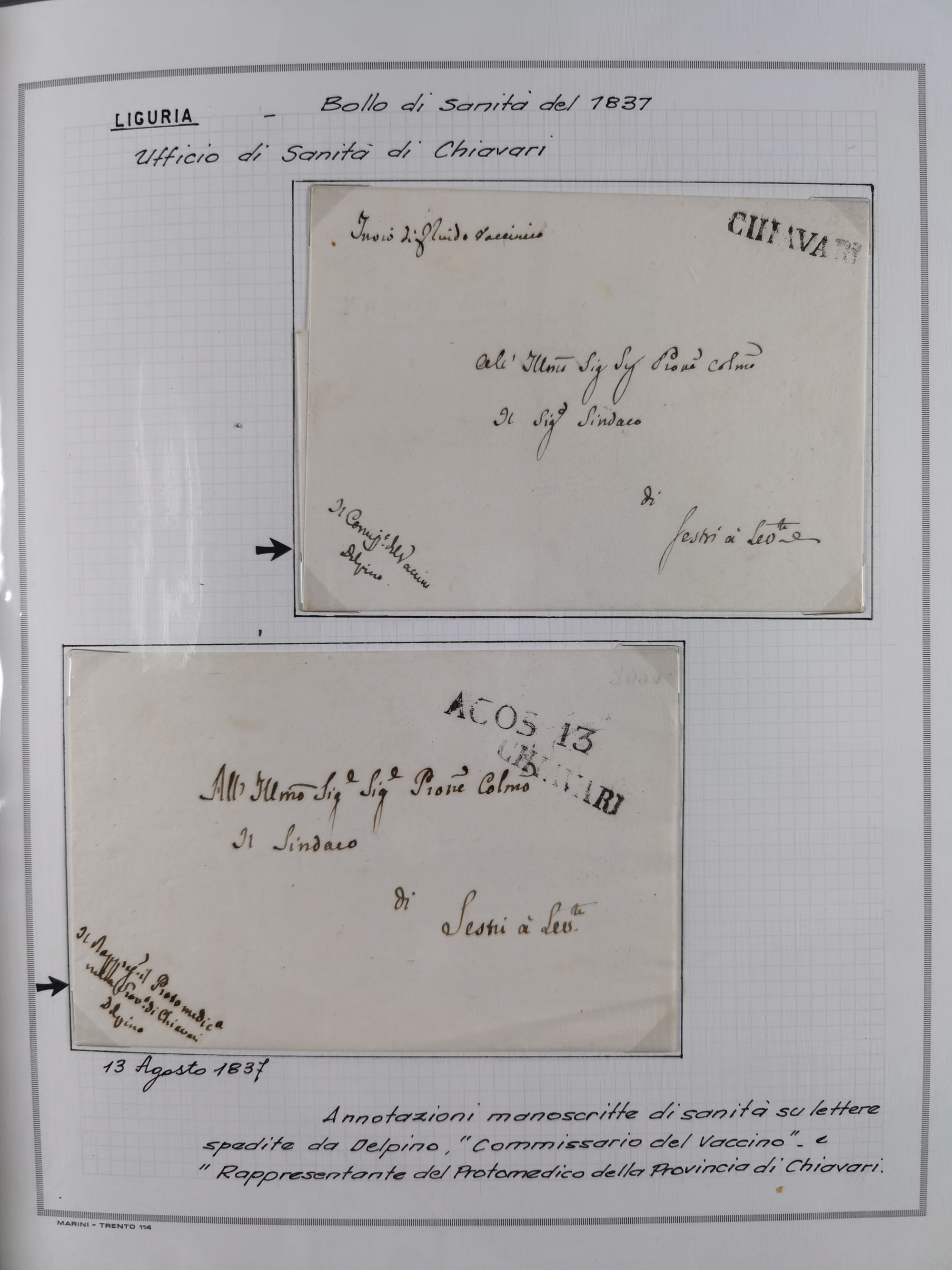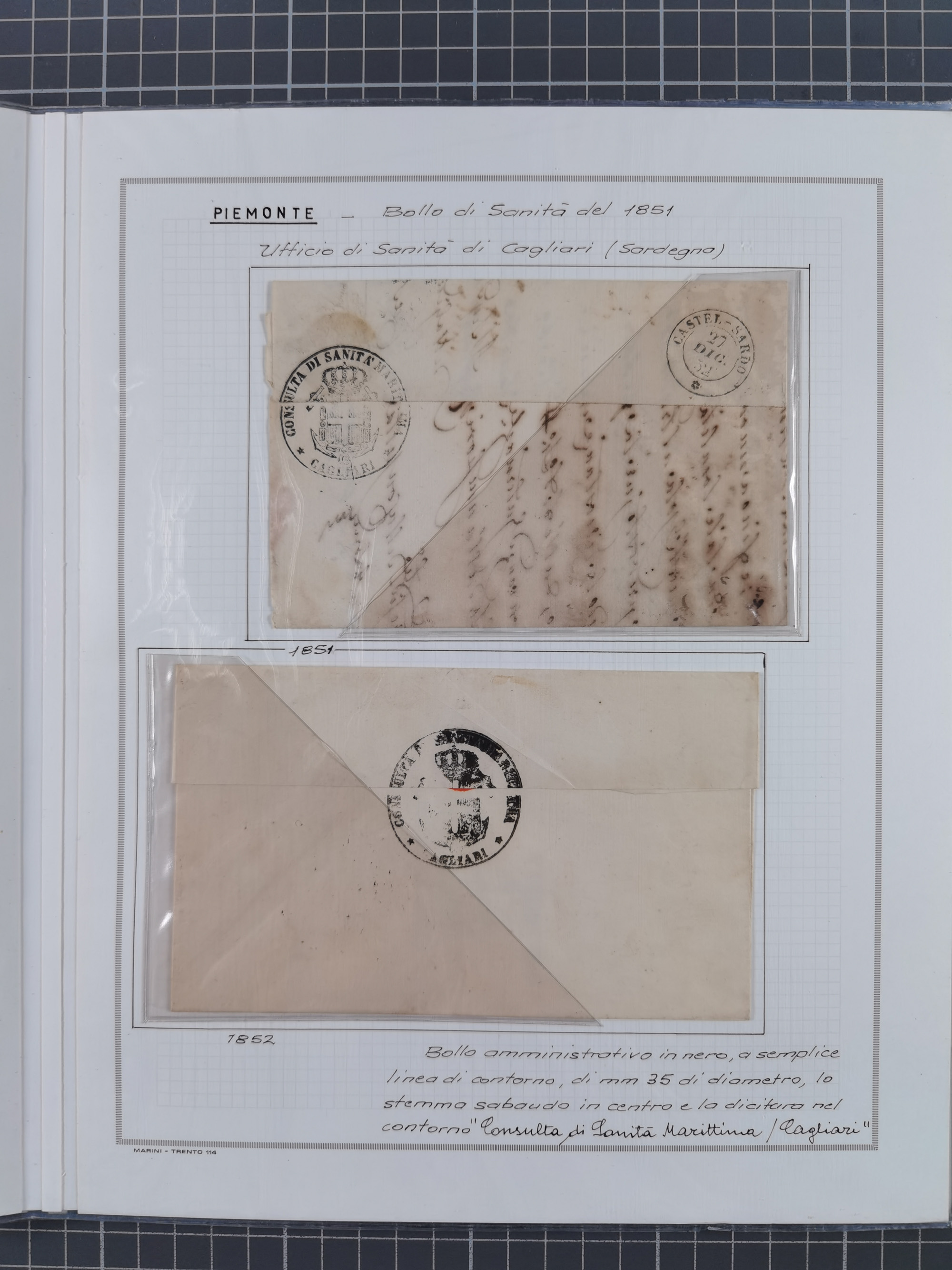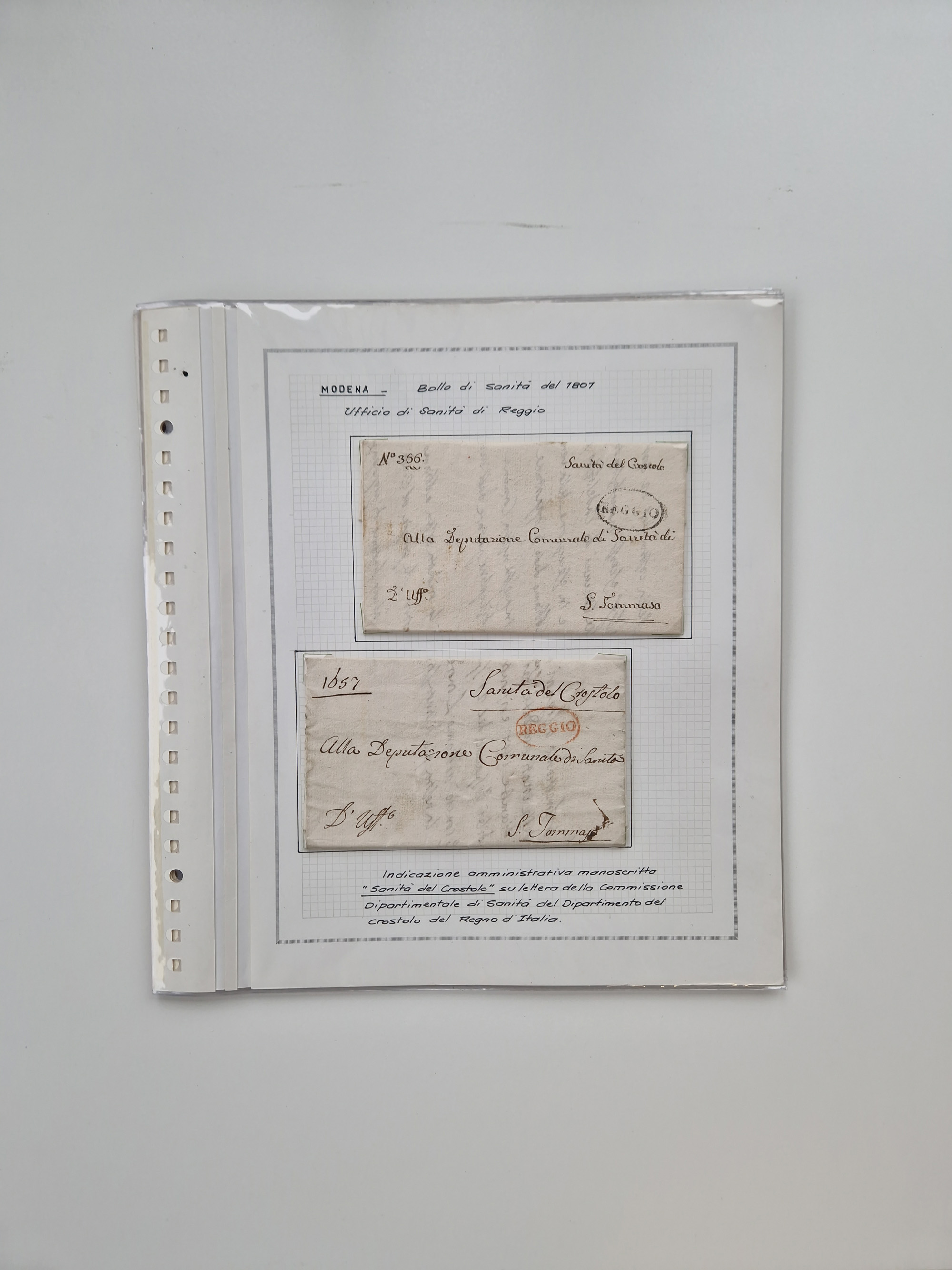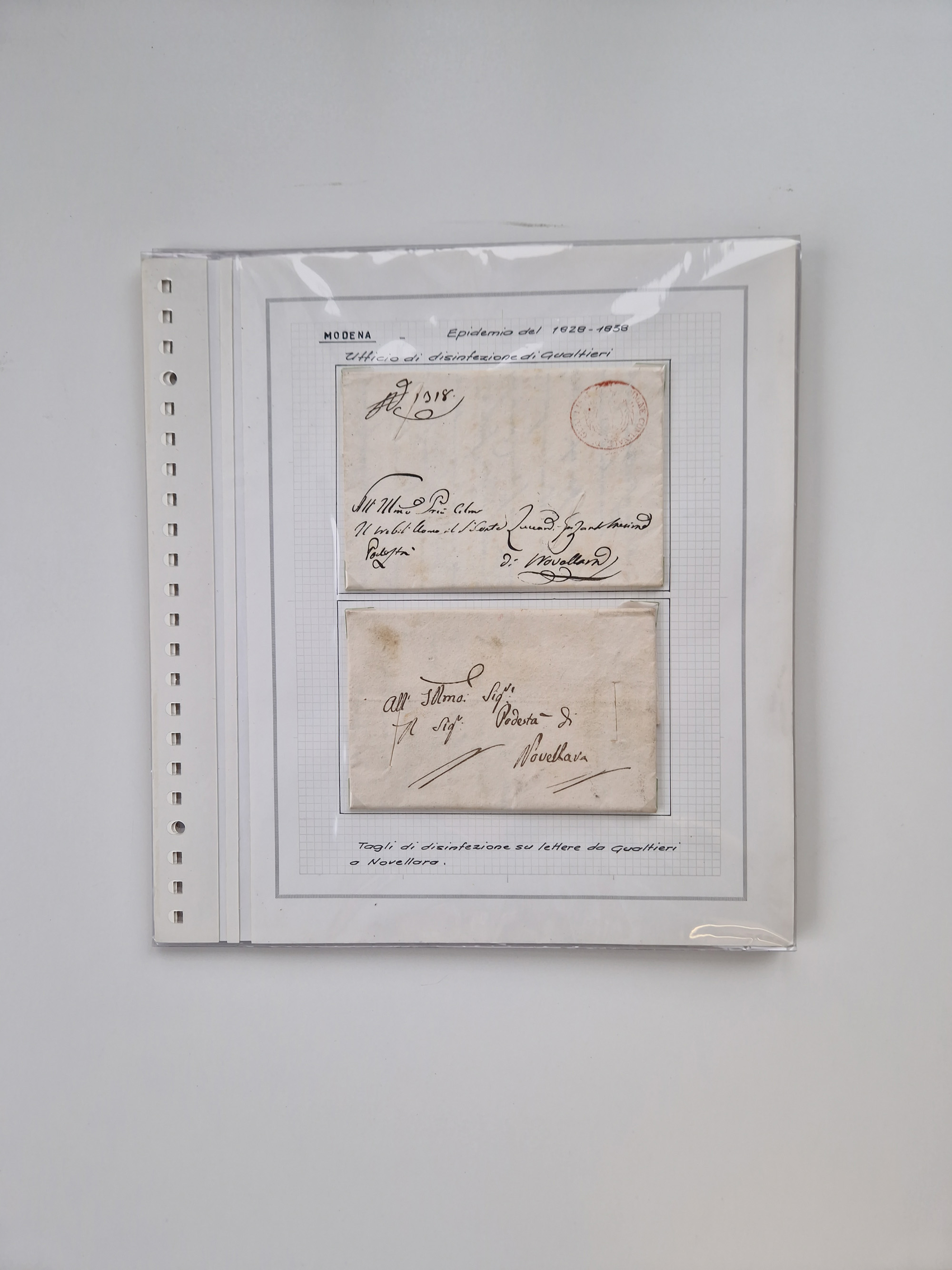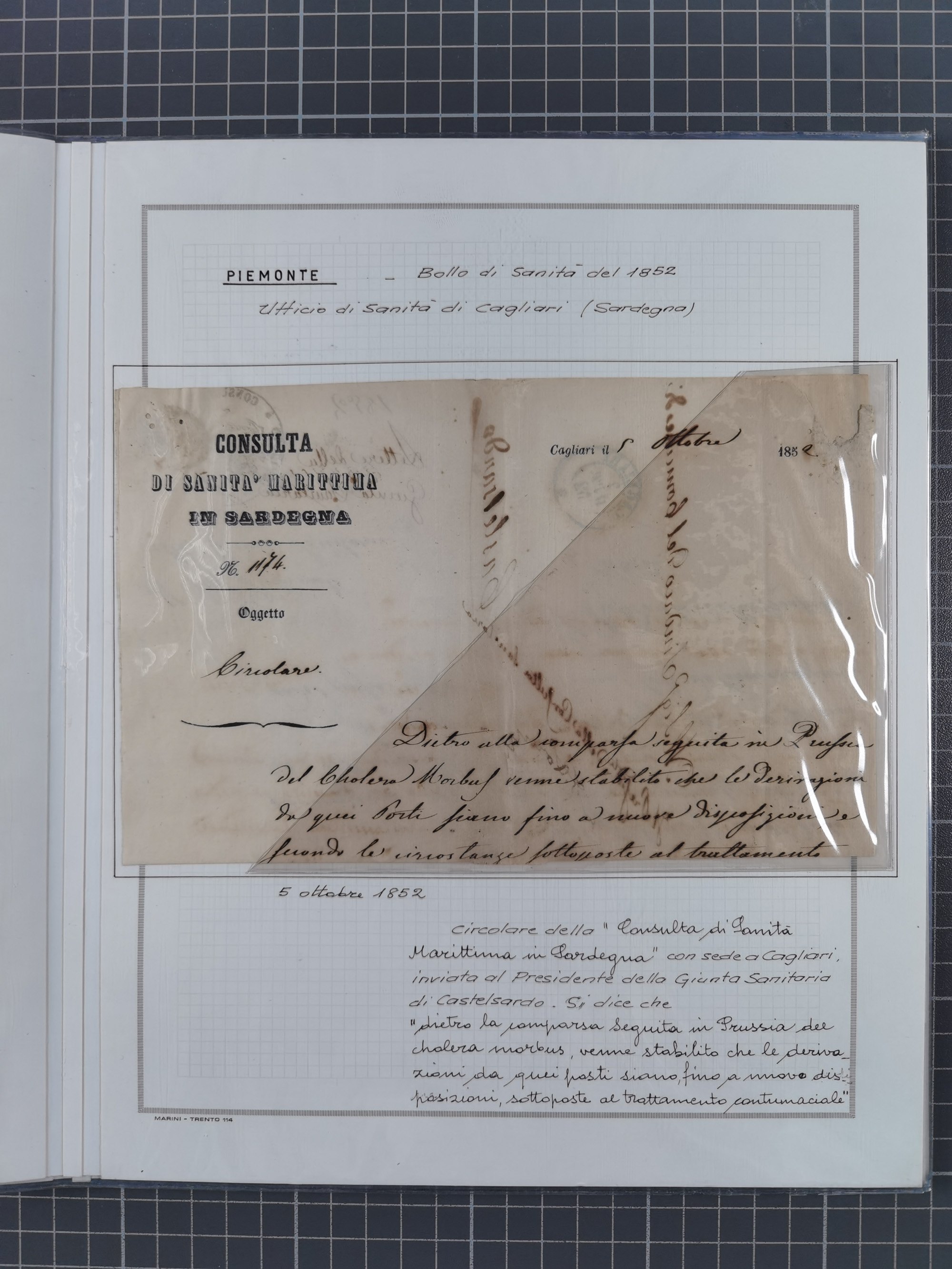 PIEMONT: 1585/1886, über 150 Briefe und Dokumente (wenige Dokumente als Kopie), ab einem sehr frühen Dokument aus 1585, einigen Briefen ab 1797 mit vielen seltenen Stempeln, Brief von Prof. Michele Buniva (von Napoleon ernannter Professor für öffentliche und private Hygiene), Brief von 1830 aus Odessa nach Genua, Mitteilung des 1. Staatssekretärs über die Notwendigkeit der Desinfizierung von Auslandspostsendungen, viele Zirkulare der Gesundheitsmagistrate, etc., sehr reichhaltig, sauber beschrieben in sechs Alben