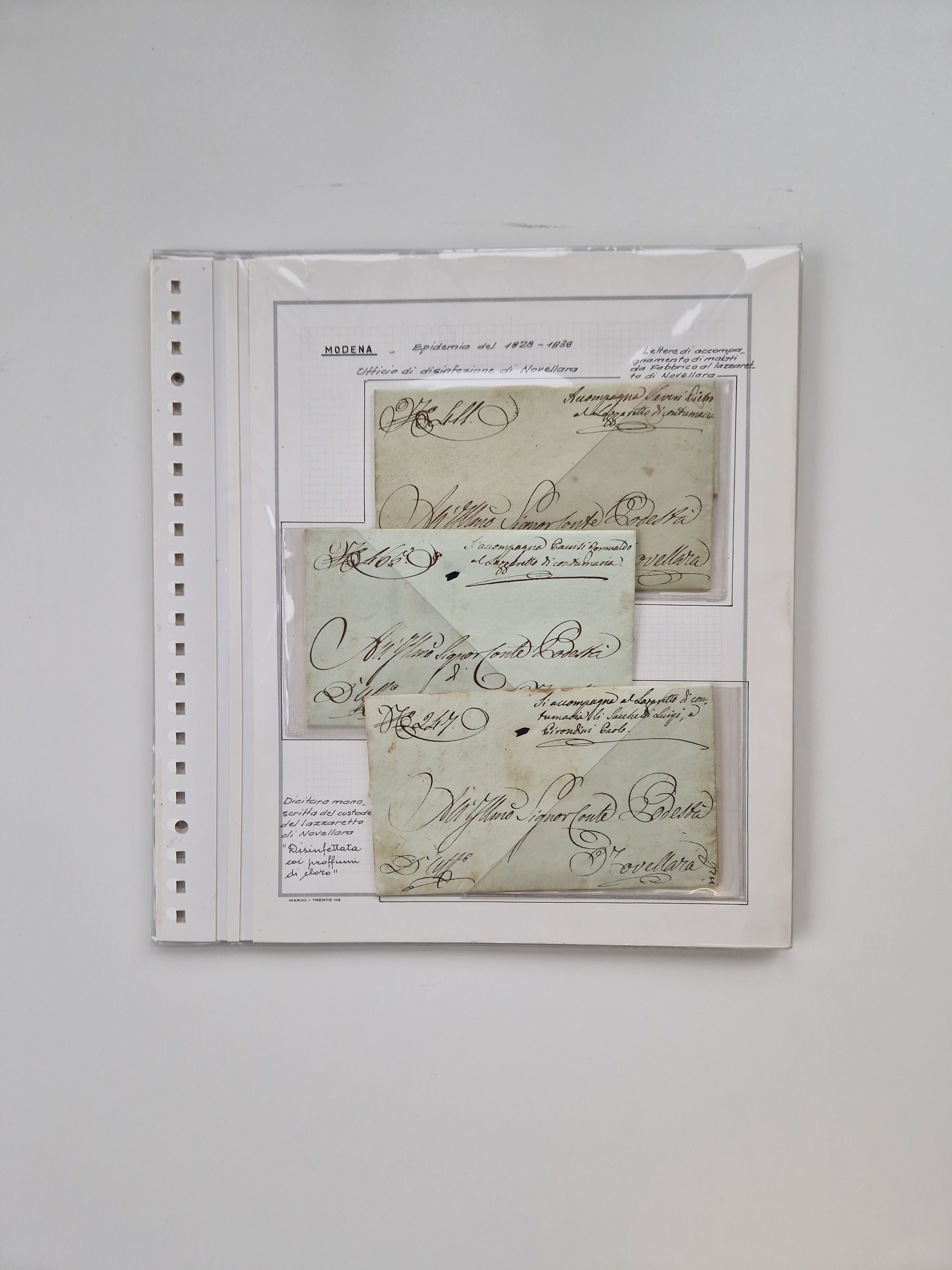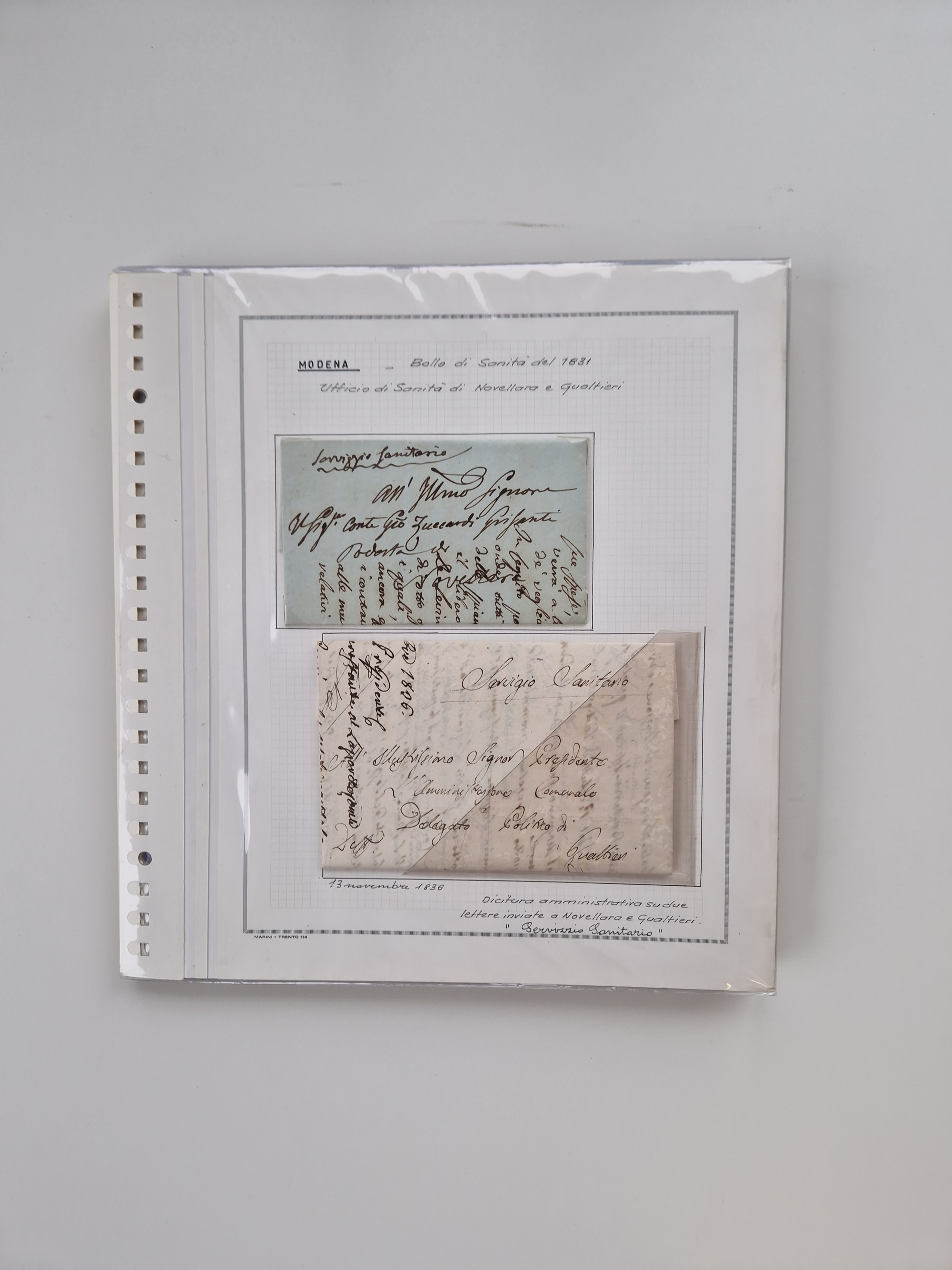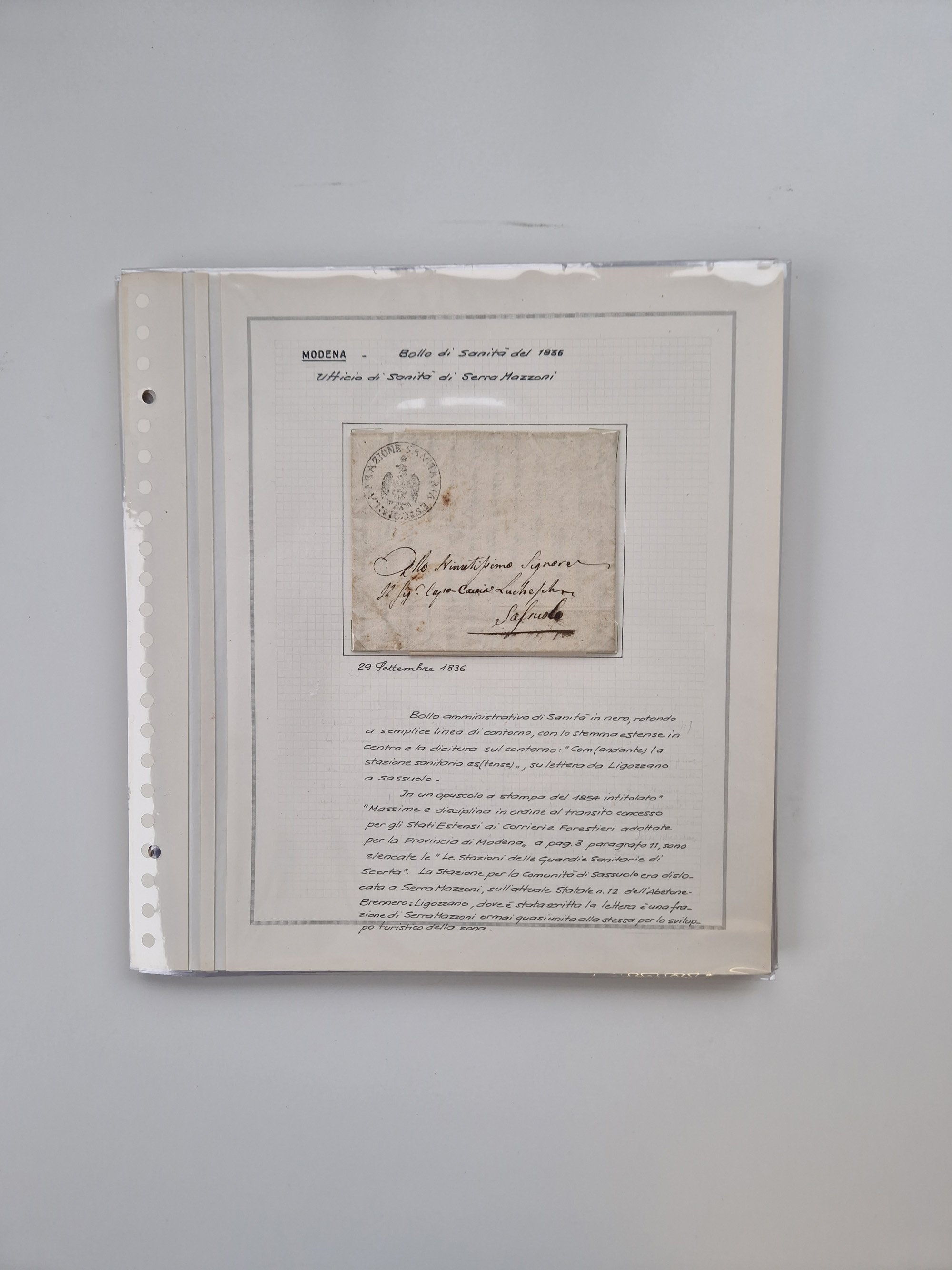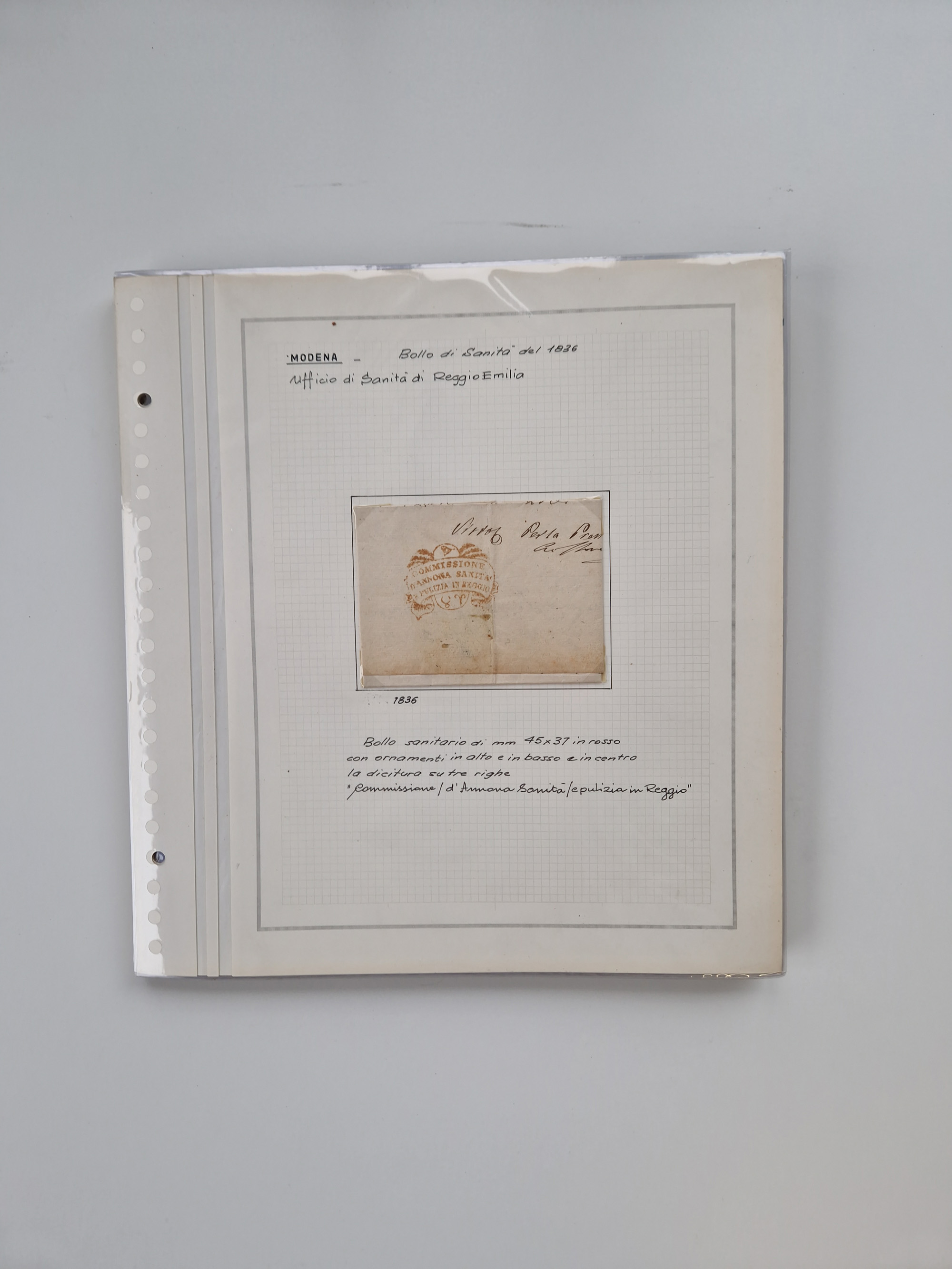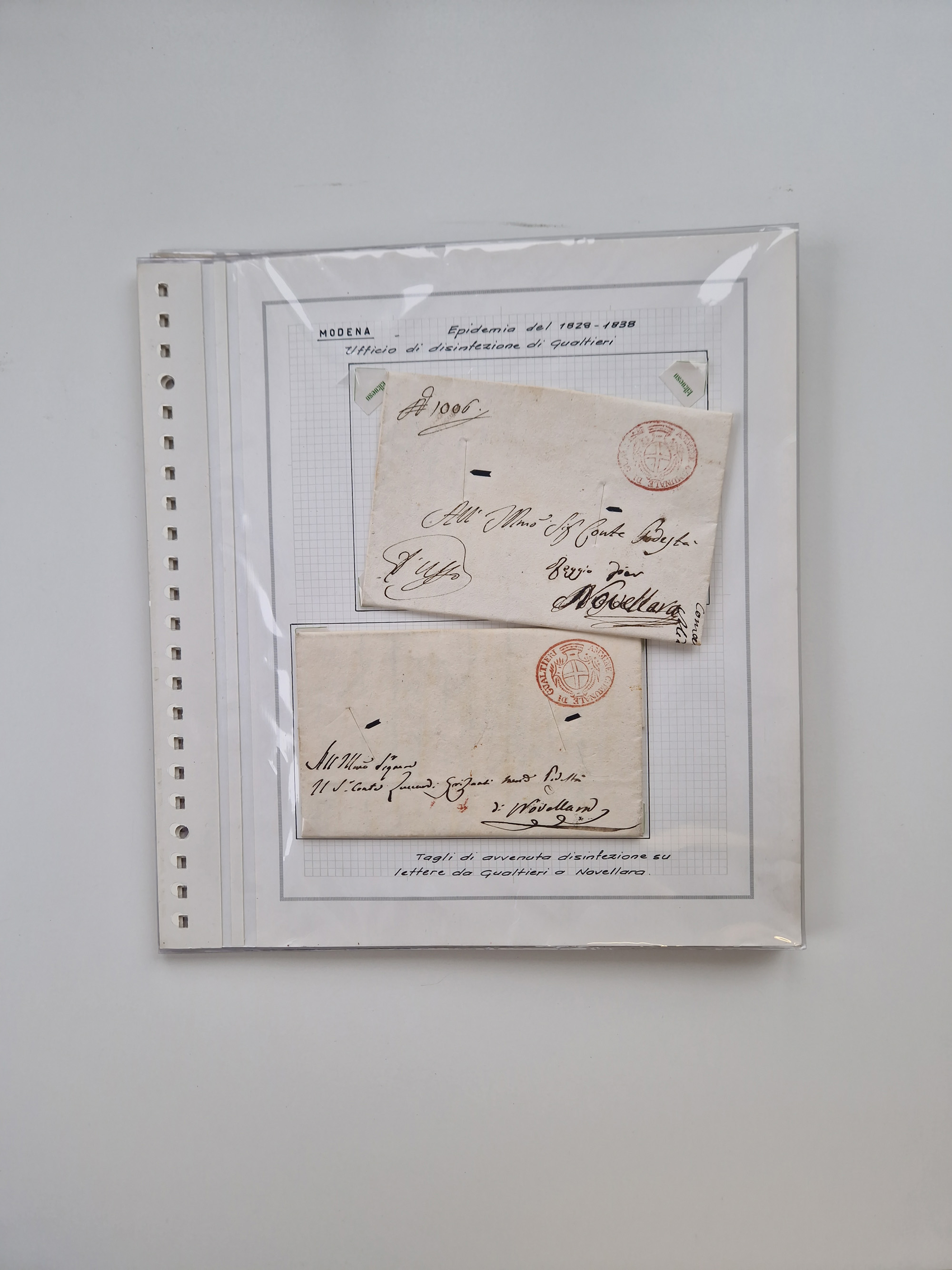PIEMONT: 1585/1886, über 150 Briefe und Dokumente (wenige Dokumente als Kopie), ab einem sehr frühen Dokument aus 1585, einigen Briefen ab 1797 mit vielen seltenen Stempeln, Brief von Prof. Michele Buniva (von Napoleon ernannter Professor für öffentliche und private Hygiene), Brief von 1830 aus Odessa nach Genua, Mitteilung des 1. Staatssekretärs über die Notwendigkeit der Desinfizierung von Auslandspostsendungen, viele Zirkulare der Gesundheitsmagistrate, etc., sehr reichhaltig, sauber beschrieben in sechs Alben
