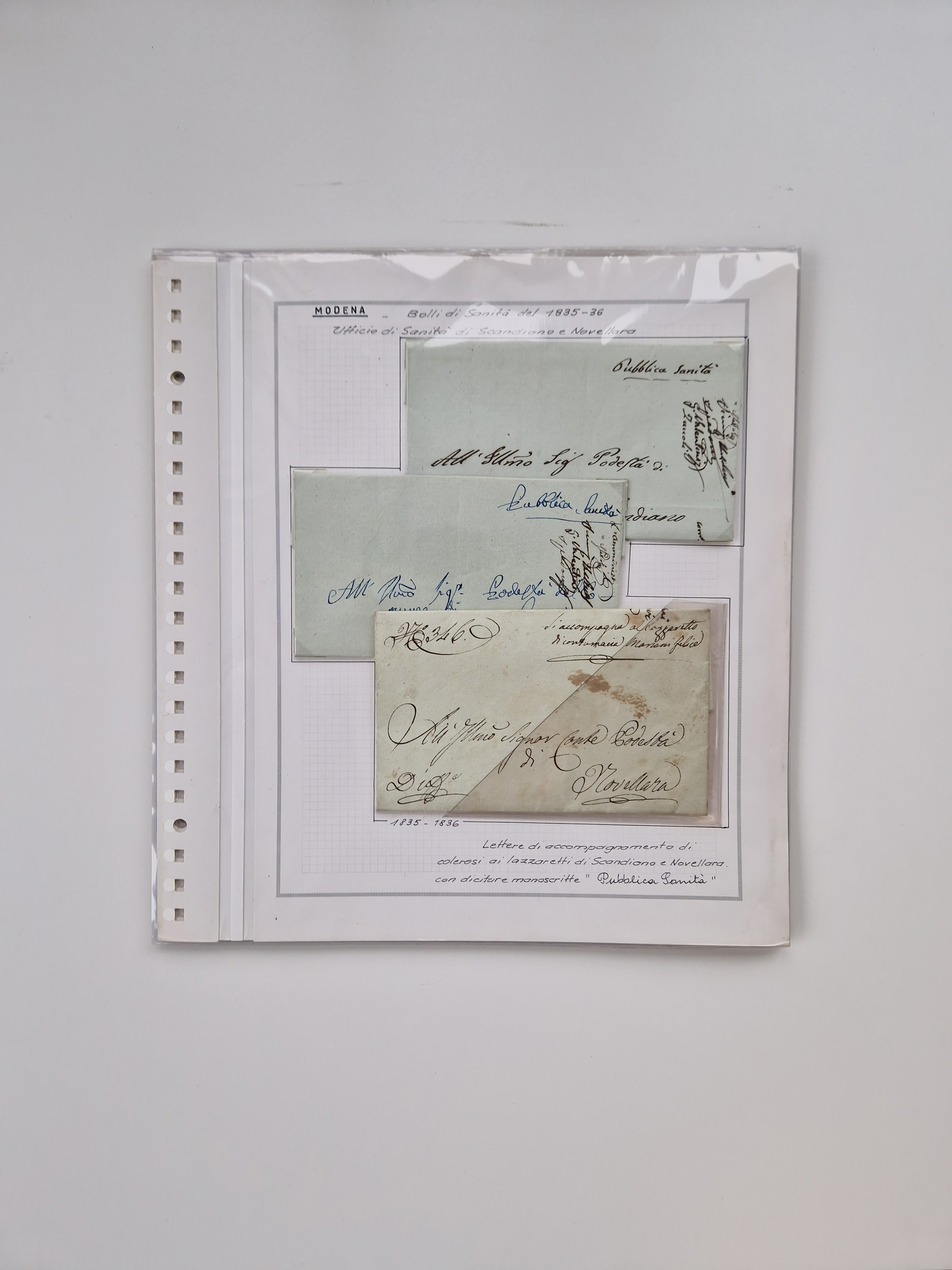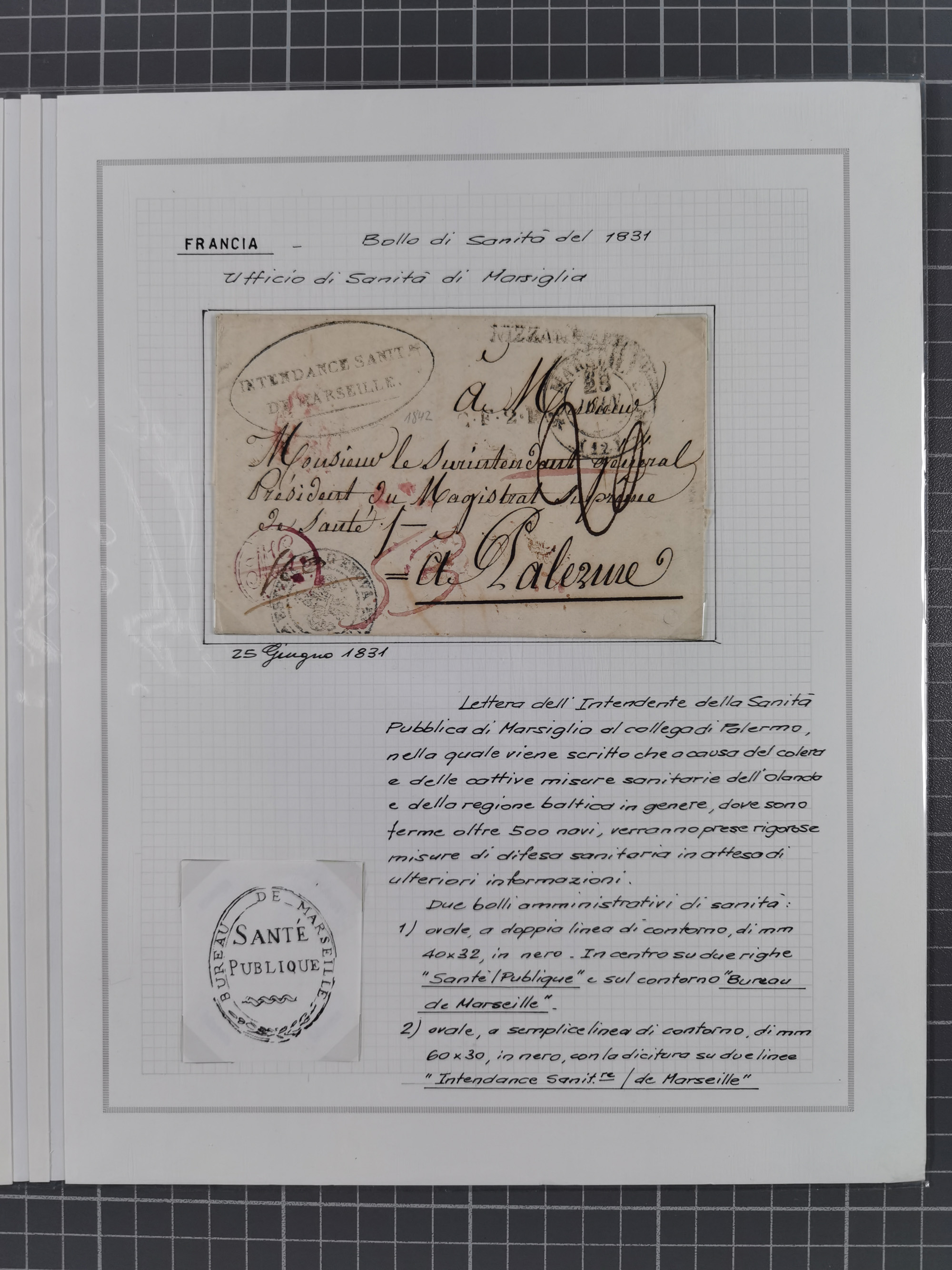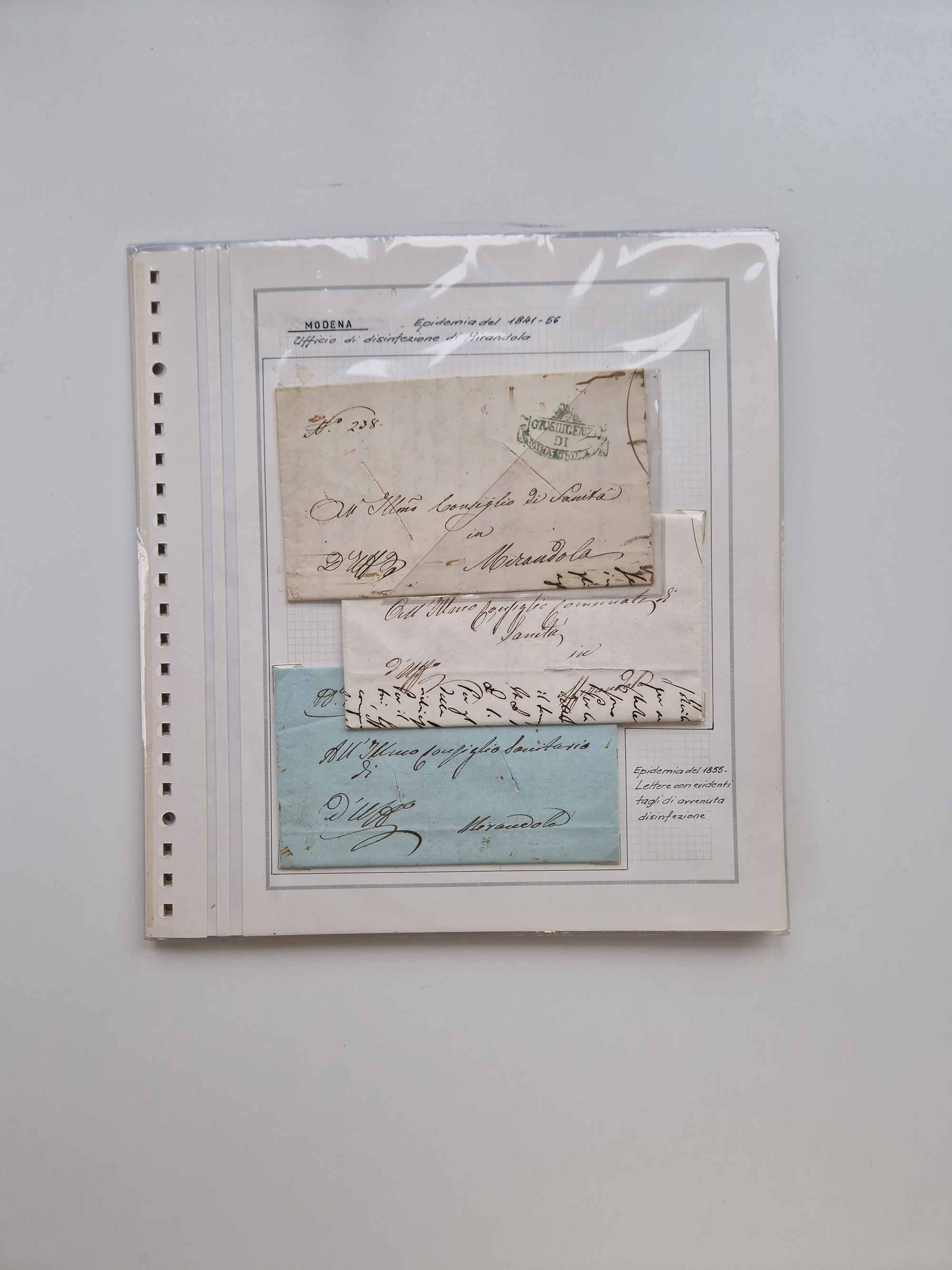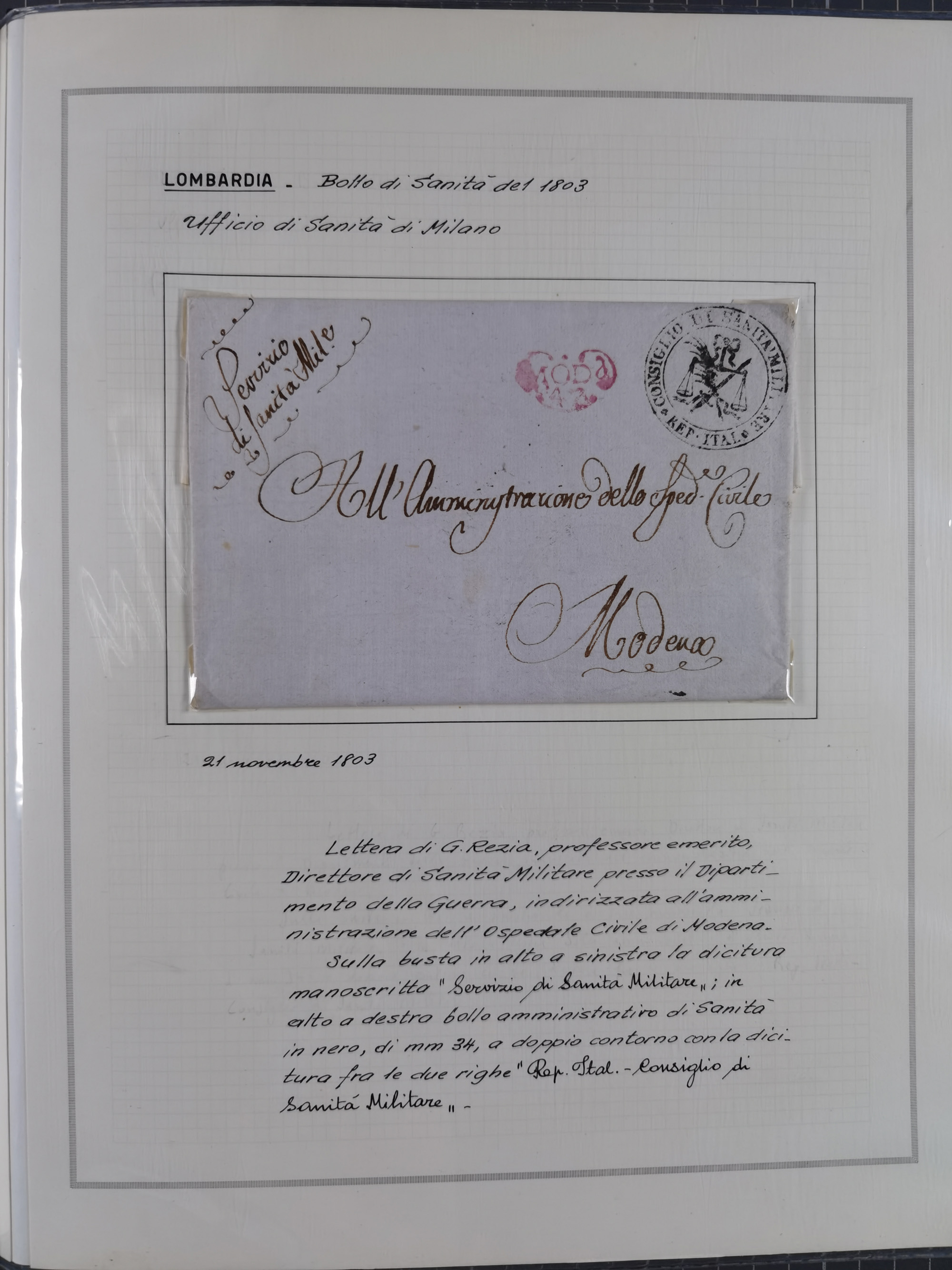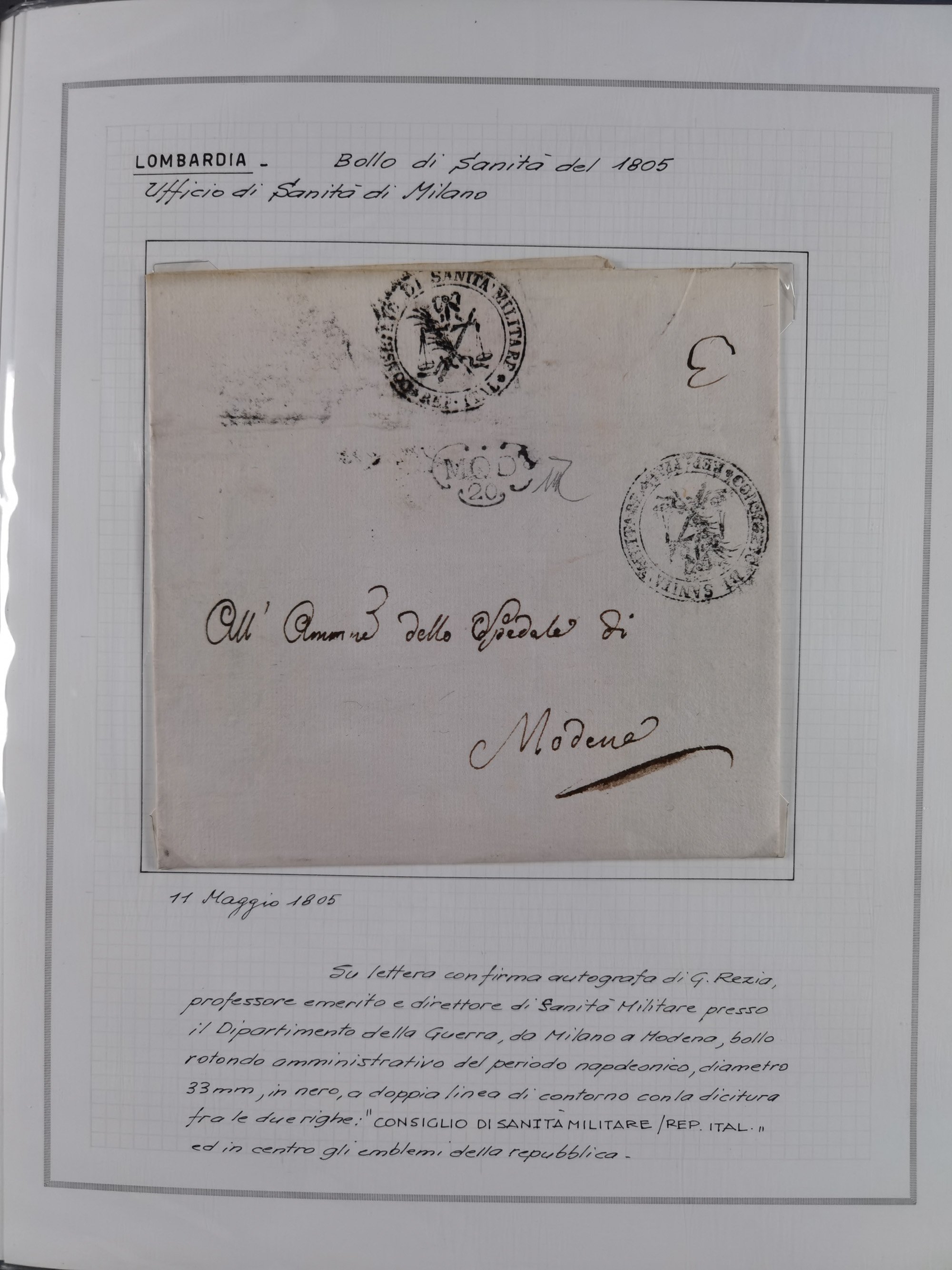 PIEMONT: 1585/1886, über 150 Briefe und Dokumente (wenige Dokumente als Kopie), ab einem sehr frühen Dokument aus 1585, einigen Briefen ab 1797 mit vielen seltenen Stempeln, Brief von Prof. Michele Buniva (von Napoleon ernannter Professor für öffentliche und private Hygiene), Brief von 1830 aus Odessa nach Genua, Mitteilung des 1. Staatssekretärs über die Notwendigkeit der Desinfizierung von Auslandspostsendungen, viele Zirkulare der Gesundheitsmagistrate, etc., sehr reichhaltig, sauber beschrieben in sechs Alben