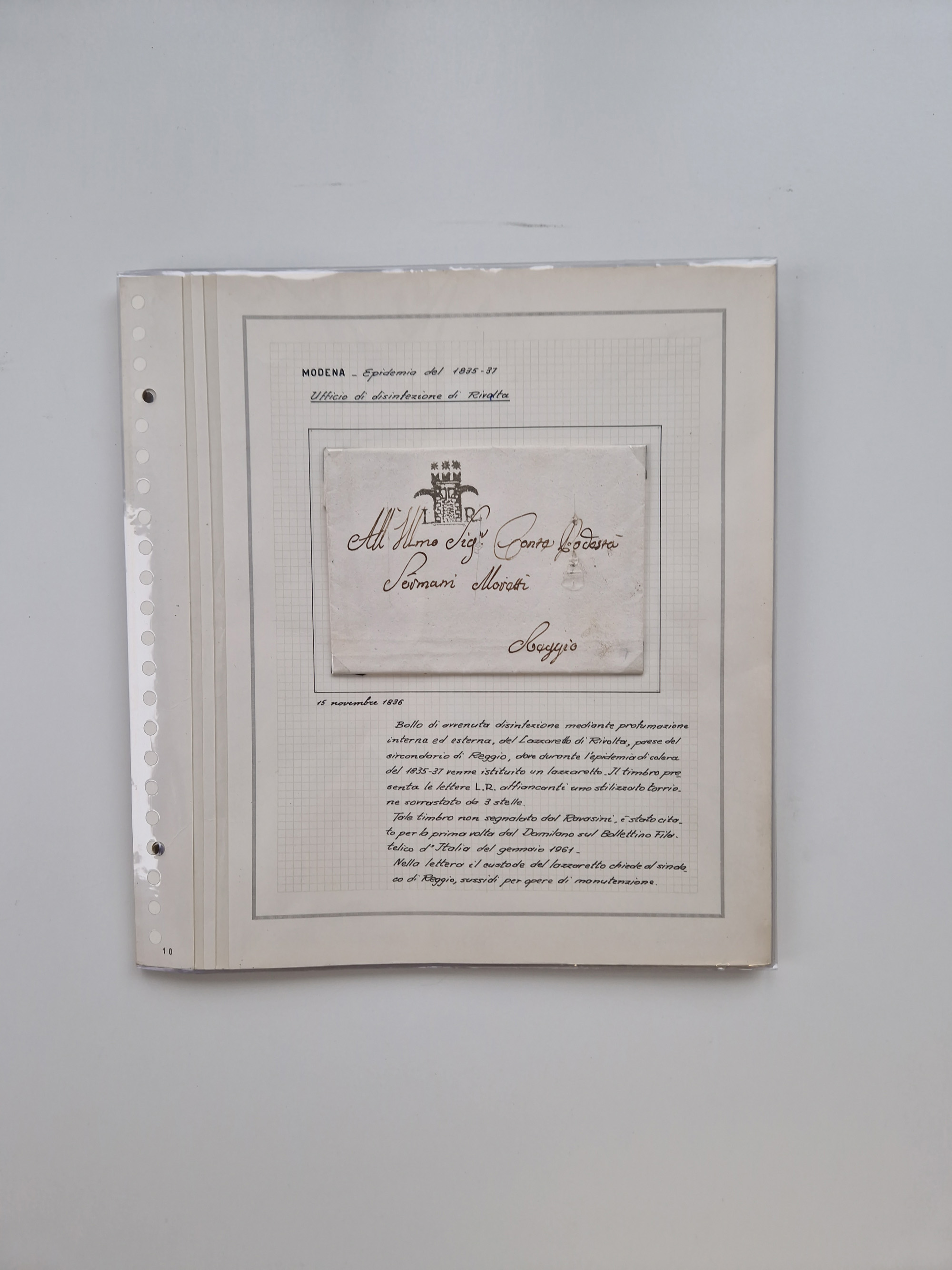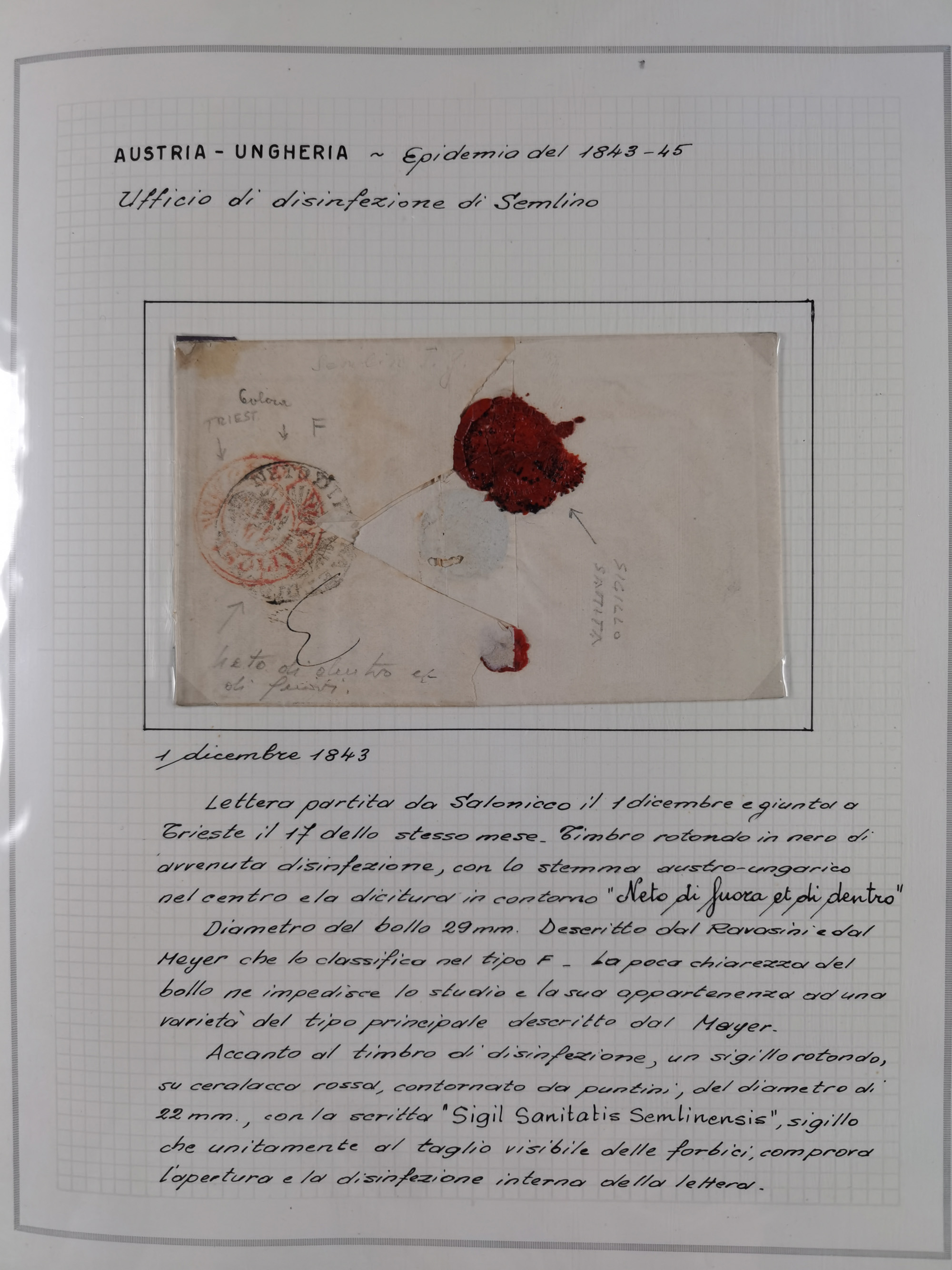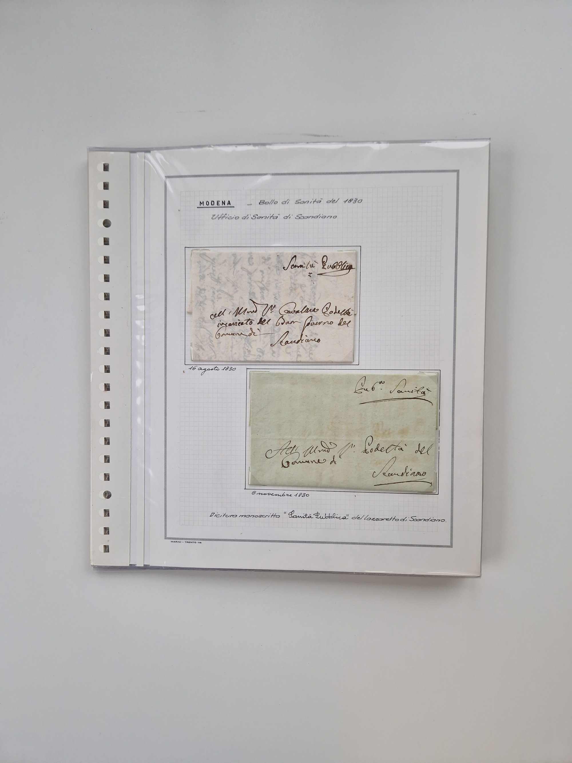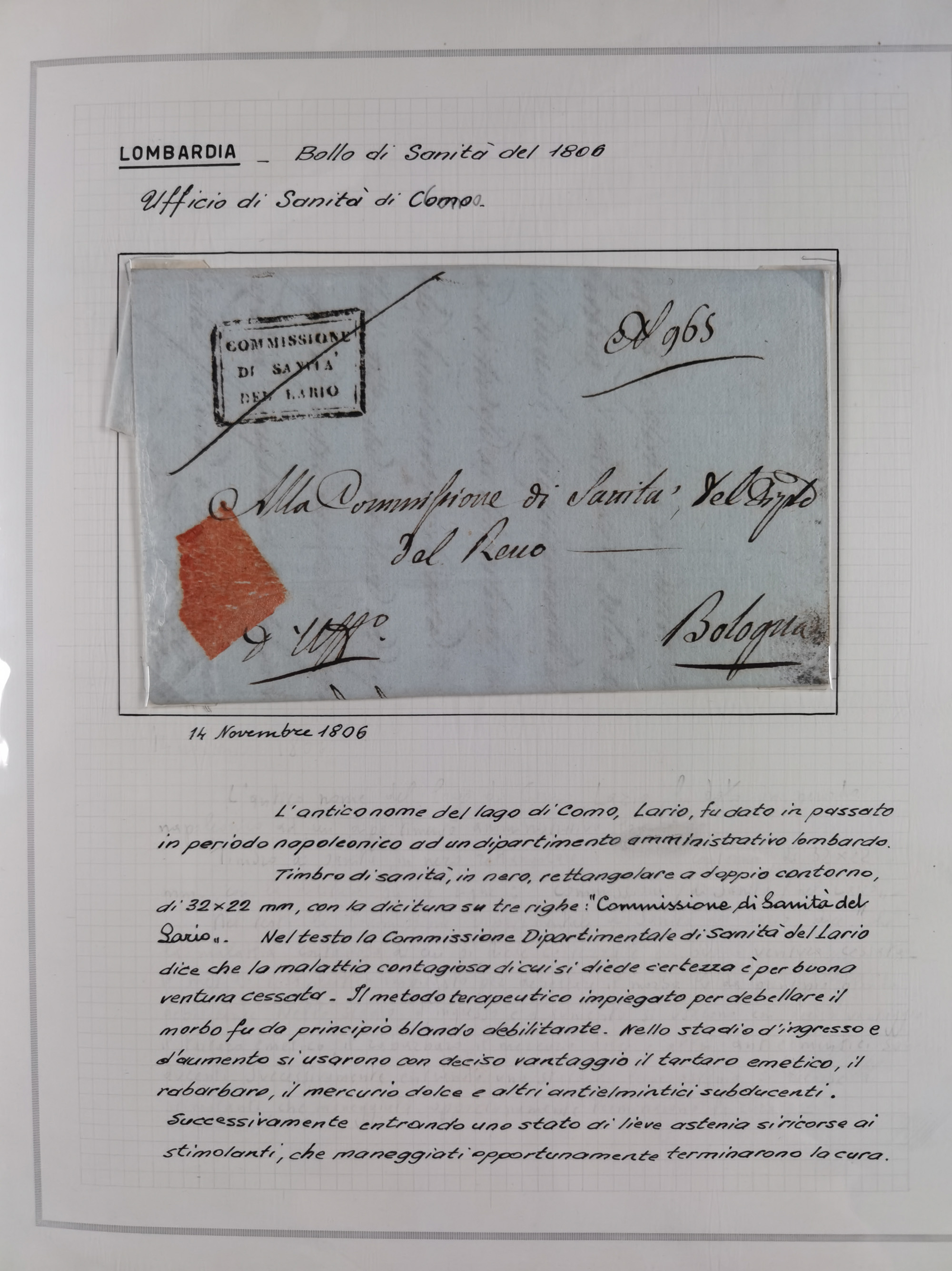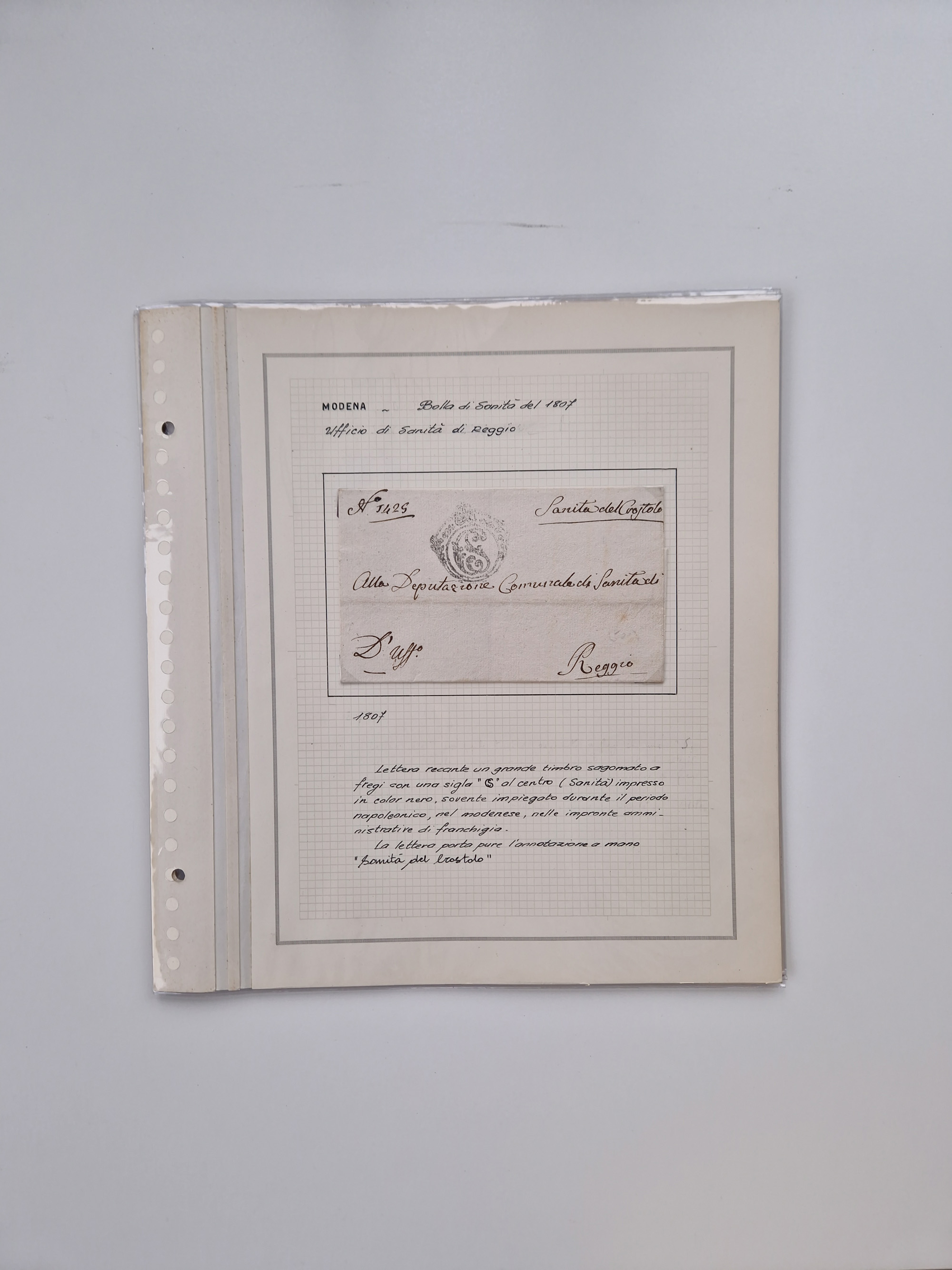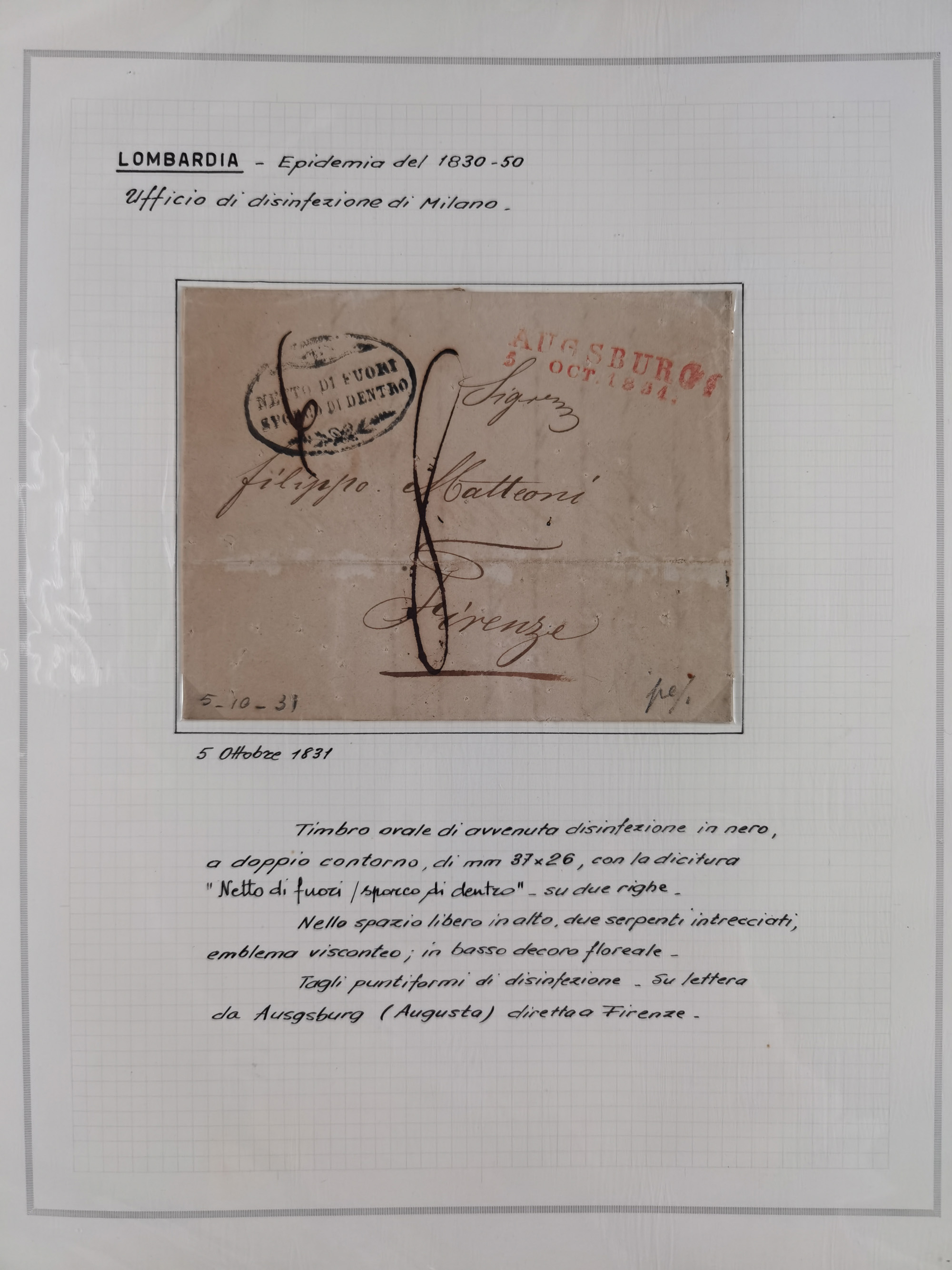 PIEMONT: 1585/1886, über 150 Briefe und Dokumente (wenige Dokumente als Kopie), ab einem sehr frühen Dokument aus 1585, einigen Briefen ab 1797 mit vielen seltenen Stempeln, Brief von Prof. Michele Buniva (von Napoleon ernannter Professor für öffentliche und private Hygiene), Brief von 1830 aus Odessa nach Genua, Mitteilung des 1. Staatssekretärs über die Notwendigkeit der Desinfizierung von Auslandspostsendungen, viele Zirkulare der Gesundheitsmagistrate, etc., sehr reichhaltig, sauber beschrieben in sechs Alben