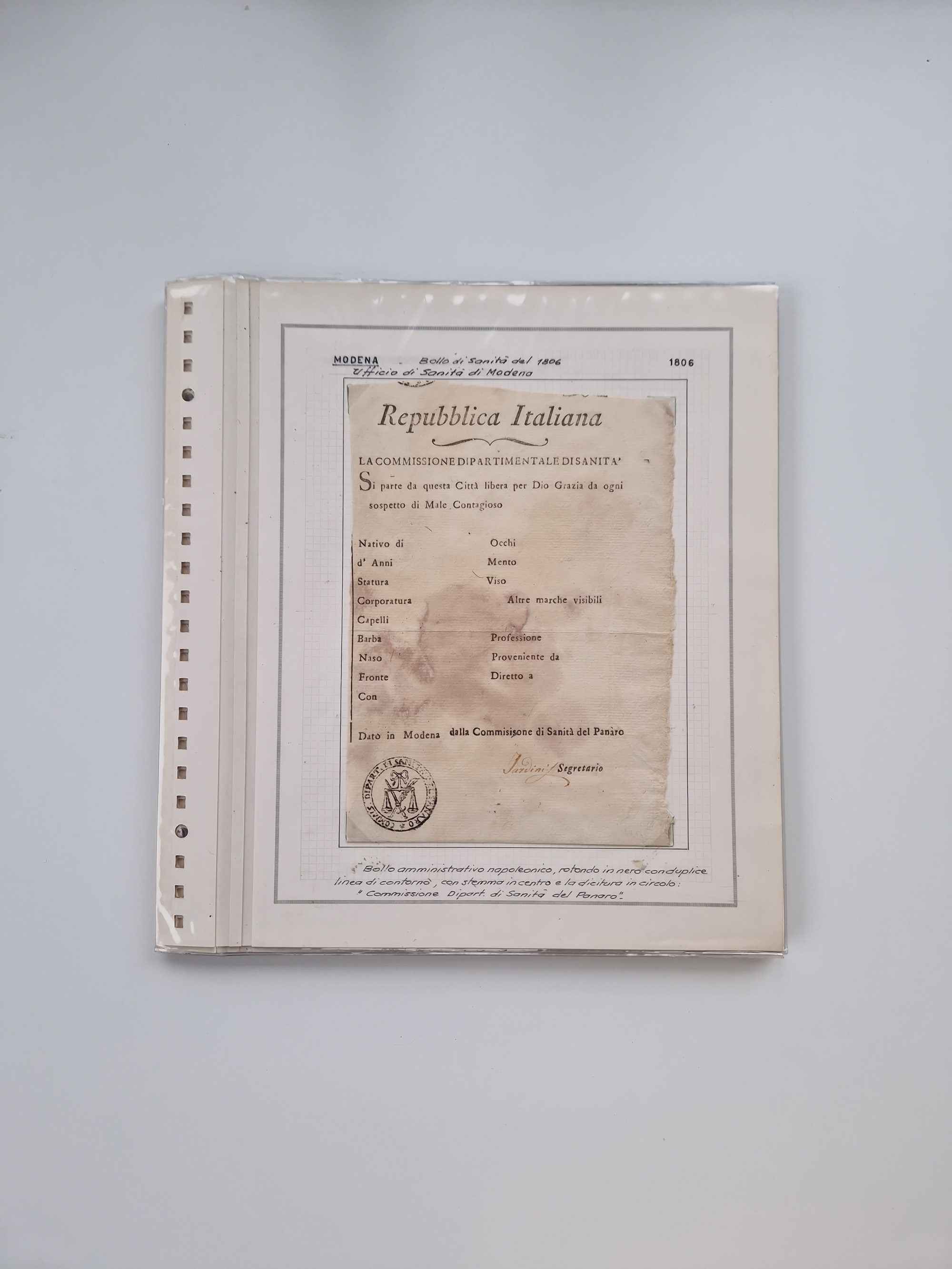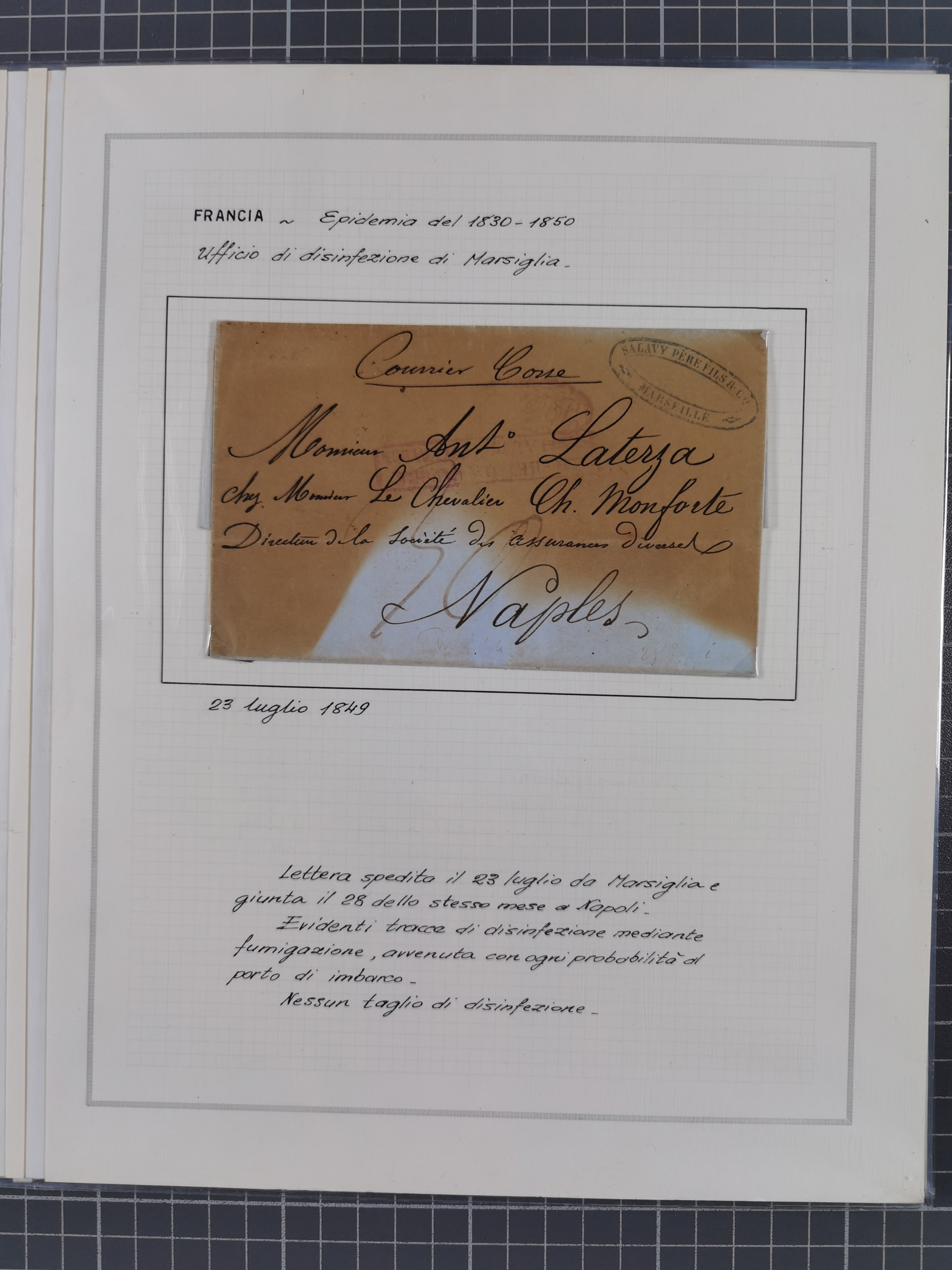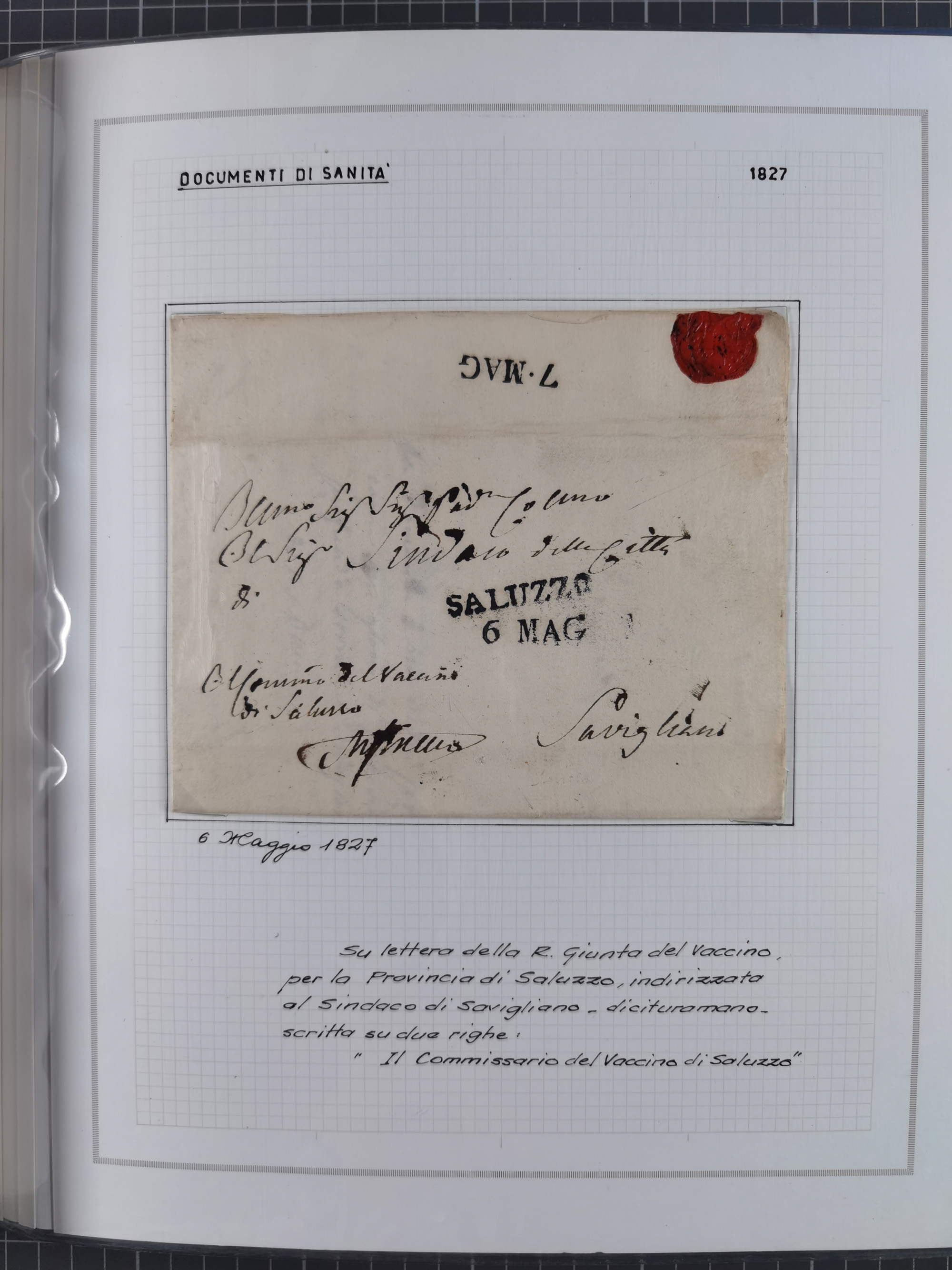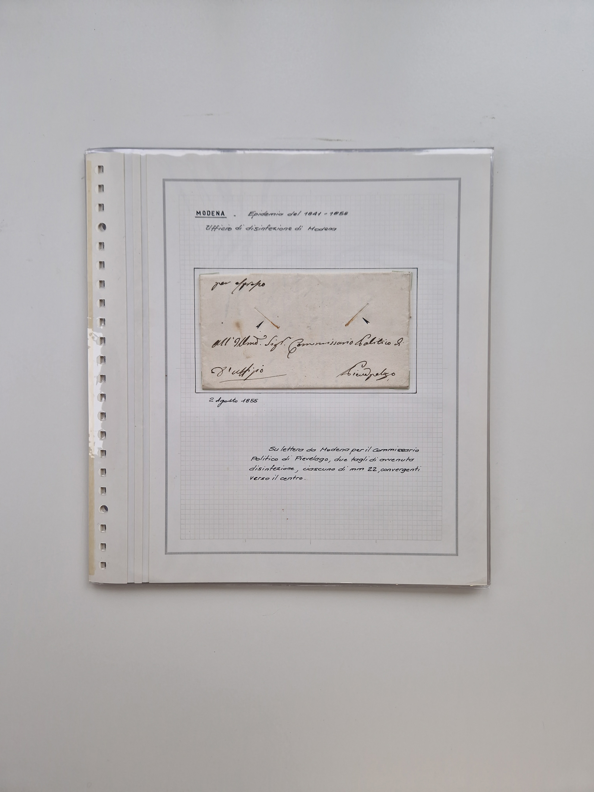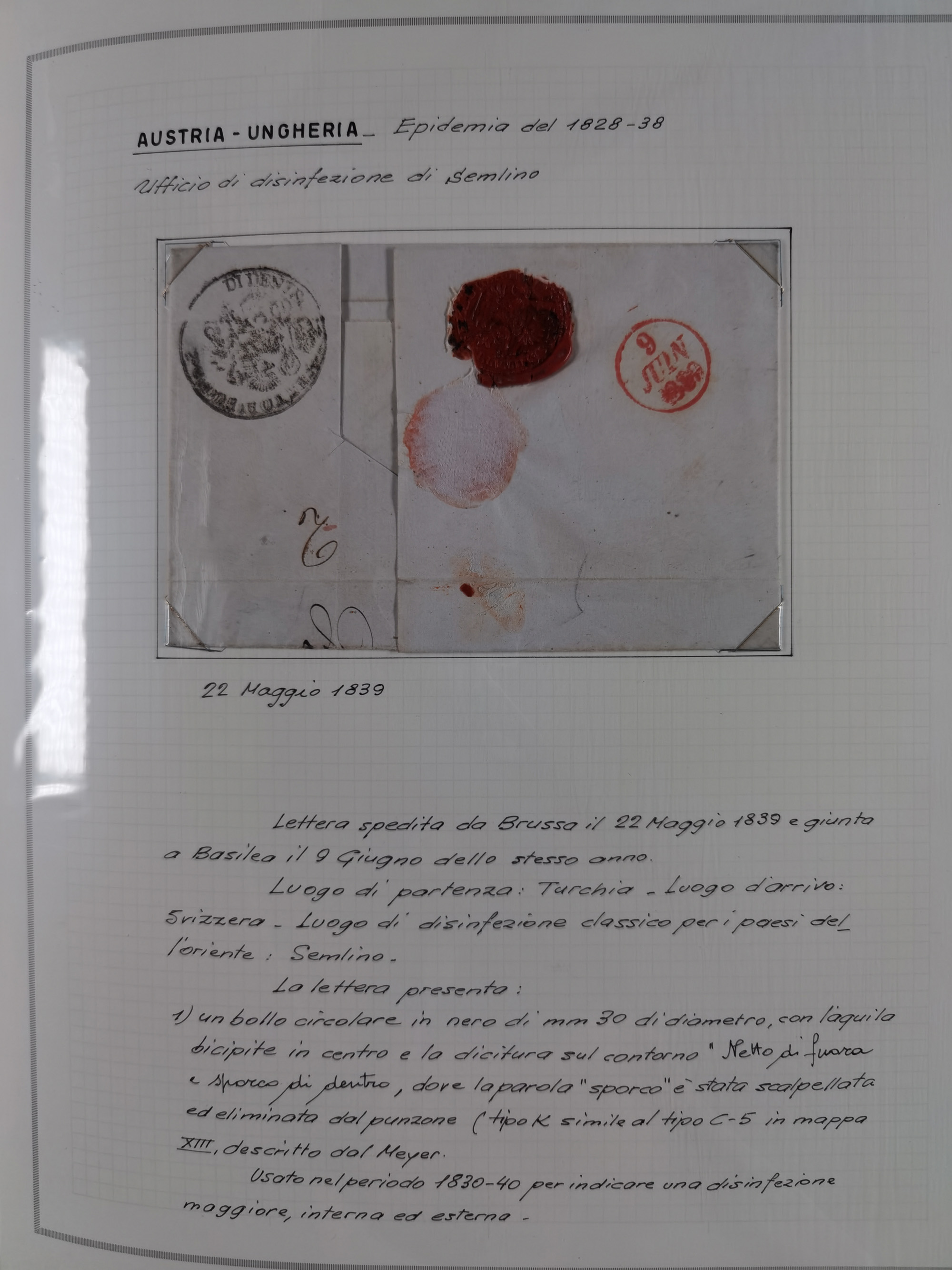 PIEMONT: 1585/1886, über 150 Briefe und Dokumente (wenige Dokumente als Kopie), ab einem sehr frühen Dokument aus 1585, einigen Briefen ab 1797 mit vielen seltenen Stempeln, Brief von Prof. Michele Buniva (von Napoleon ernannter Professor für öffentliche und private Hygiene), Brief von 1830 aus Odessa nach Genua, Mitteilung des 1. Staatssekretärs über die Notwendigkeit der Desinfizierung von Auslandspostsendungen, viele Zirkulare der Gesundheitsmagistrate, etc., sehr reichhaltig, sauber beschrieben in sechs Alben