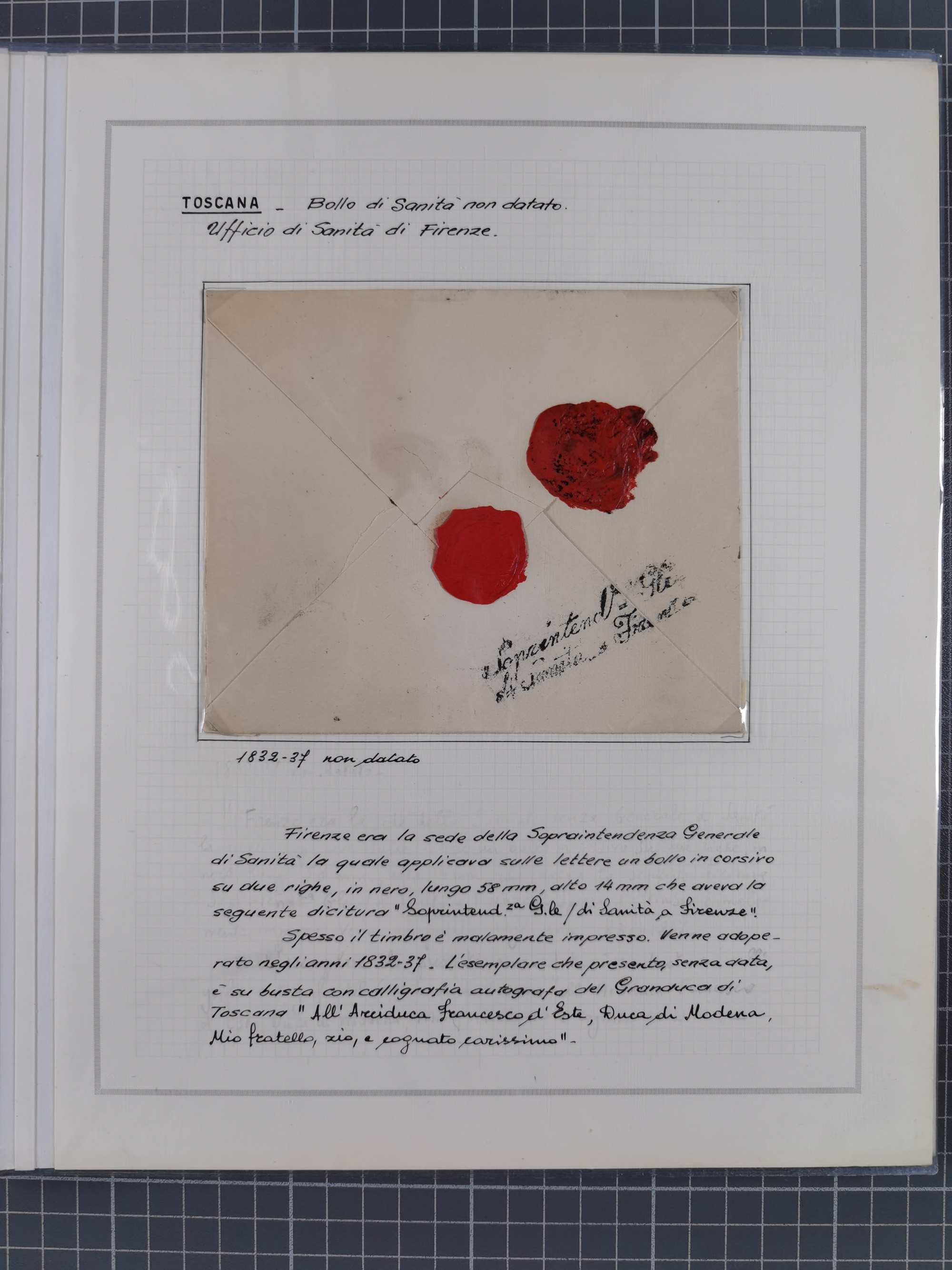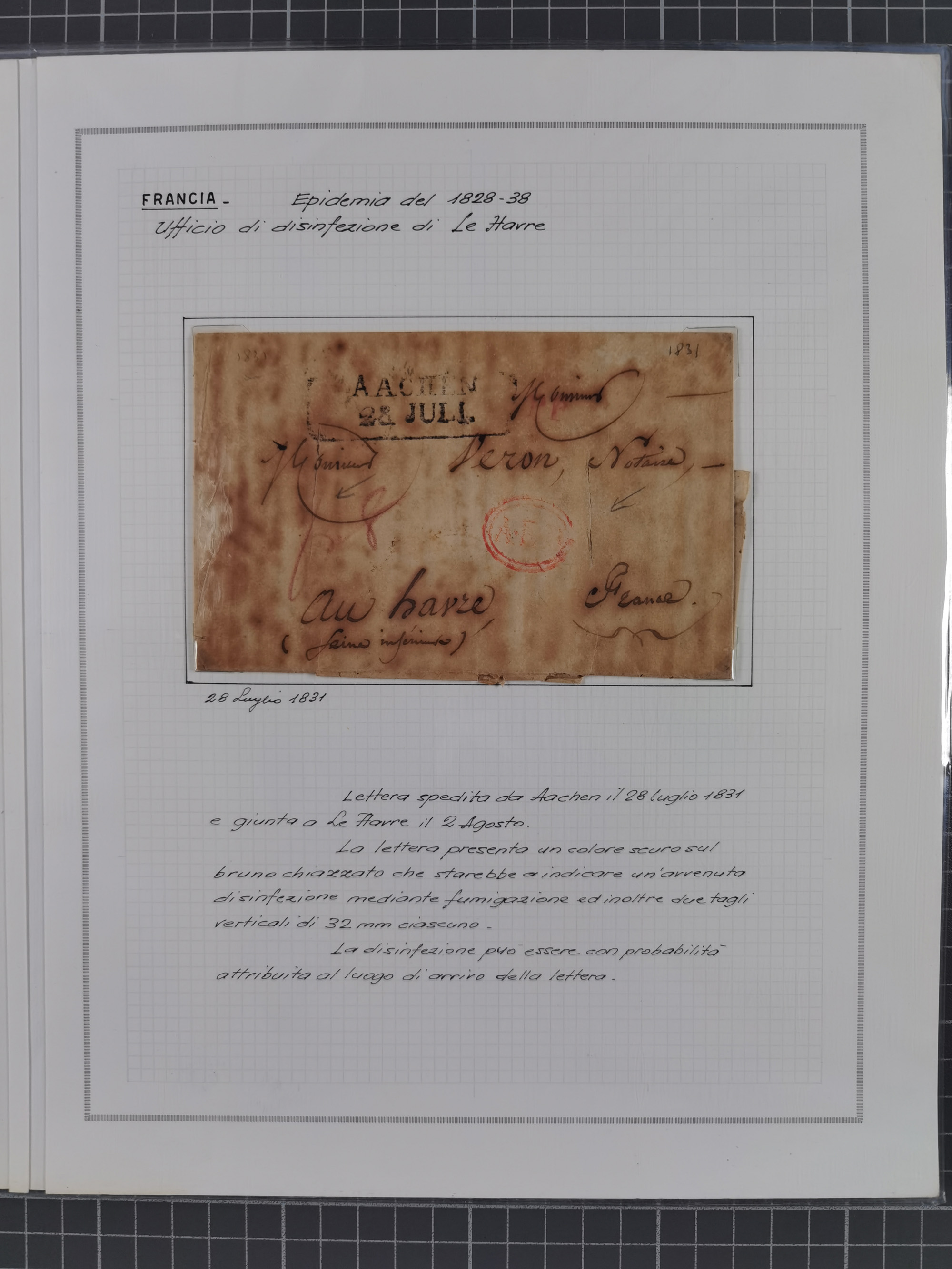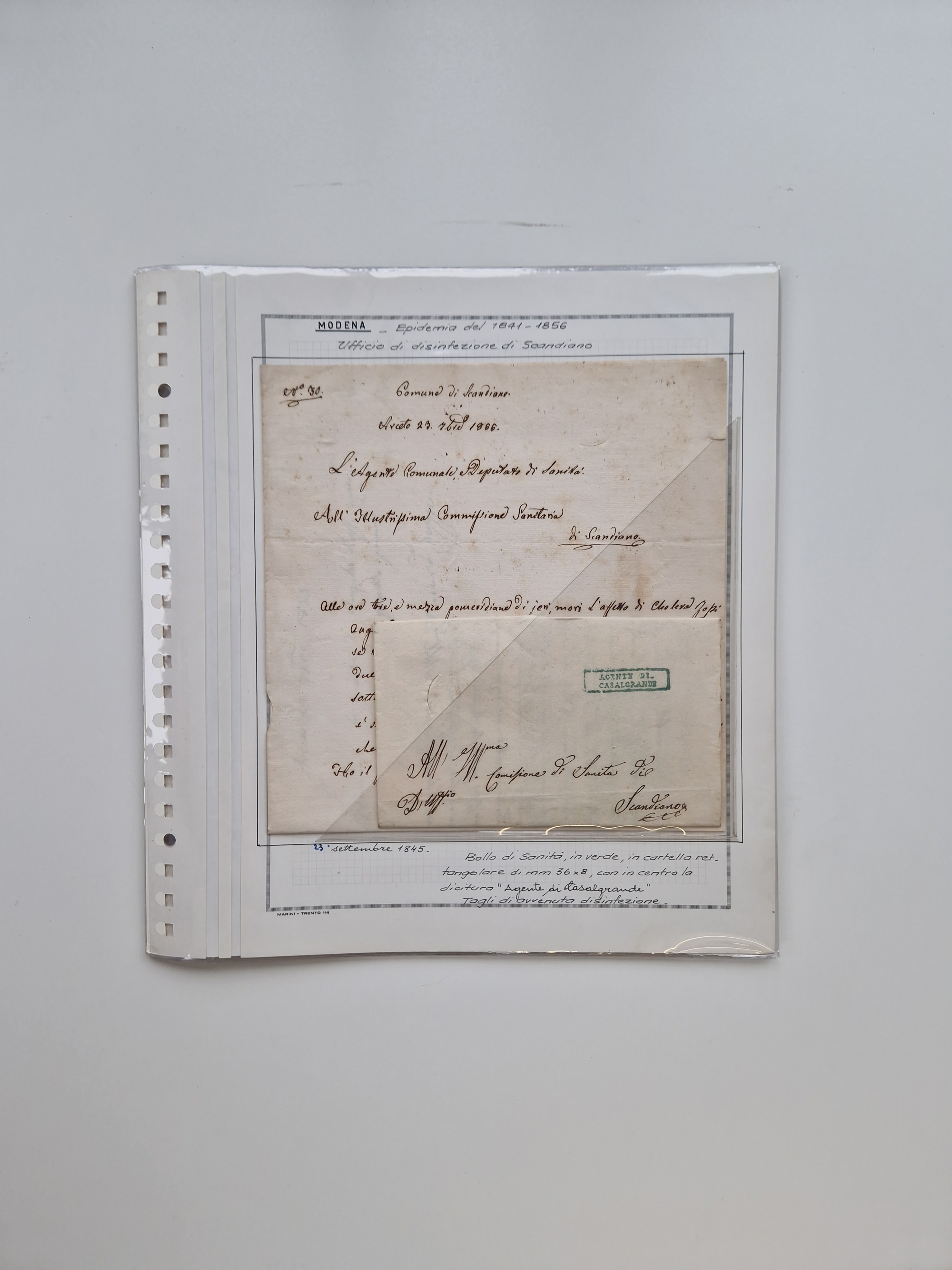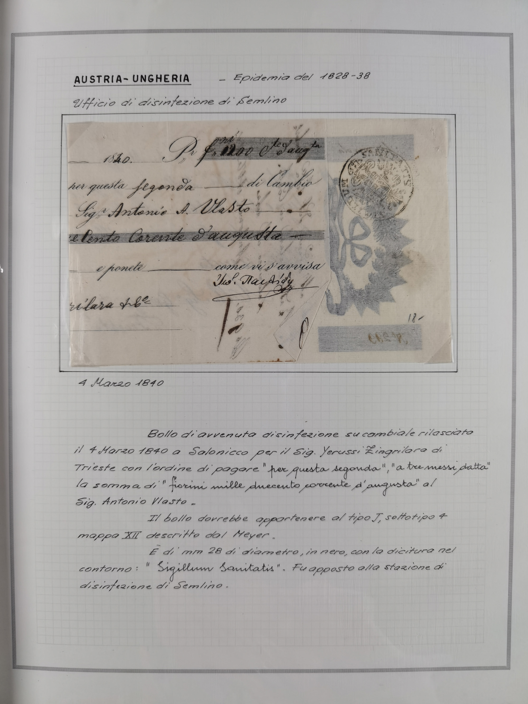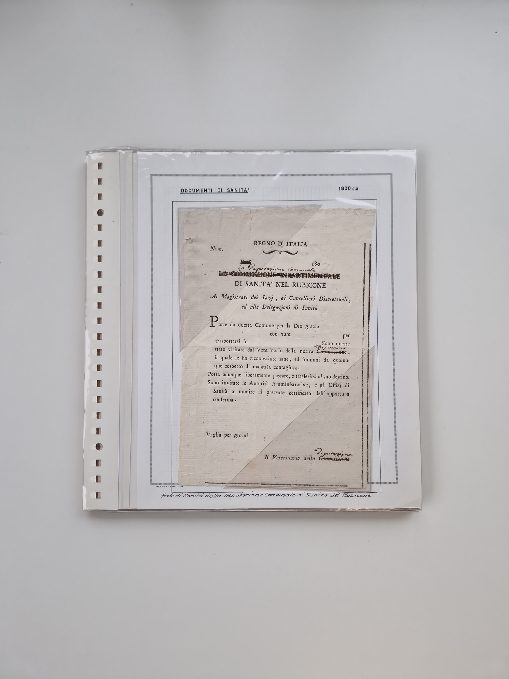 PIEMONT: 1585/1886, über 150 Briefe und Dokumente (wenige Dokumente als Kopie), ab einem sehr frühen Dokument aus 1585, einigen Briefen ab 1797 mit vielen seltenen Stempeln, Brief von Prof. Michele Buniva (von Napoleon ernannter Professor für öffentliche und private Hygiene), Brief von 1830 aus Odessa nach Genua, Mitteilung des 1. Staatssekretärs über die Notwendigkeit der Desinfizierung von Auslandspostsendungen, viele Zirkulare der Gesundheitsmagistrate, etc., sehr reichhaltig, sauber beschrieben in sechs Alben