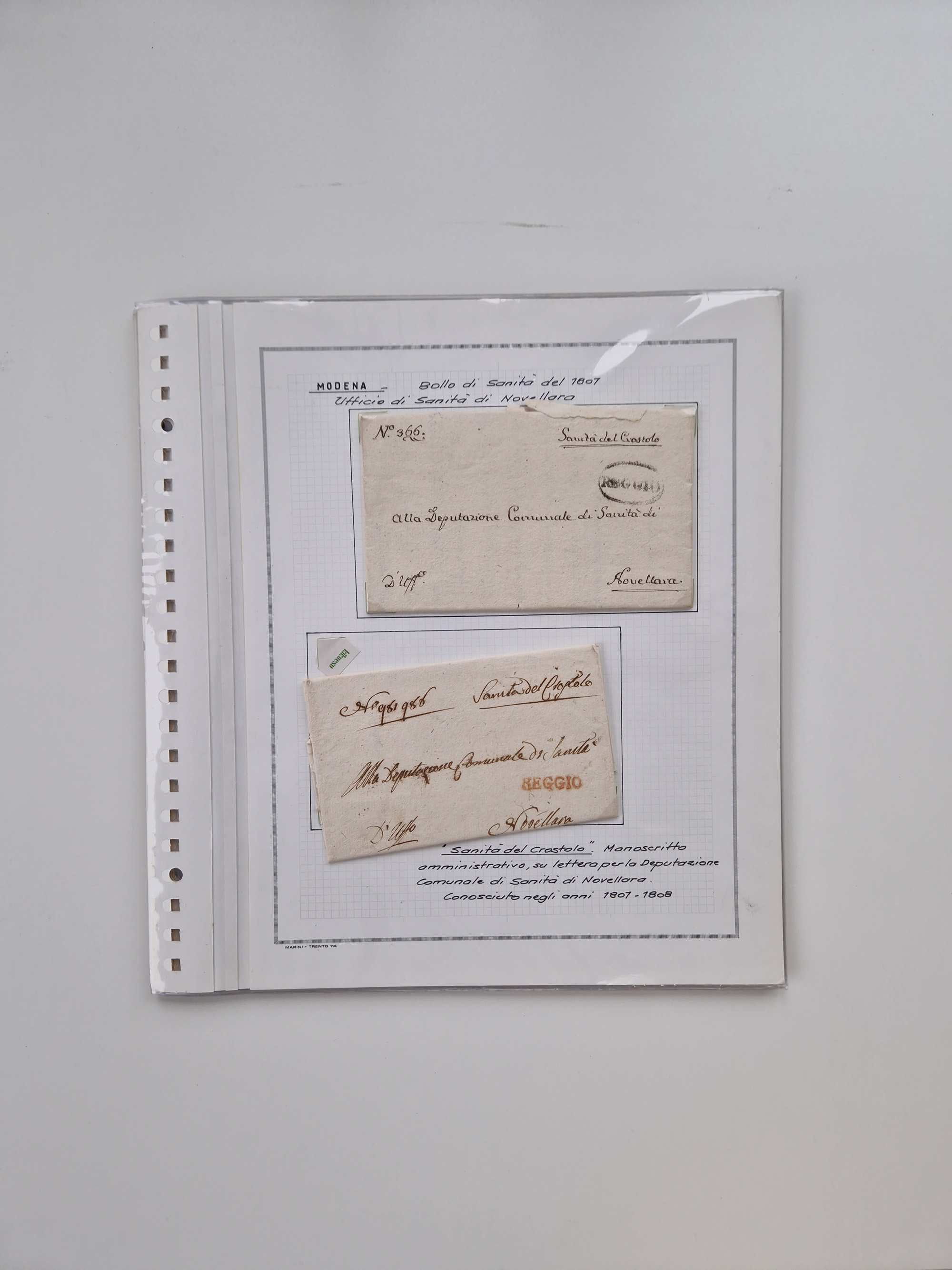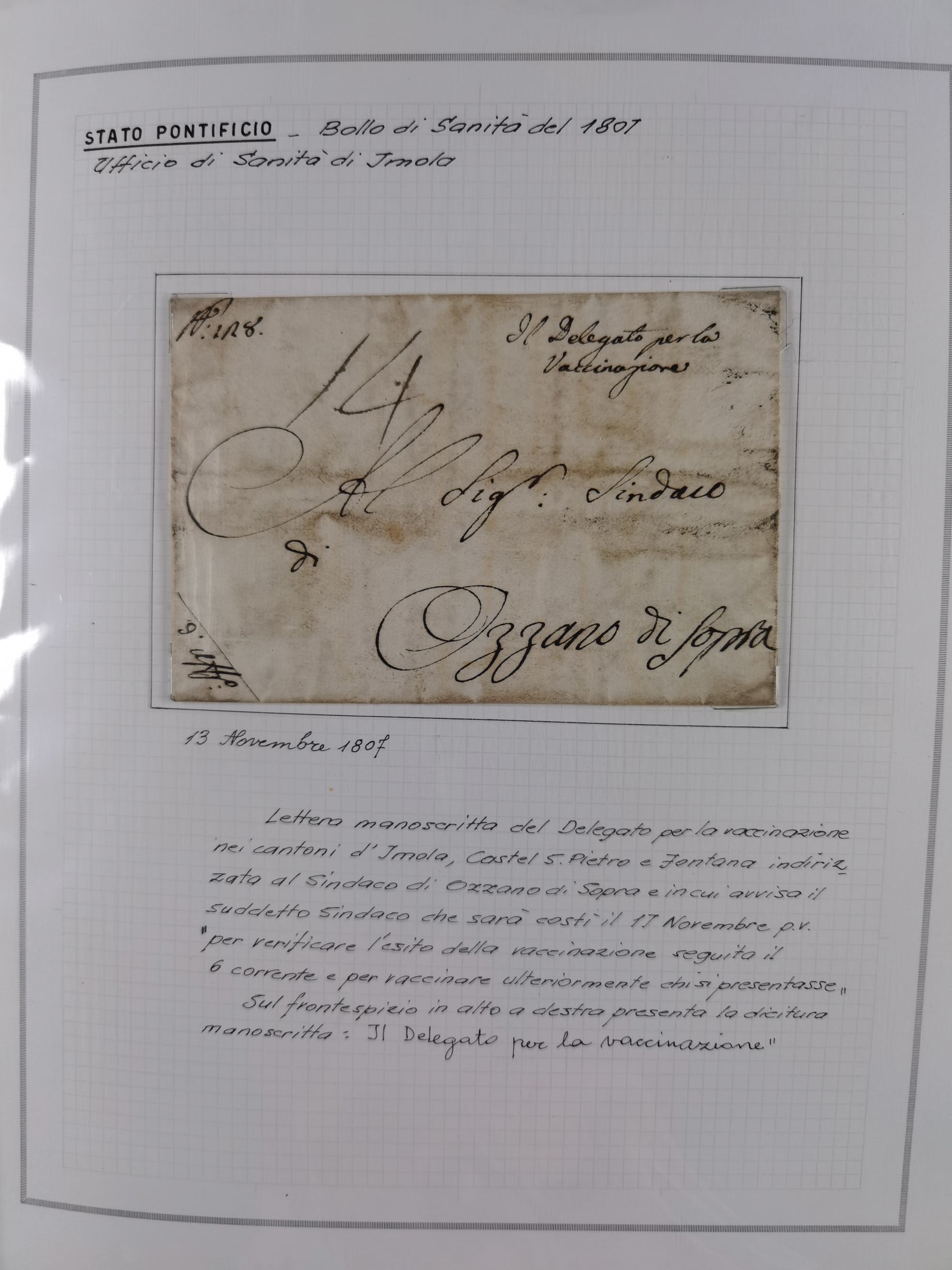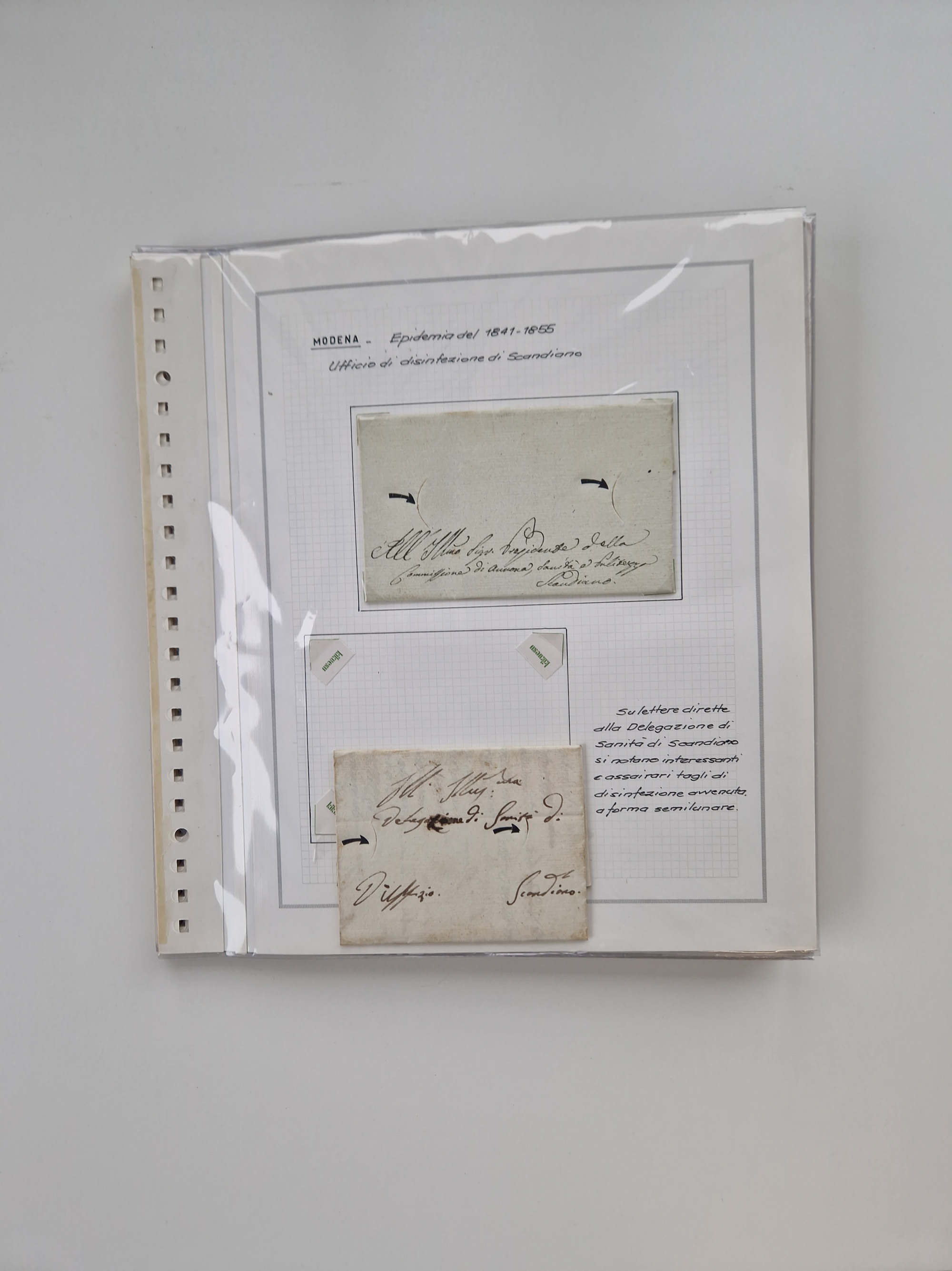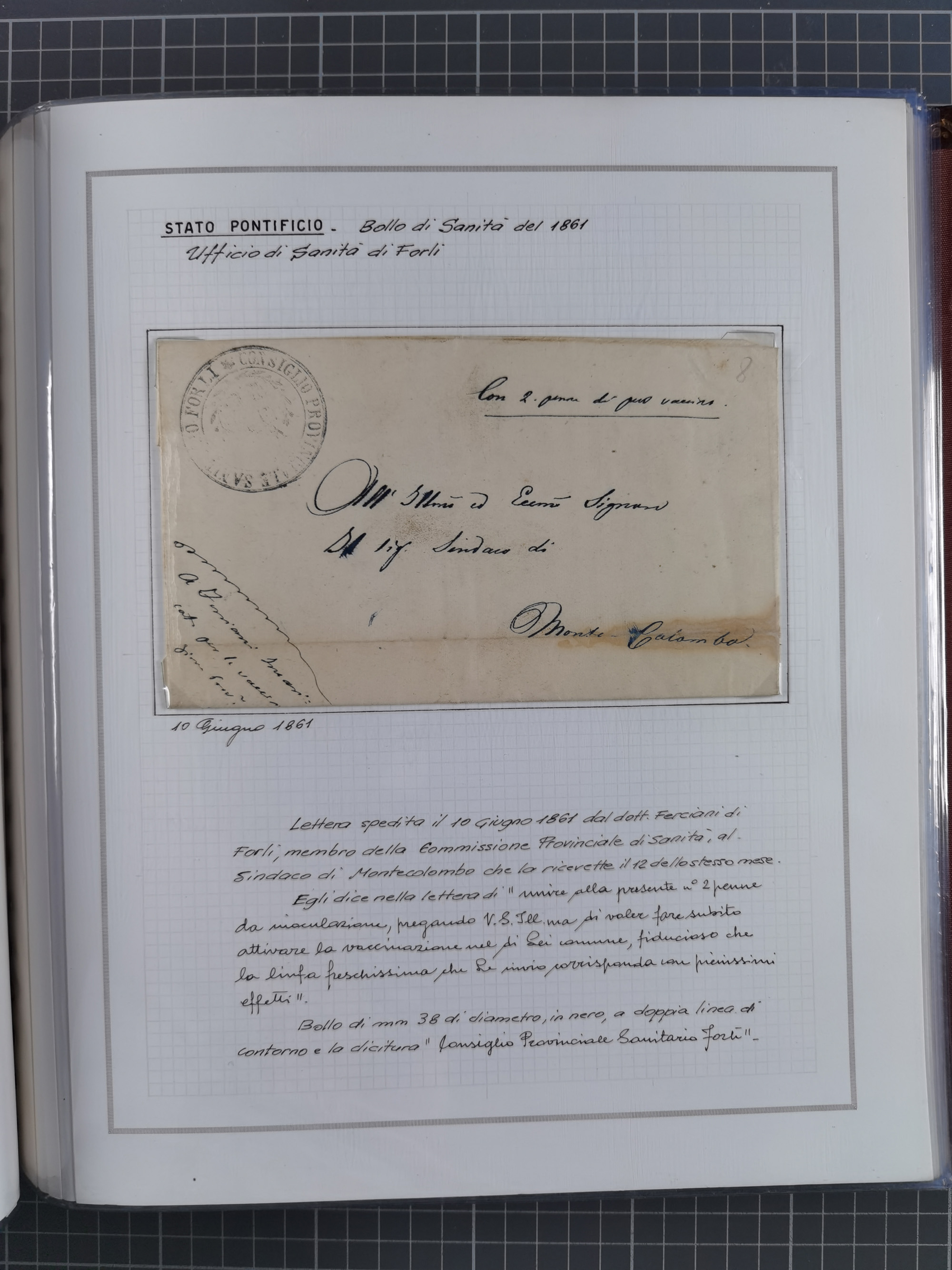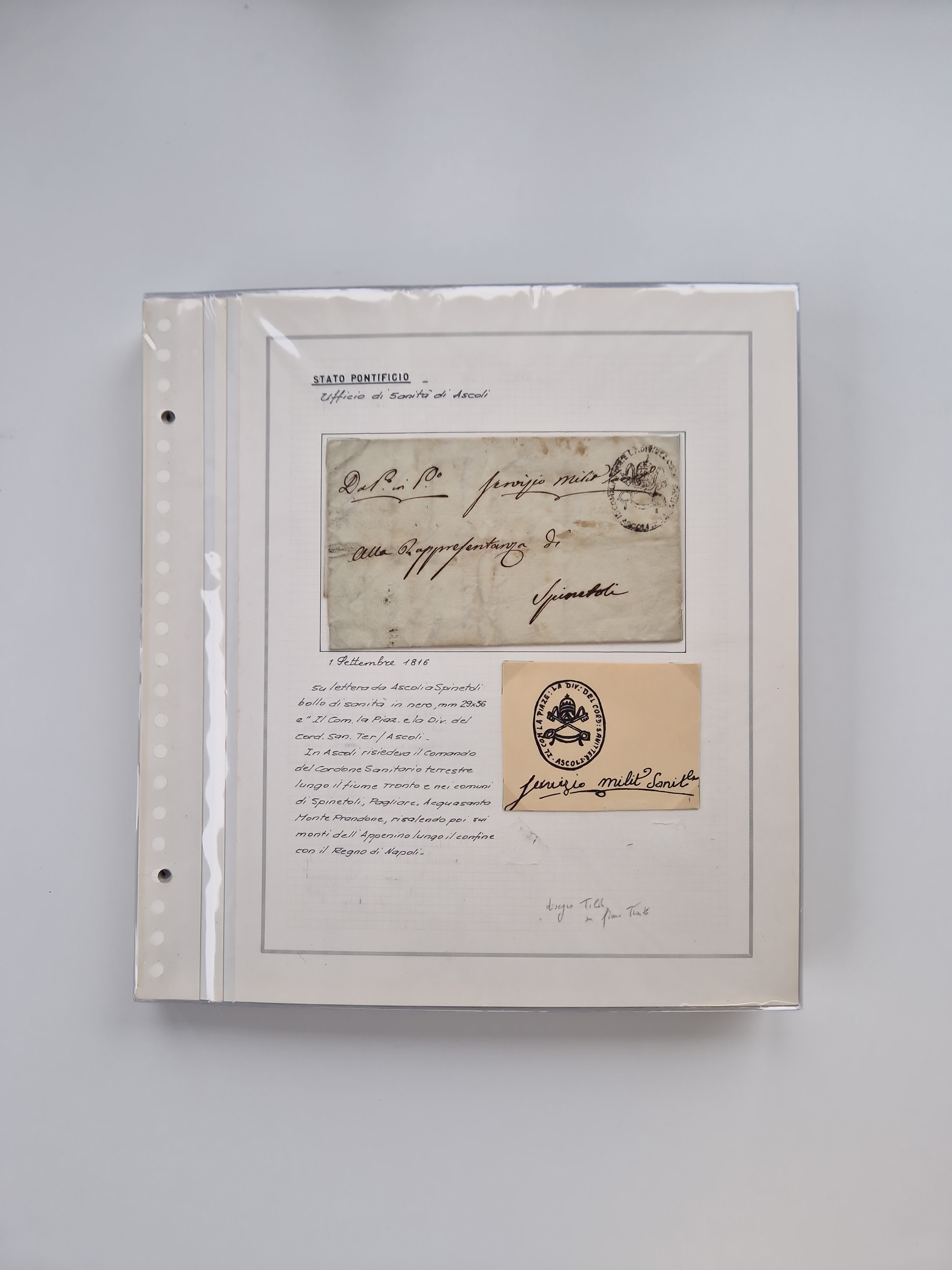 ITALIEN: 1807/1866, Sammlung mit 42 Briefen und Dokumenten, angefangen mit zwei Briefen aus 1807 mit “Il Delegato per la Vaccinazione”, später Italien Portomarke Mi.-Nr. P1 (unentwertet) auf Brief, sehr interessant, sauber beschrieben im Album