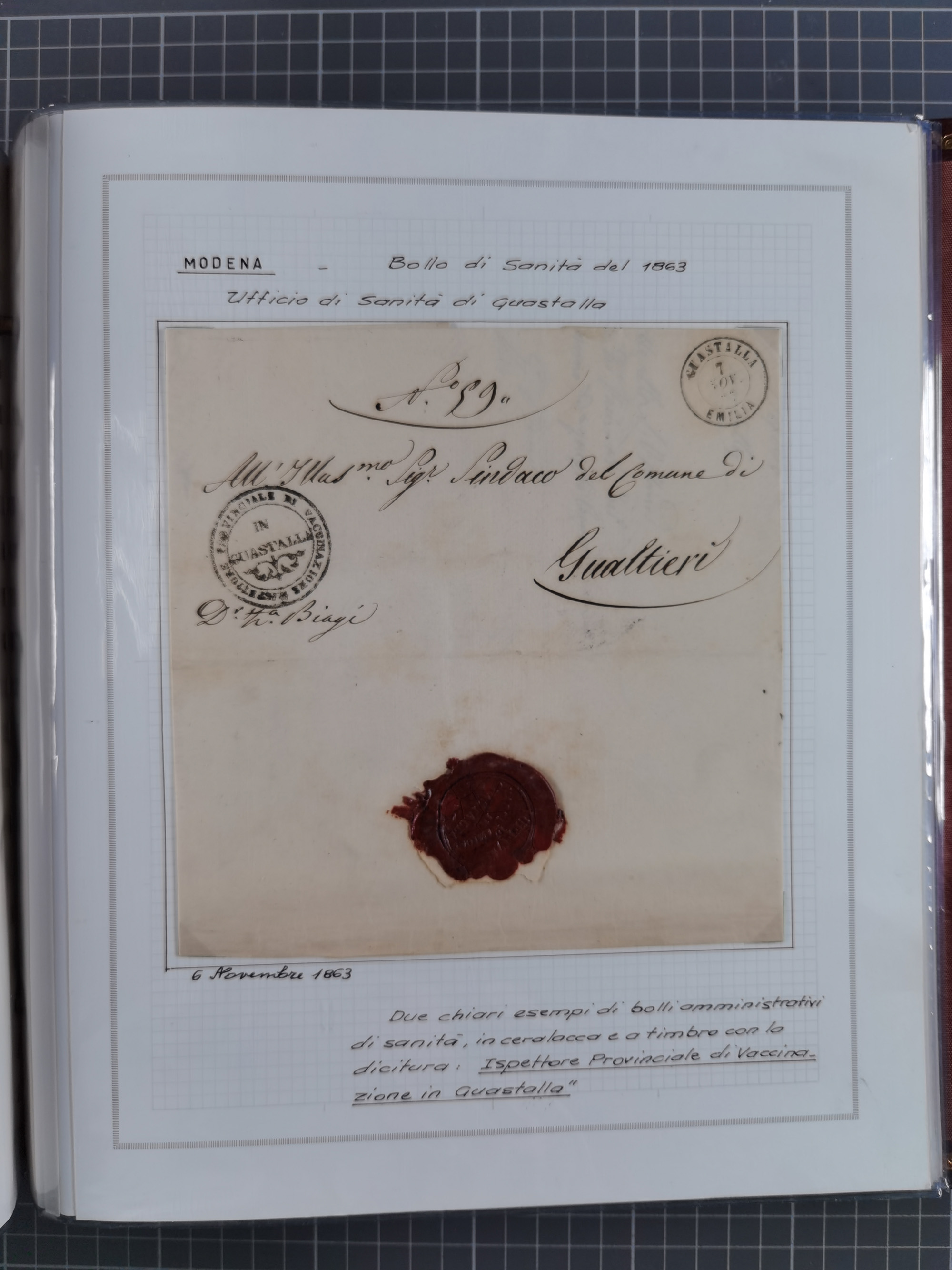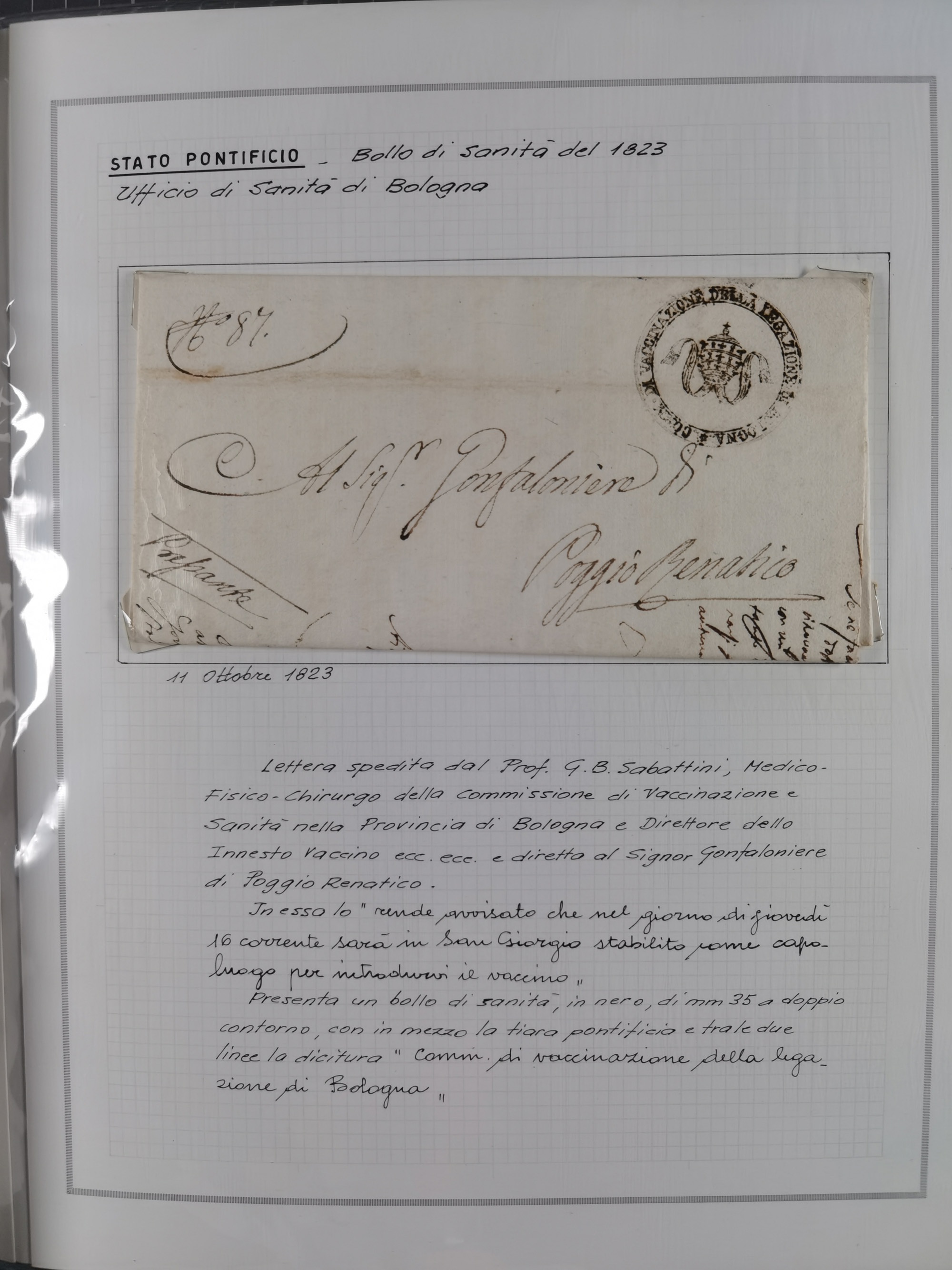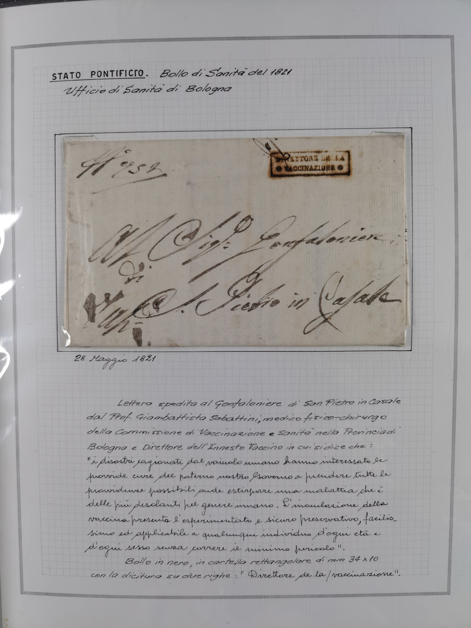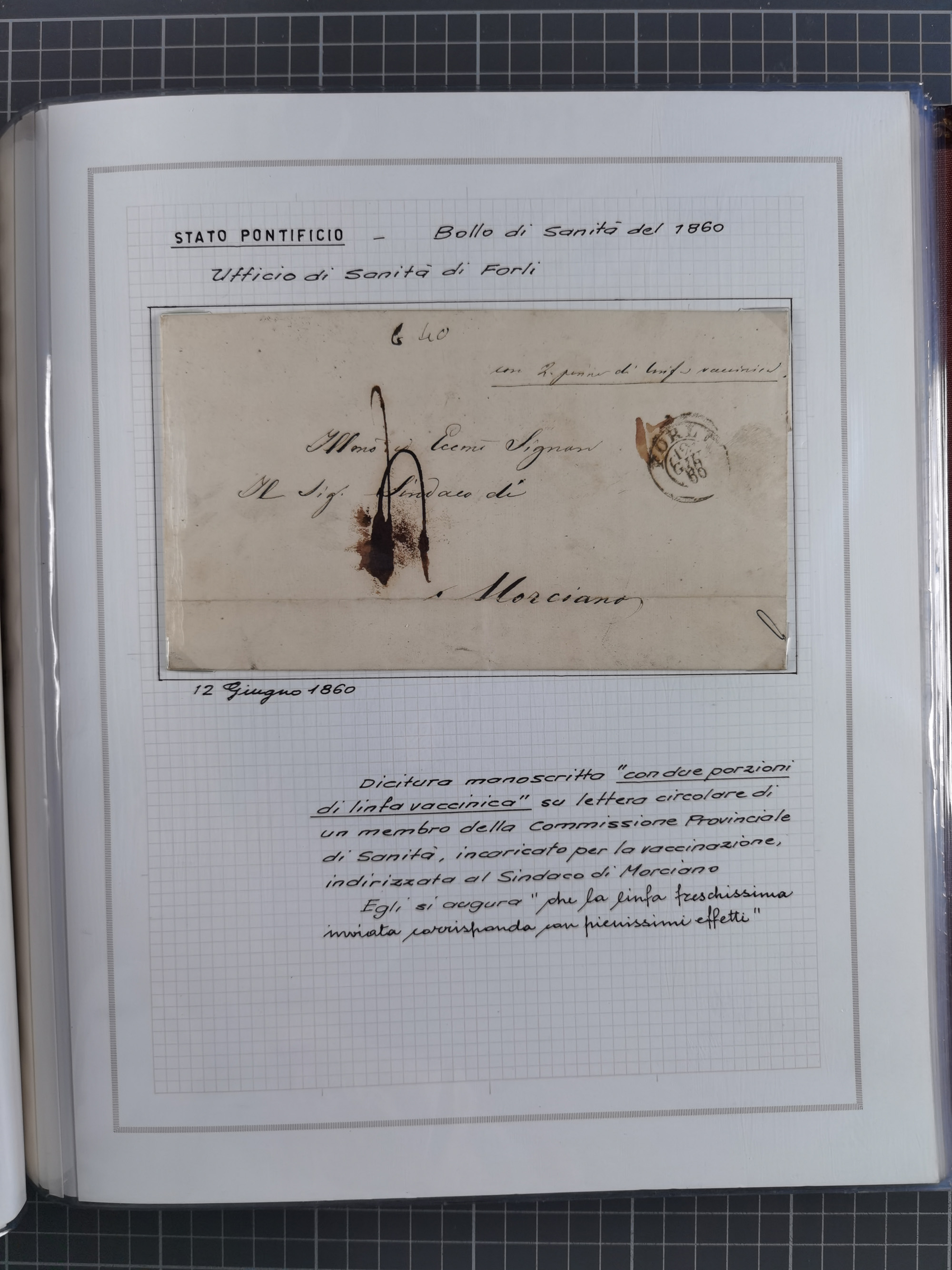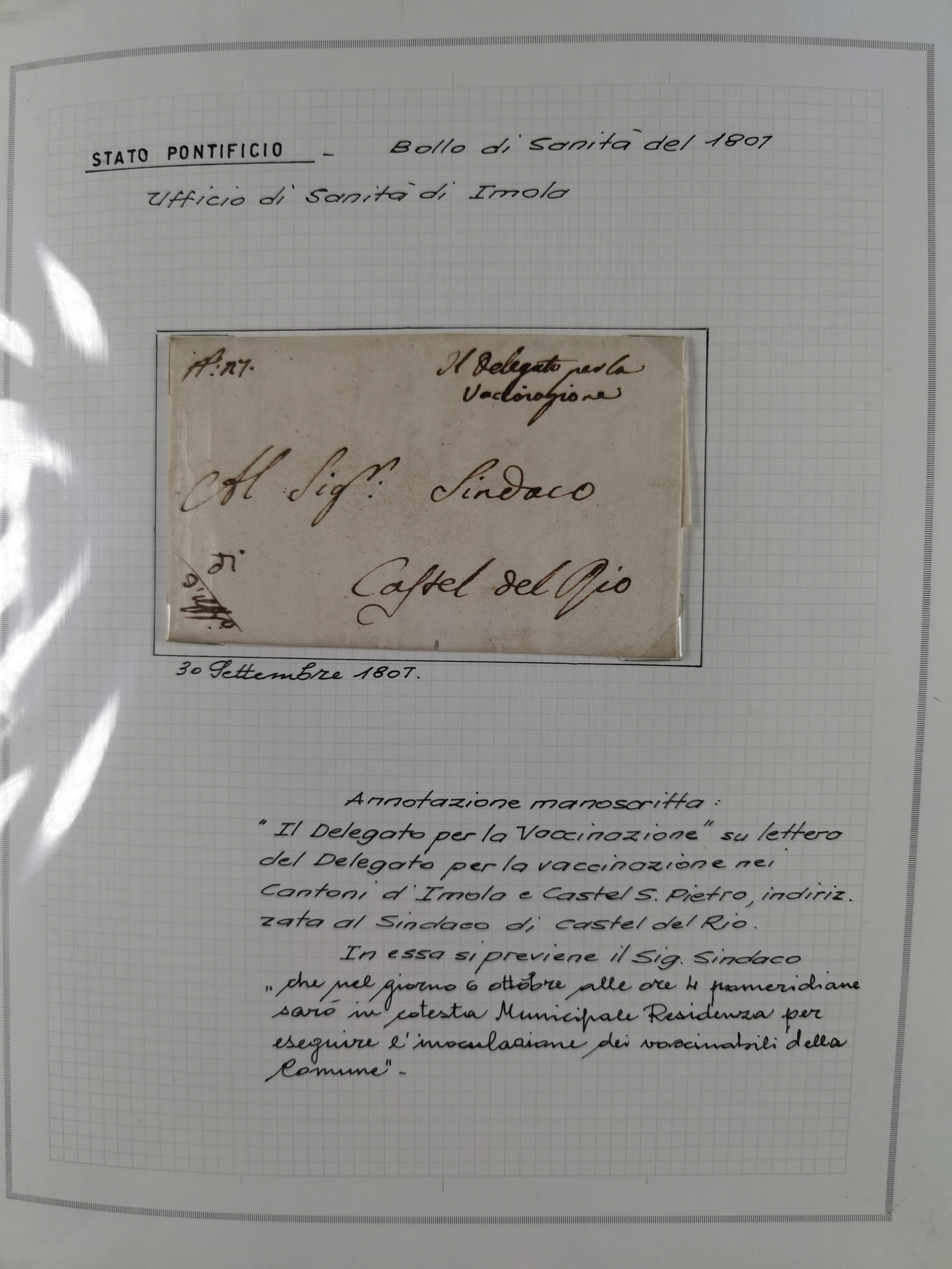 ITALIEN: 1807/1866, Sammlung mit 42 Briefen und Dokumenten, angefangen mit zwei Briefen aus 1807 mit “Il Delegato per la Vaccinazione”, später Italien Portomarke Mi.-Nr. P1 (unentwertet) auf Brief, sehr interessant, sauber beschrieben im Album