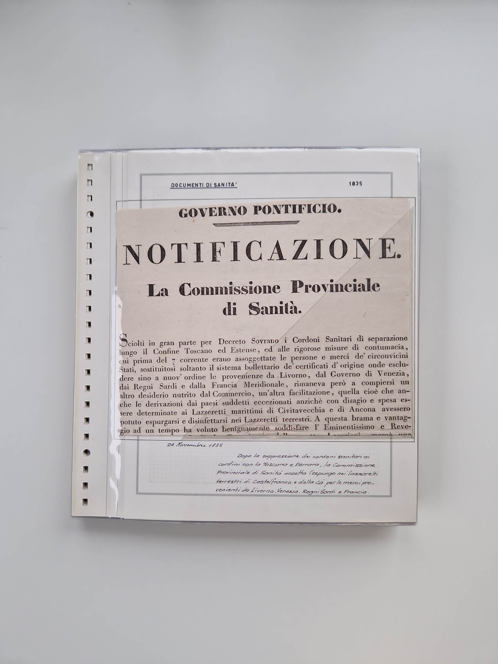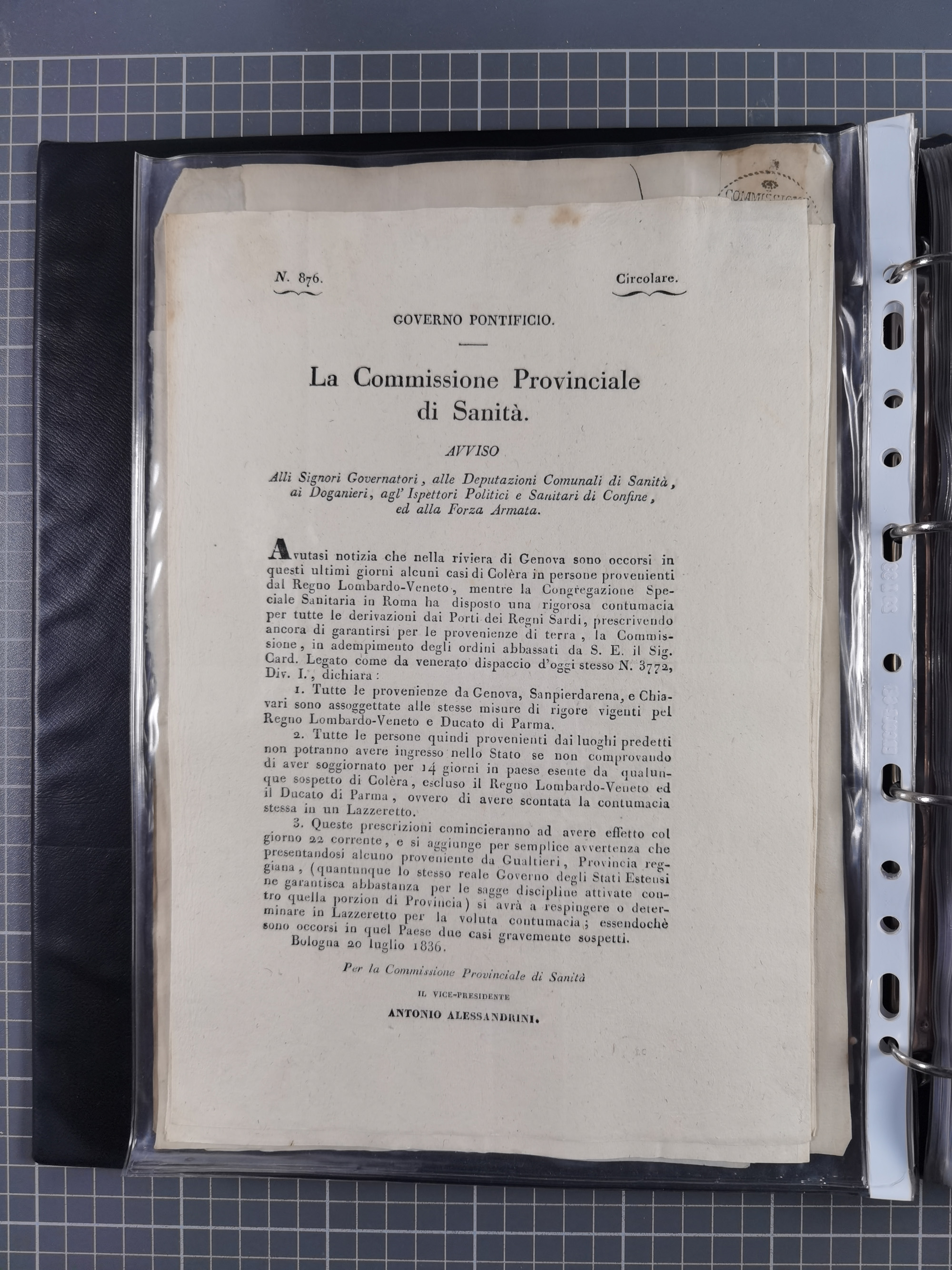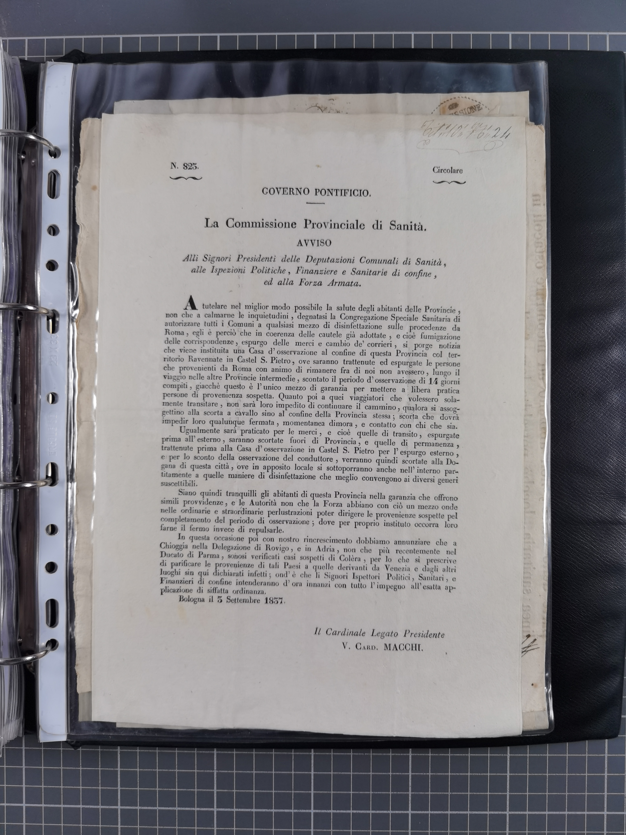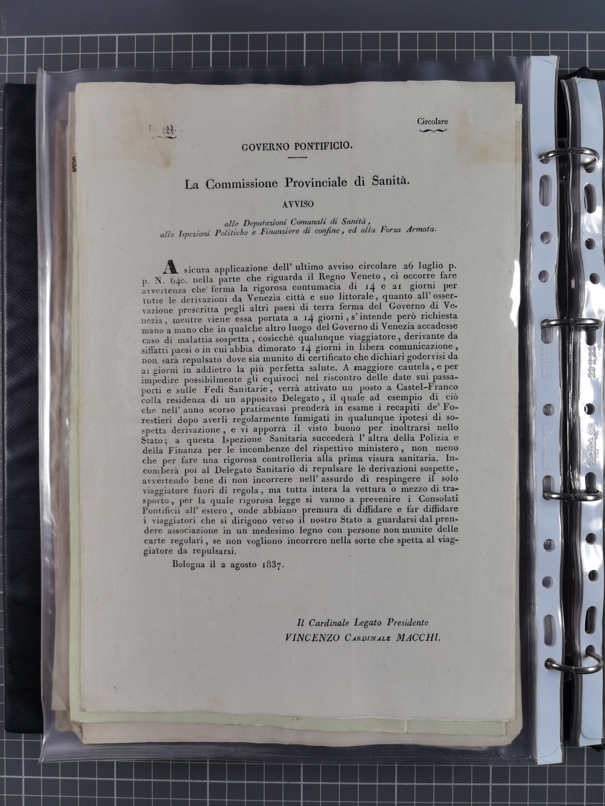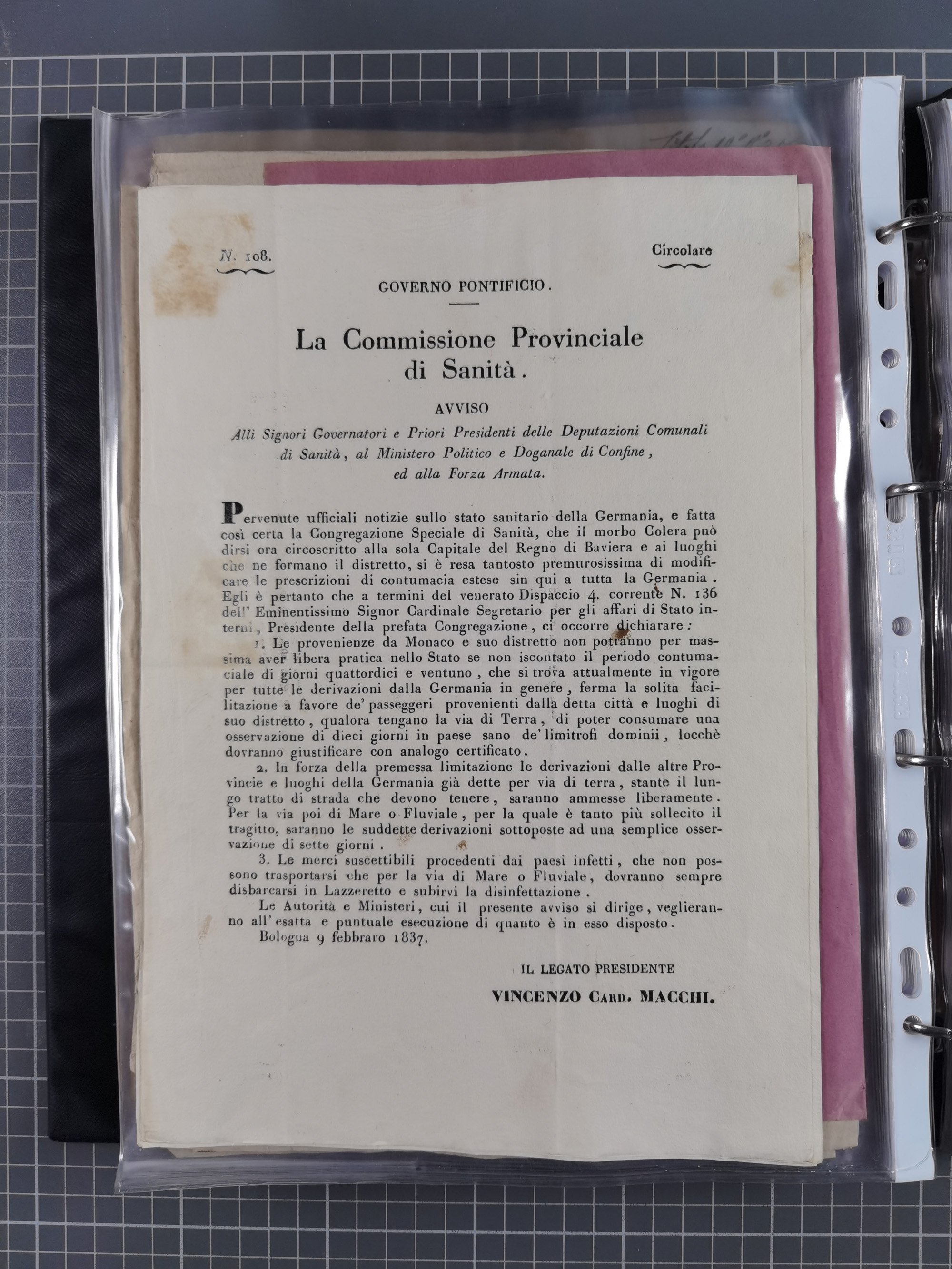 KIRCHENSTAAT: 1835/37, Sammlung von über 80 Dokumenten und Briefen zu den päpstlichen Sanitätszirkularen “Circolare di Sanità” während der Cholera-Gefahr, mit amtlichen Anweisungen zu Quarantäne, Desinfektion und Gesundheitskontrollen an lokale Behörden. Umfangreiche Dokumentation, in zwei Alben