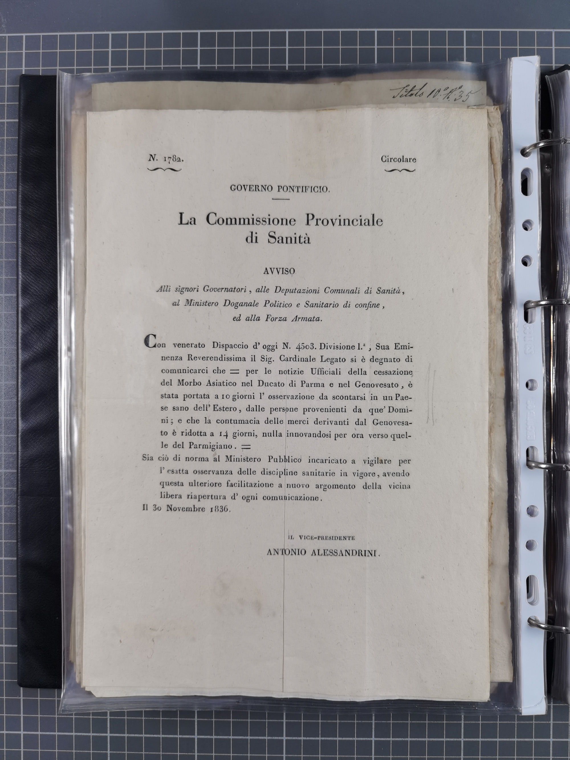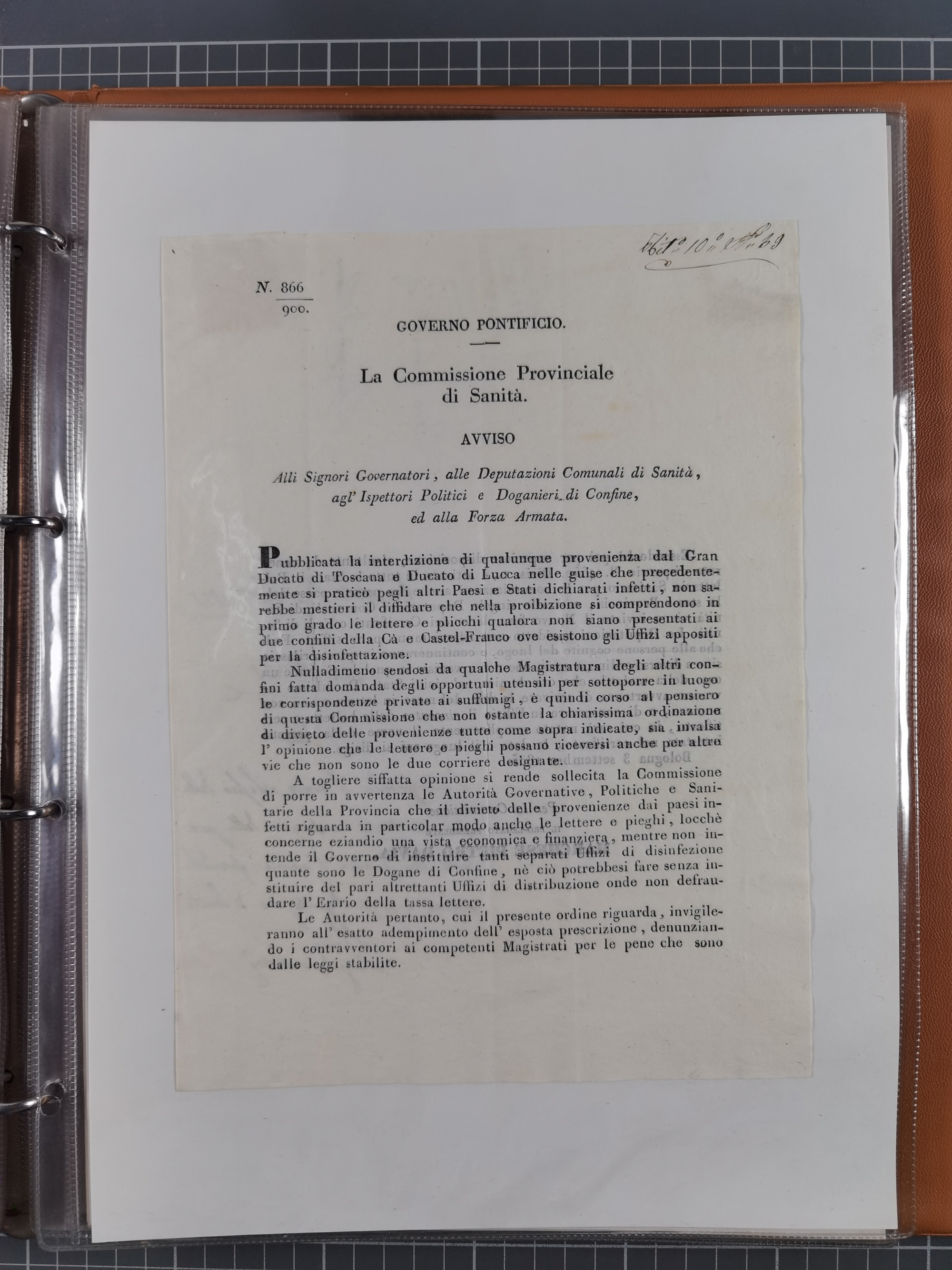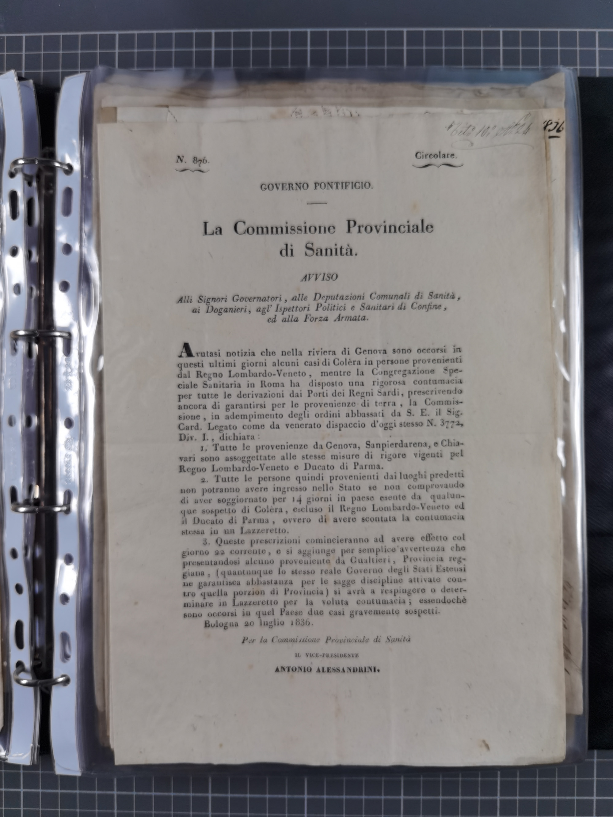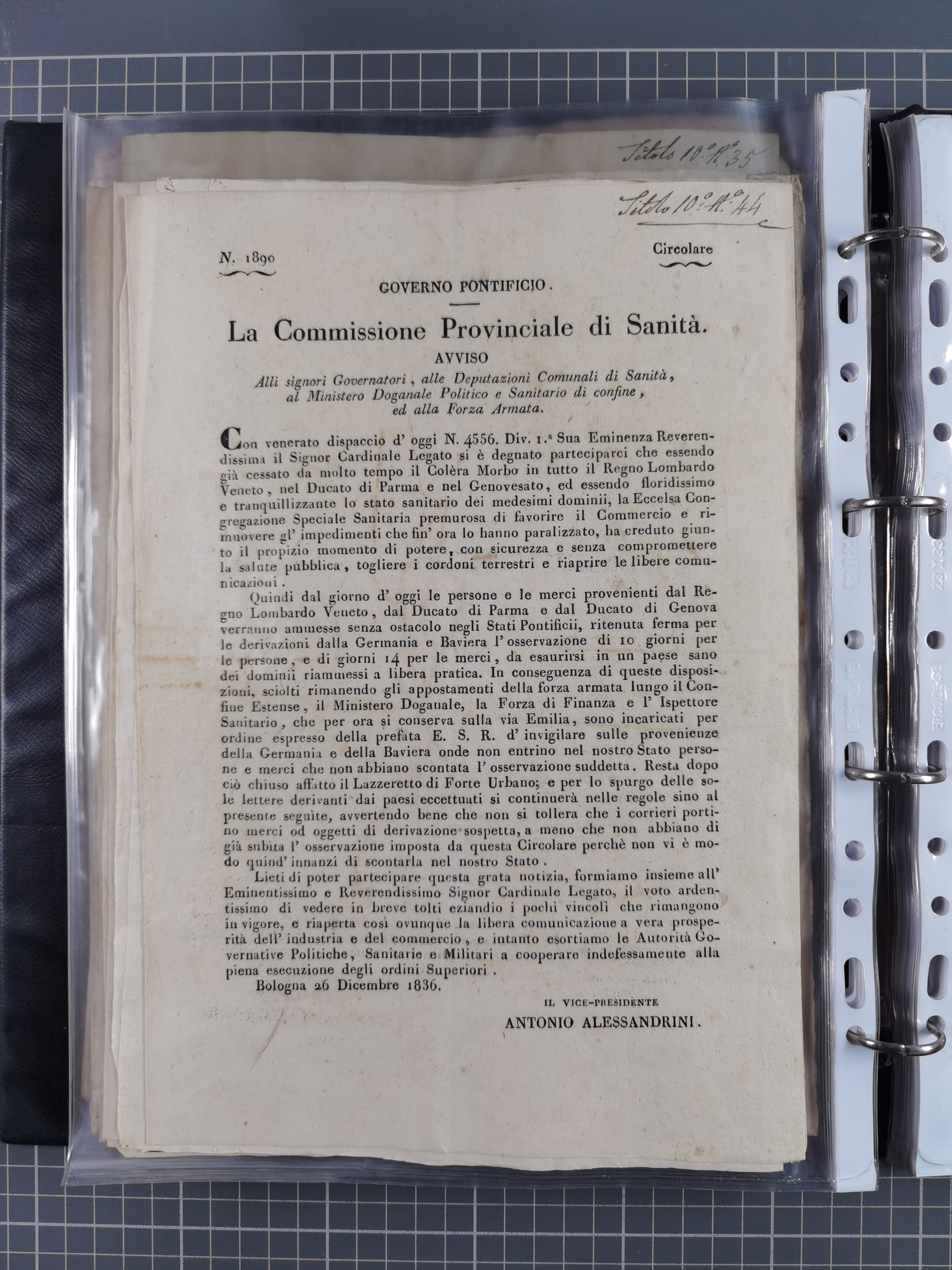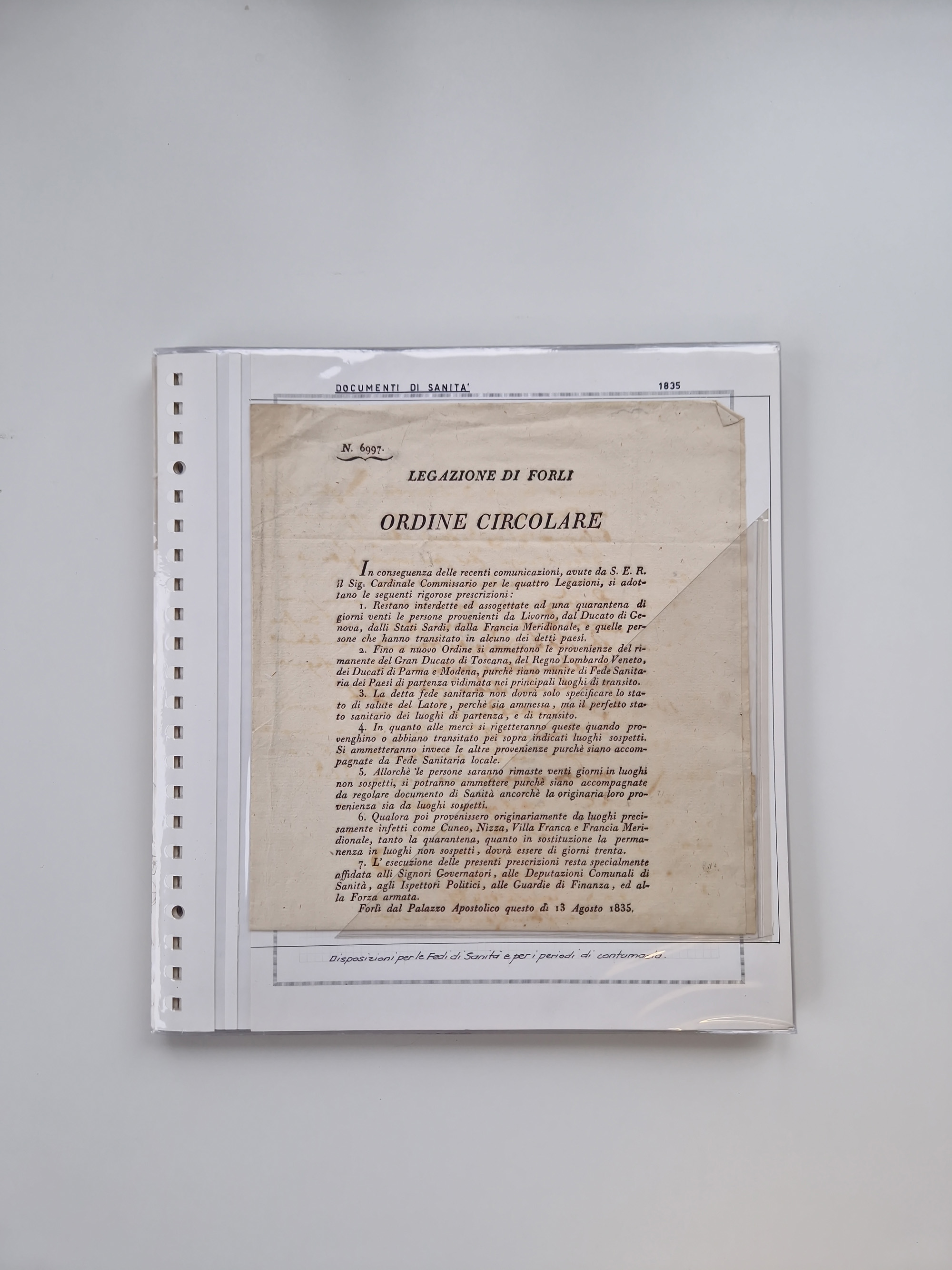 KIRCHENSTAAT: 1835/37, Sammlung von über 80 Dokumenten und Briefen zu den päpstlichen Sanitätszirkularen “Circolare di Sanità” während der Cholera-Gefahr, mit amtlichen Anweisungen zu Quarantäne, Desinfektion und Gesundheitskontrollen an lokale Behörden. Umfangreiche Dokumentation, in zwei Alben