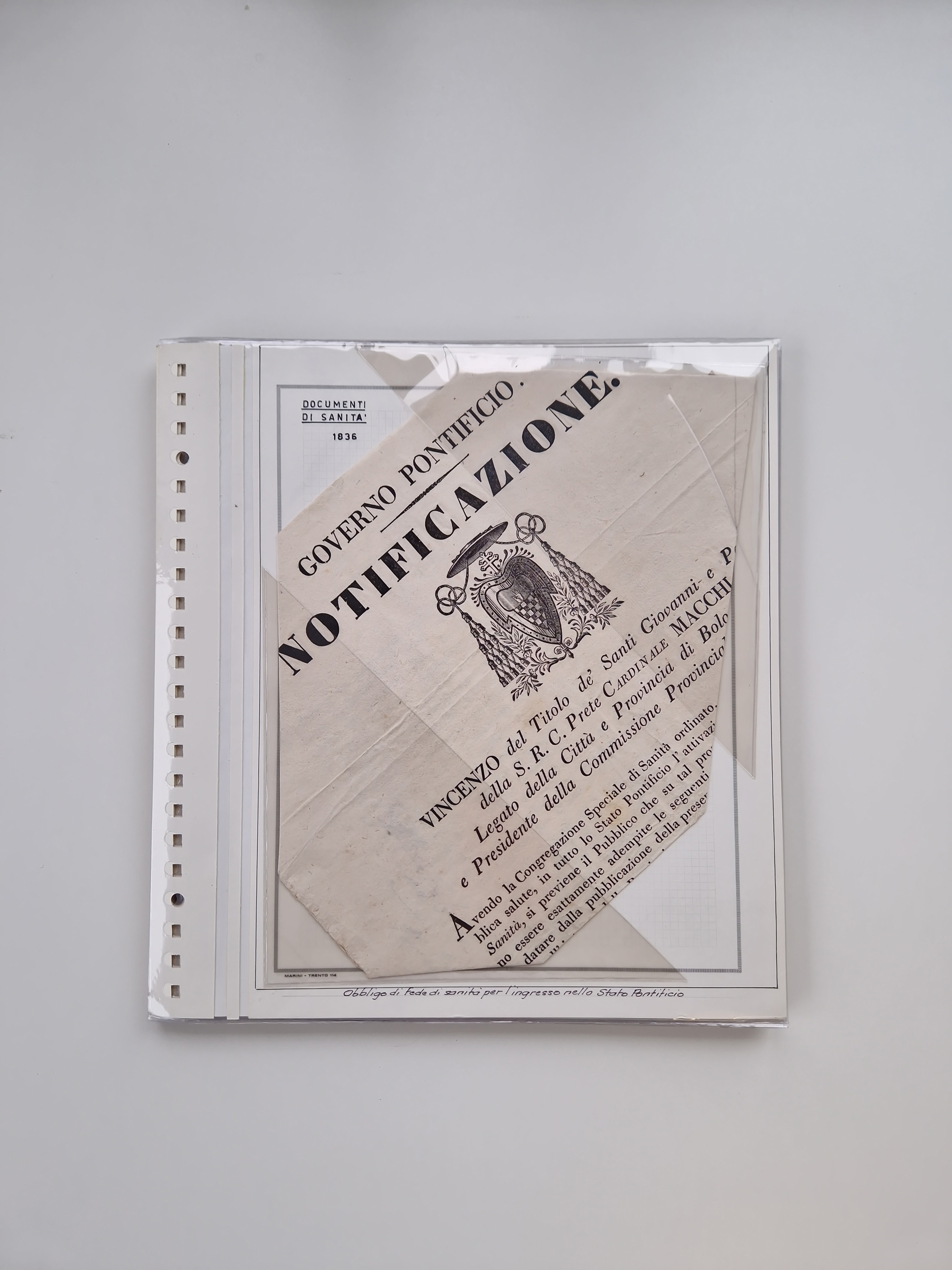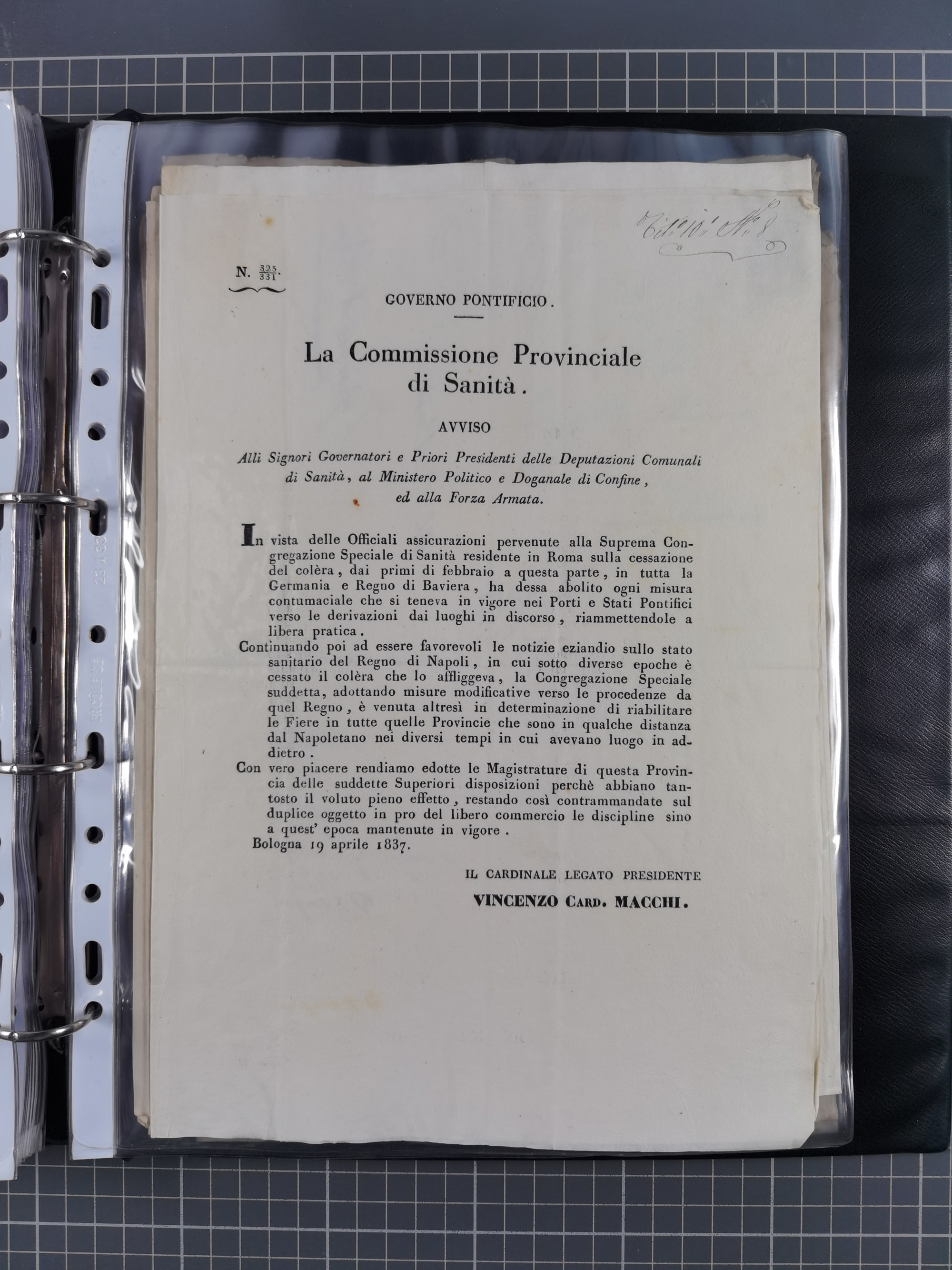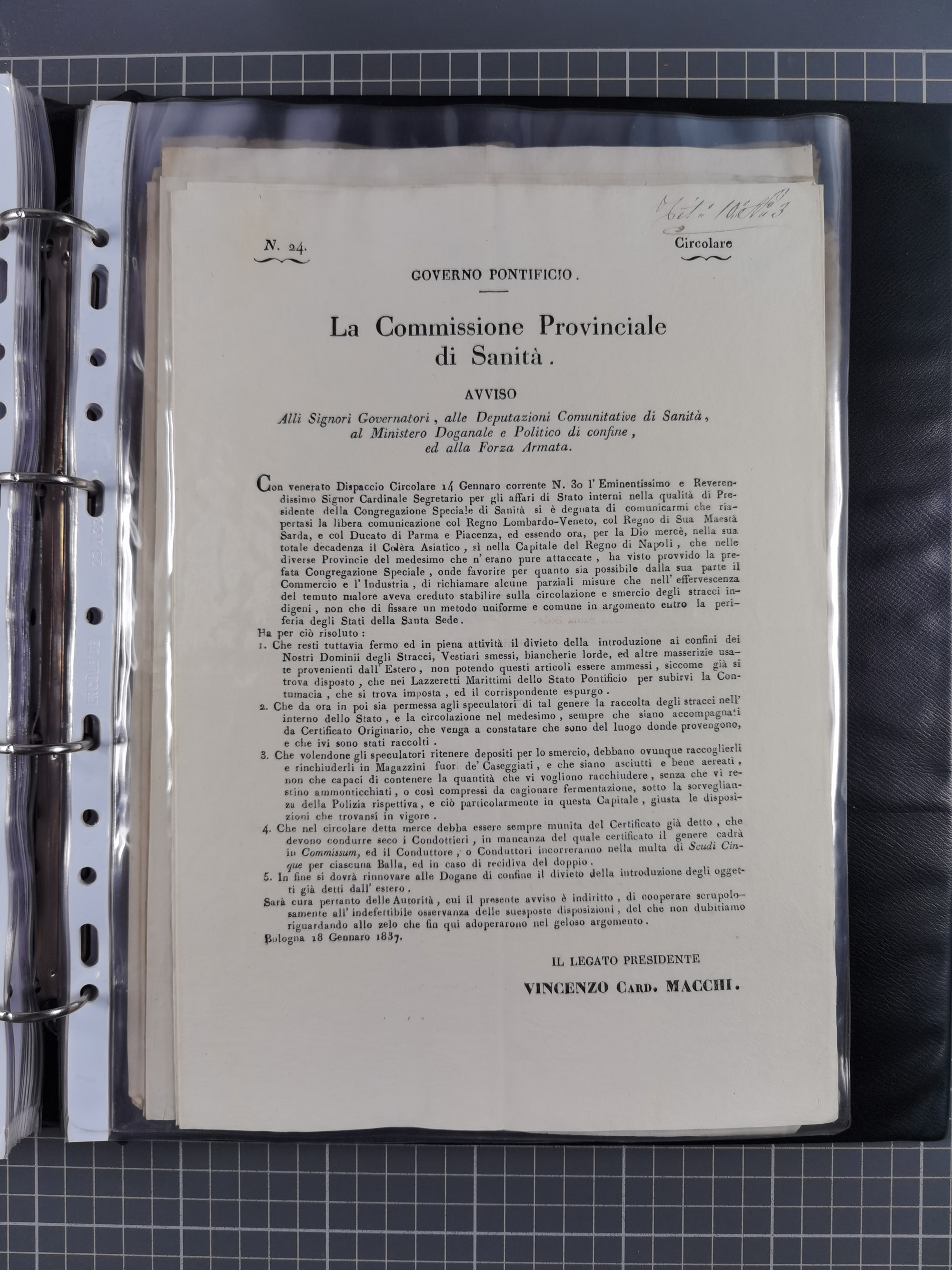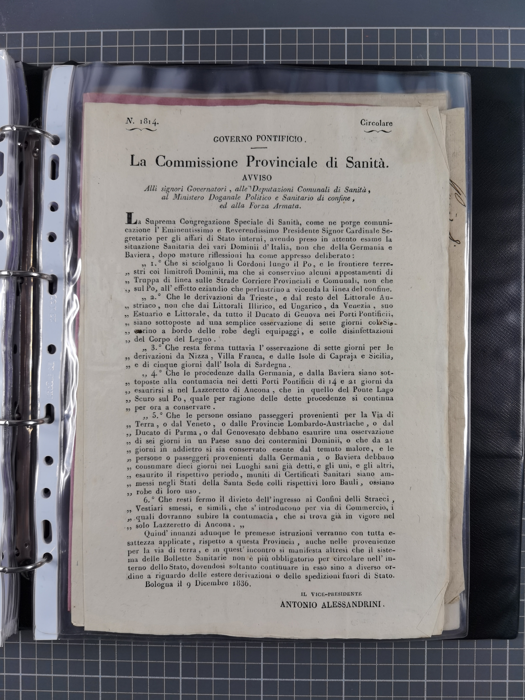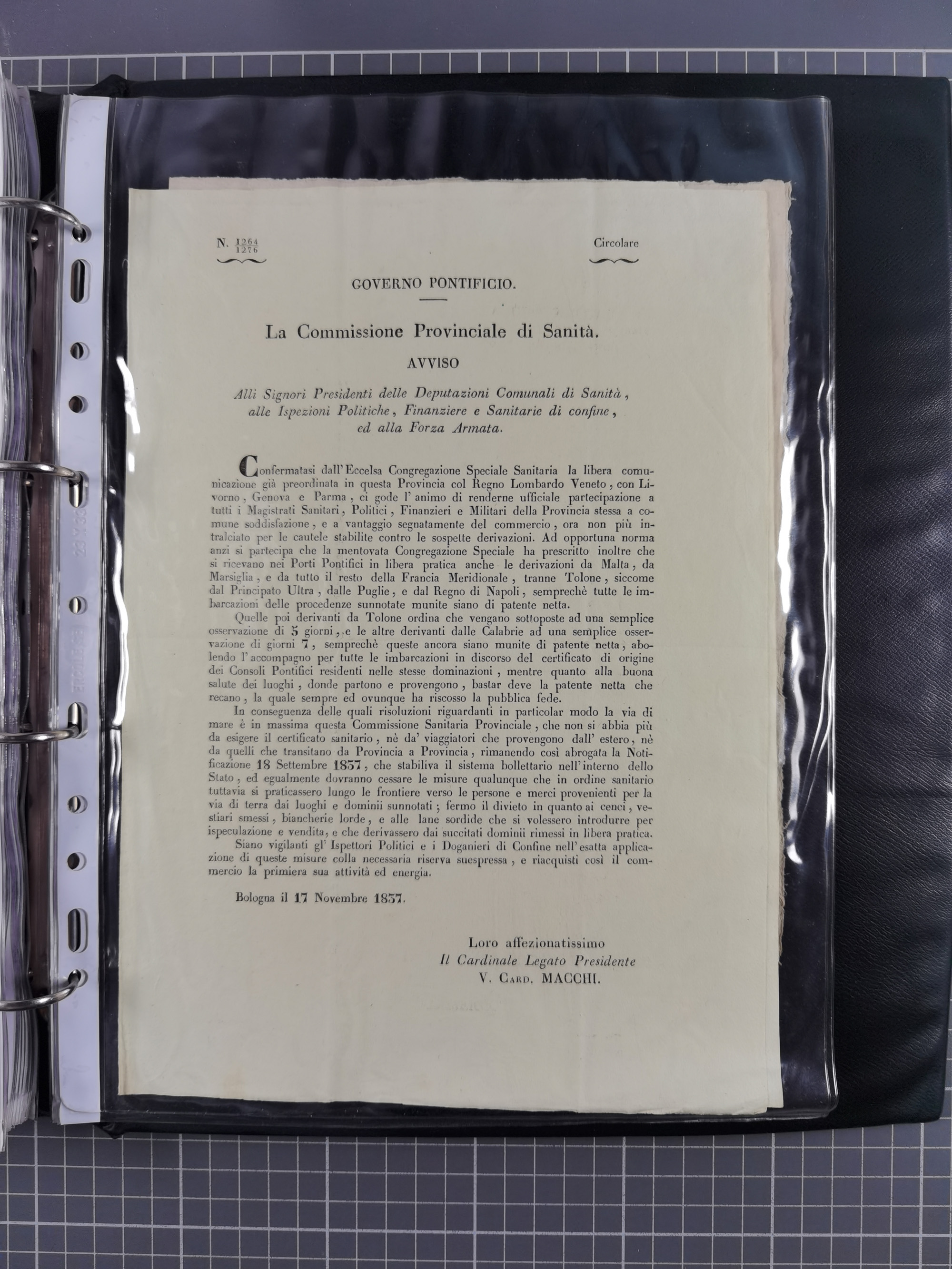 KIRCHENSTAAT: 1835/37, Sammlung von über 80 Dokumenten und Briefen zu den päpstlichen Sanitätszirkularen “Circolare di Sanità” während der Cholera-Gefahr, mit amtlichen Anweisungen zu Quarantäne, Desinfektion und Gesundheitskontrollen an lokale Behörden. Umfangreiche Dokumentation, in zwei Alben