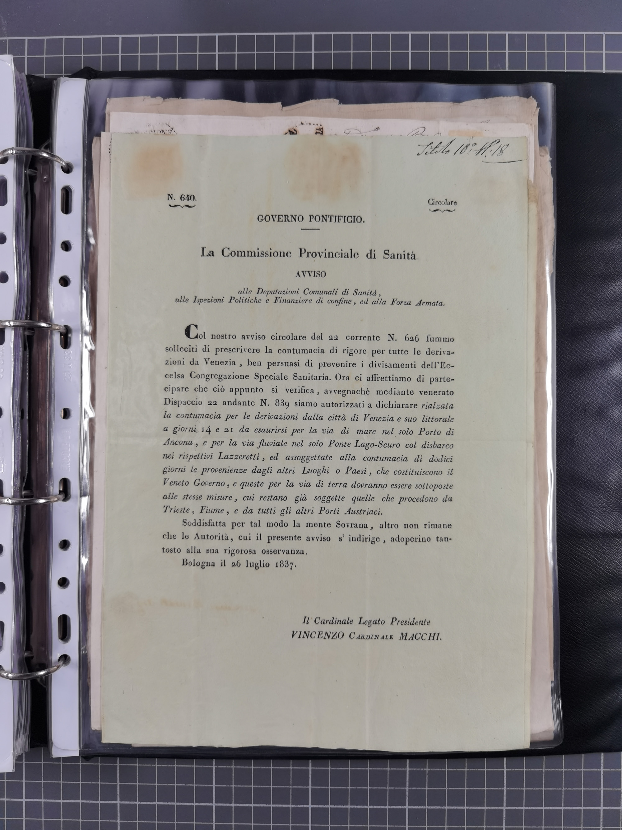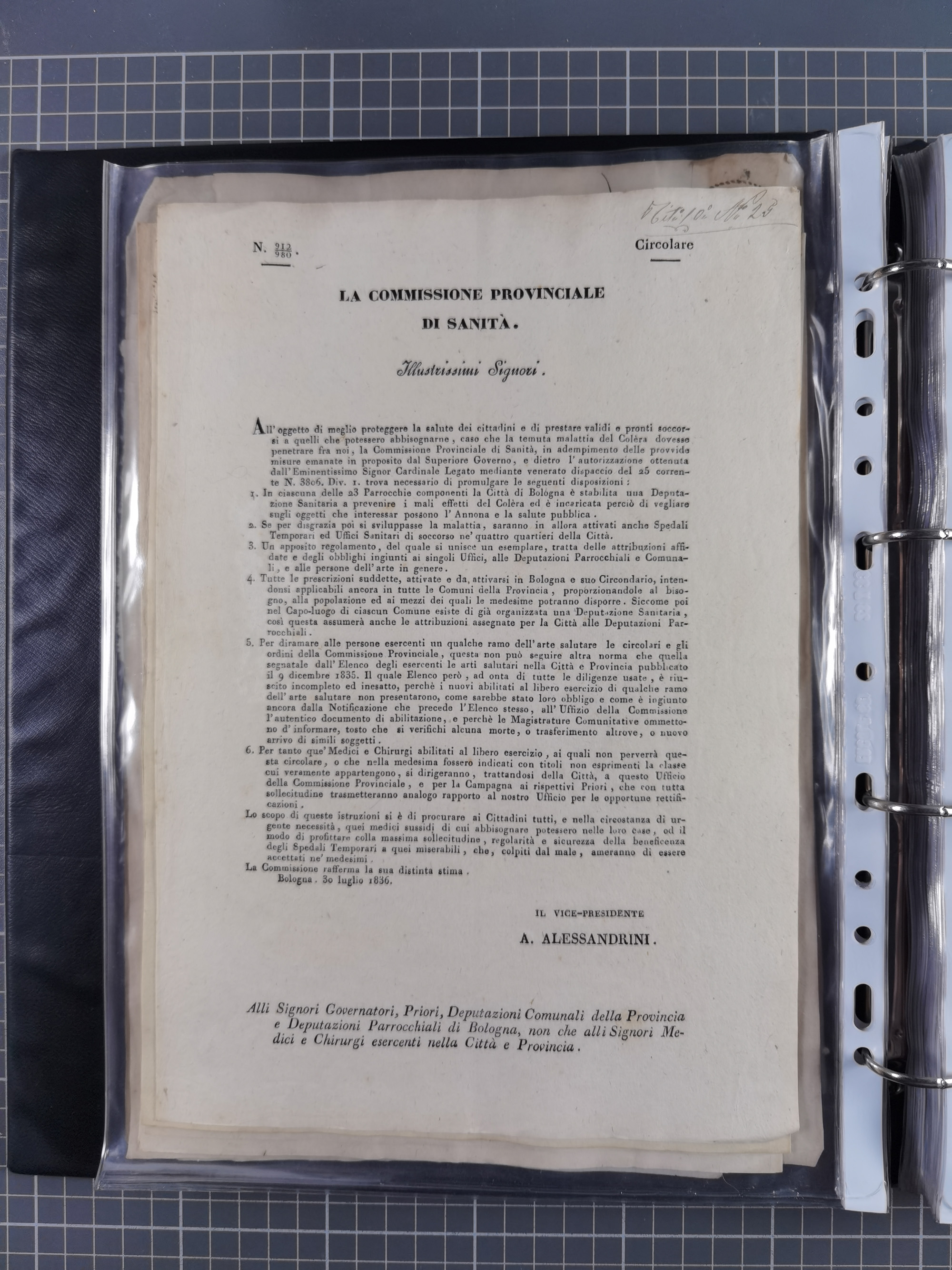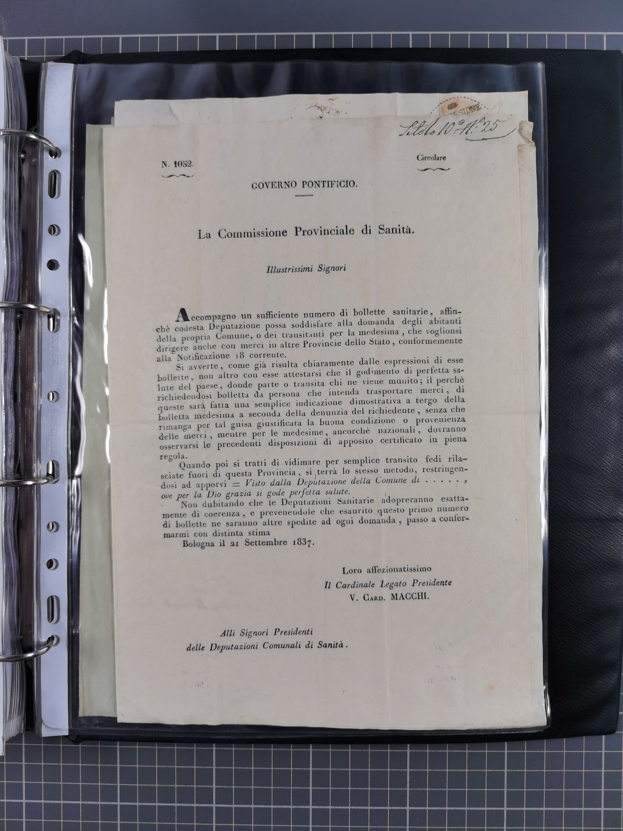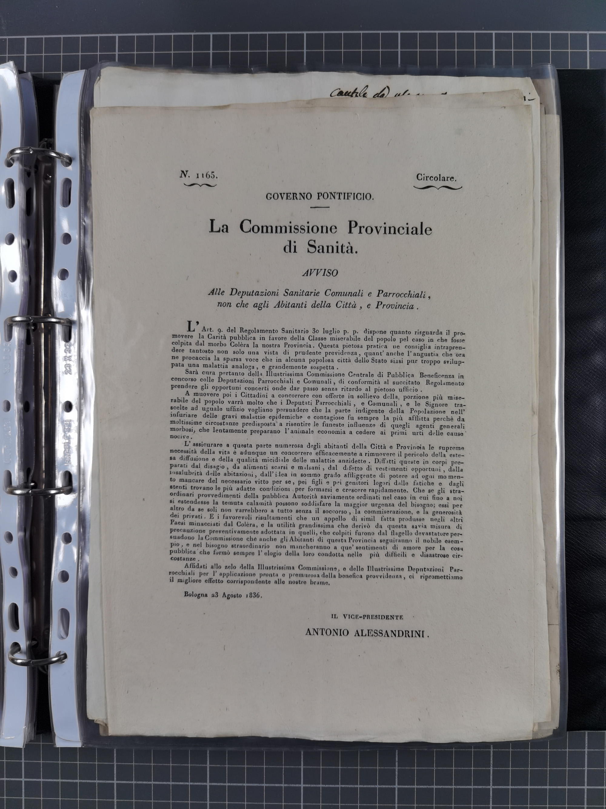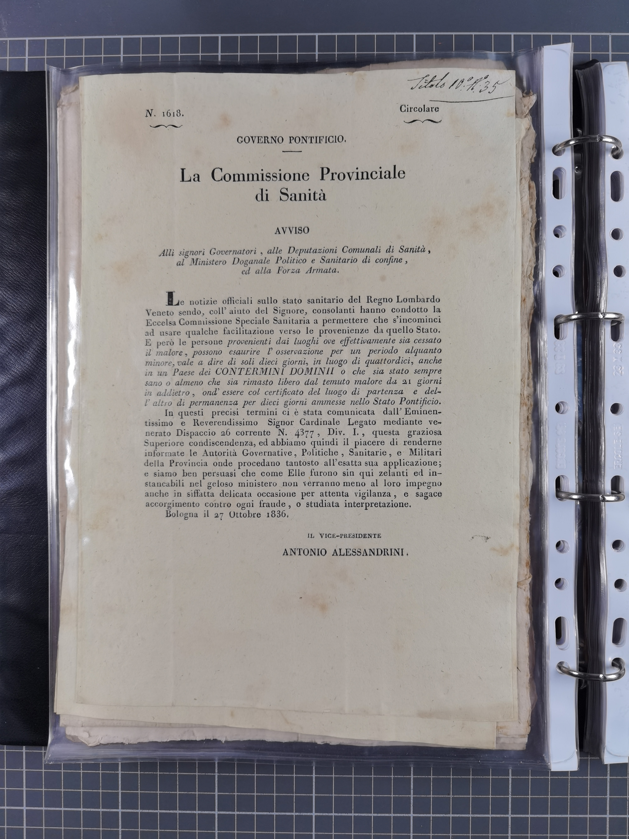 KIRCHENSTAAT: 1835/37, Sammlung von über 80 Dokumenten und Briefen zu den päpstlichen Sanitätszirkularen “Circolare di Sanità” während der Cholera-Gefahr, mit amtlichen Anweisungen zu Quarantäne, Desinfektion und Gesundheitskontrollen an lokale Behörden. Umfangreiche Dokumentation, in zwei Alben