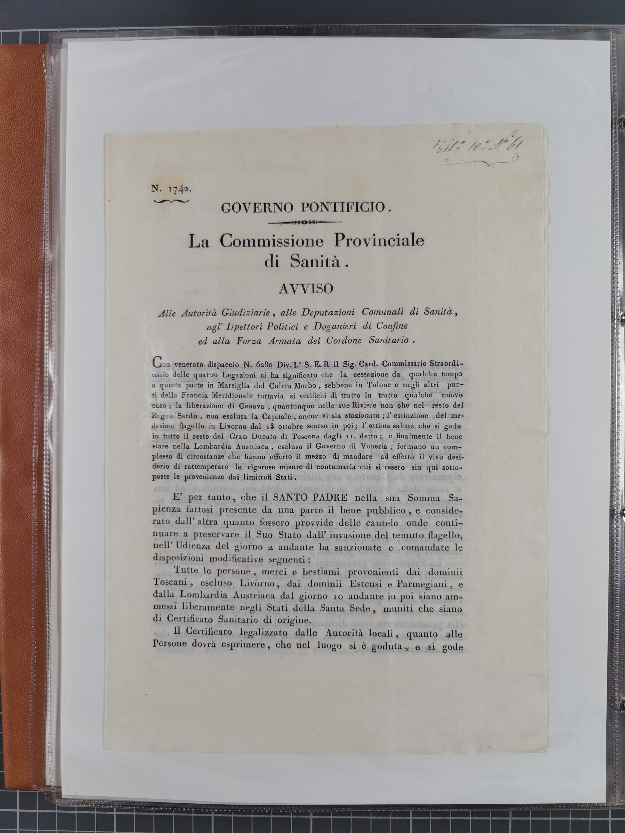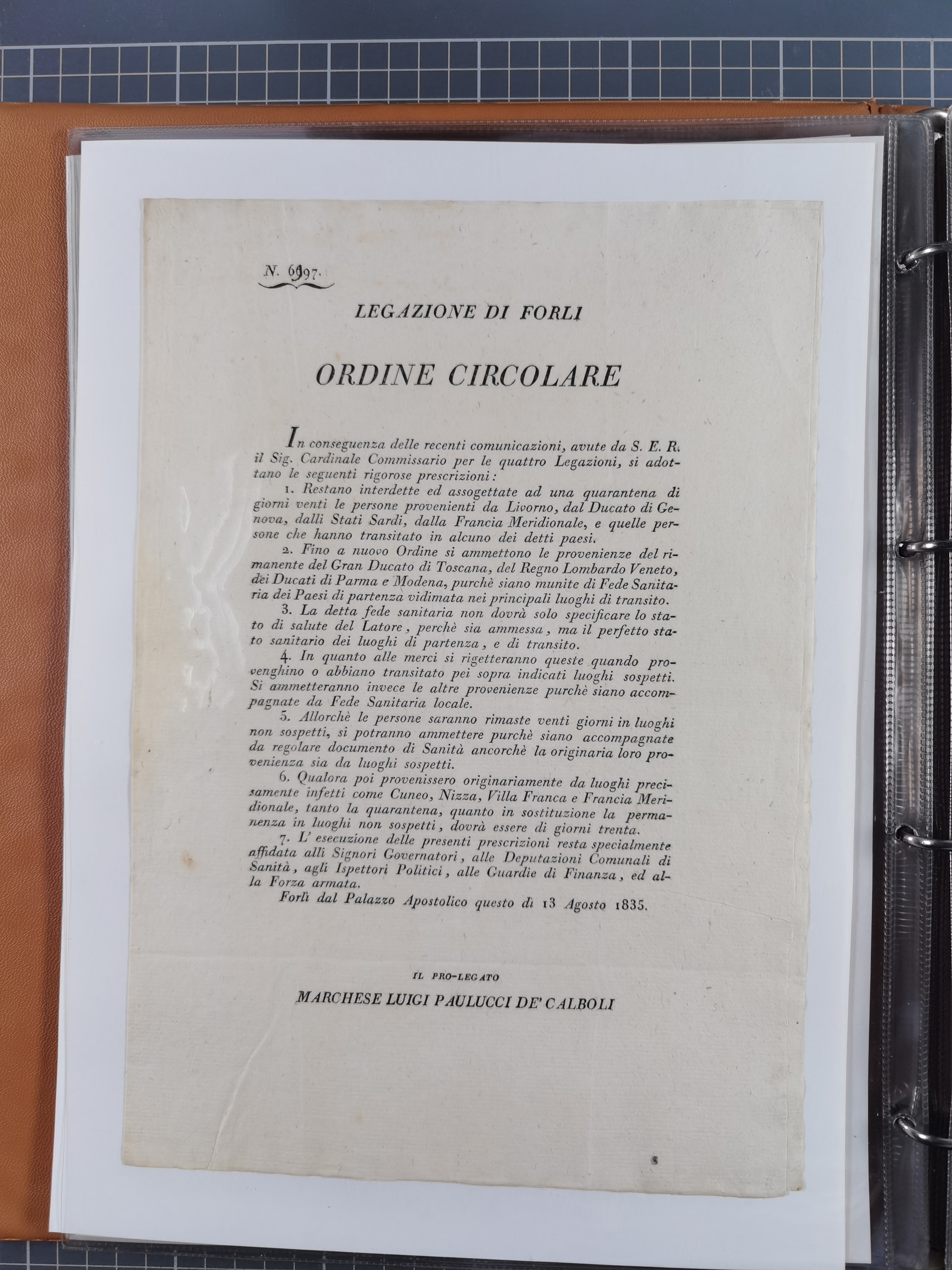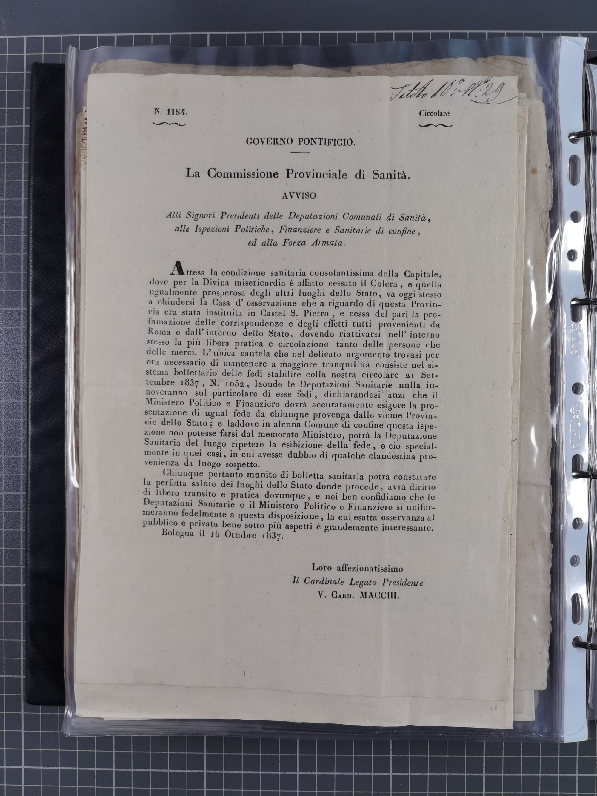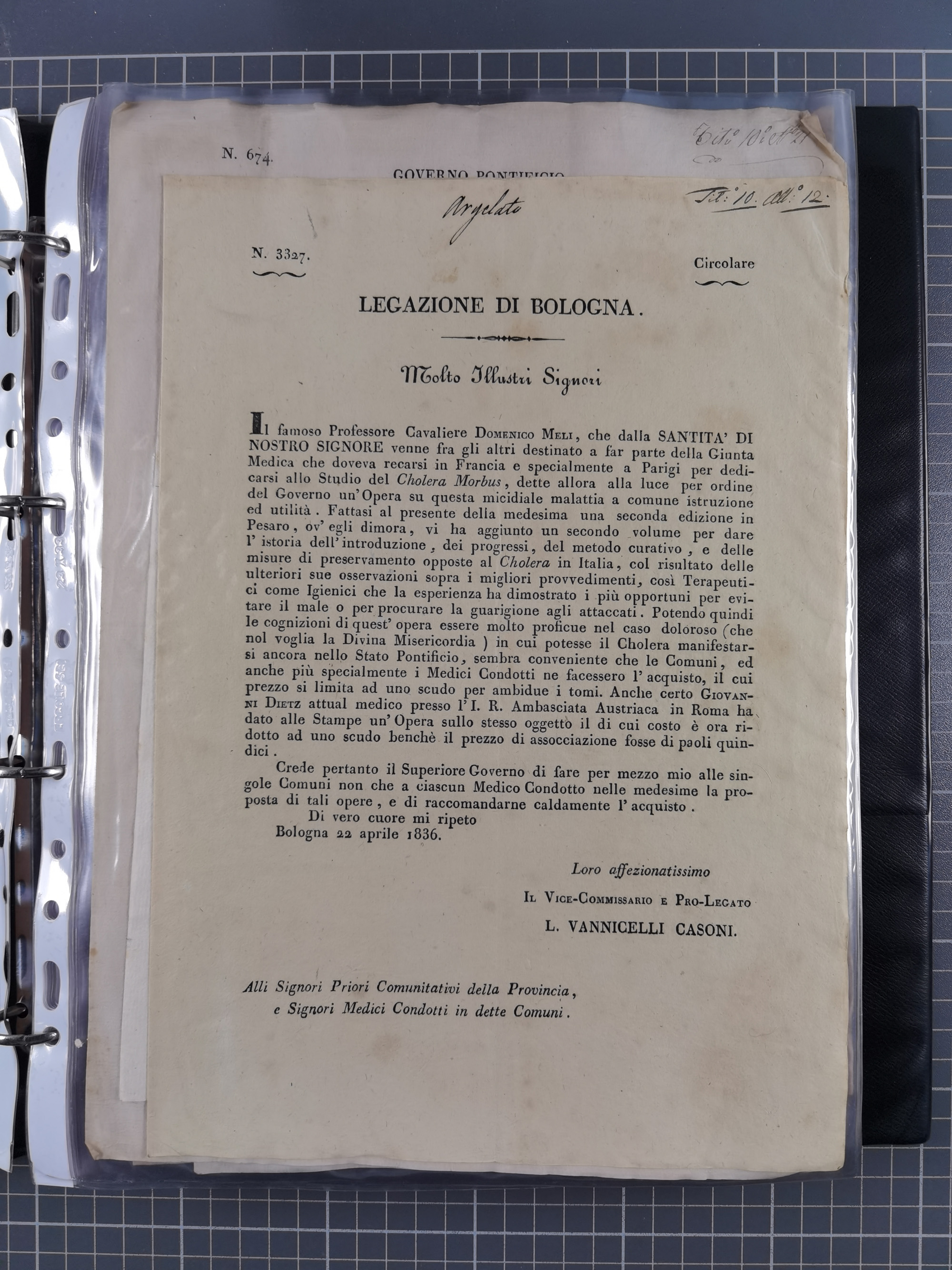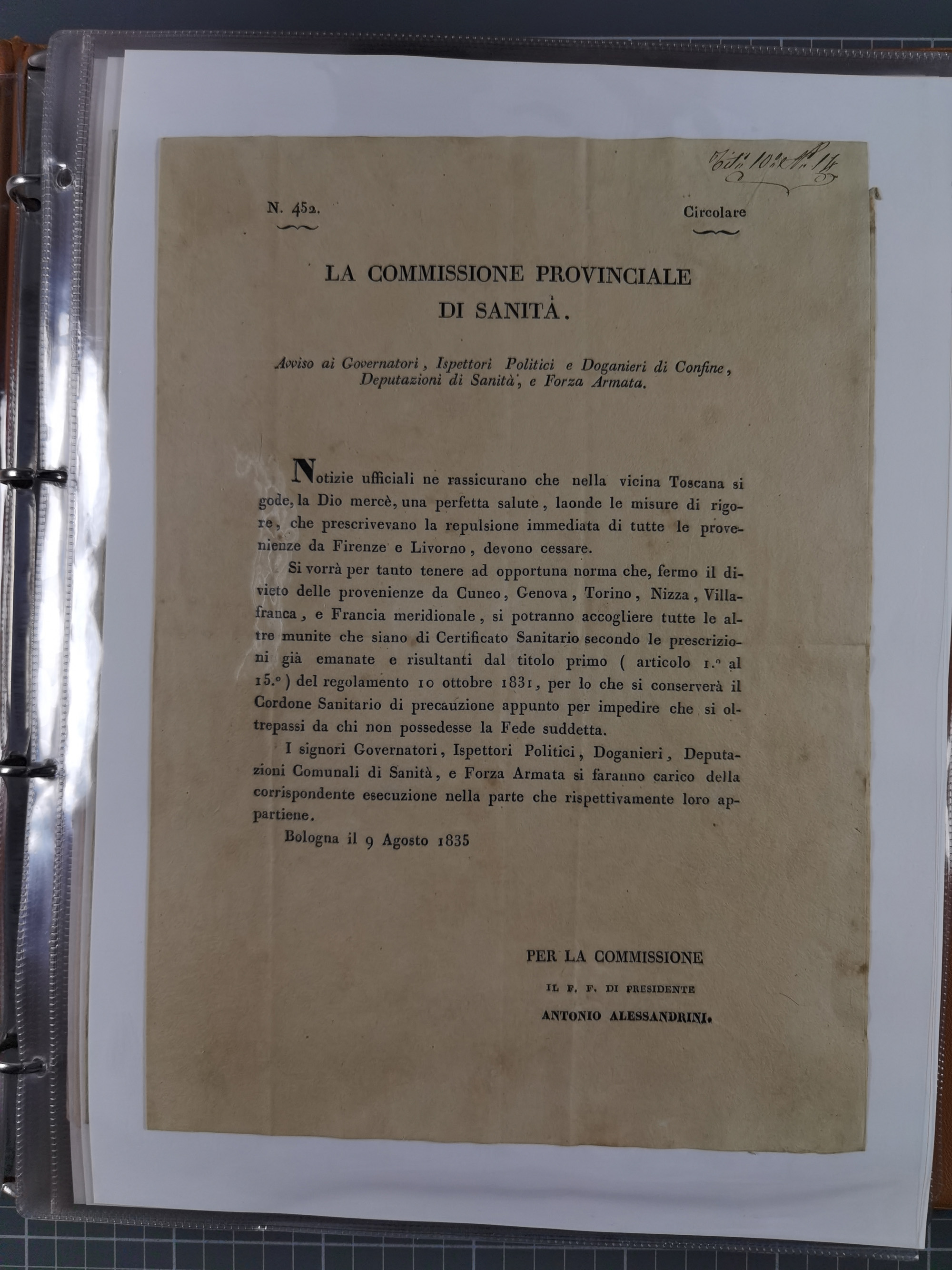 KIRCHENSTAAT: 1835/37, Sammlung von über 80 Dokumenten und Briefen zu den päpstlichen Sanitätszirkularen “Circolare di Sanità” während der Cholera-Gefahr, mit amtlichen Anweisungen zu Quarantäne, Desinfektion und Gesundheitskontrollen an lokale Behörden. Umfangreiche Dokumentation, in zwei Alben