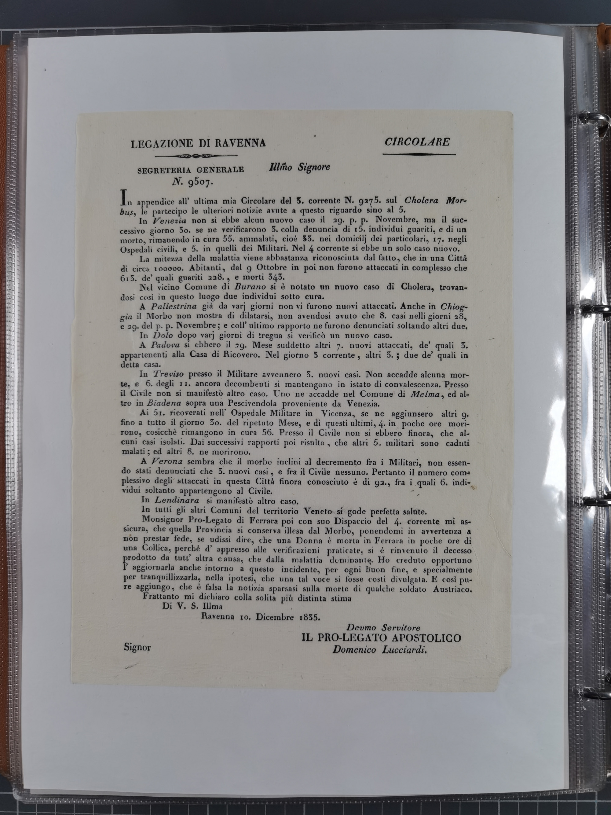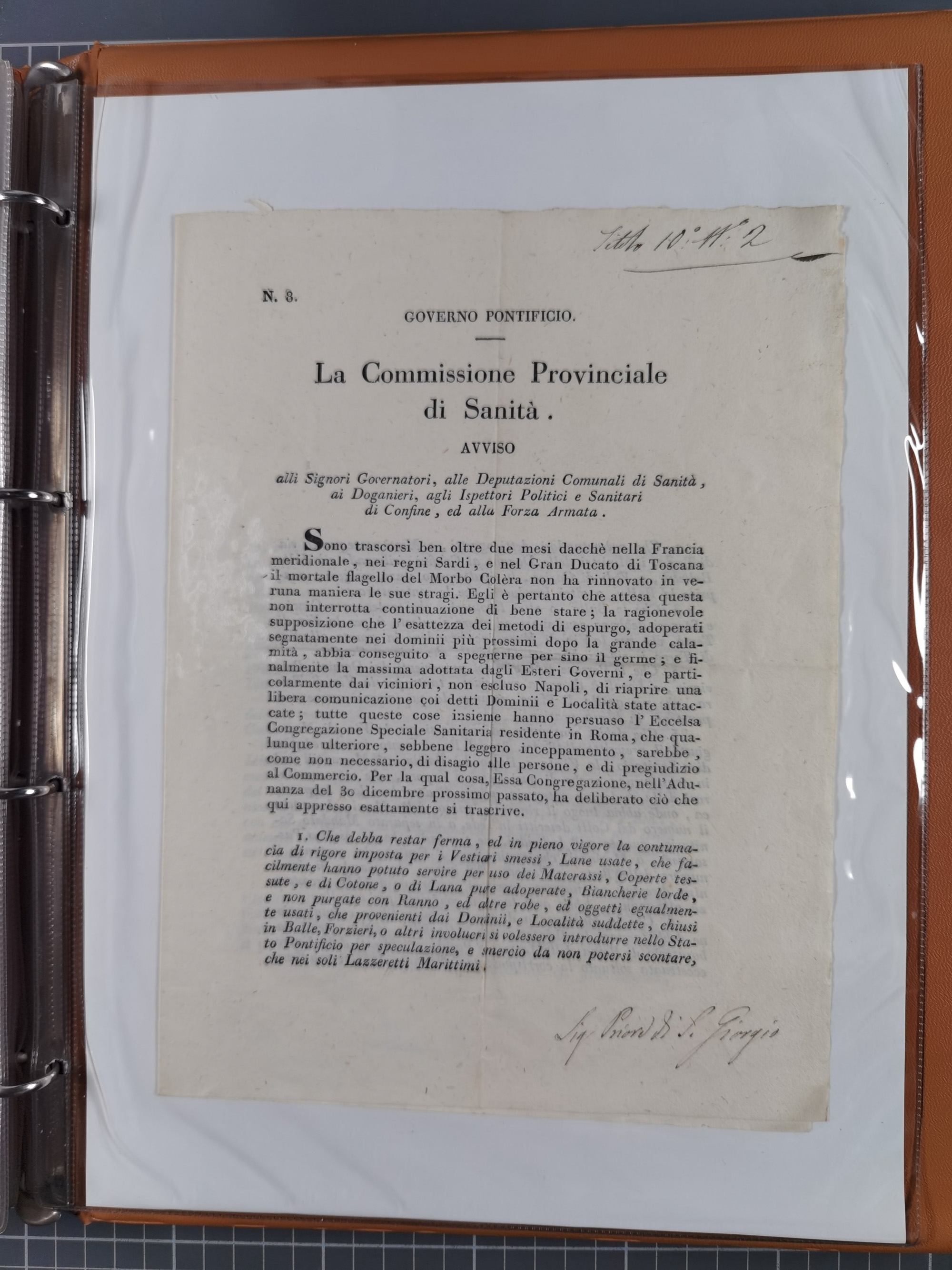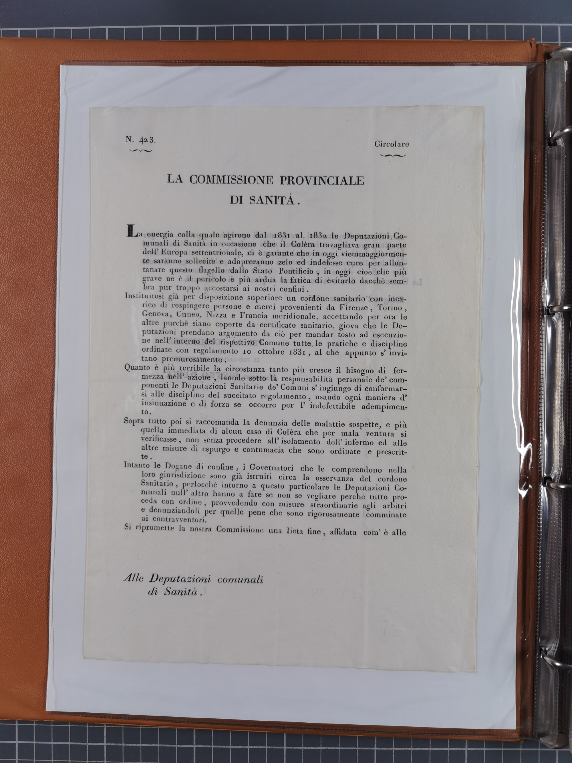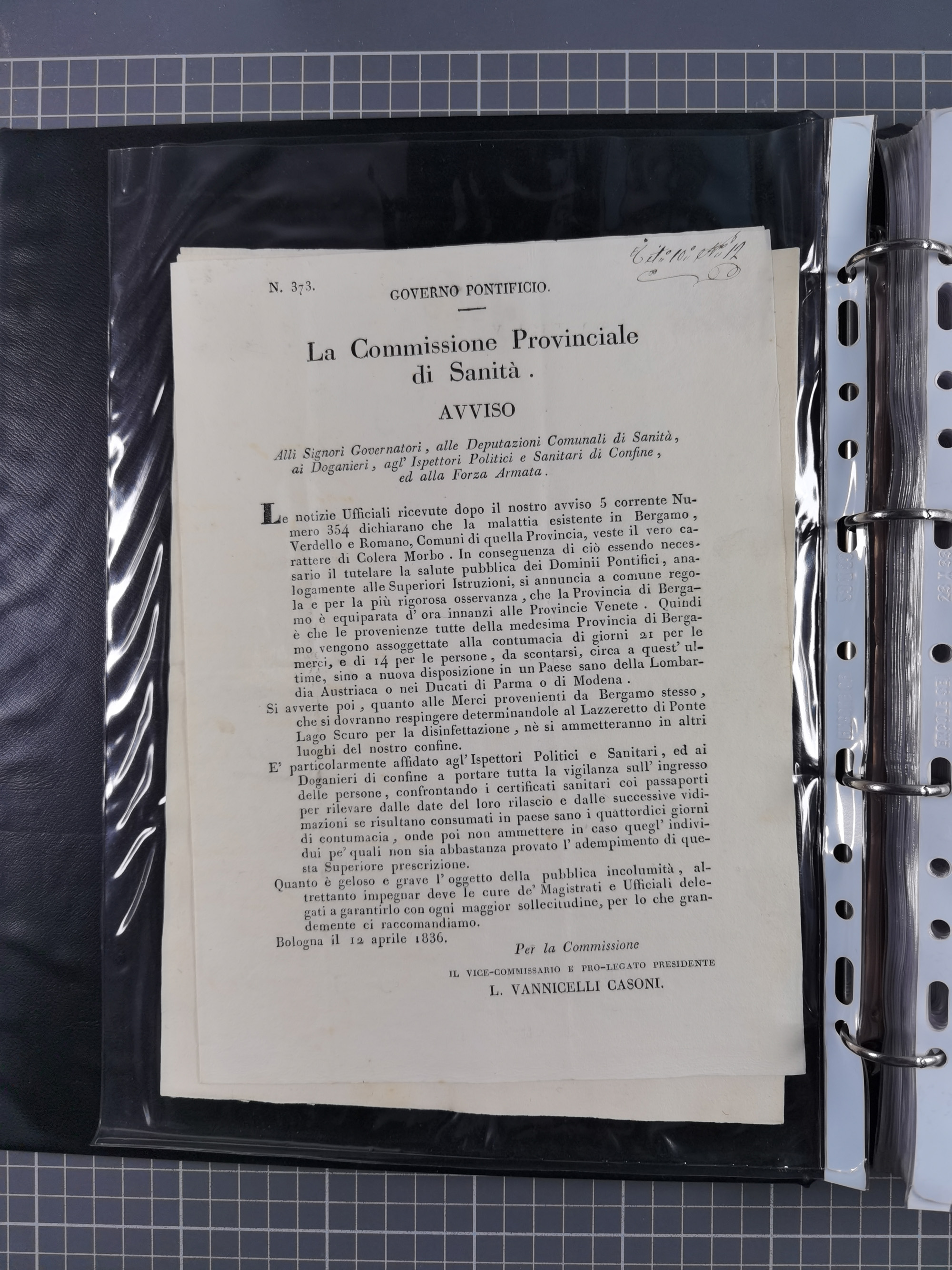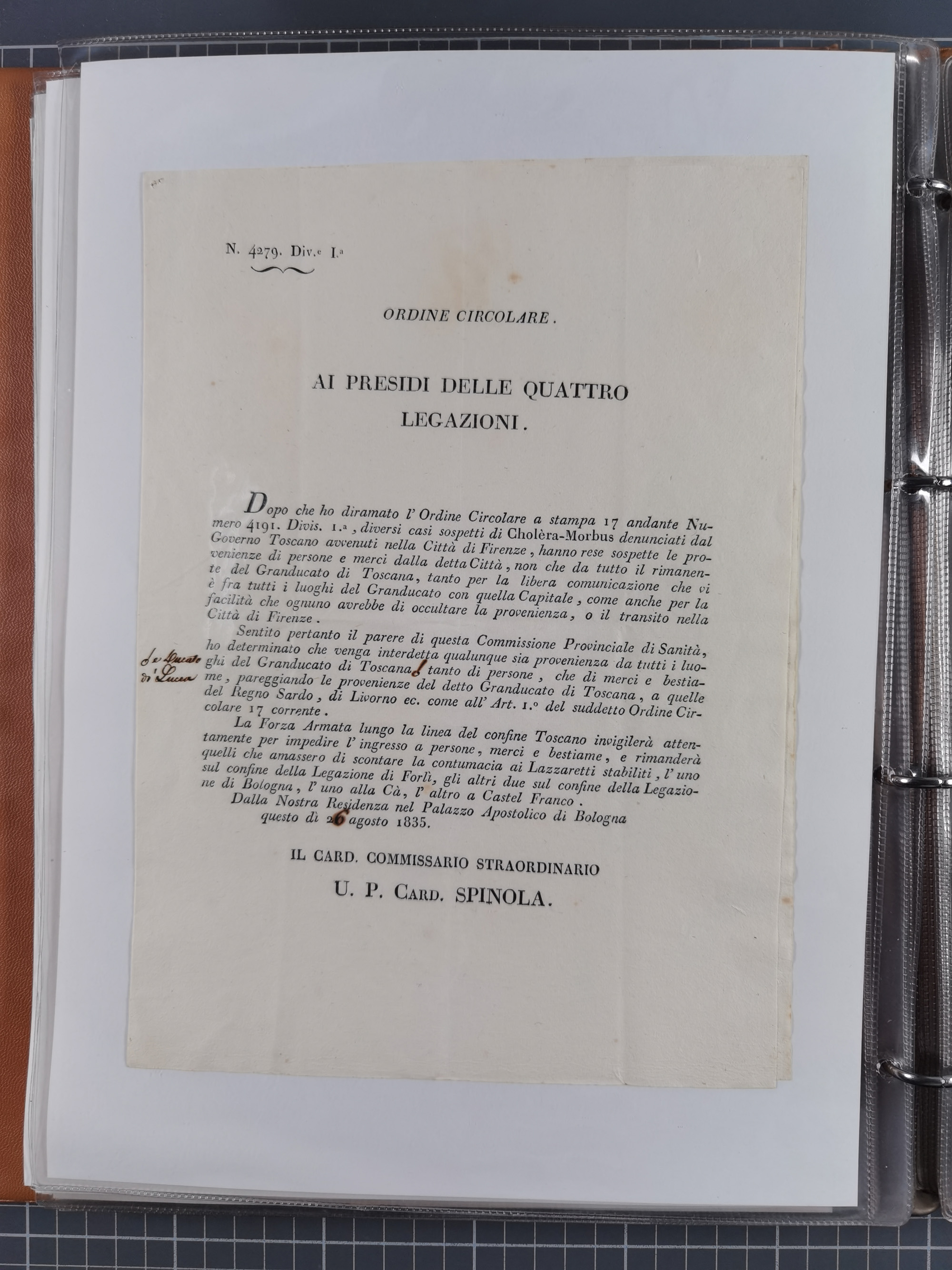 KIRCHENSTAAT: 1835/37, Sammlung von über 80 Dokumenten und Briefen zu den päpstlichen Sanitätszirkularen “Circolare di Sanità” während der Cholera-Gefahr, mit amtlichen Anweisungen zu Quarantäne, Desinfektion und Gesundheitskontrollen an lokale Behörden. Umfangreiche Dokumentation, in zwei Alben