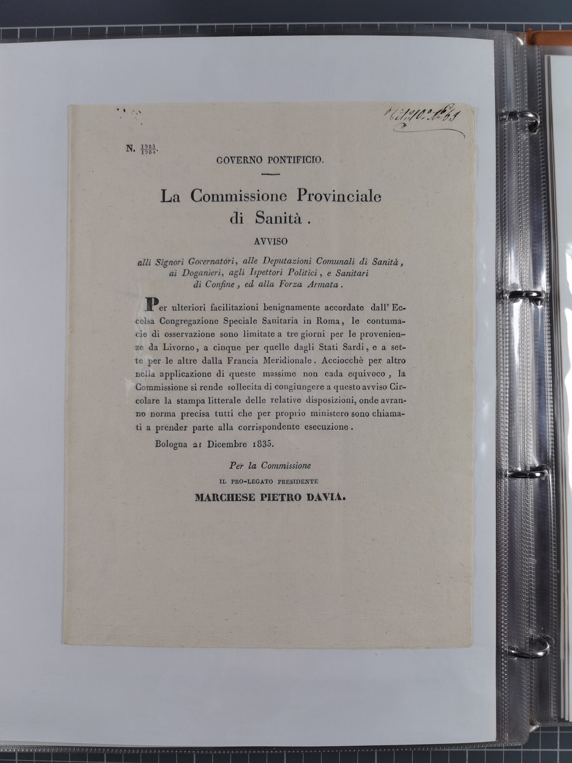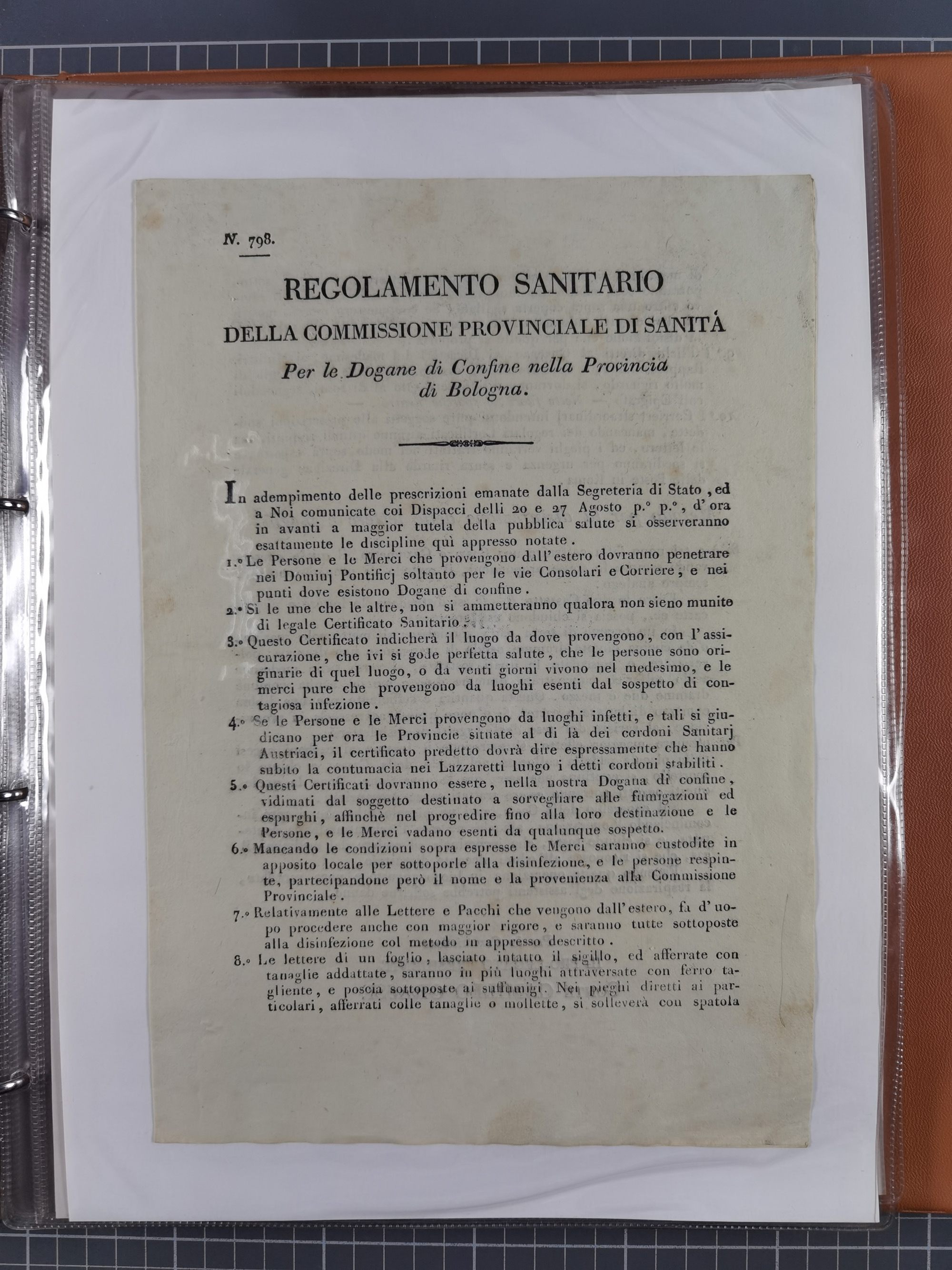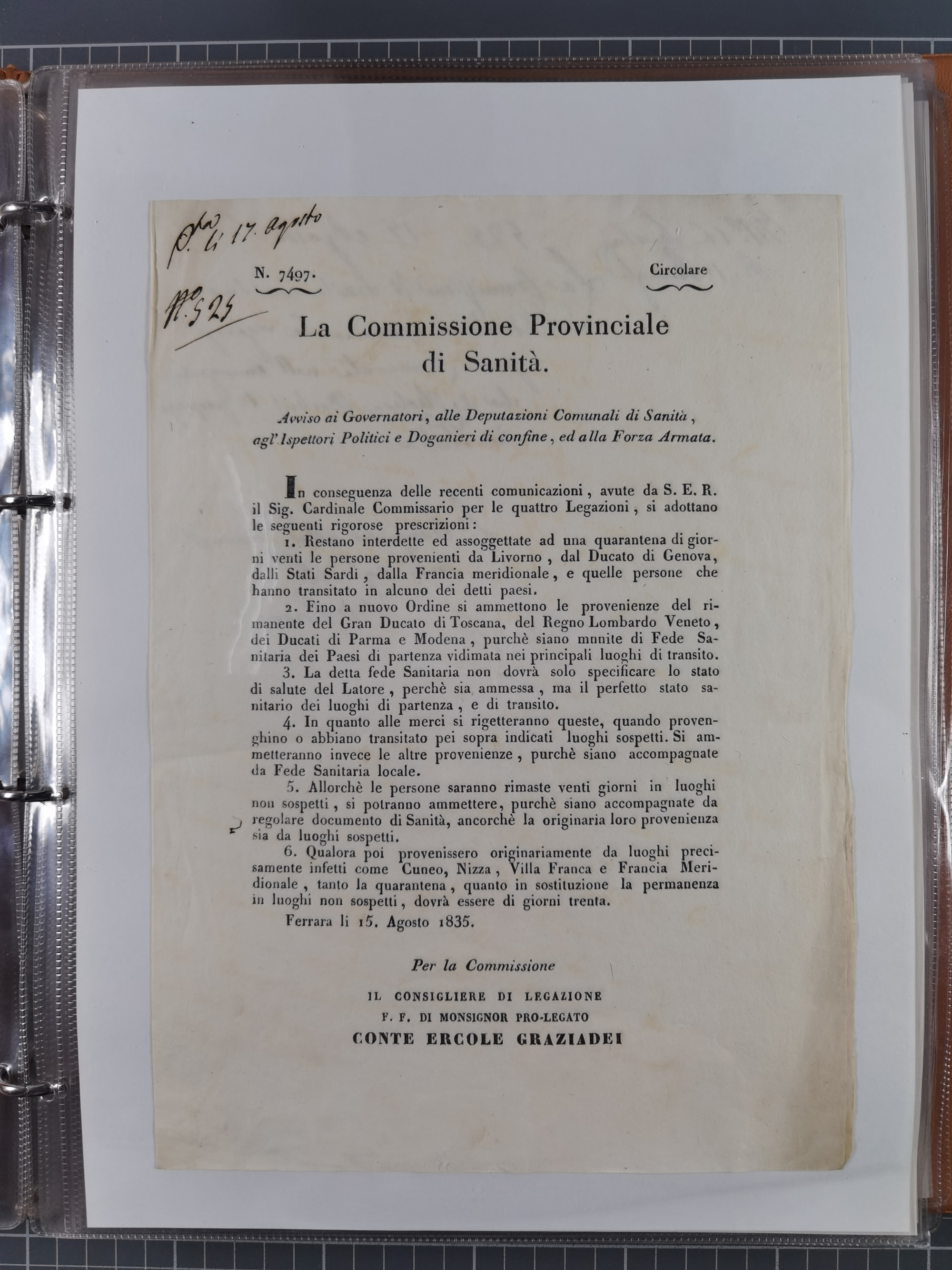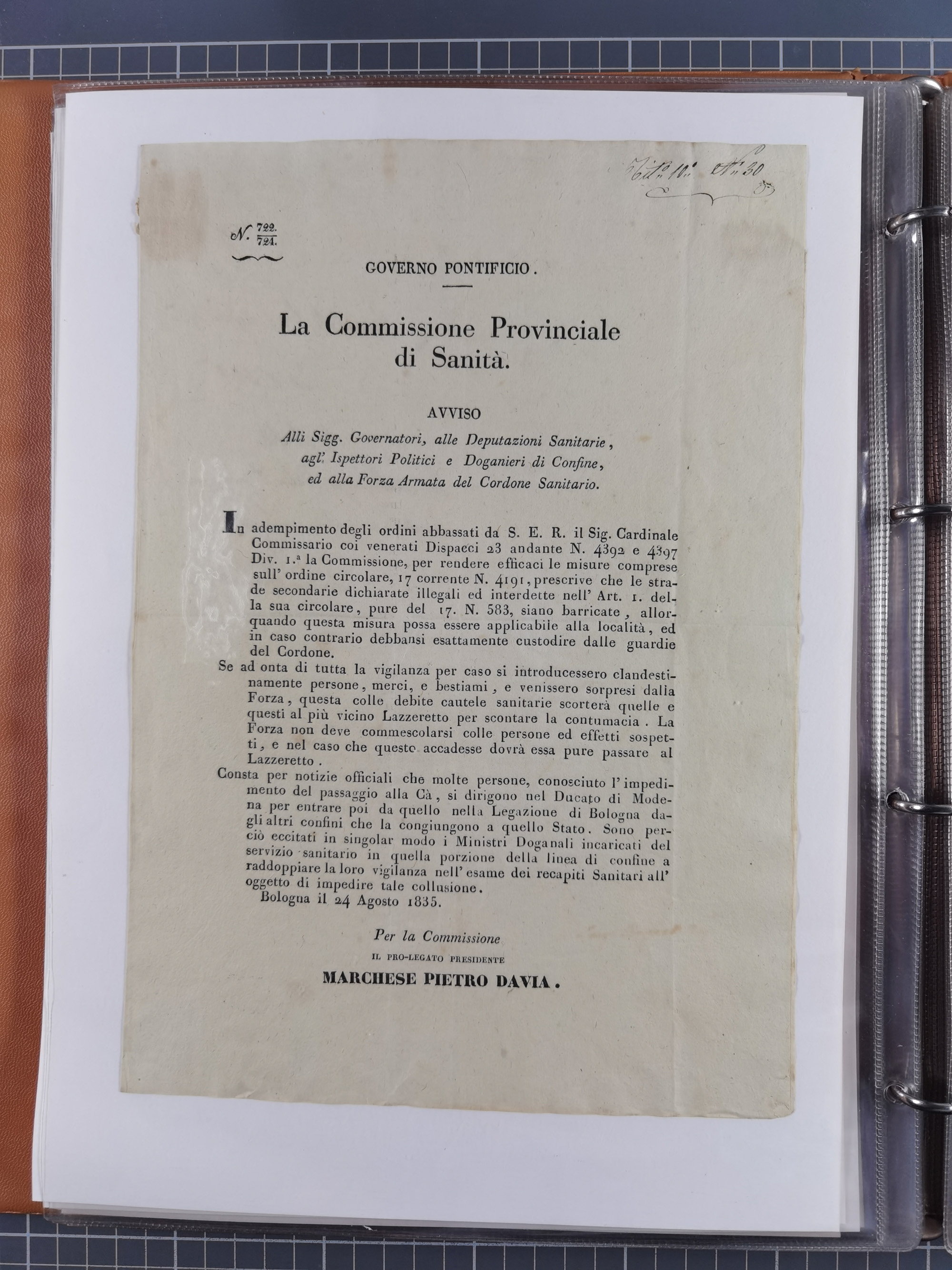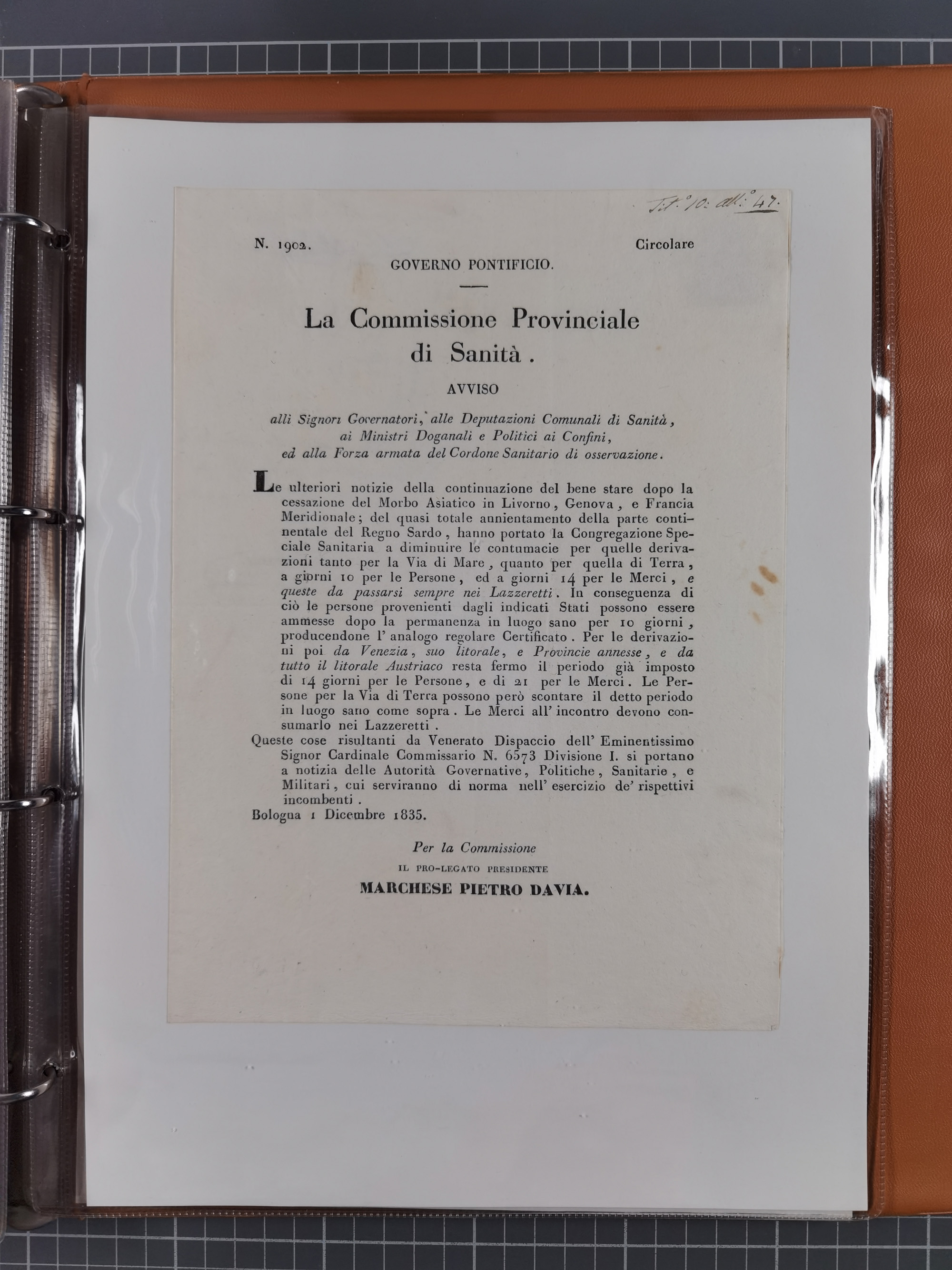 KIRCHENSTAAT: 1835/37, Sammlung von über 80 Dokumenten und Briefen zu den päpstlichen Sanitätszirkularen “Circolare di Sanità” während der Cholera-Gefahr, mit amtlichen Anweisungen zu Quarantäne, Desinfektion und Gesundheitskontrollen an lokale Behörden. Umfangreiche Dokumentation, in zwei Alben
