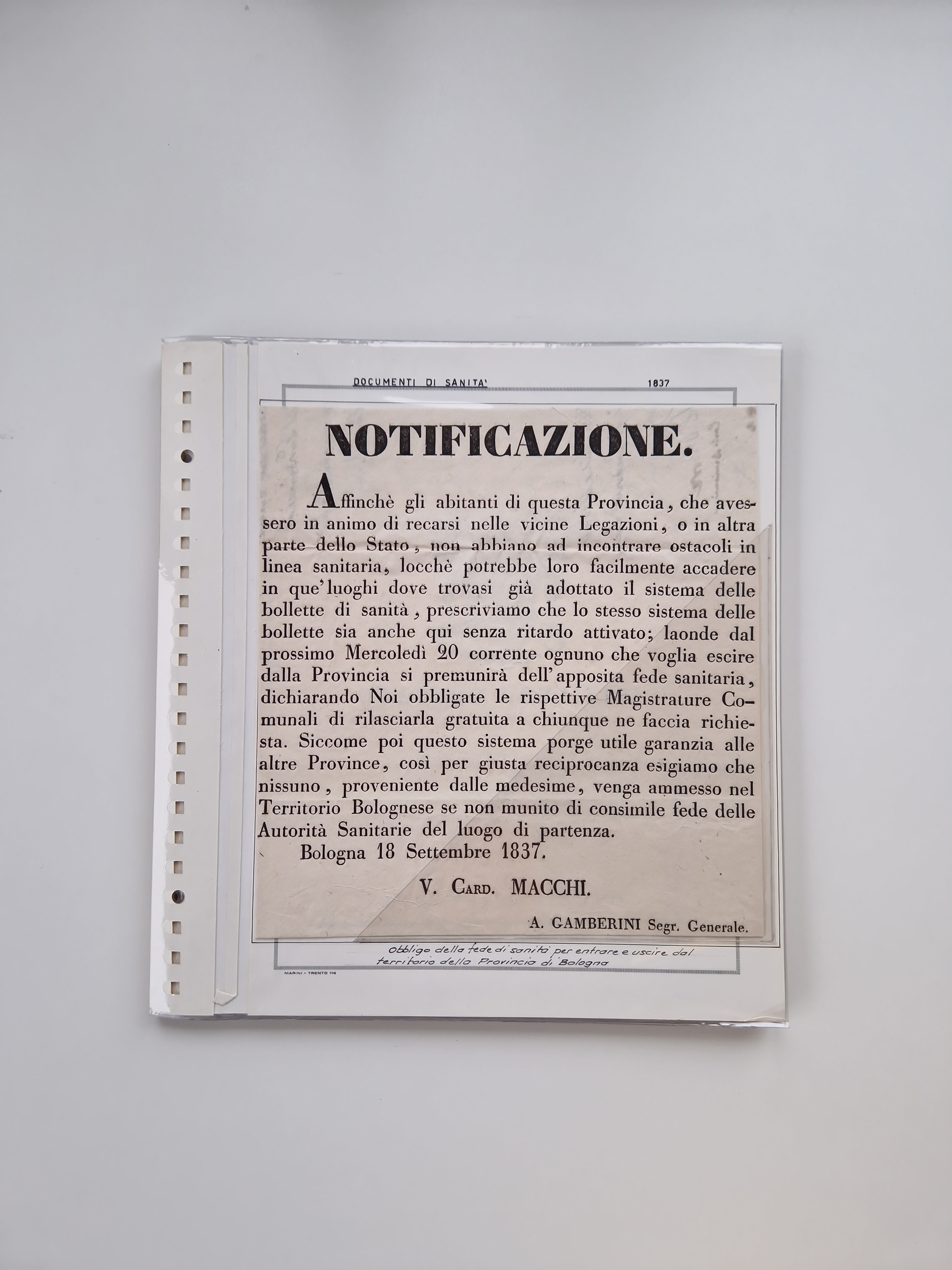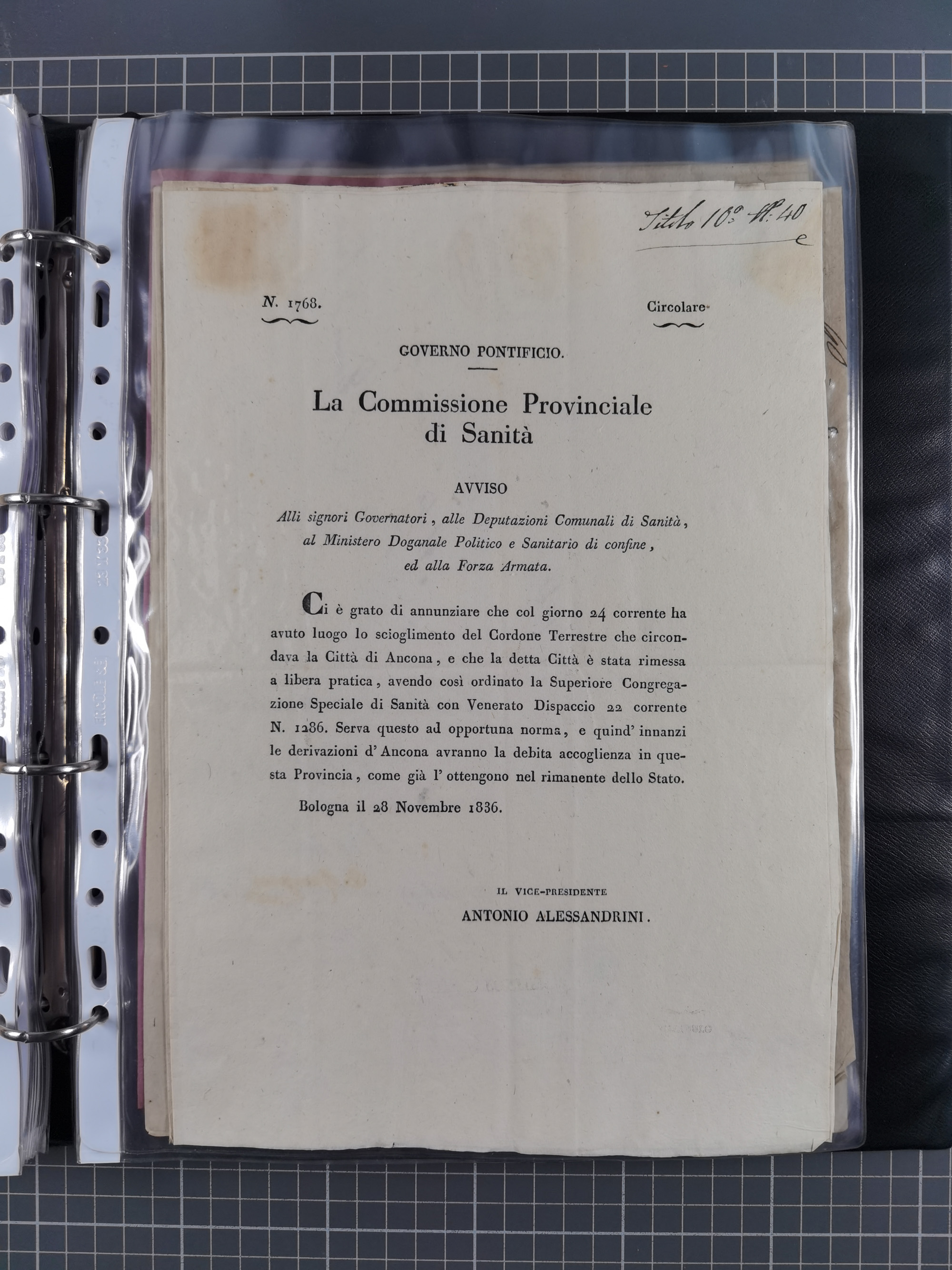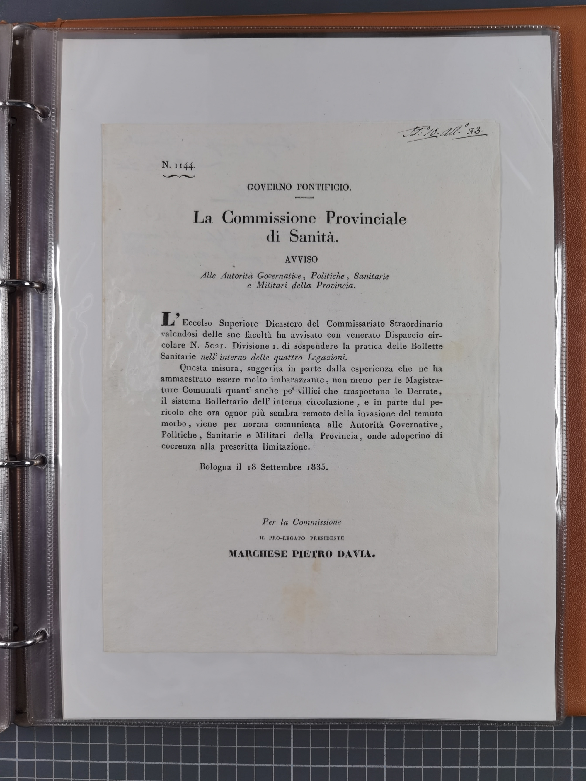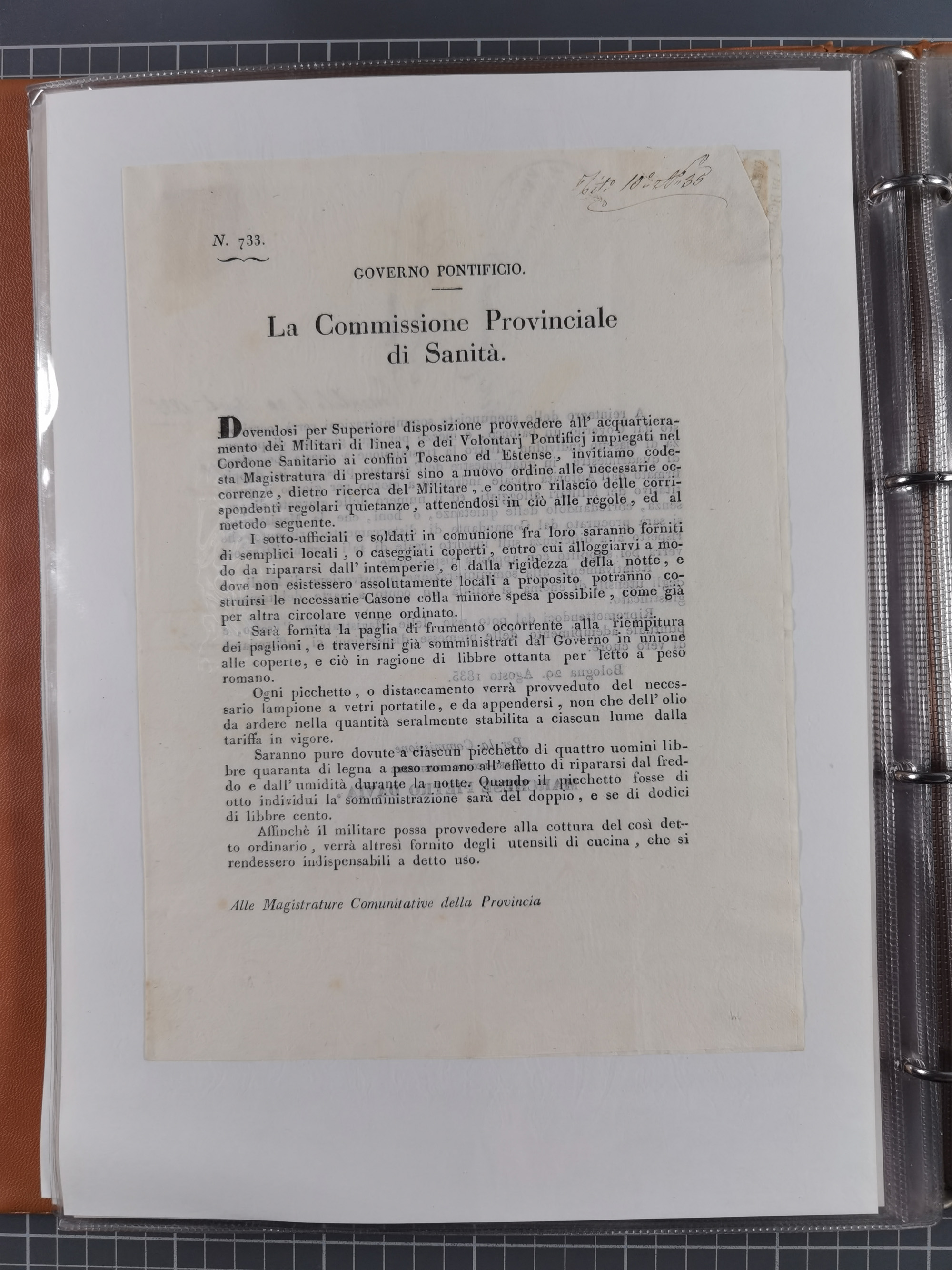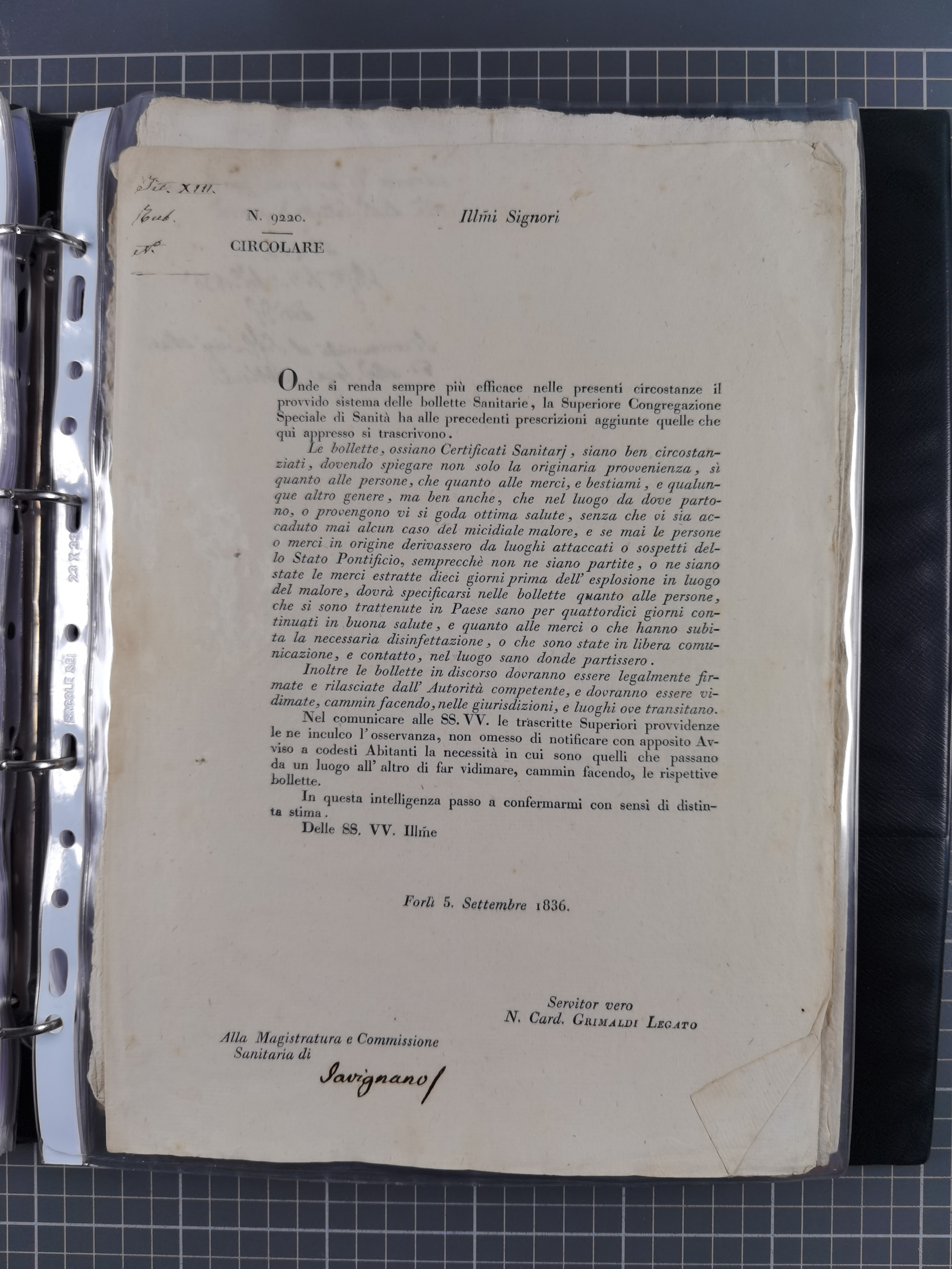 KIRCHENSTAAT: 1835/37, Sammlung von über 80 Dokumenten und Briefen zu den päpstlichen Sanitätszirkularen “Circolare di Sanità” während der Cholera-Gefahr, mit amtlichen Anweisungen zu Quarantäne, Desinfektion und Gesundheitskontrollen an lokale Behörden. Umfangreiche Dokumentation, in zwei Alben