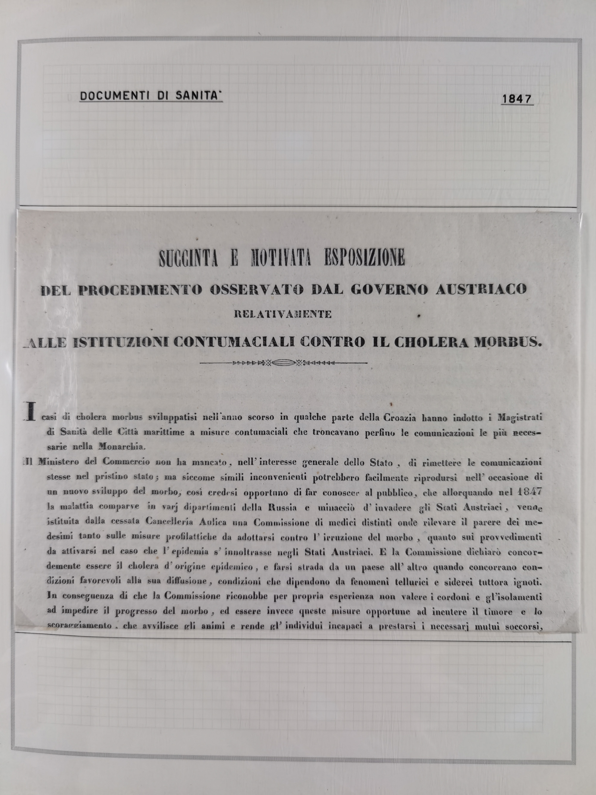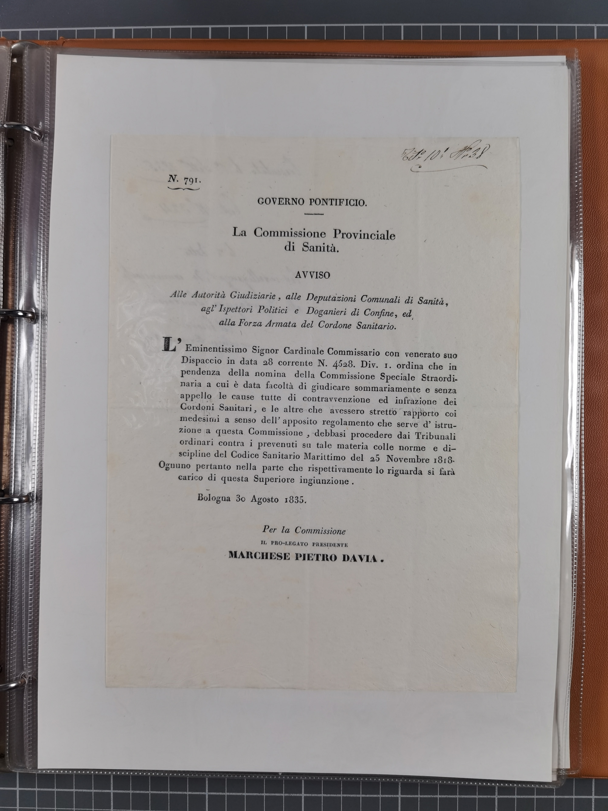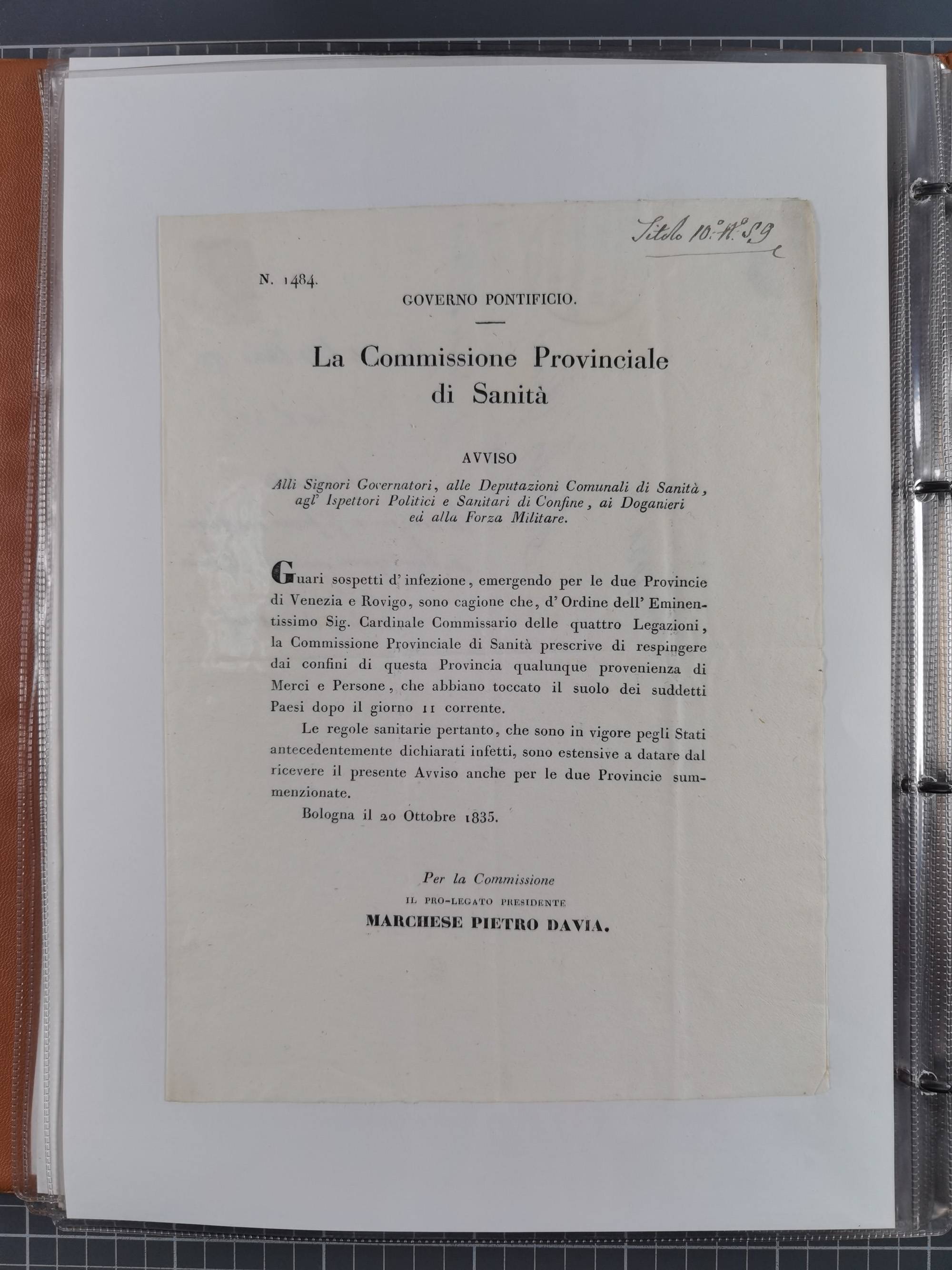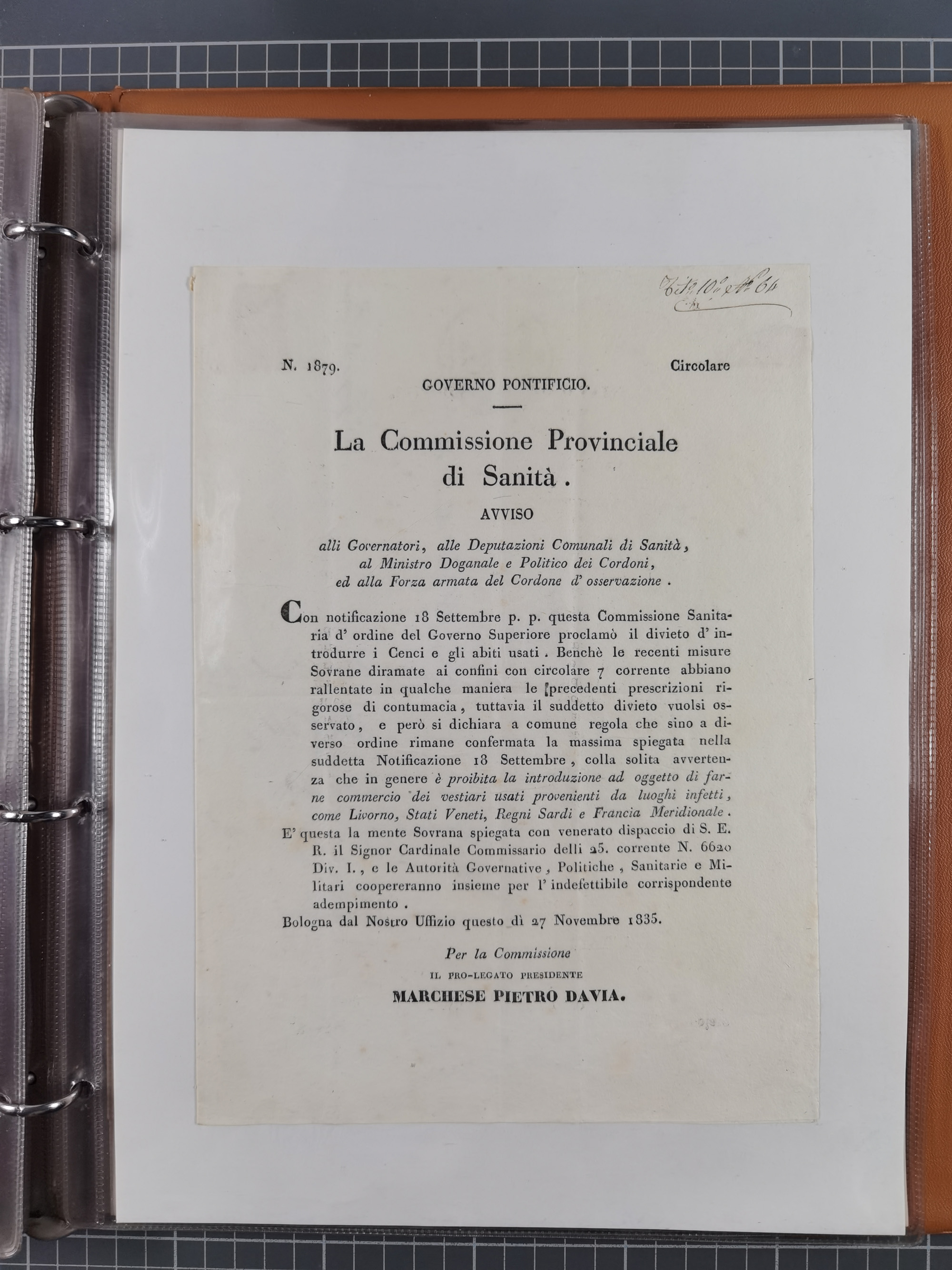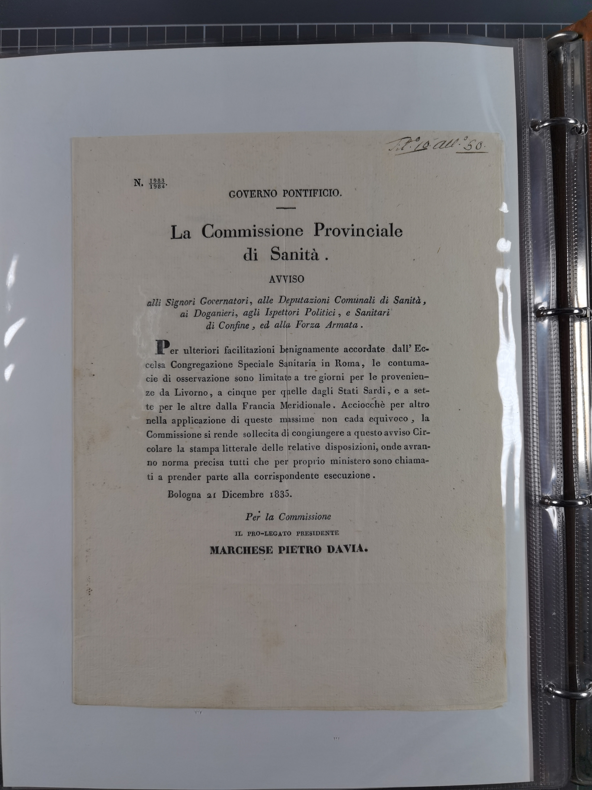 KIRCHENSTAAT: 1835/37, Sammlung von über 80 Dokumenten und Briefen zu den päpstlichen Sanitätszirkularen “Circolare di Sanità” während der Cholera-Gefahr, mit amtlichen Anweisungen zu Quarantäne, Desinfektion und Gesundheitskontrollen an lokale Behörden. Umfangreiche Dokumentation, in zwei Alben