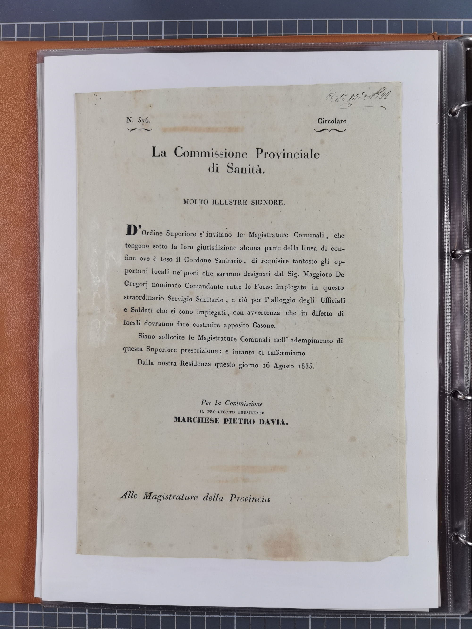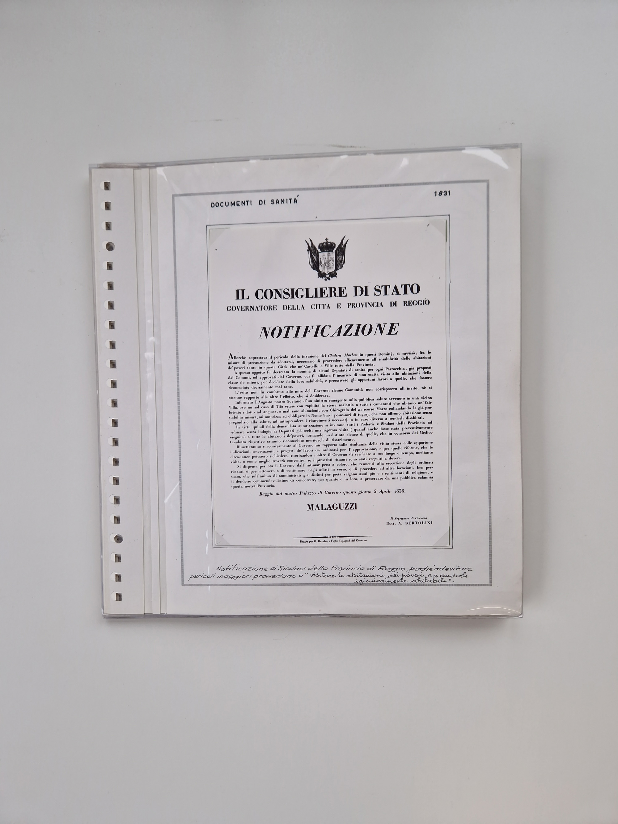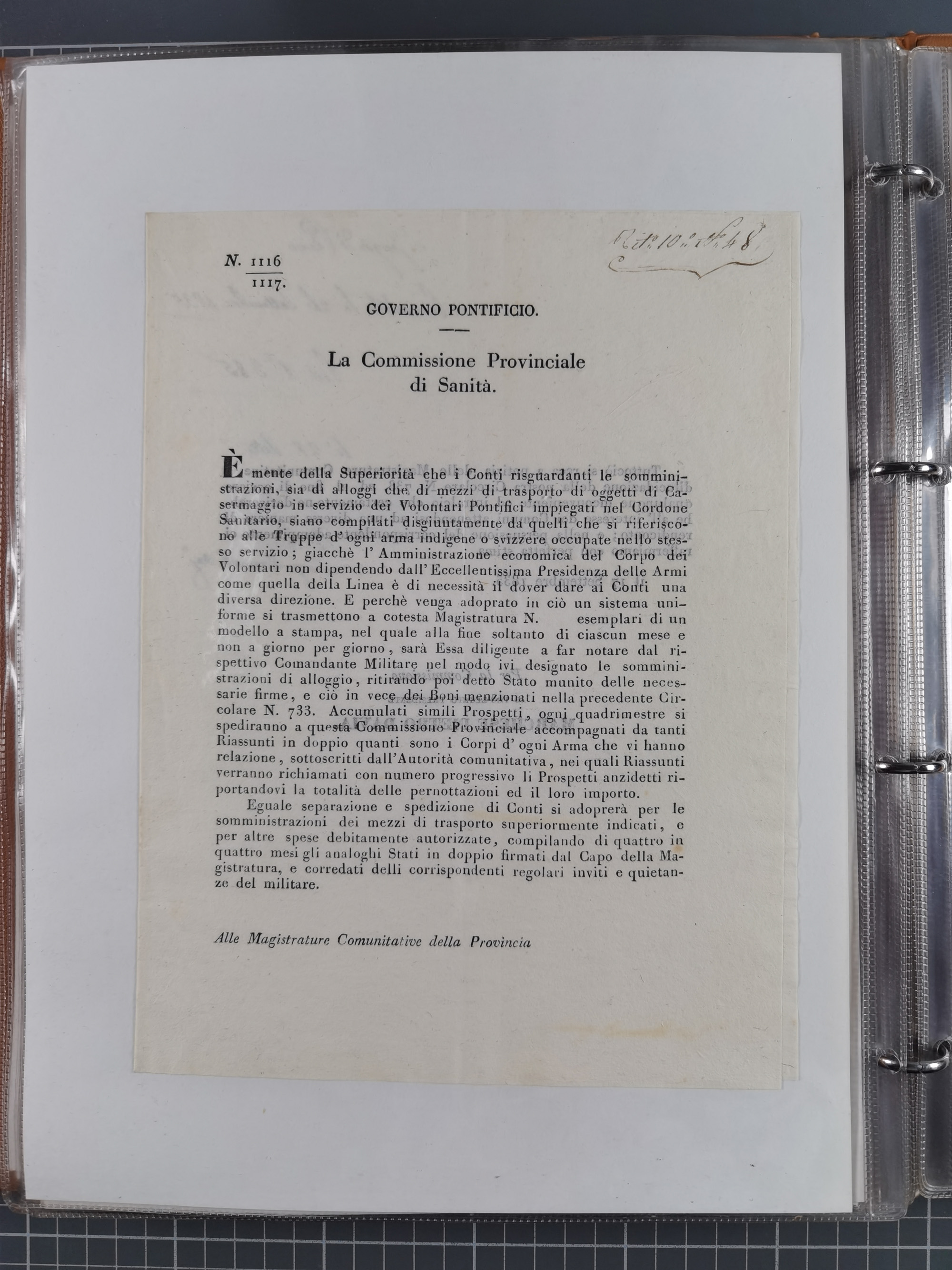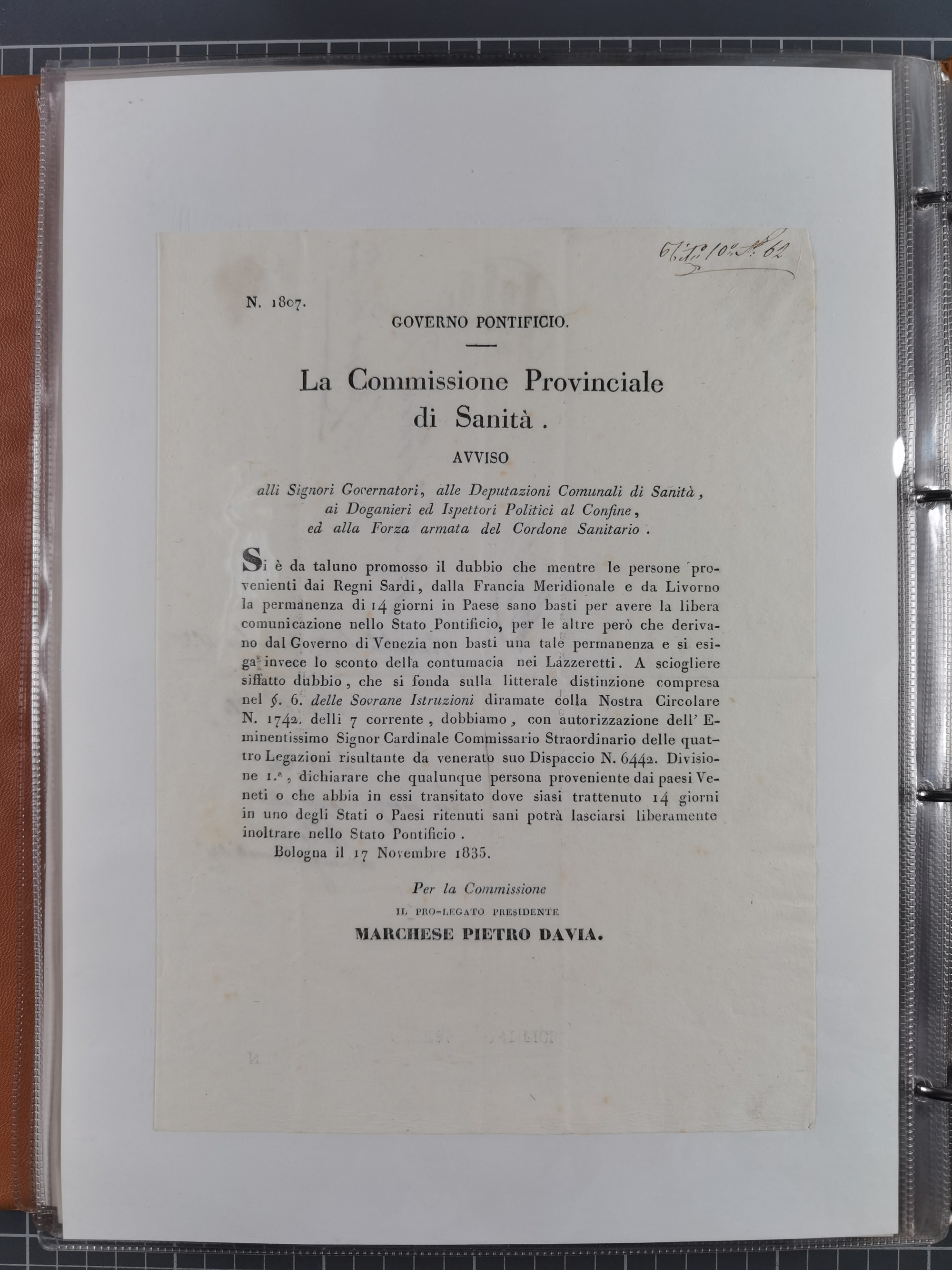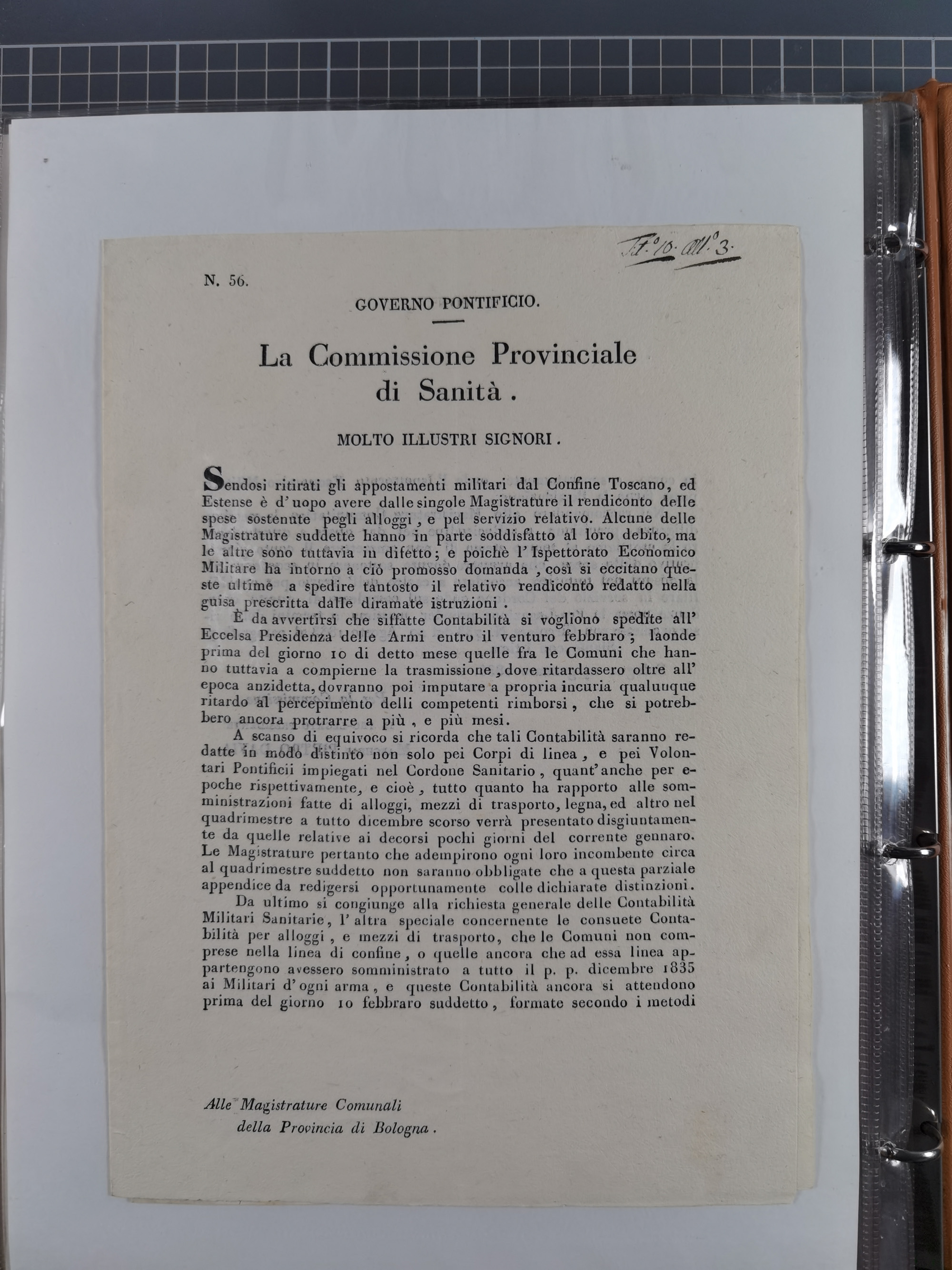KIRCHENSTAAT: 1835/37, Sammlung von über 80 Dokumenten und Briefen zu den päpstlichen Sanitätszirkularen “Circolare di Sanità” während der Cholera-Gefahr, mit amtlichen Anweisungen zu Quarantäne, Desinfektion und Gesundheitskontrollen an lokale Behörden. Umfangreiche Dokumentation, in zwei Alben