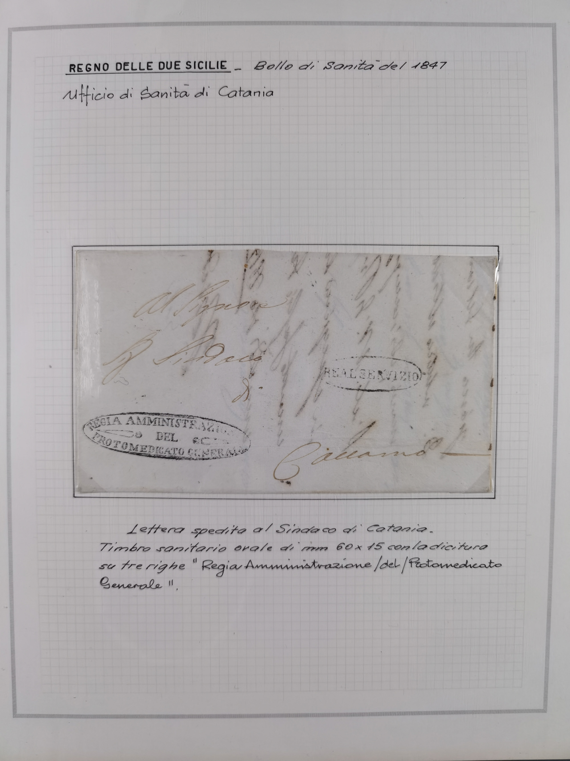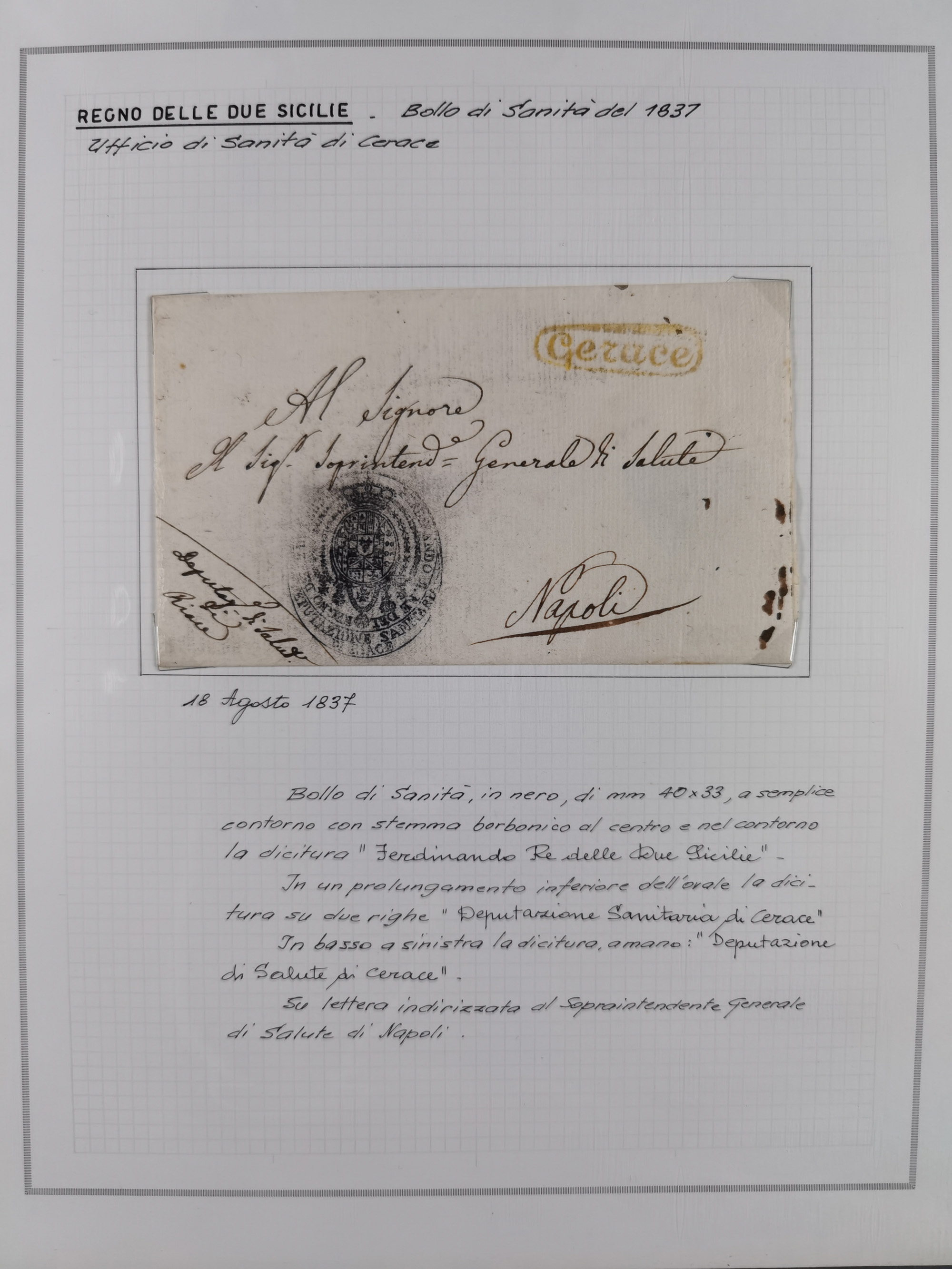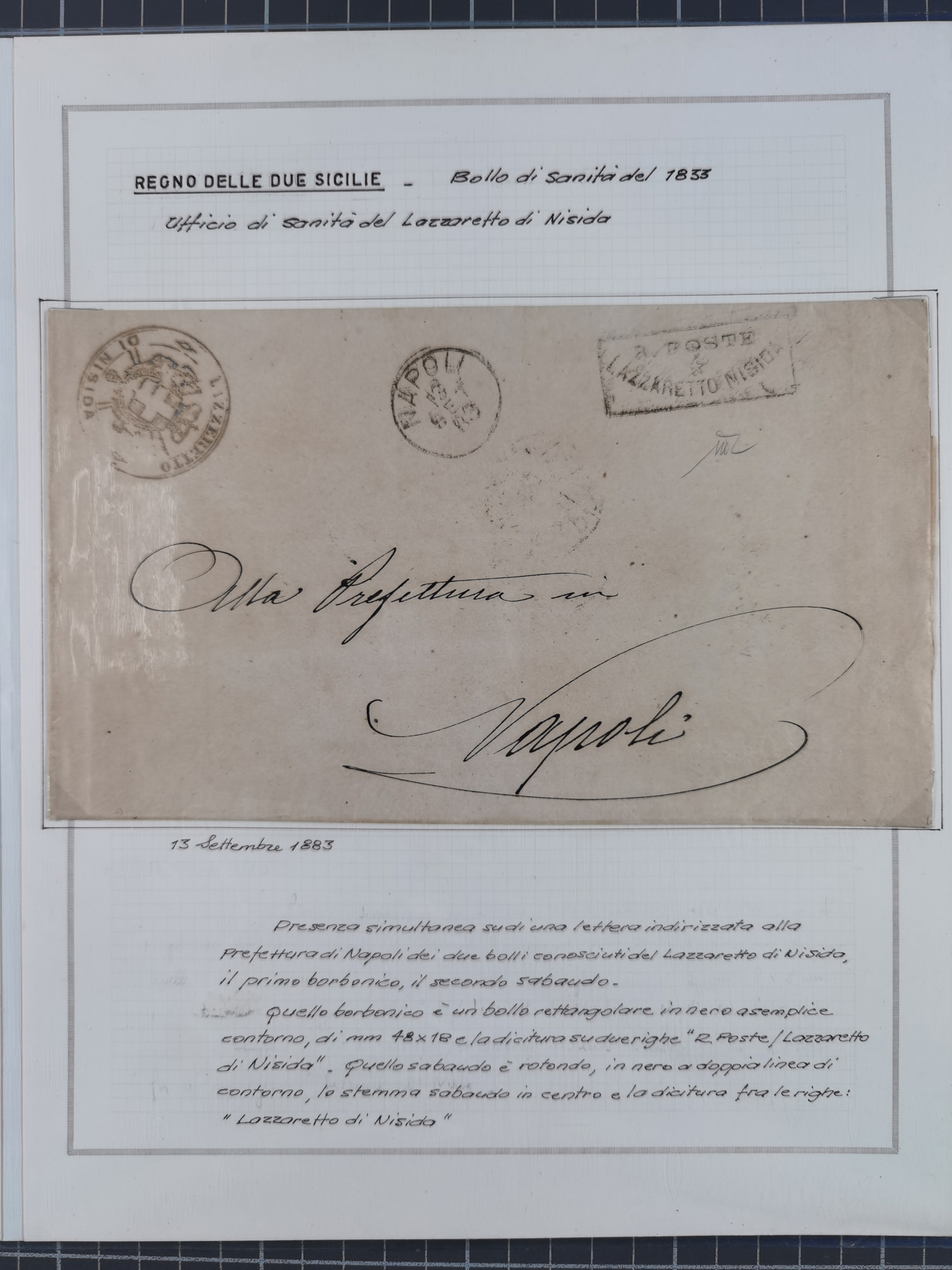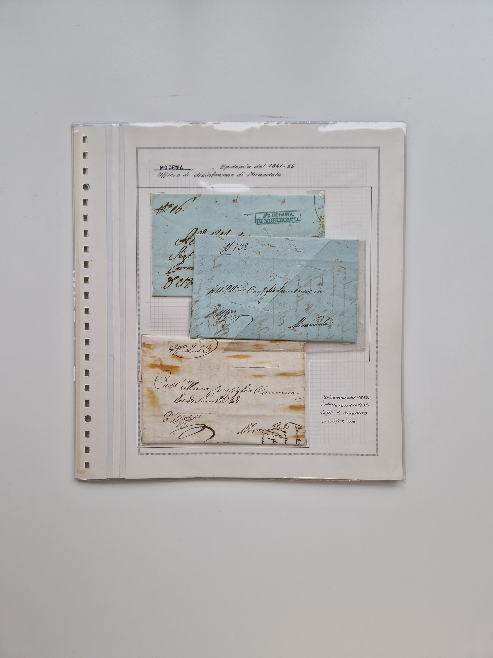 SIZILIEN: 1826/83, 26 Briefe und Dokumente beider Sizilien, dabei Liste illegaler Händler (Hebammen und Aderlassanbieter) im Bezirk Barletta, Briefe an und von Bürgermeistern und Gesundheitsbehörden und Ministern, verschiedene Stempel, etc., einige desinfiziert mit Räucherschlitzen, sauber beschrieben im Album