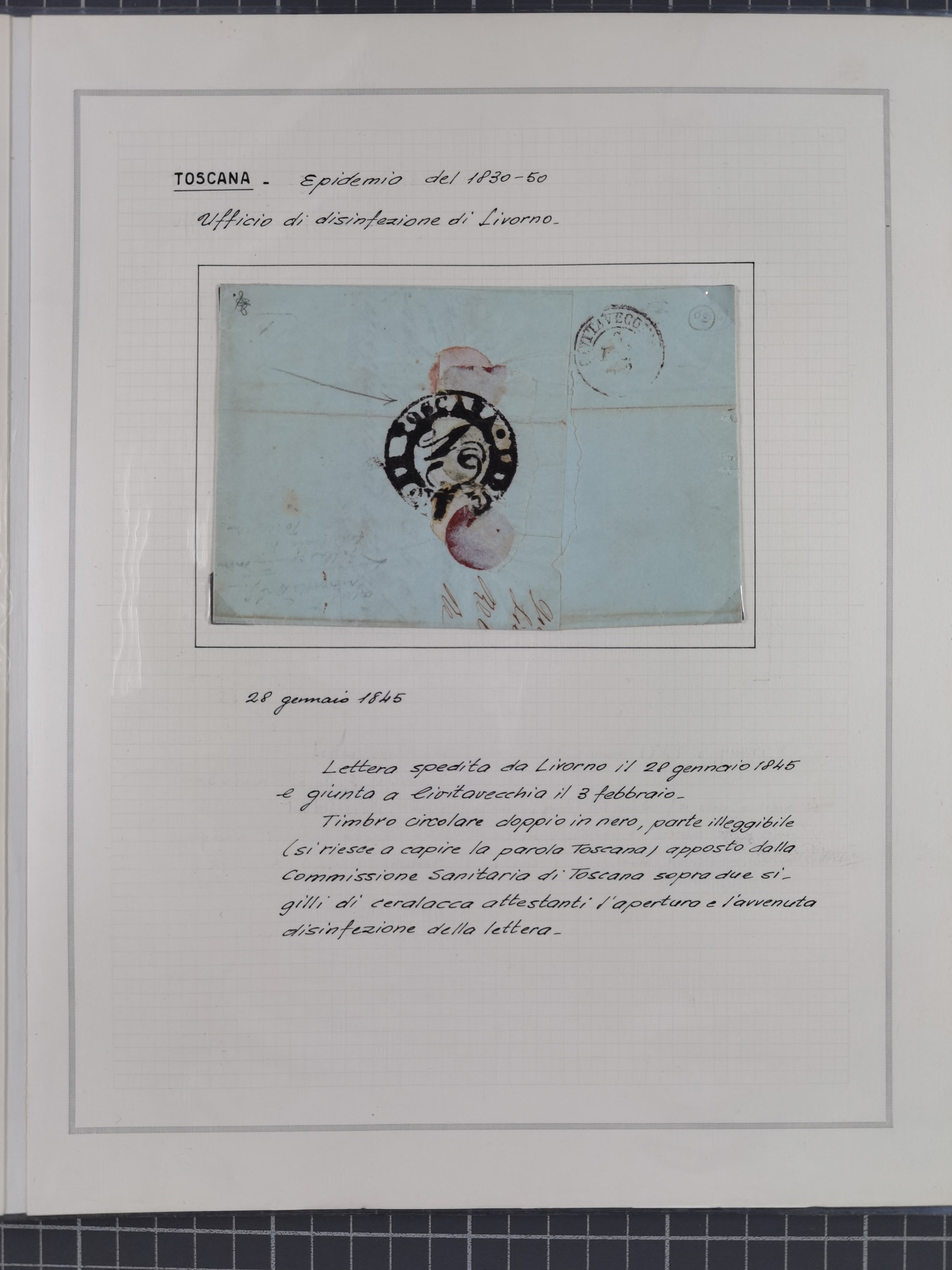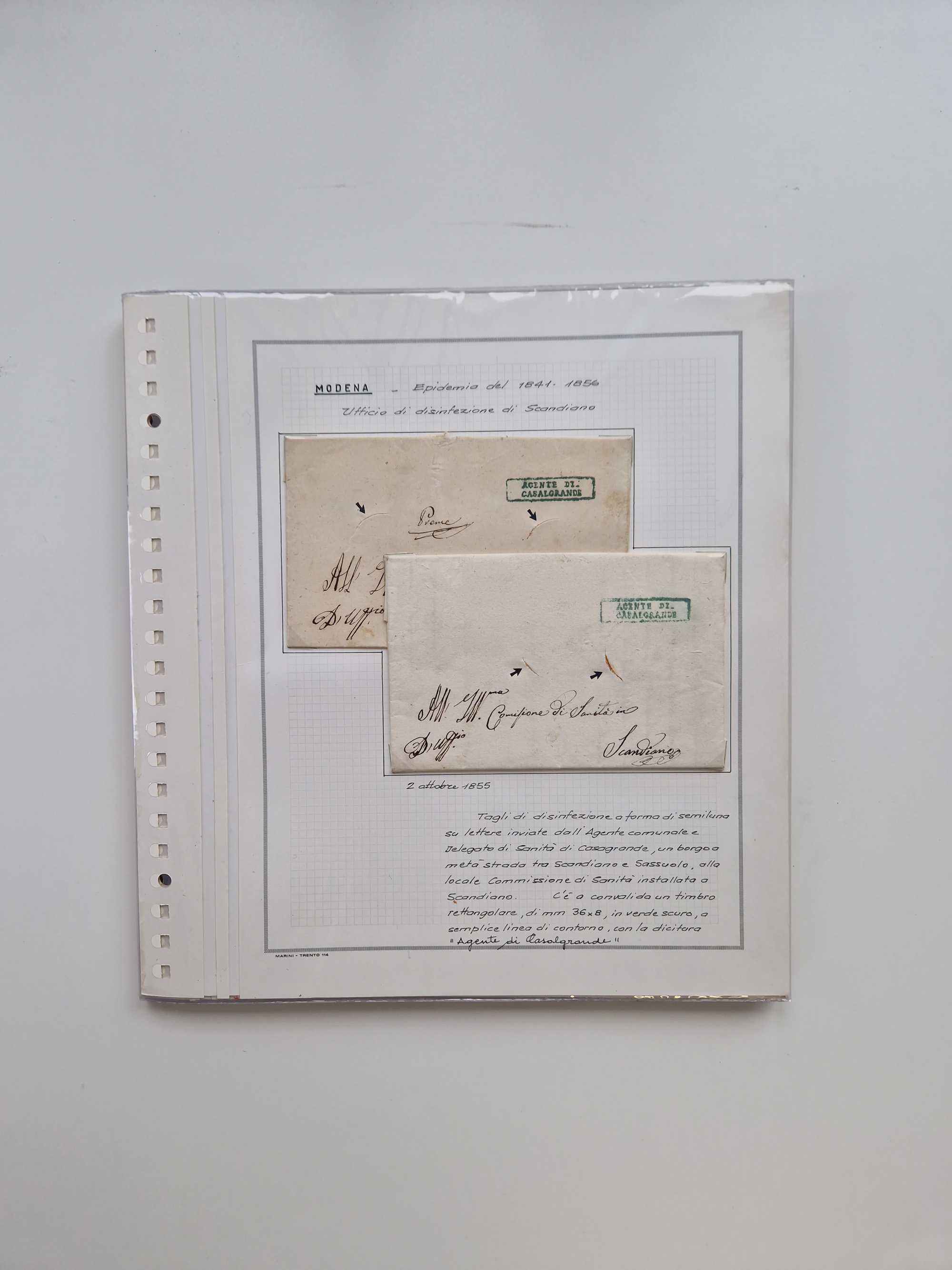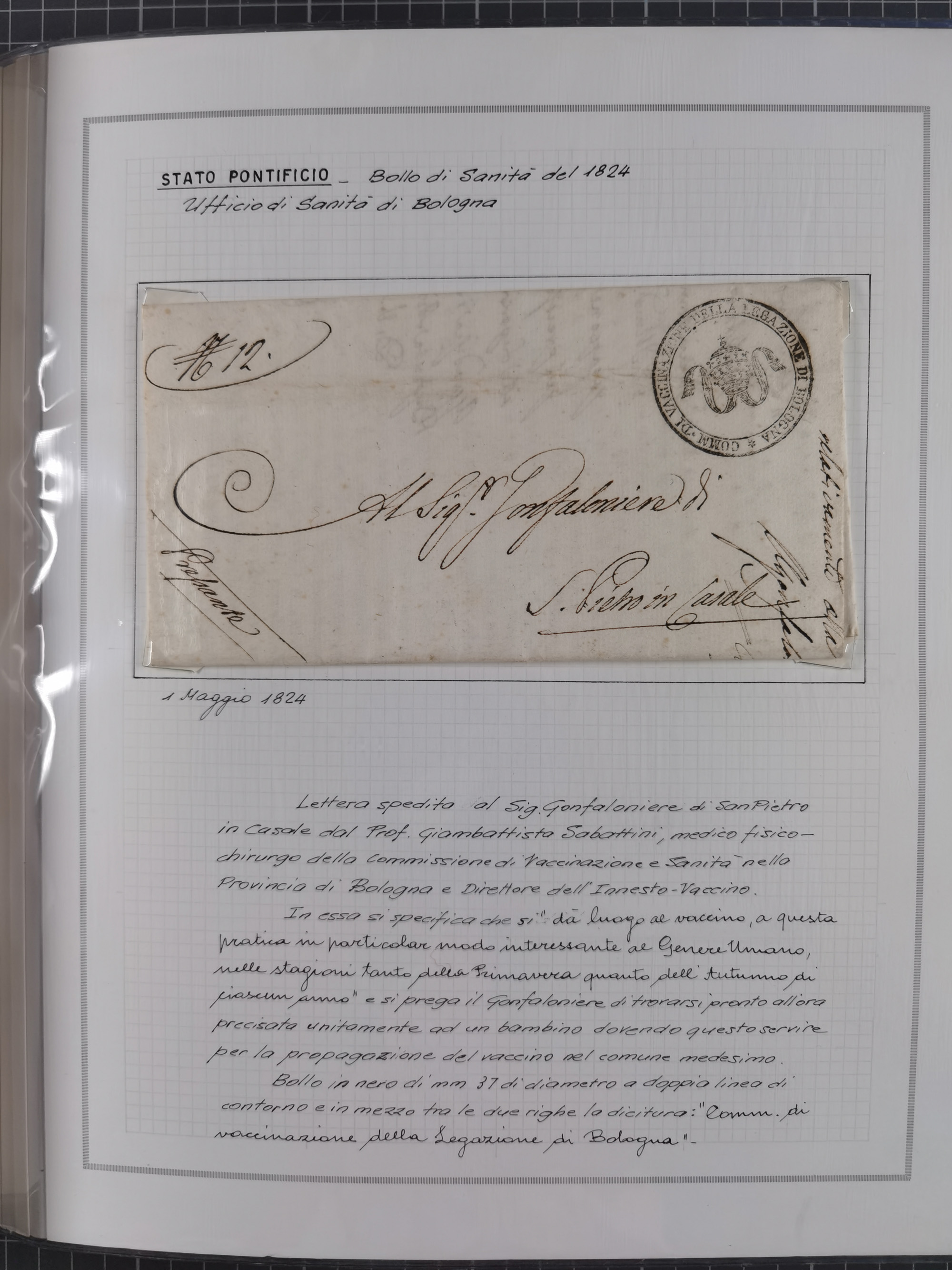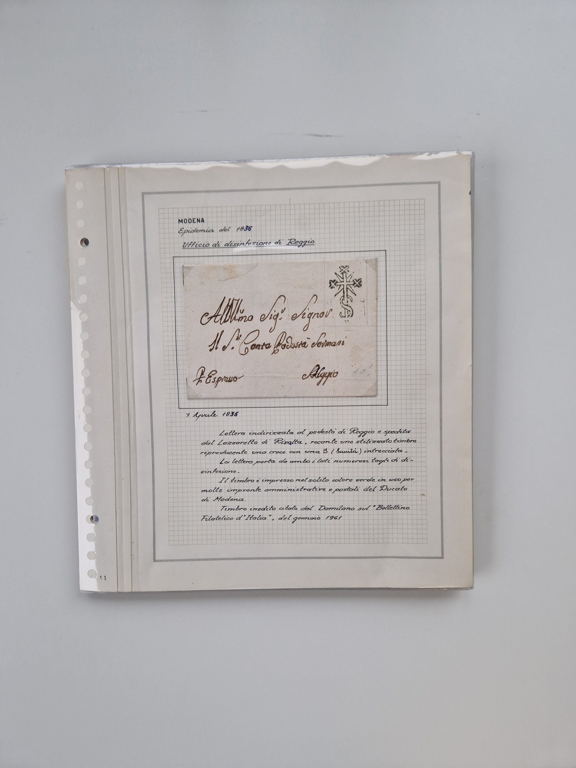 KIRCHENSTAAT: 1630/1886, sehr reichhaltige Sammlung mit über 370 Briefen und Dokumenten, darunter u. a. ein Dokument über die Belegung der Lazarette in Rom während der Pestwelle von 1656, Pestbelege von 1630, Hinweise zu Leichnamen (1690) ,ab 1796 mit ”Ufficio di Sanità di Bologna“, kpl. Faltbrief mit Vordruck “Repubblica Cisalpina“ an die Gemeindeverwaltung von Crevalcore (1800), doppelte Desinfektion (1837) sowie zahlreiche seltene Stempel, spezialisiert und nach verschiedenen Desinfektionsanstalten gegliedert. Diverse Briefe mit Marken Altitaliens sowie drei Briefe Incoming Mail aus Frankreich 1865/66 (20+80 c., 4×10 c. und 40 c., alle mit rotem L2 "Affr. Insufficient“). Ausstellungsmäßig beschrieben, sauber in 10 Marini Drehstab-Alben