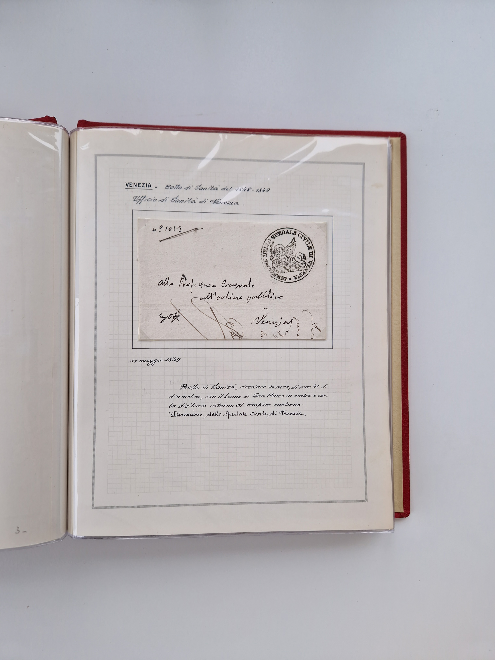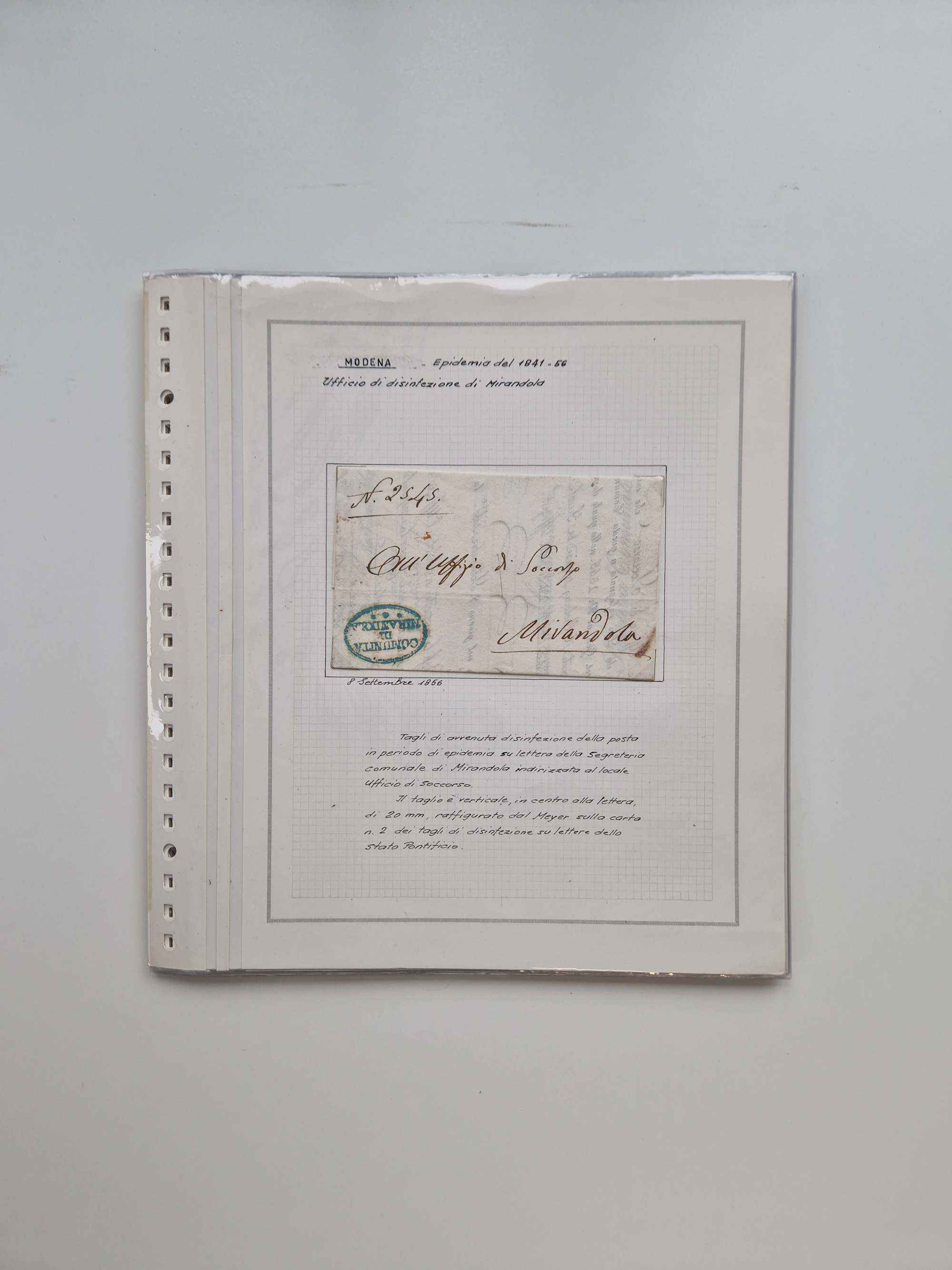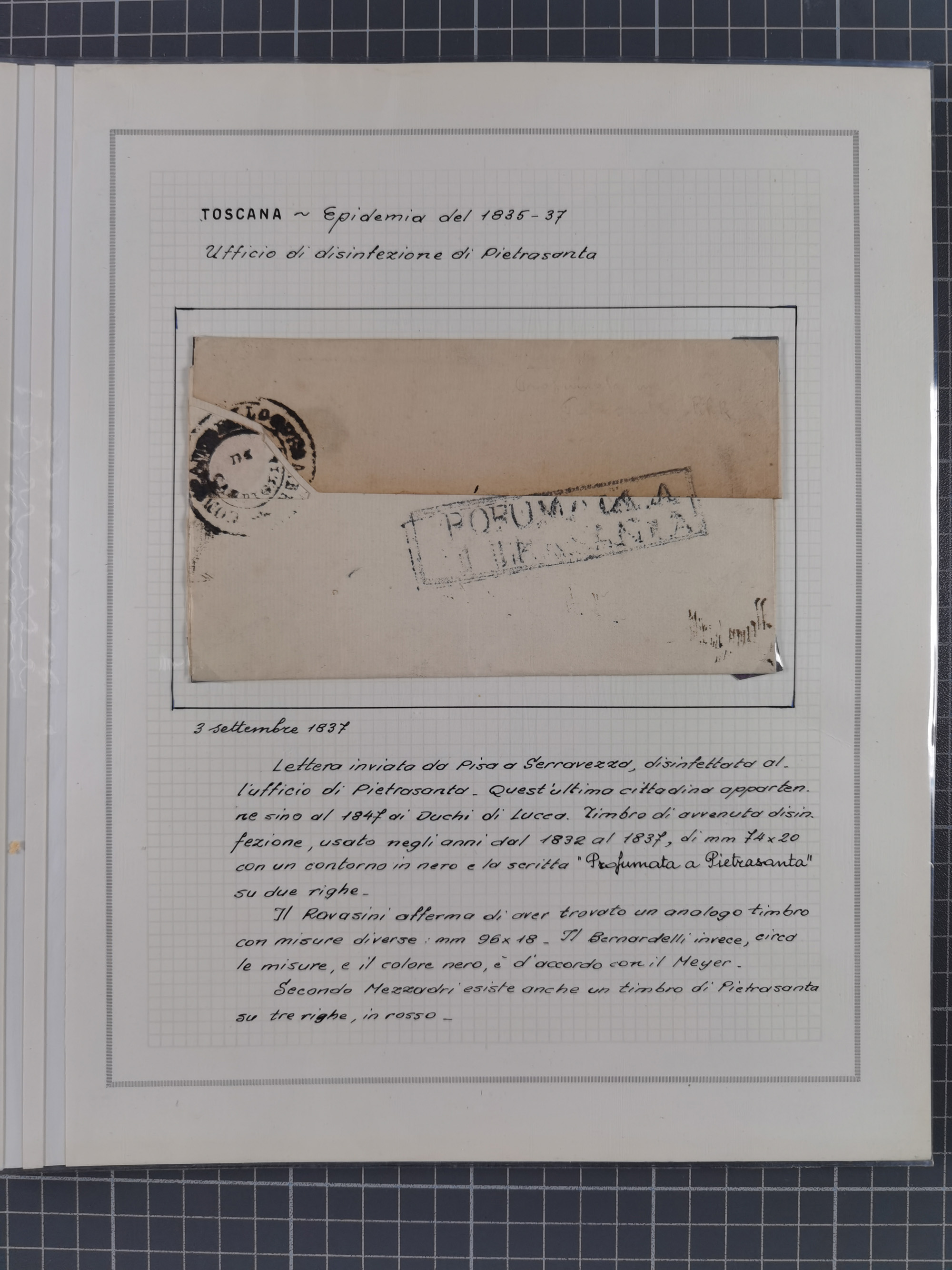 KIRCHENSTAAT: 1630/1886, sehr reichhaltige Sammlung mit über 370 Briefen und Dokumenten, darunter u. a. ein Dokument über die Belegung der Lazarette in Rom während der Pestwelle von 1656, Pestbelege von 1630, Hinweise zu Leichnamen (1690) ,ab 1796 mit ”Ufficio di Sanità di Bologna“, kpl. Faltbrief mit Vordruck “Repubblica Cisalpina“ an die Gemeindeverwaltung von Crevalcore (1800), doppelte Desinfektion (1837) sowie zahlreiche seltene Stempel, spezialisiert und nach verschiedenen Desinfektionsanstalten gegliedert. Diverse Briefe mit Marken Altitaliens sowie drei Briefe Incoming Mail aus Frankreich 1865/66 (20+80 c., 4×10 c. und 40 c., alle mit rotem L2 "Affr. Insufficient“). Ausstellungsmäßig beschrieben, sauber in 10 Marini Drehstab-Alben
