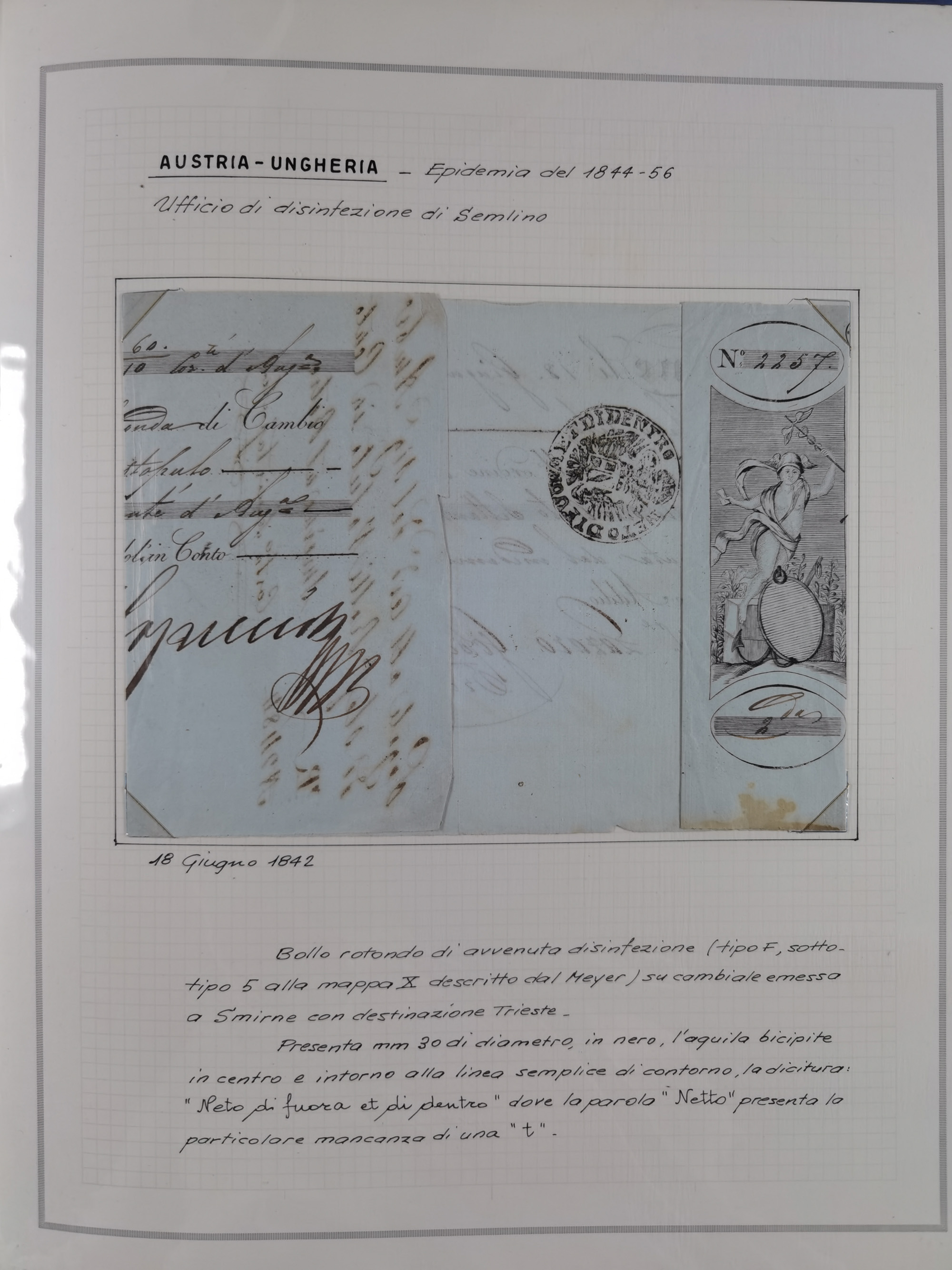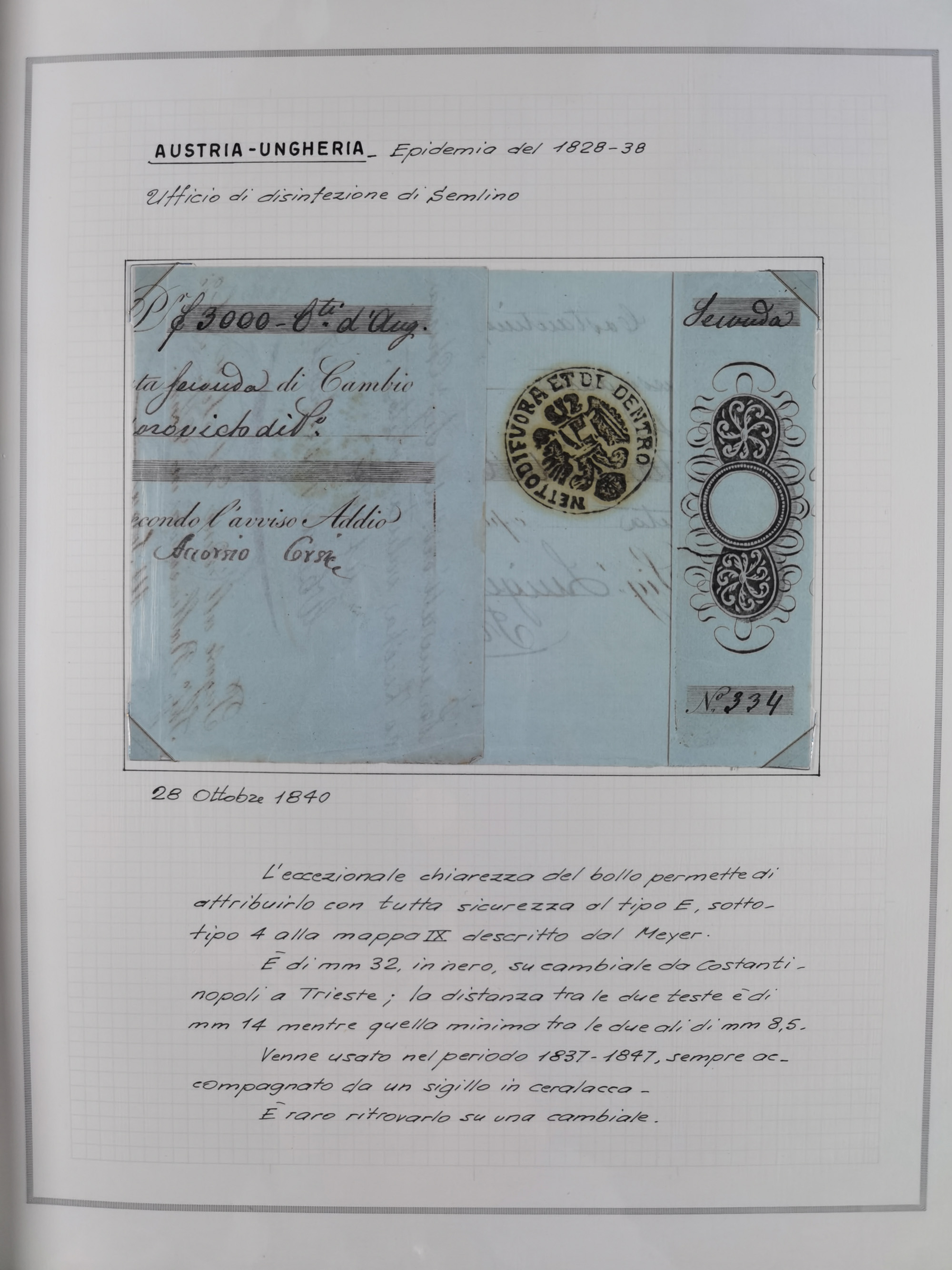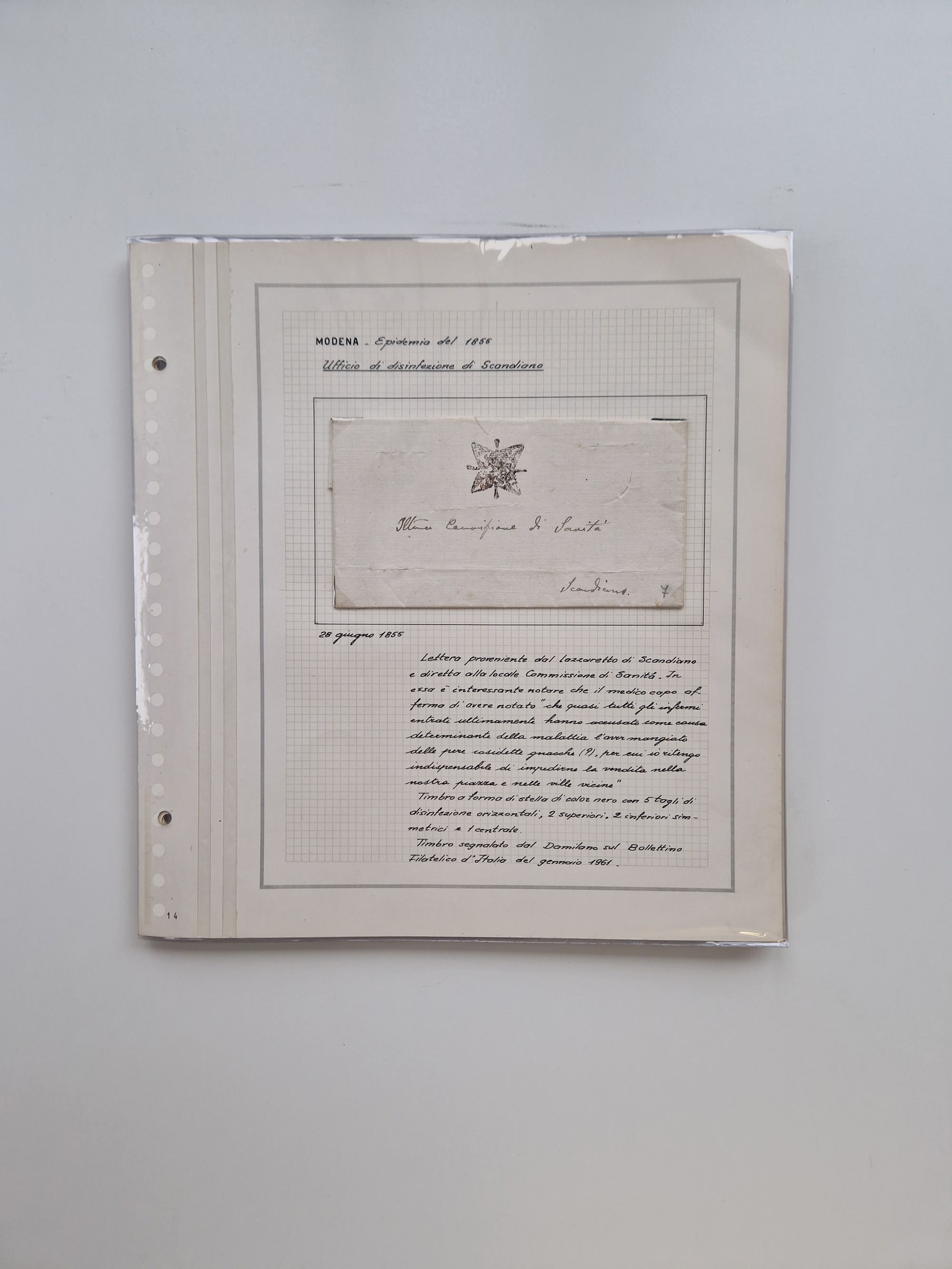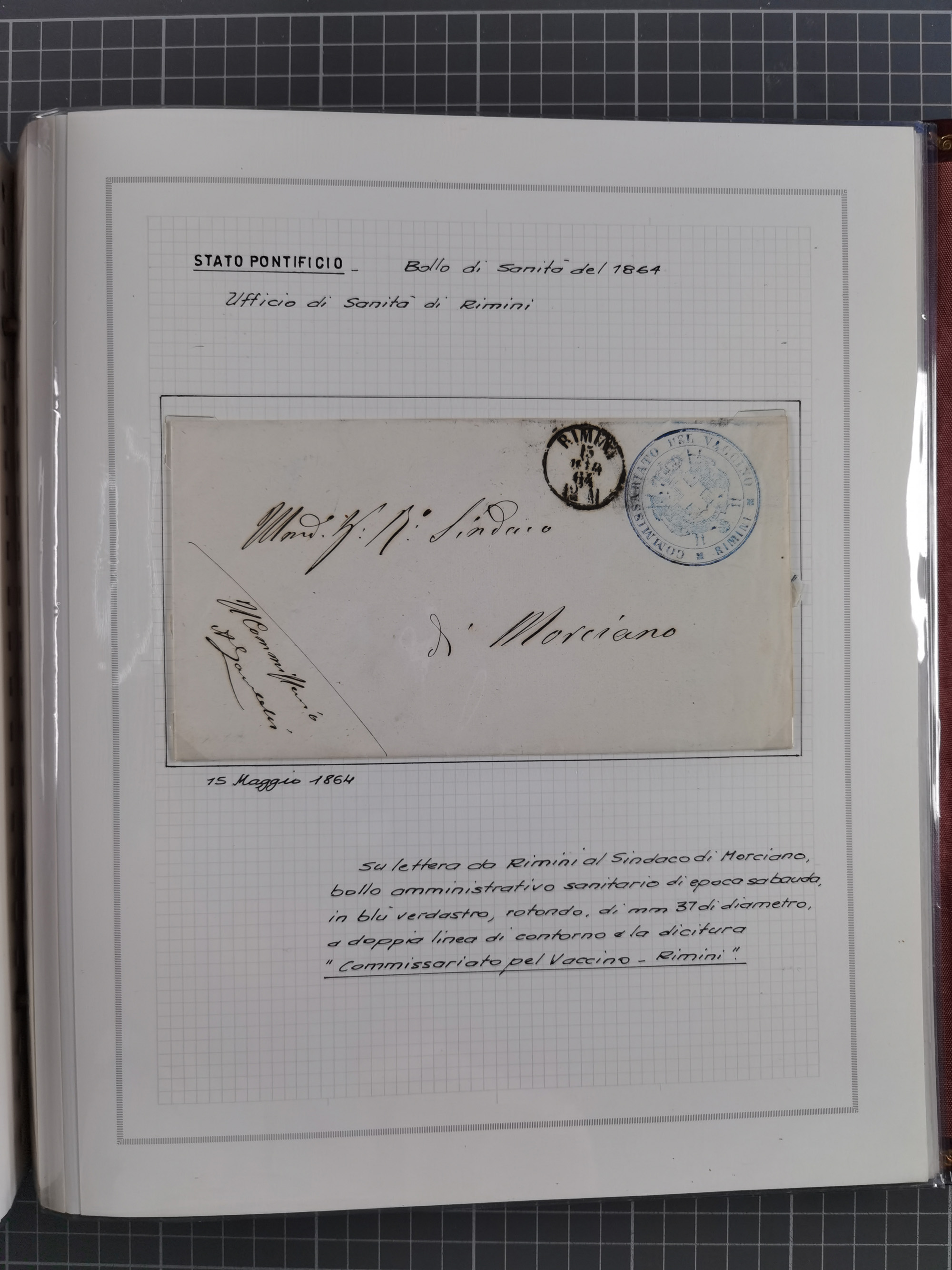 KIRCHENSTAAT: 1630/1886, sehr reichhaltige Sammlung mit über 370 Briefen und Dokumenten, darunter u. a. ein Dokument über die Belegung der Lazarette in Rom während der Pestwelle von 1656, Pestbelege von 1630, Hinweise zu Leichnamen (1690) ,ab 1796 mit ”Ufficio di Sanità di Bologna“, kpl. Faltbrief mit Vordruck “Repubblica Cisalpina“ an die Gemeindeverwaltung von Crevalcore (1800), doppelte Desinfektion (1837) sowie zahlreiche seltene Stempel, spezialisiert und nach verschiedenen Desinfektionsanstalten gegliedert. Diverse Briefe mit Marken Altitaliens sowie drei Briefe Incoming Mail aus Frankreich 1865/66 (20+80 c., 4×10 c. und 40 c., alle mit rotem L2 "Affr. Insufficient“). Ausstellungsmäßig beschrieben, sauber in 10 Marini Drehstab-Alben