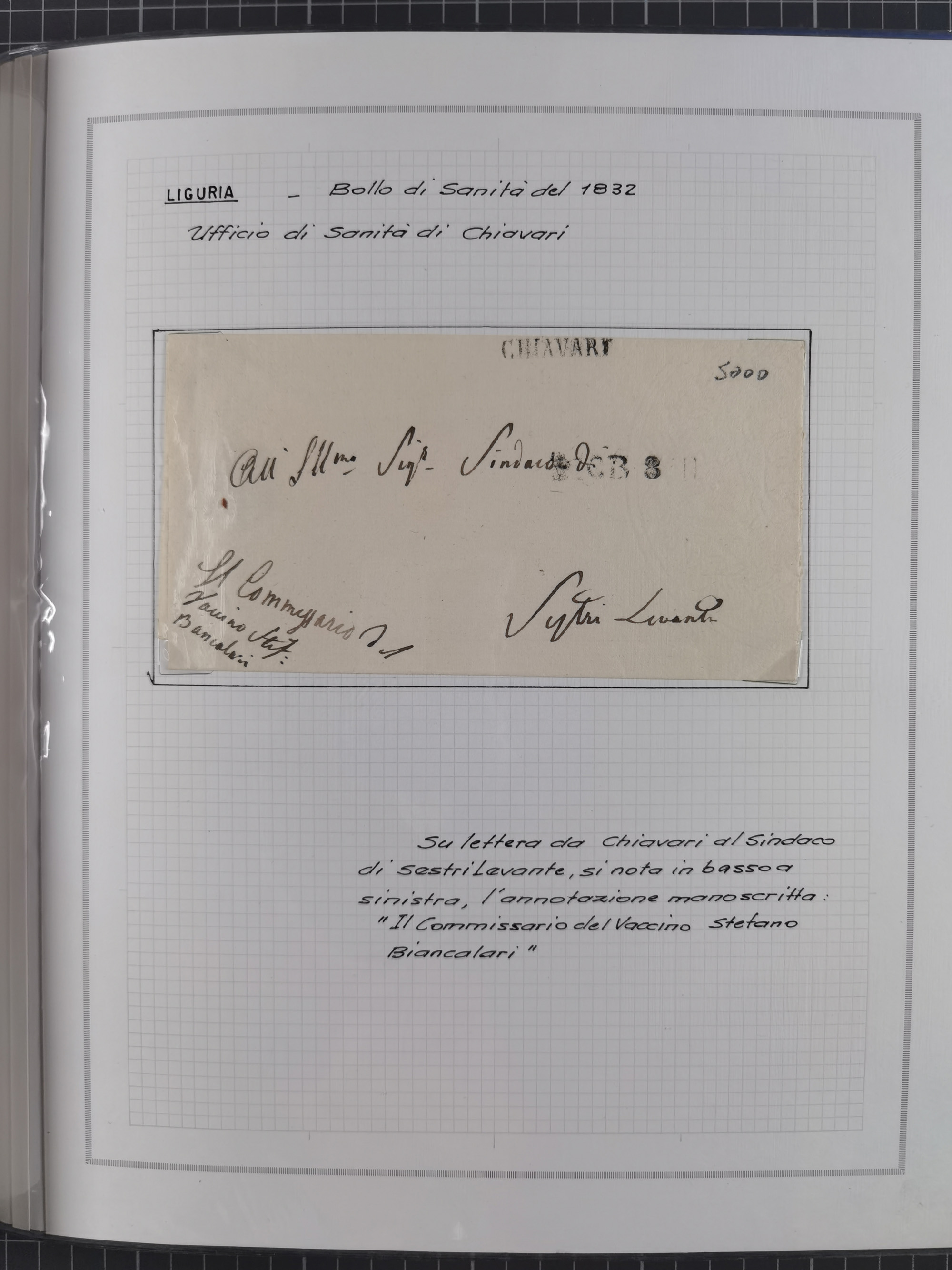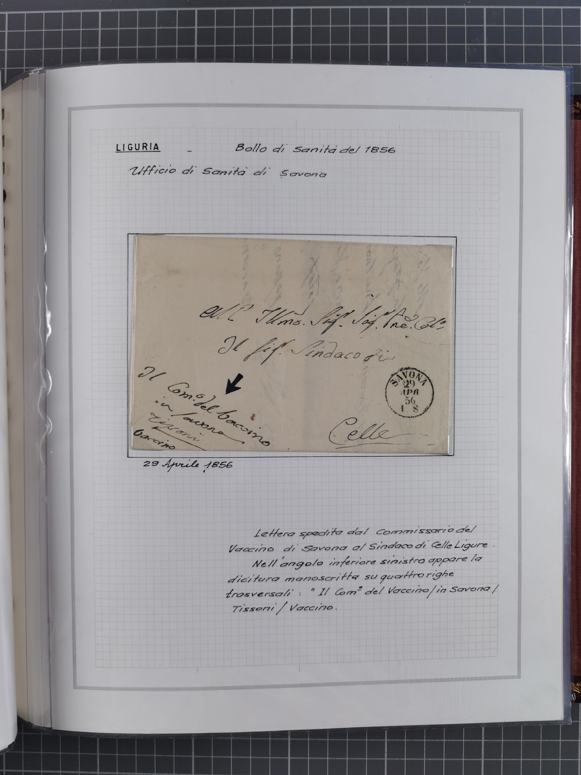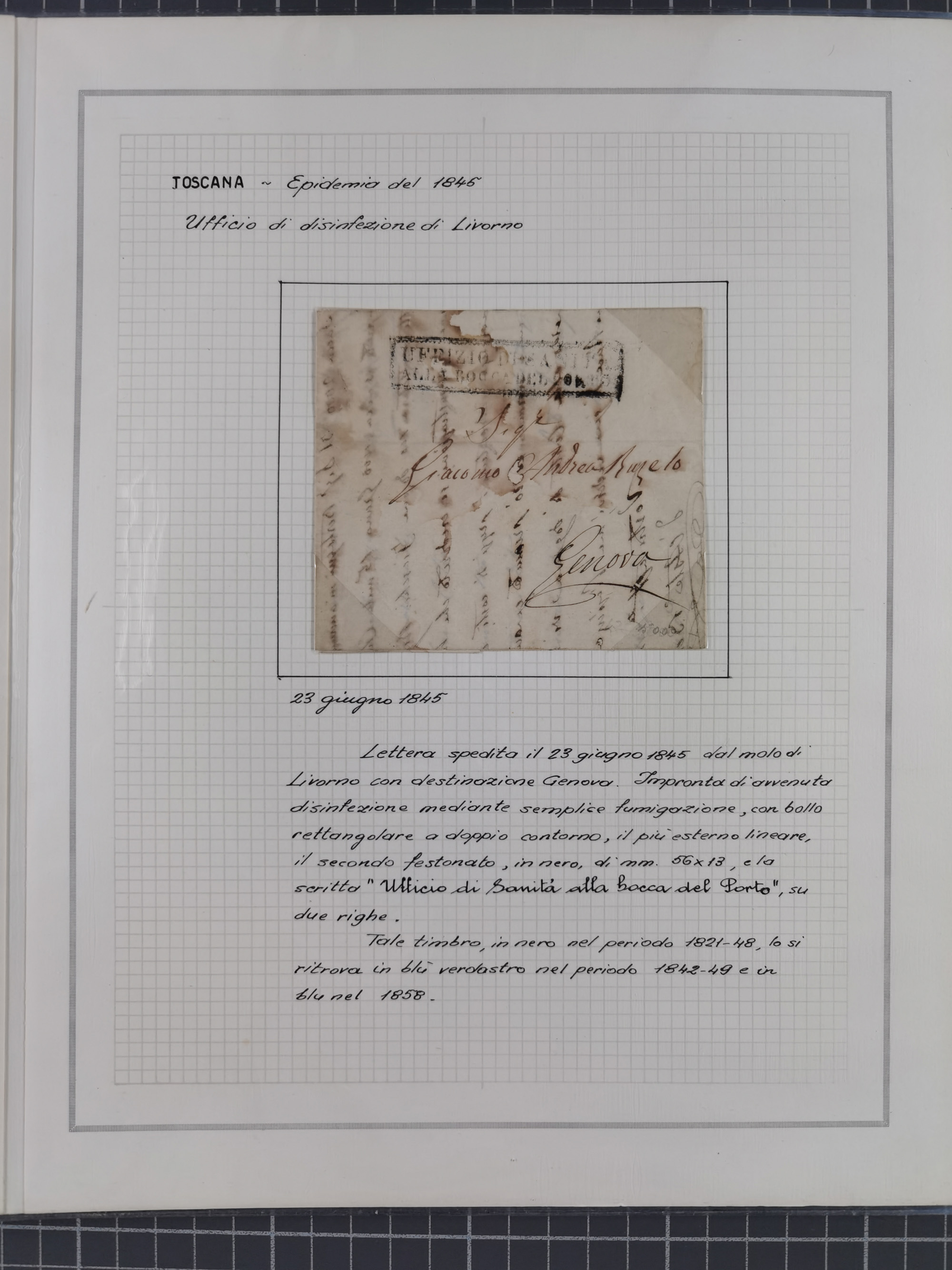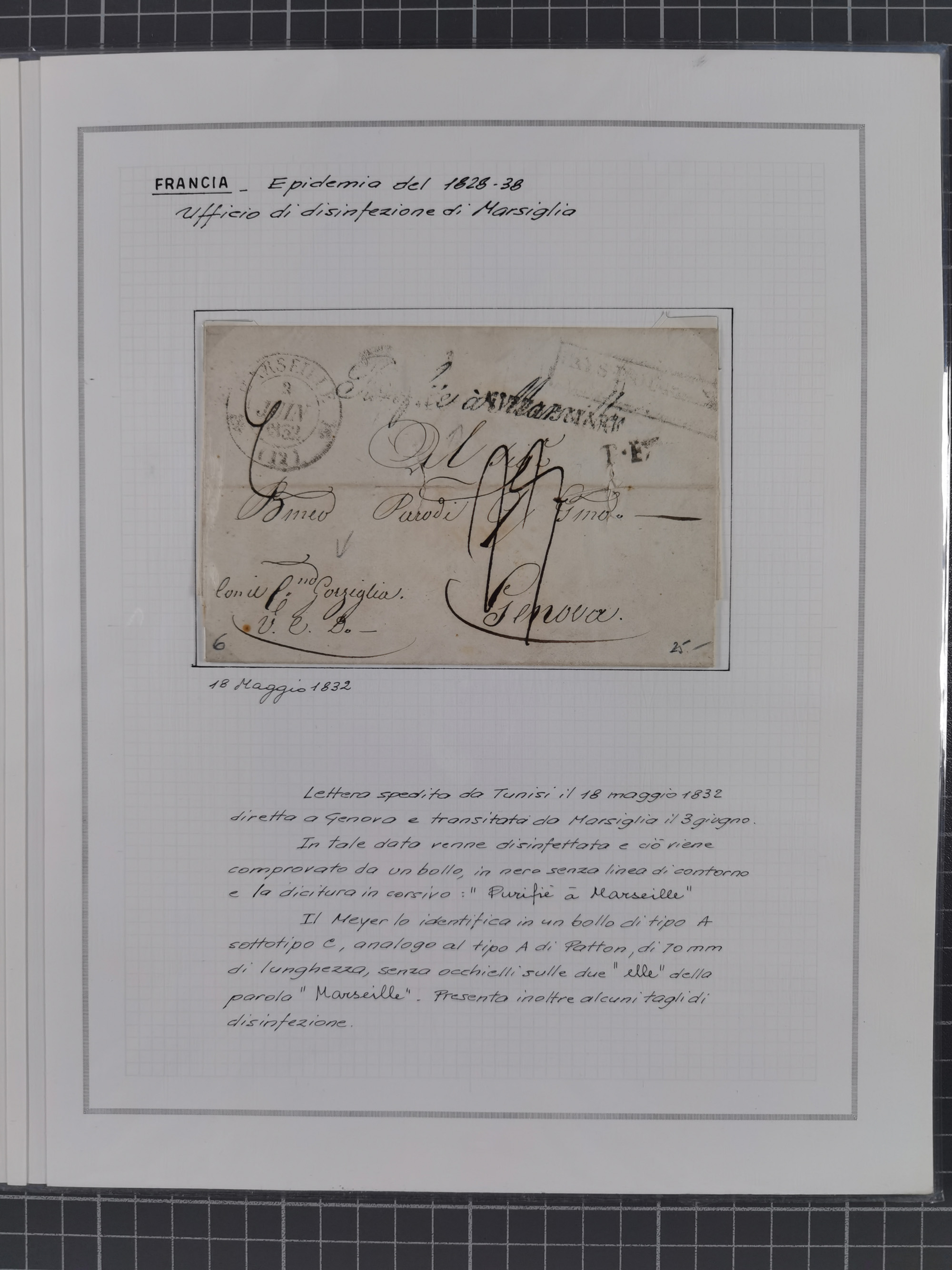 LIGURIA: 1700/1888, Ausstellungssammlung mit 74 Briefen und Dokumenten, angefangen ab Zirkularen, dabei u.a. Bogen zur Erfassung der Cholerafälle (1833) + (1836), rote Transitstempel “VIA DI MARE” (1831) + (1842), ferner “ANGLETERRE”, “SAVONA”, etc, Stempel “Il Commissario Generale di Sanita.”, mehrere Briefe nach Tunis, etc., sauber beschrieben in drei Alben