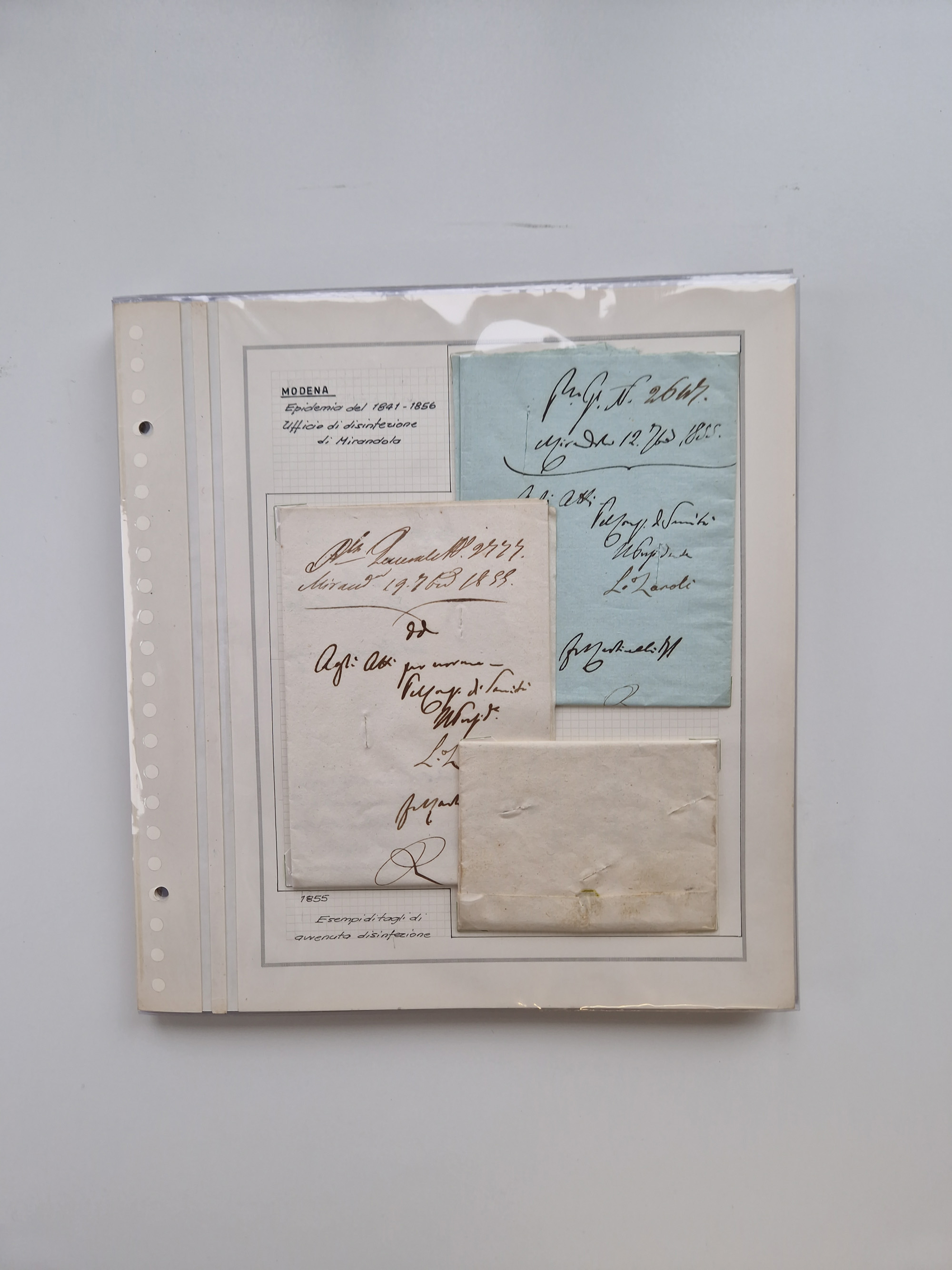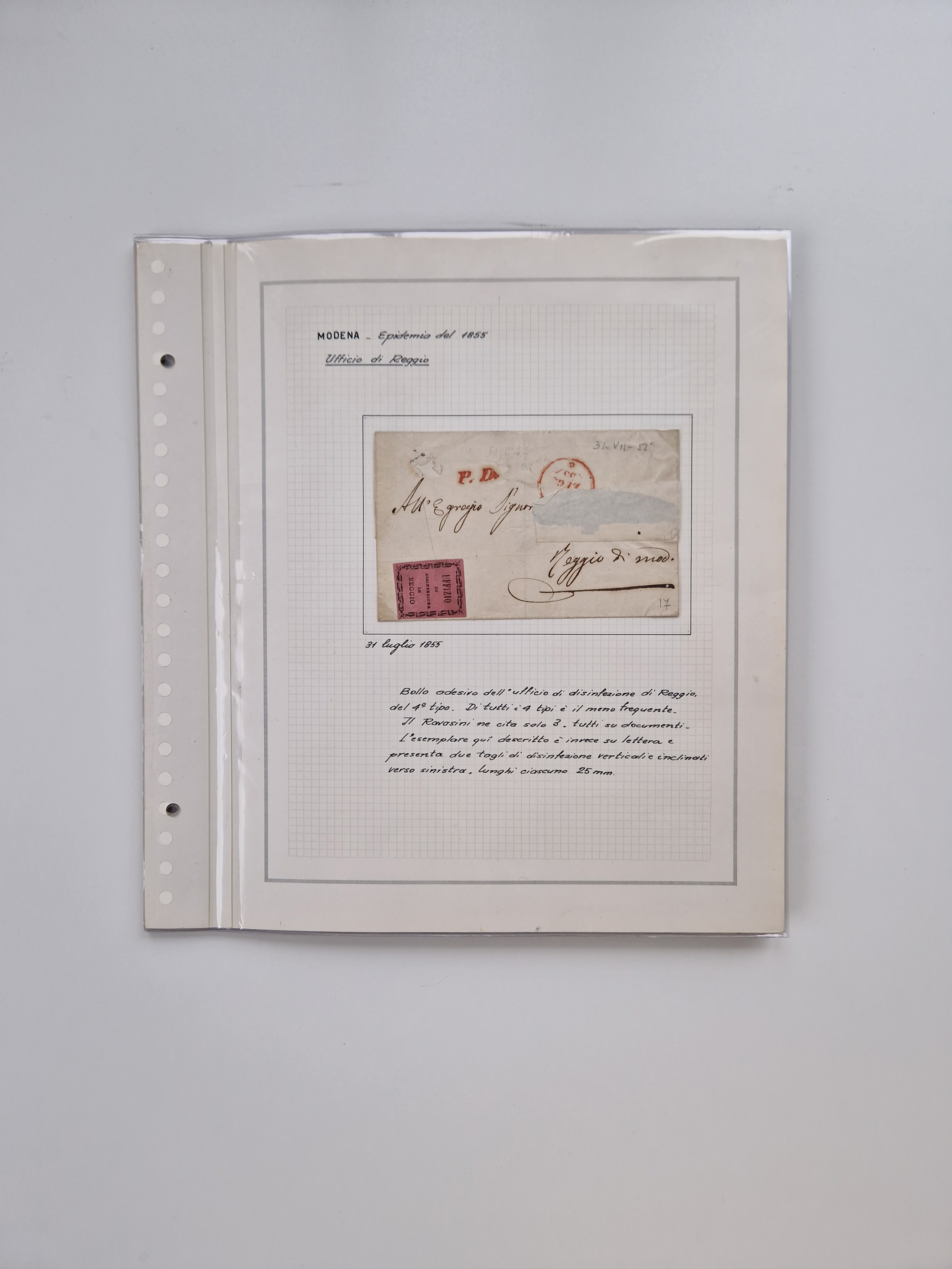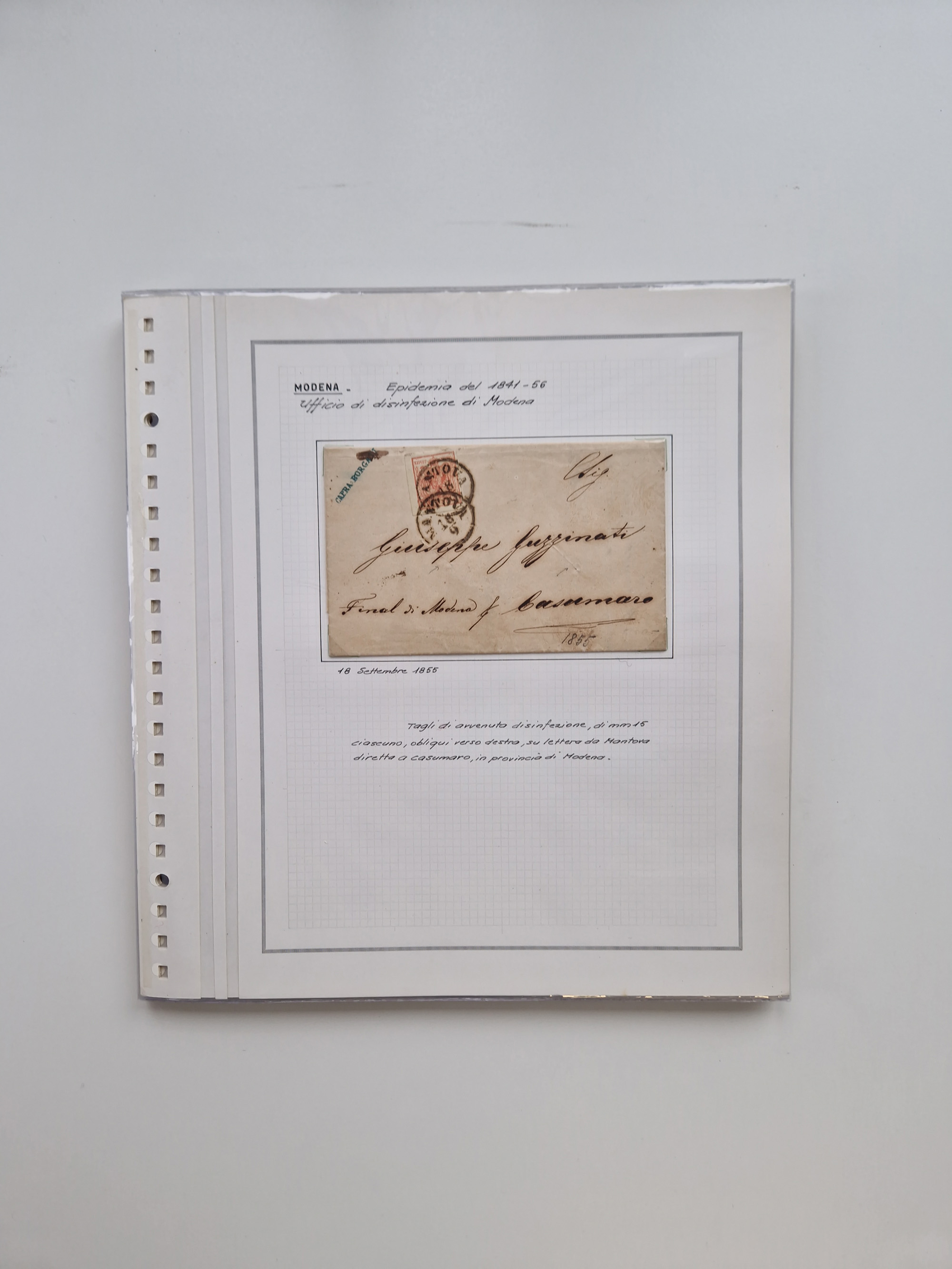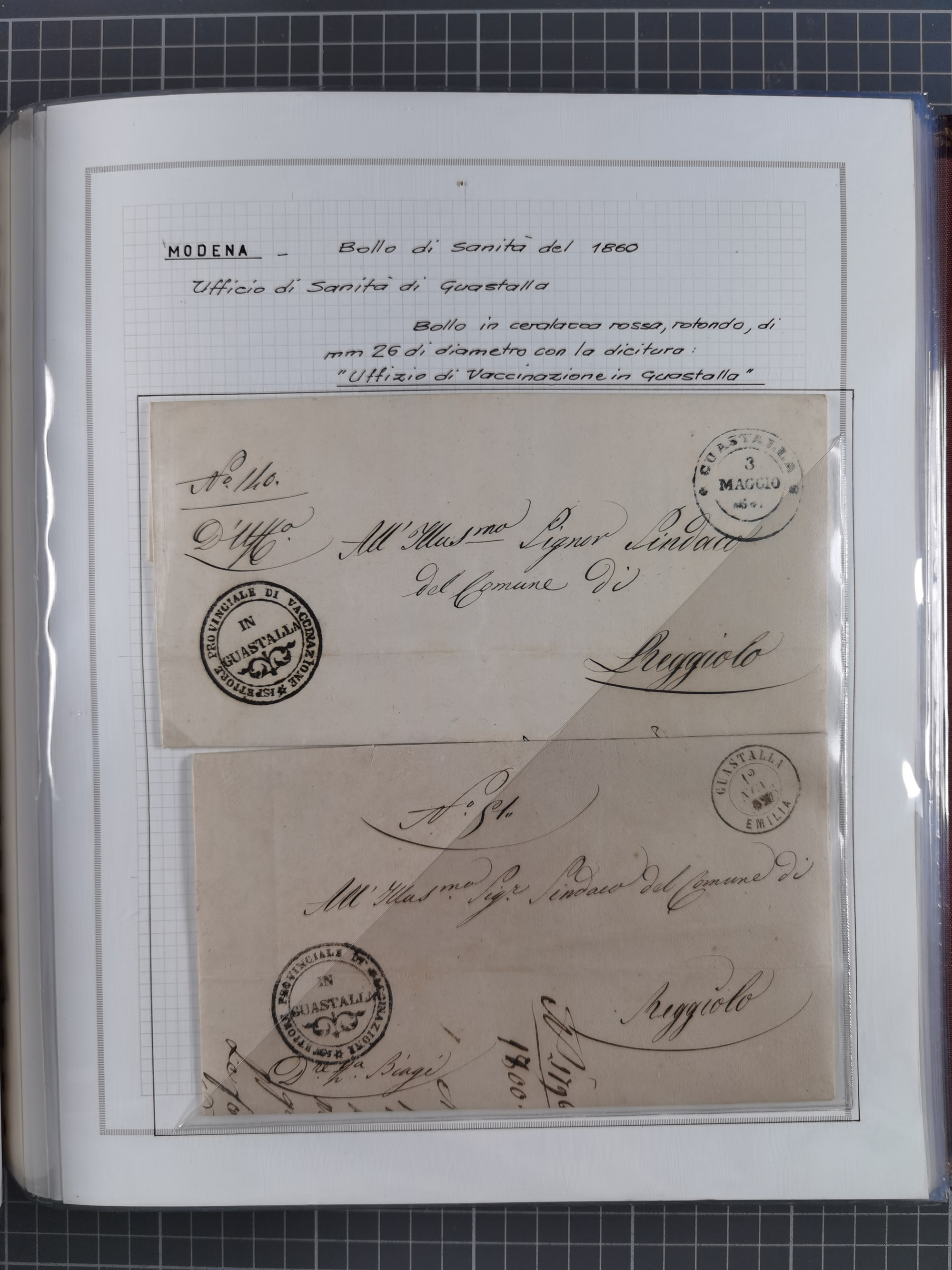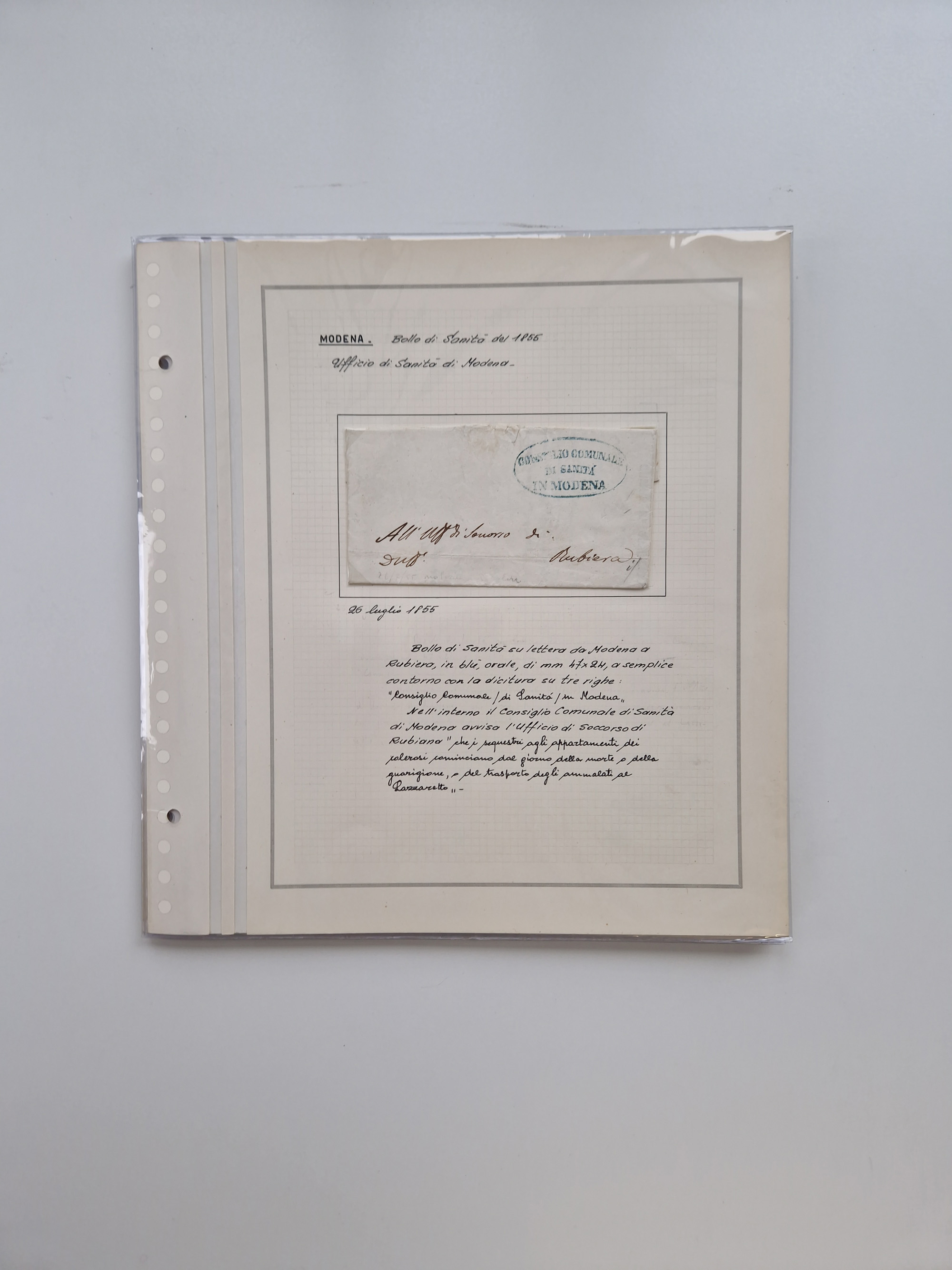 MODENA: 1691/1865, über 140 Briefe und Dokumente, viele mit seltenen Stempeln ab ca. 1806, dabei u.a. Expressbrief an den Bürgermeister von Reggio mit seltenem Stempel “S unter Kreuz”, 4 Belege mit Desinfektions-Etikette von Reggio (Juli-Oktober 1855), etc., sauber beschrieben in vier passenden Alben