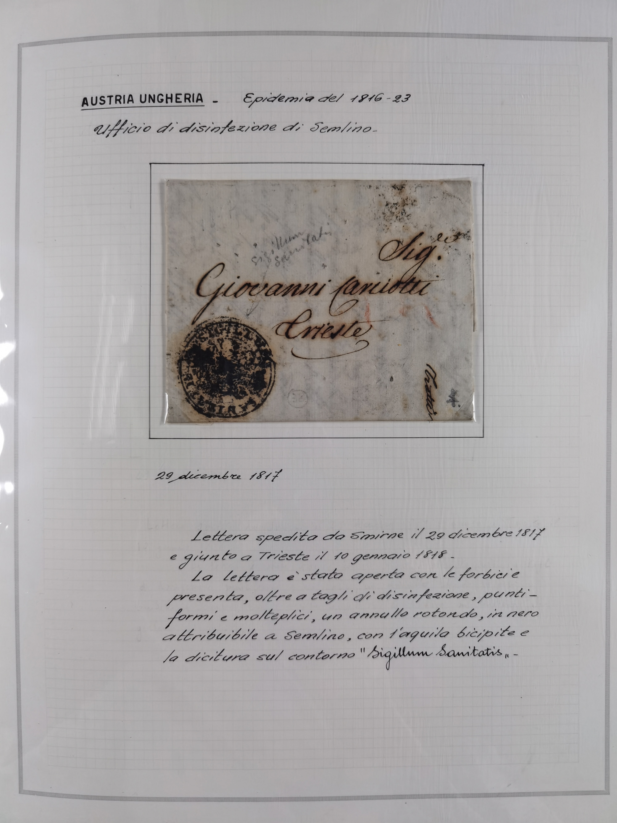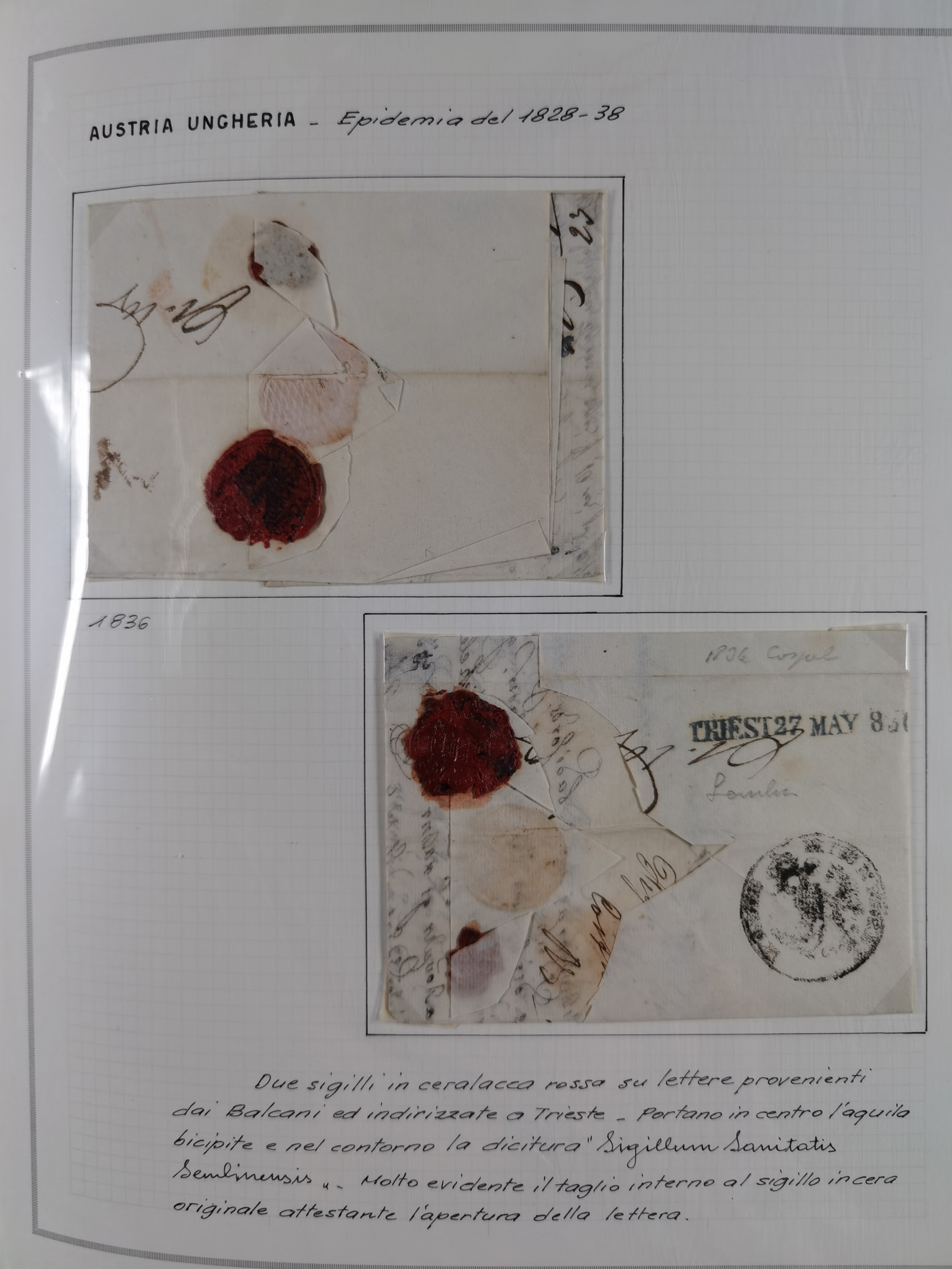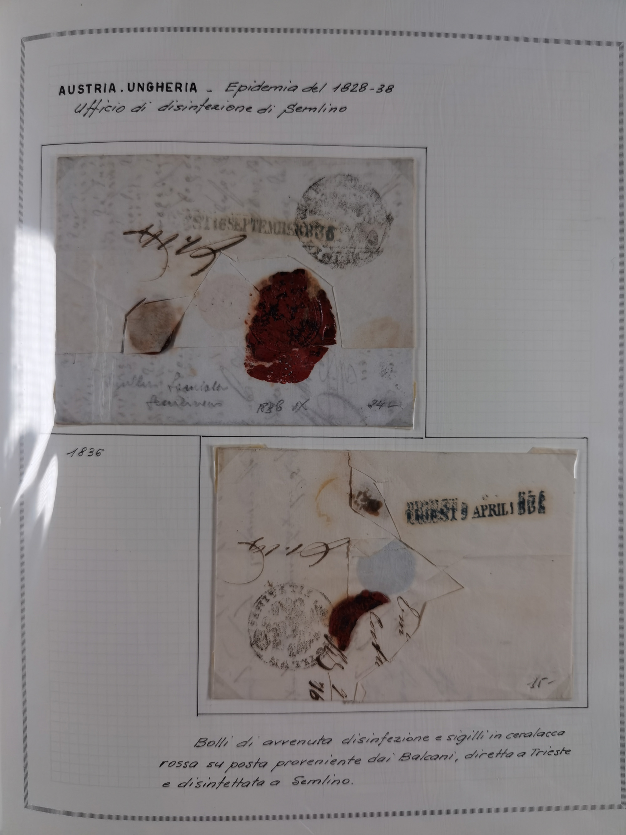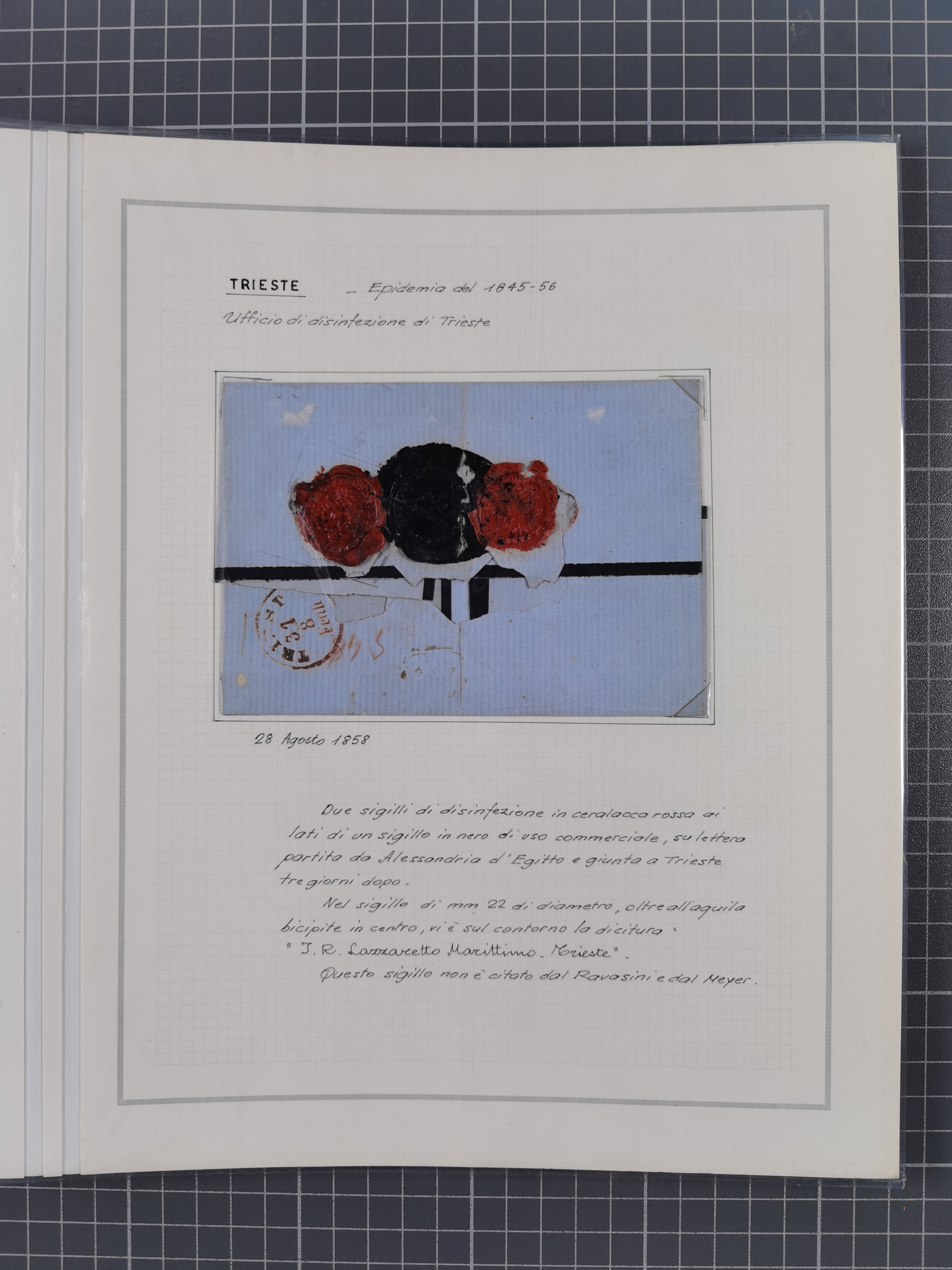 TRIEST: 1814/58, Sammlung mit 26 Briefen und Dokumenten, dabei Sanitätspass (1831) sowie doppelt versiegelter Desinfektionsbrief von Alexandria nach Triest (1858), sauber beschrieben im Album