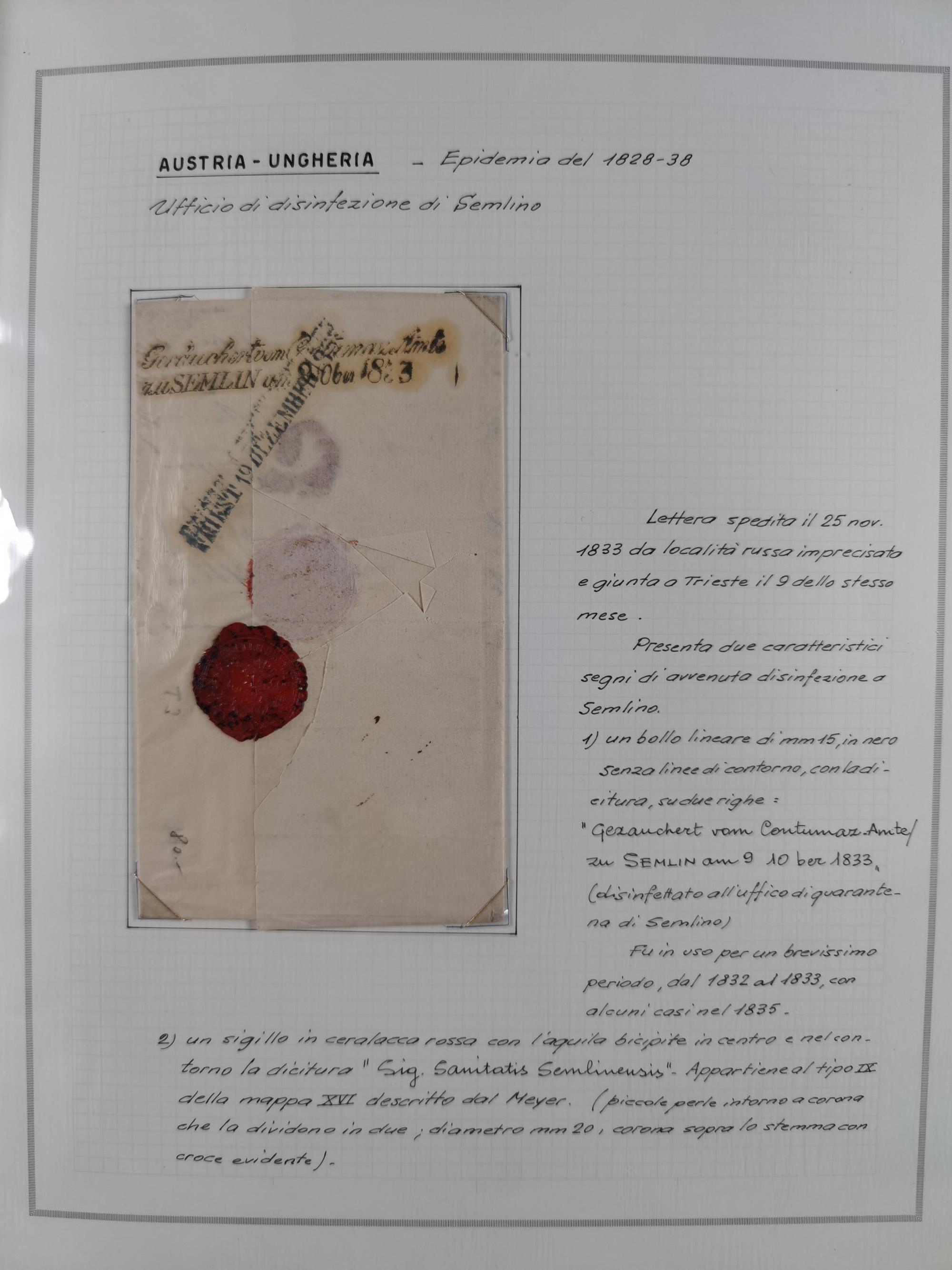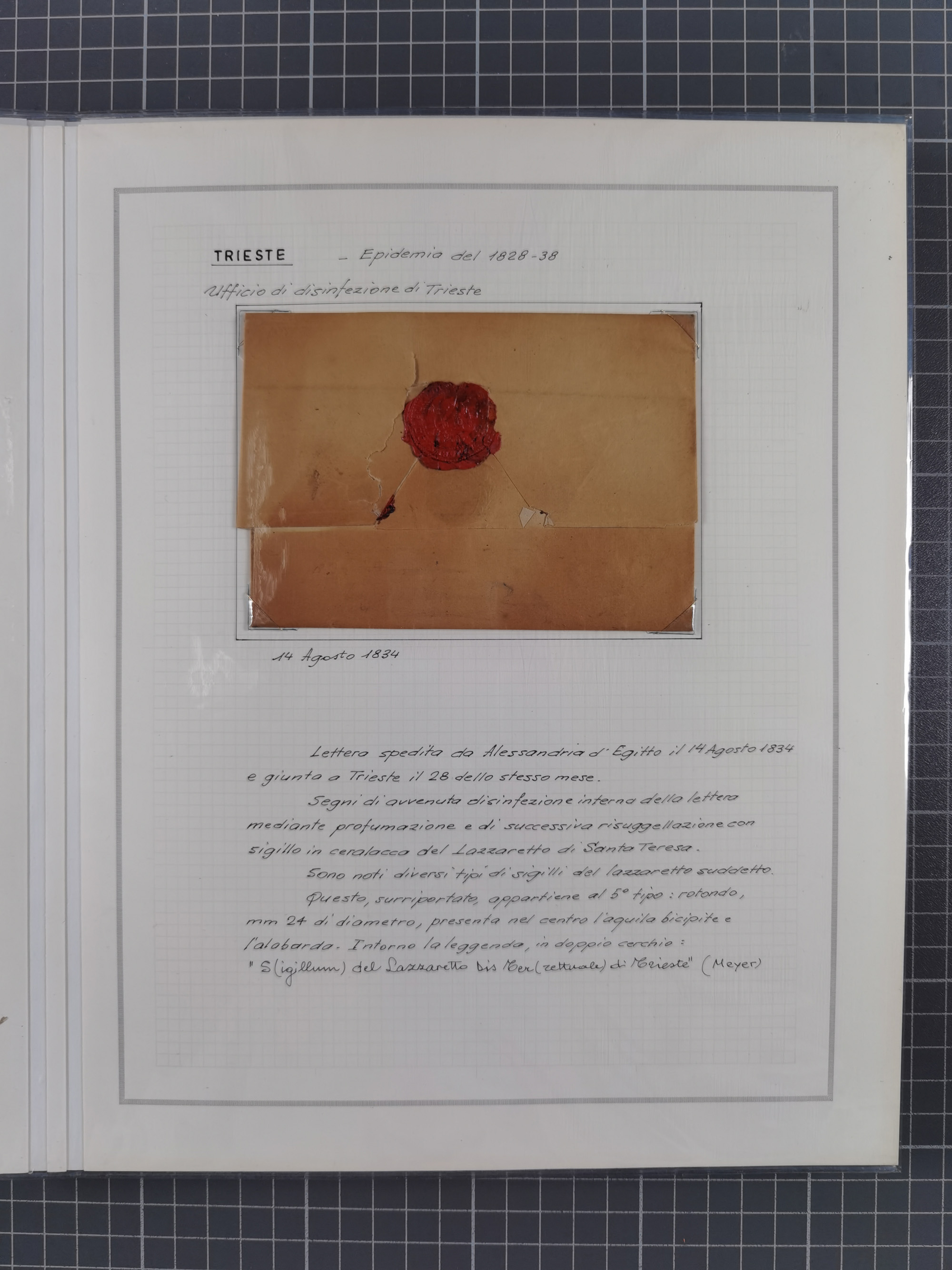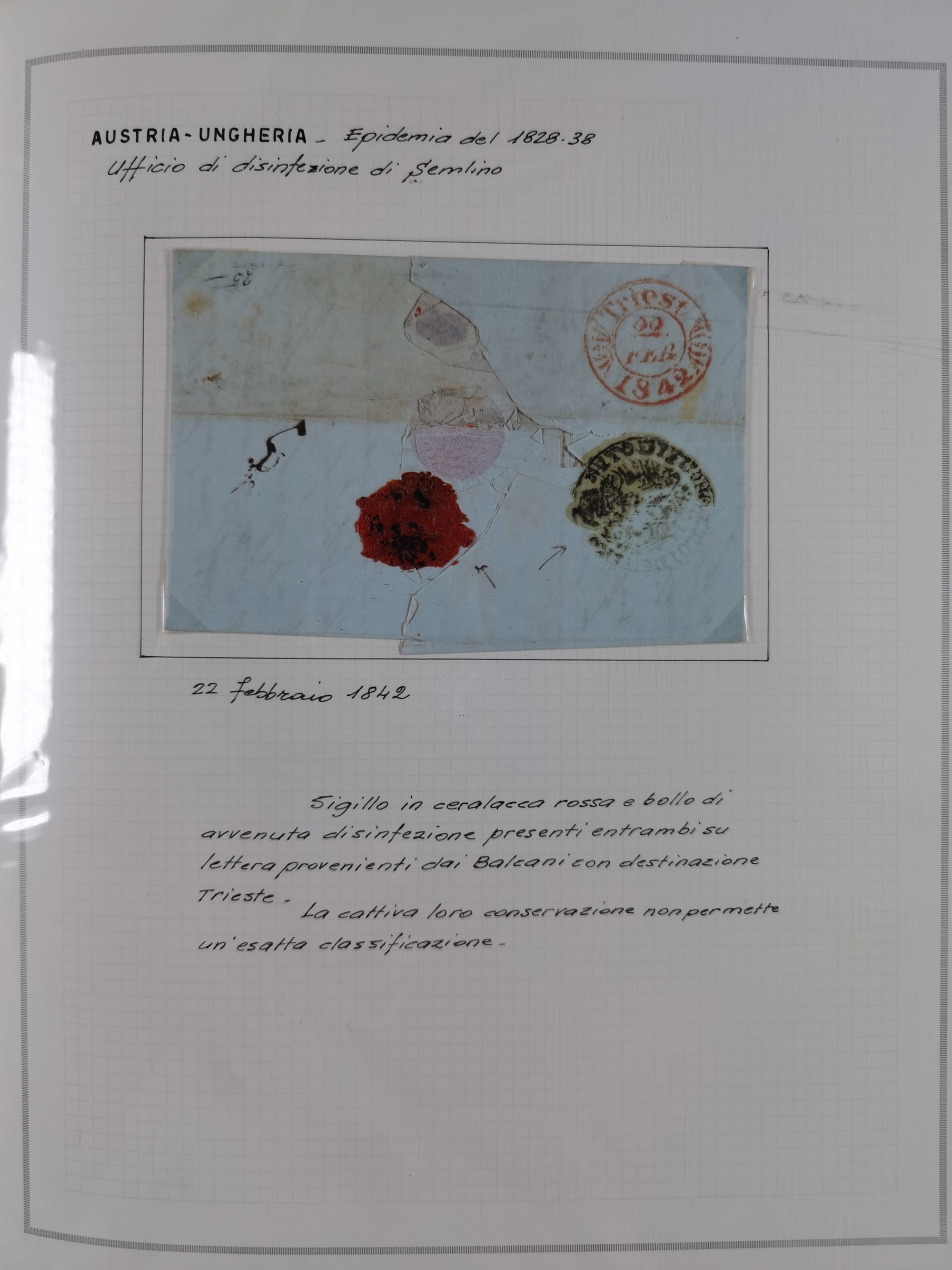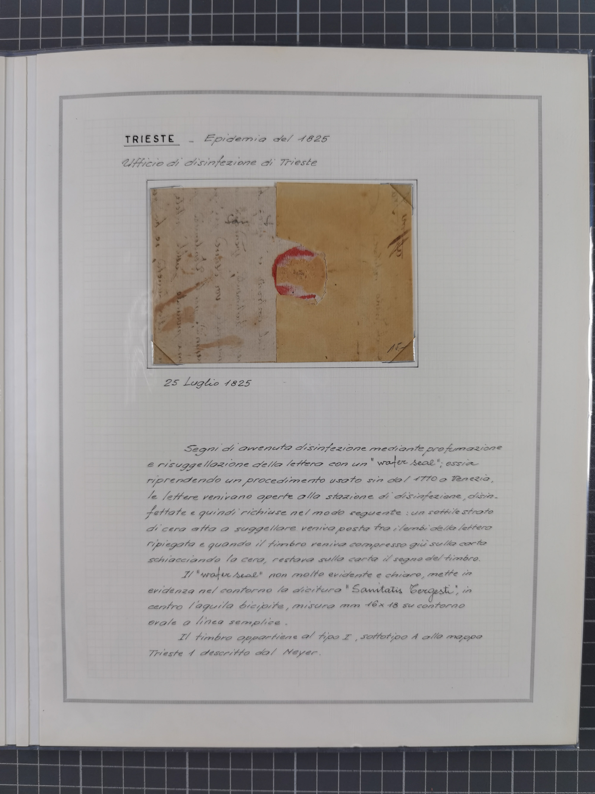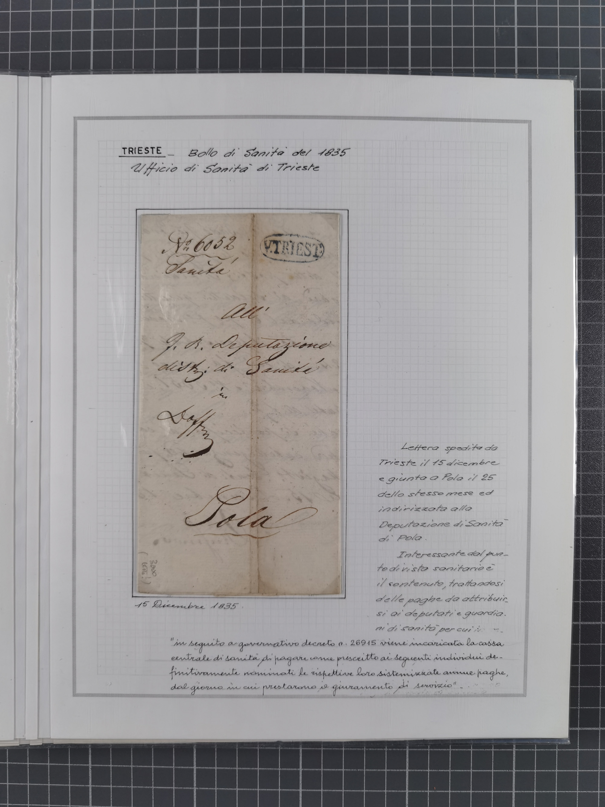 TRIEST: 1814/58, Sammlung mit 26 Briefen und Dokumenten, dabei Sanitätspass (1831) sowie doppelt versiegelter Desinfektionsbrief von Alexandria nach Triest (1858), sauber beschrieben im Album
